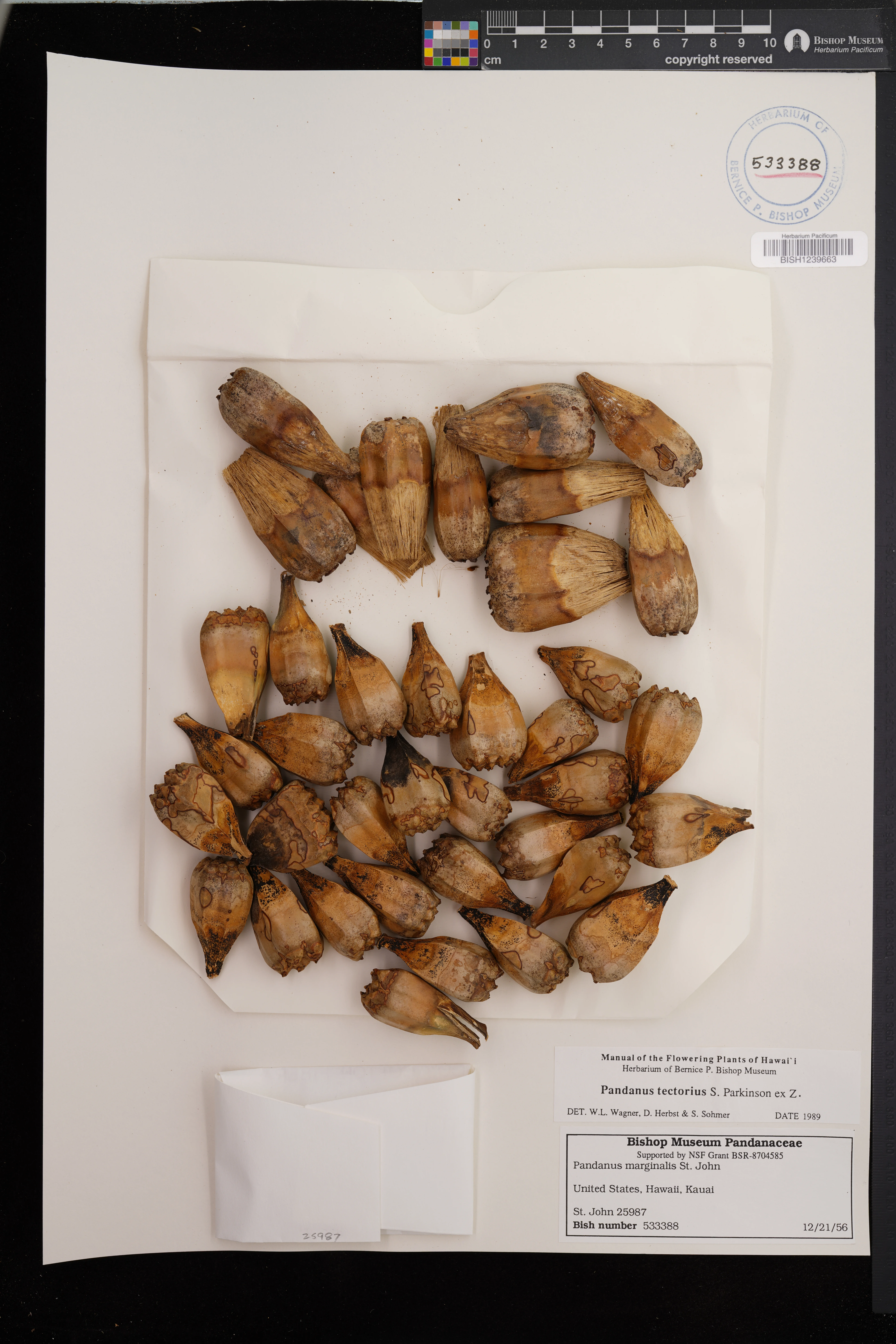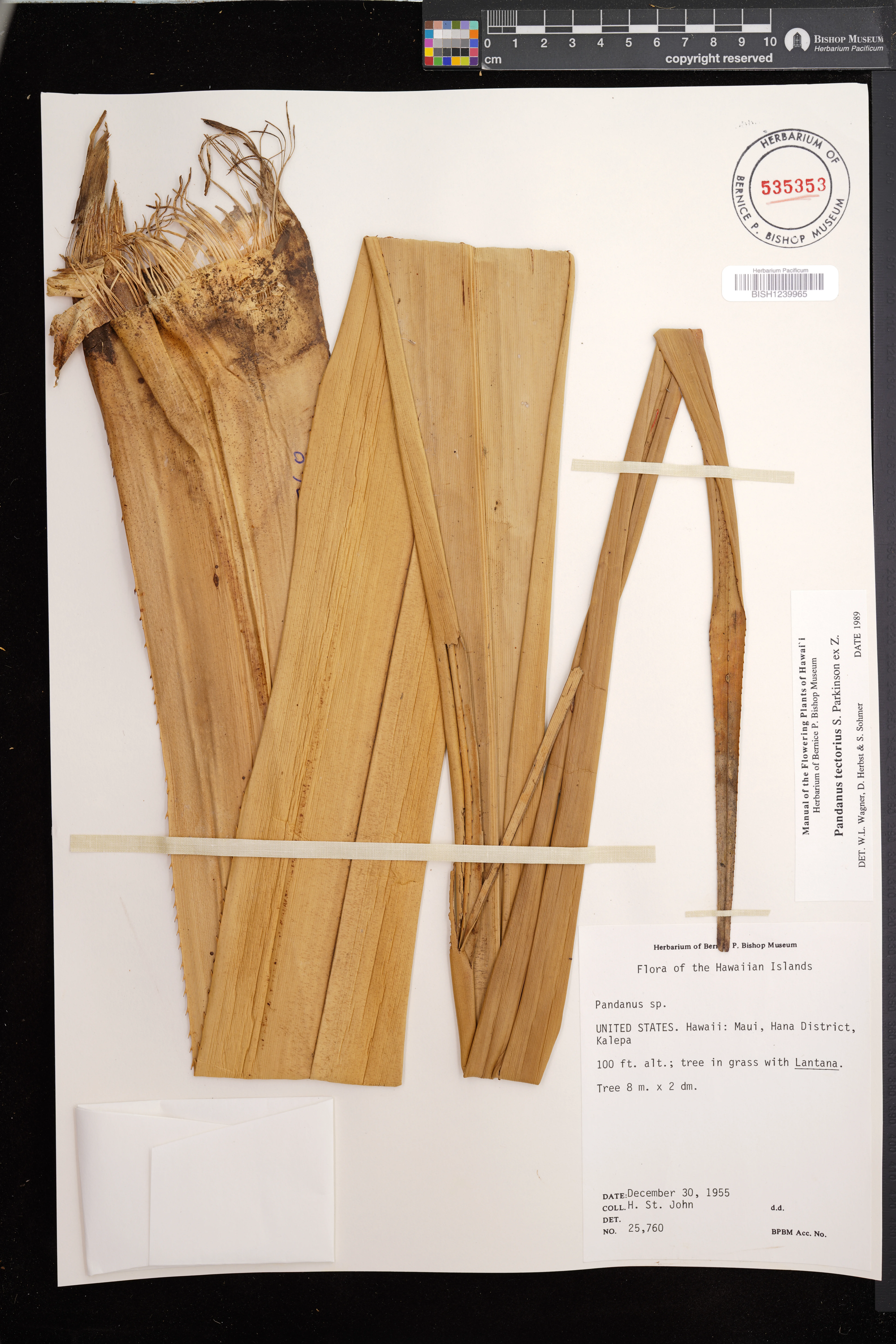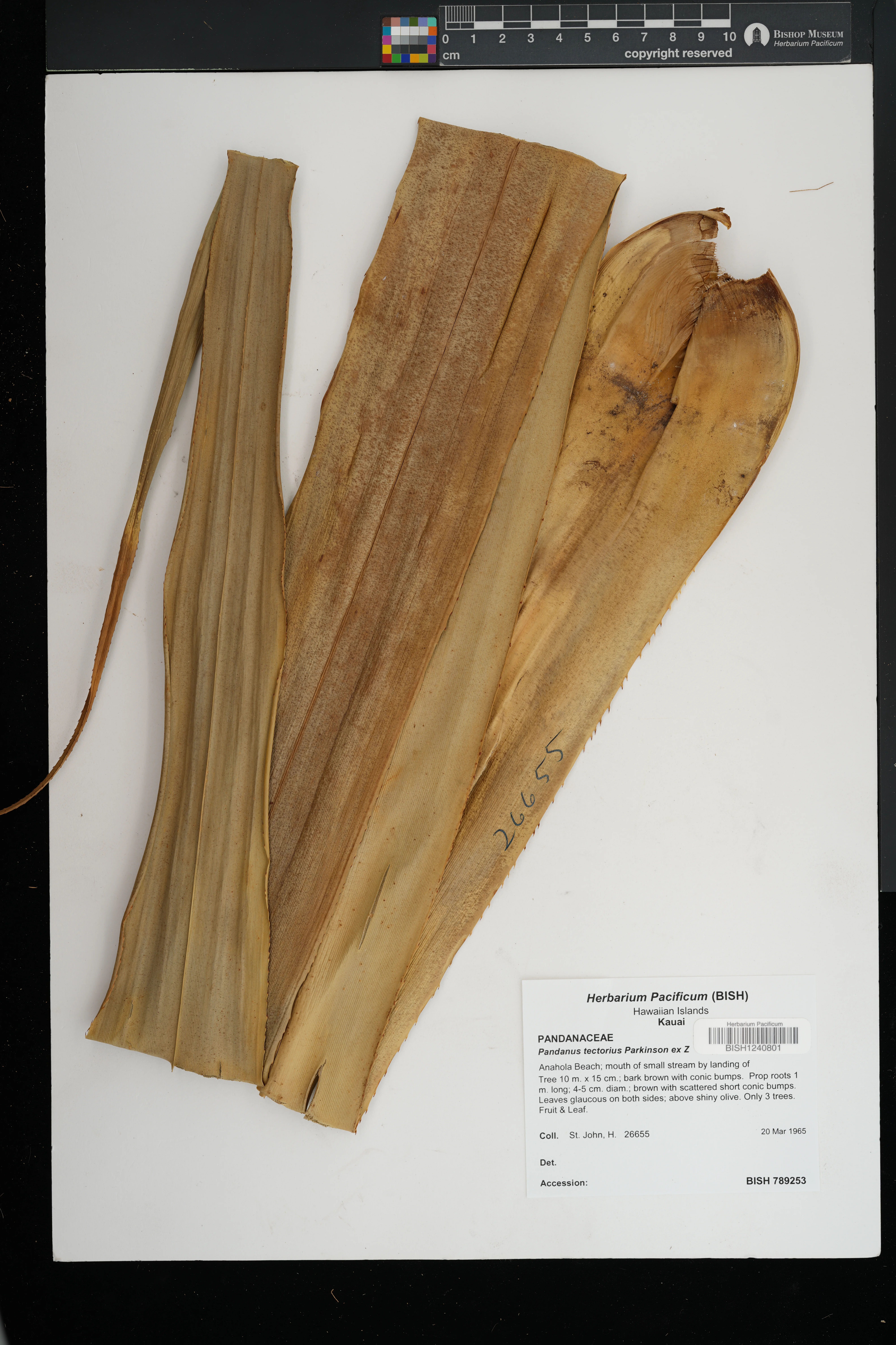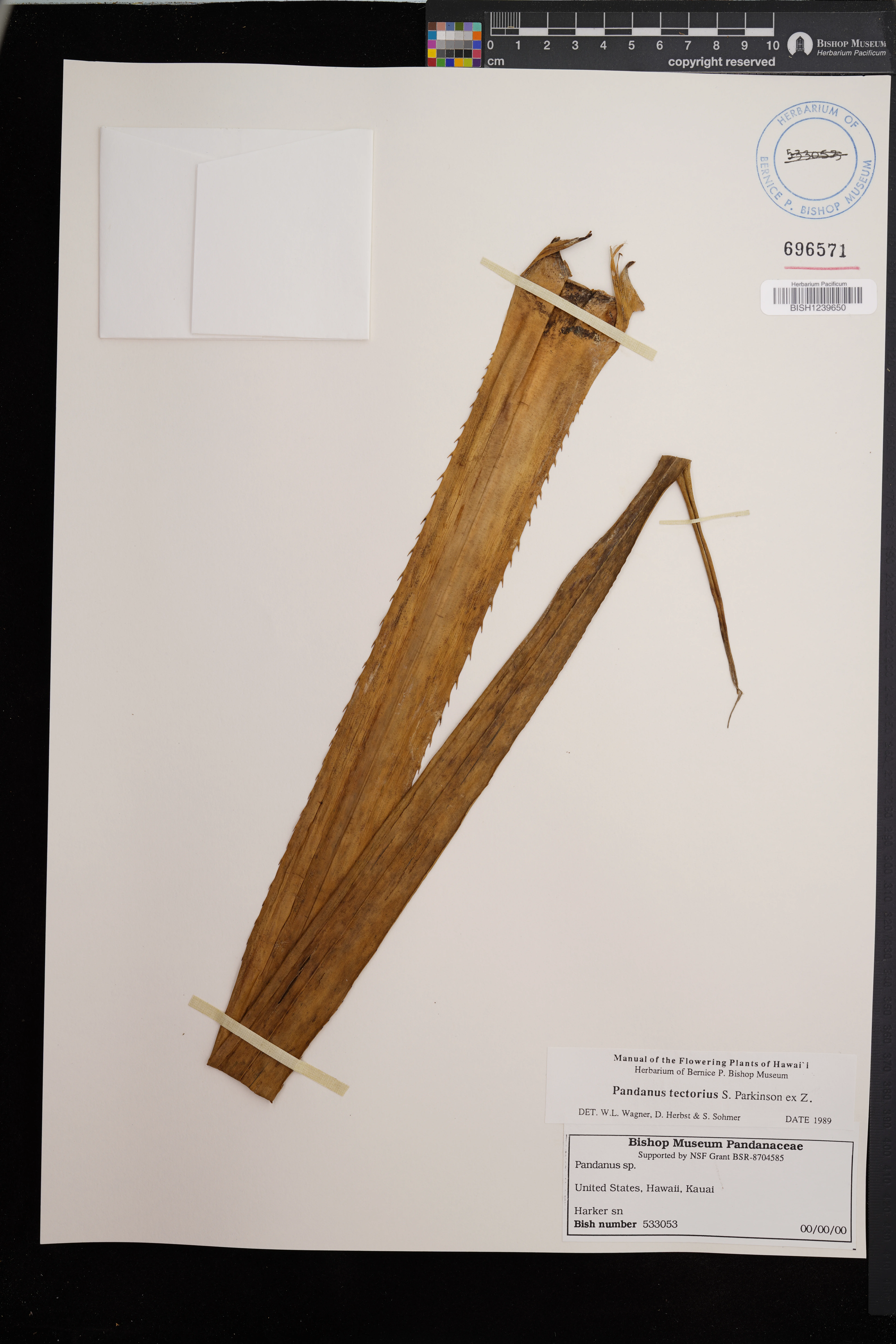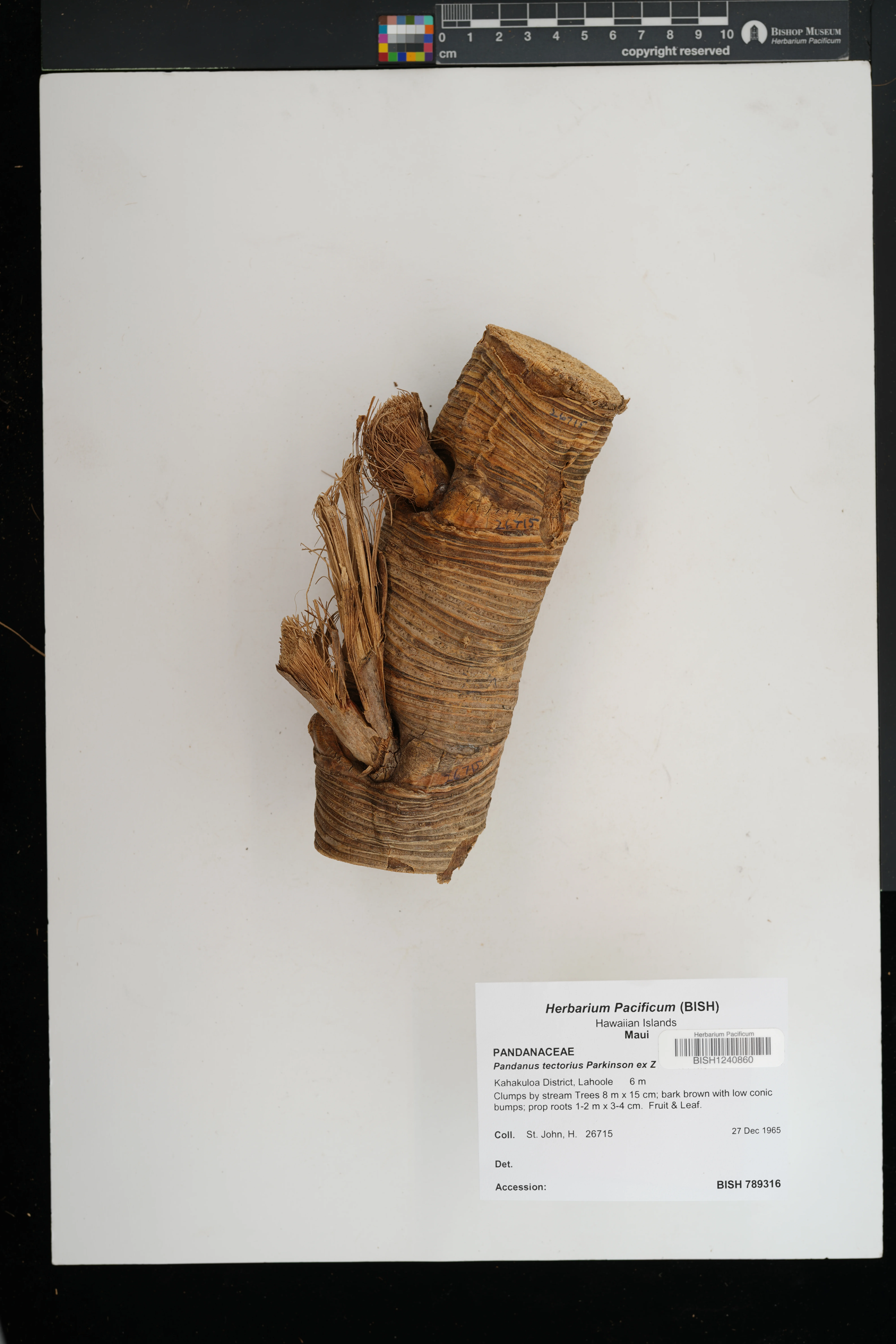 Tree about 20 ft. high; spreading about 20 ft.; shrubby; branching immediately where main aerial roots begin to radiate downward; brs. ending in large tufts of long lvs. which have wide white band down |