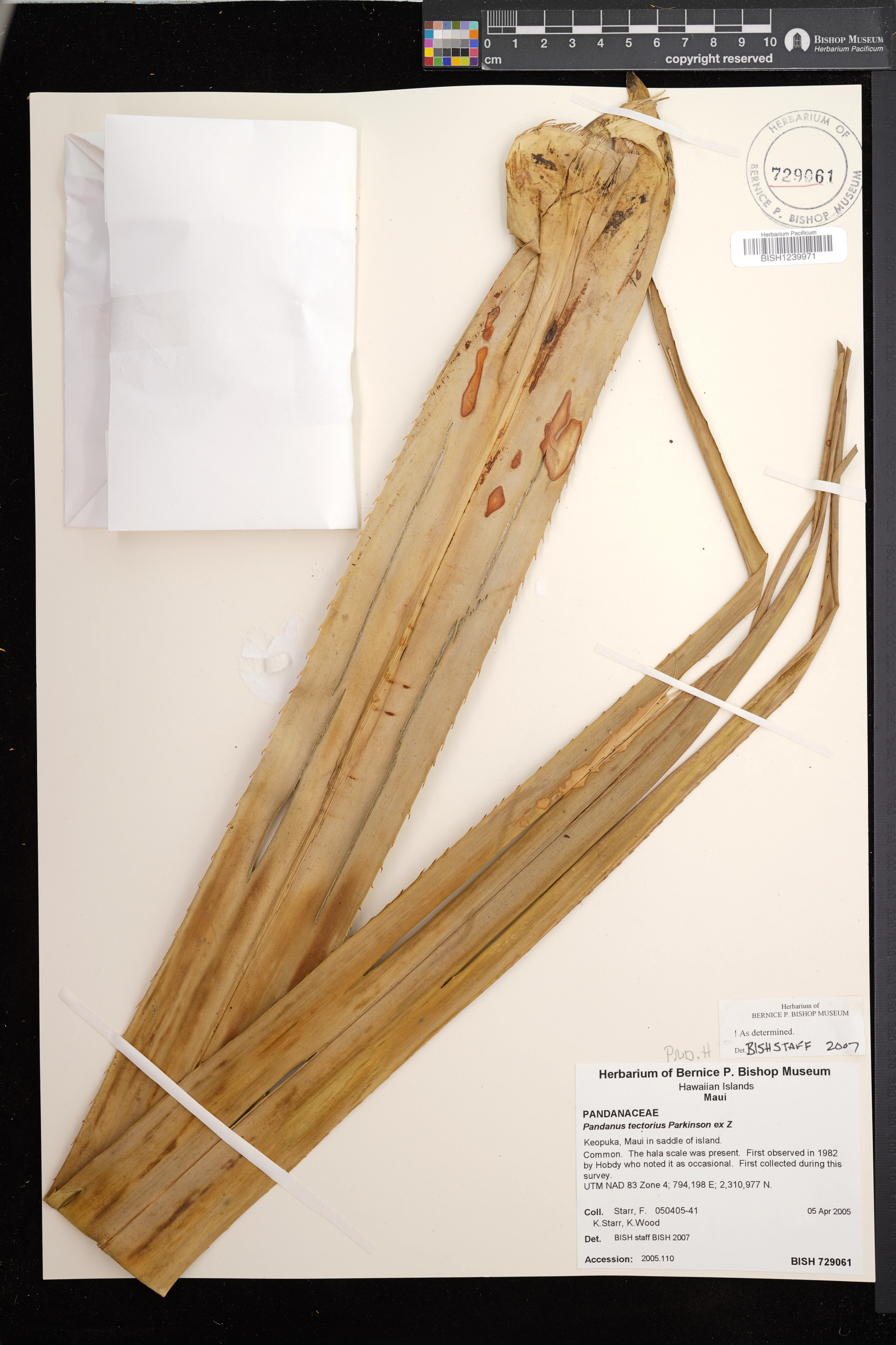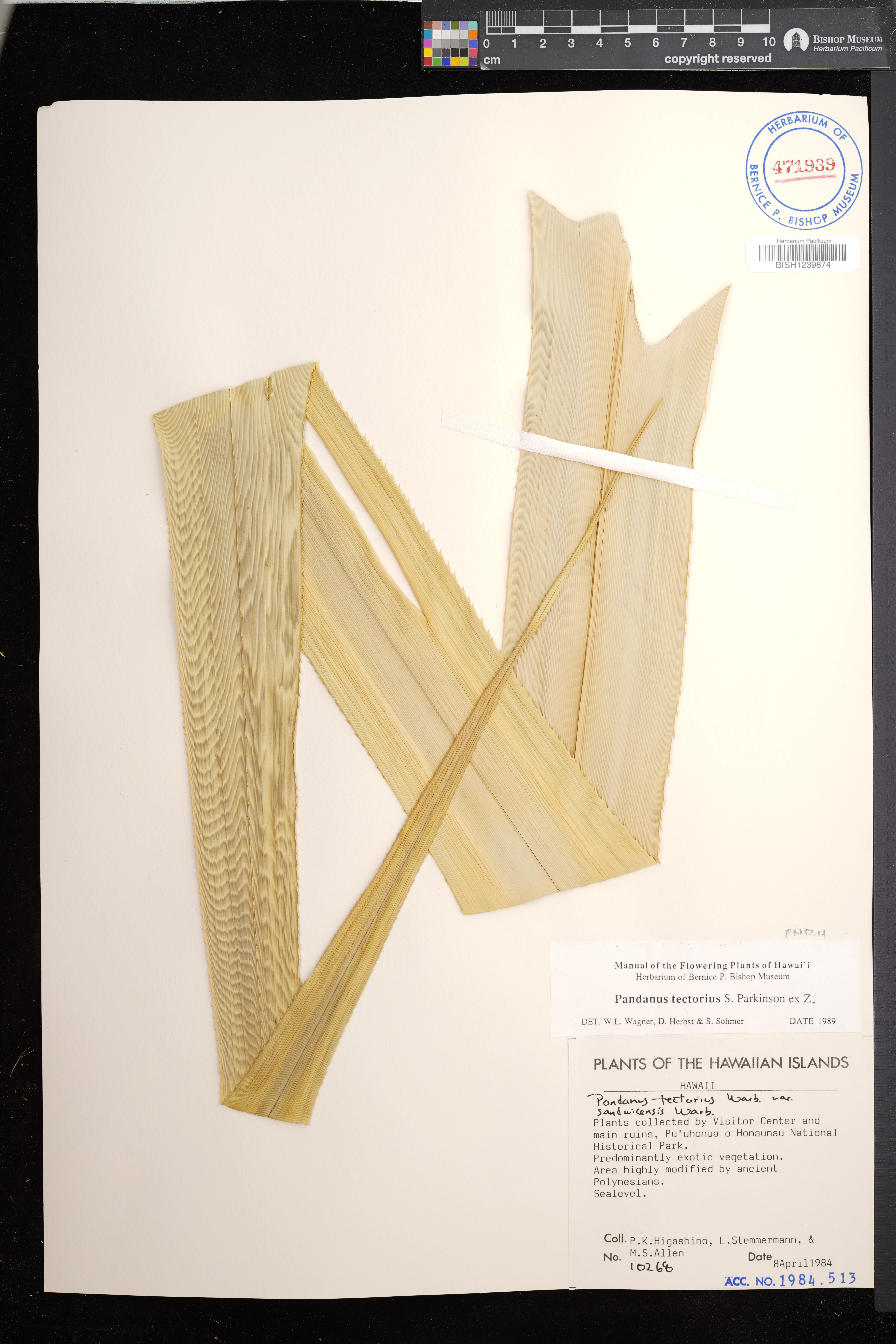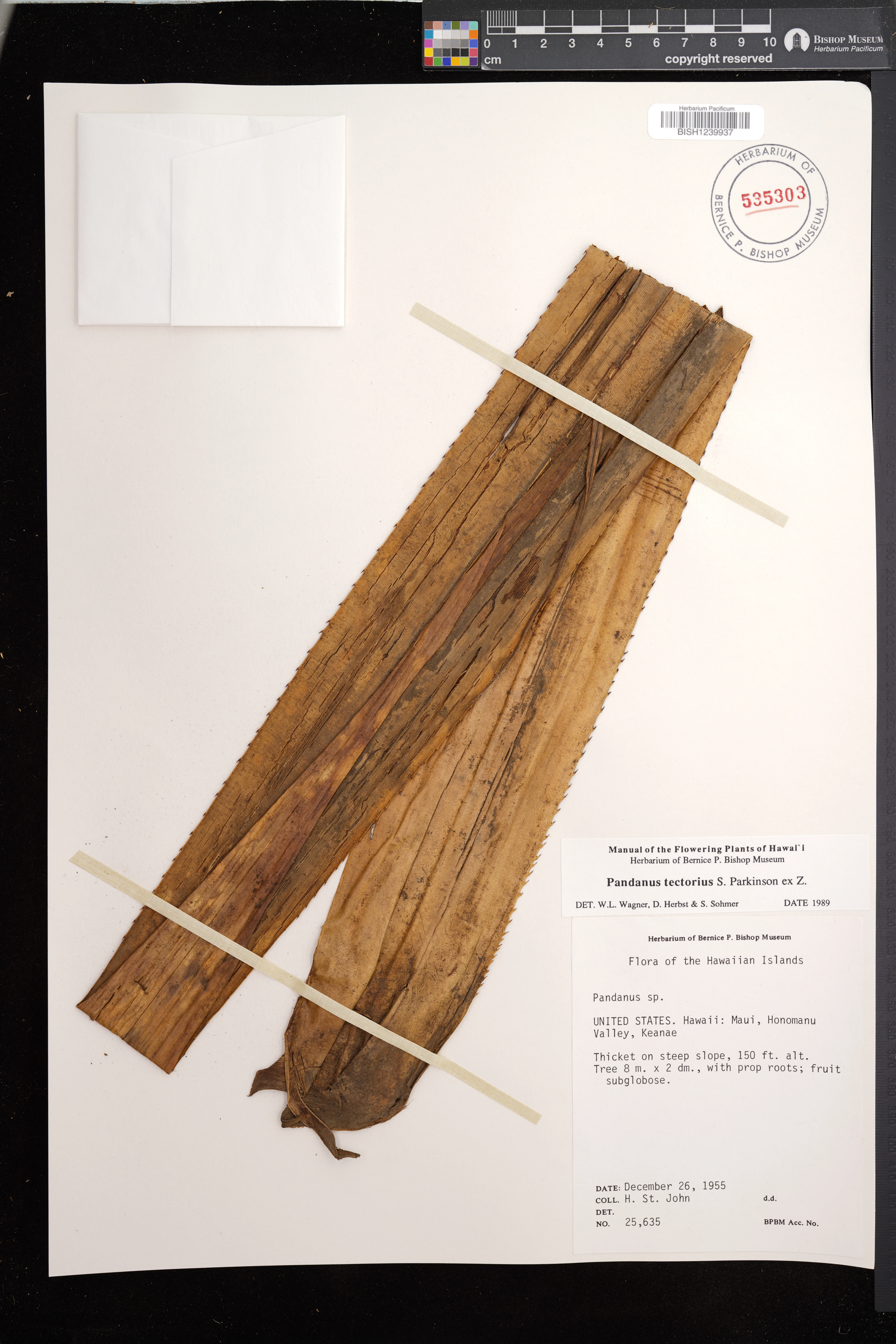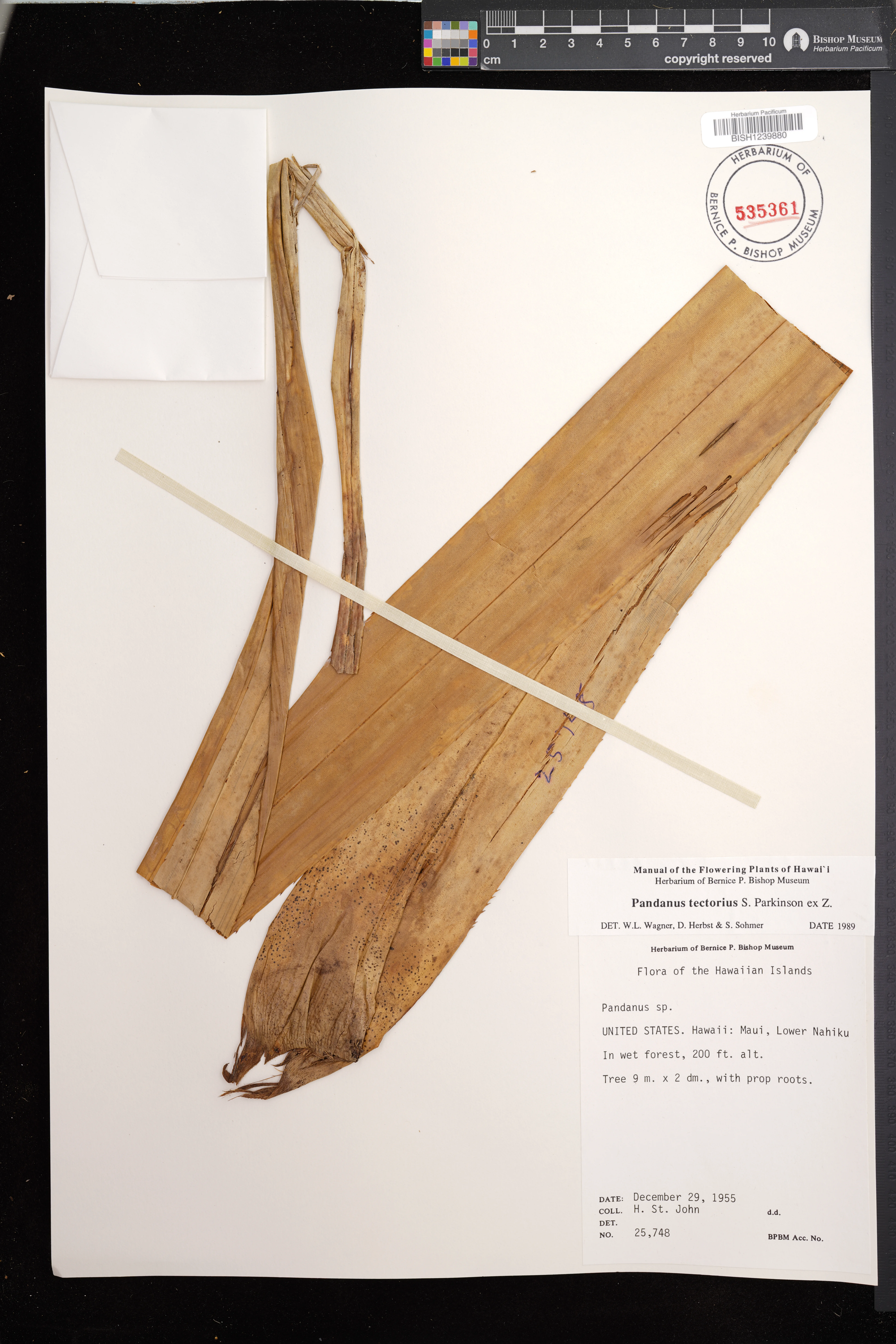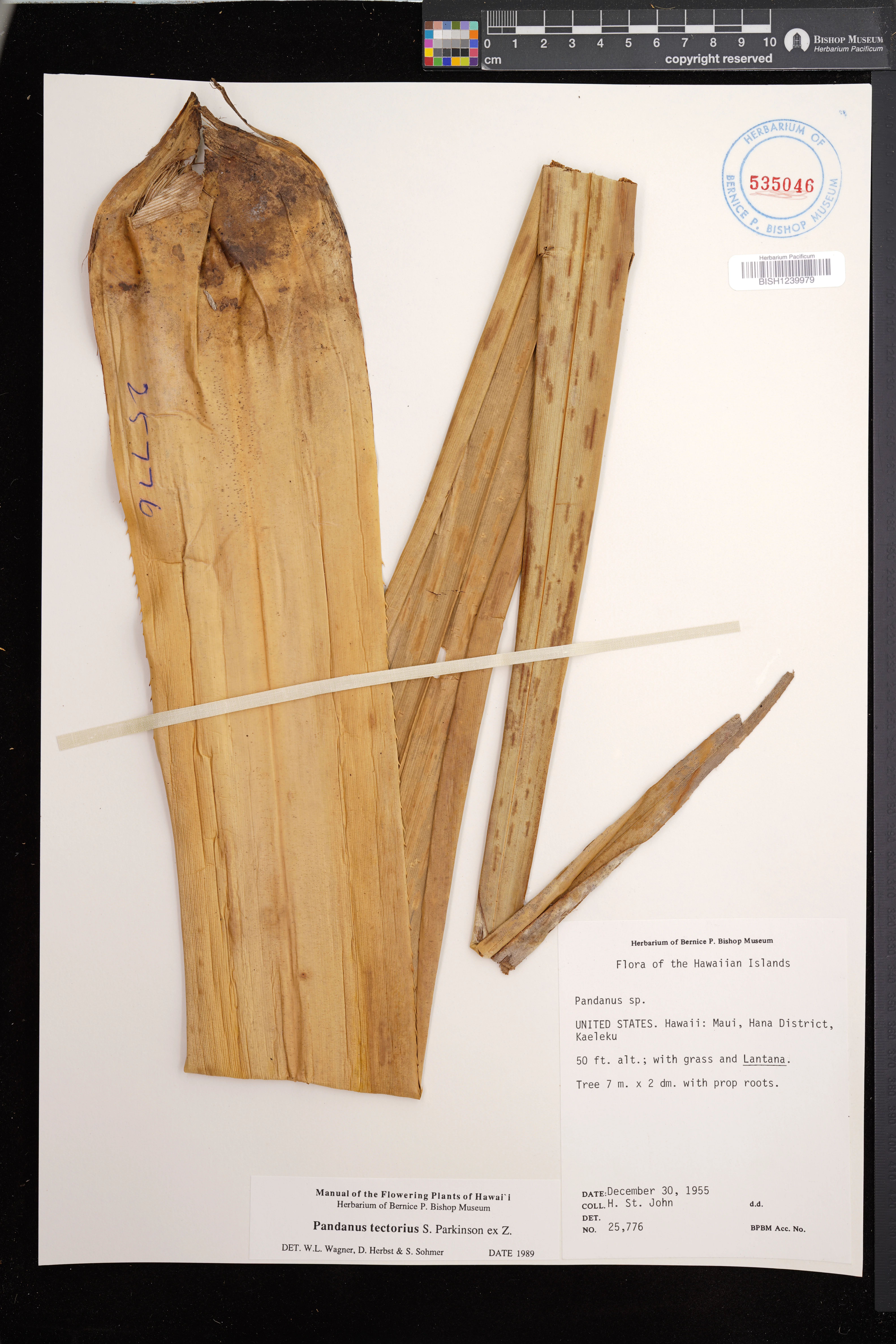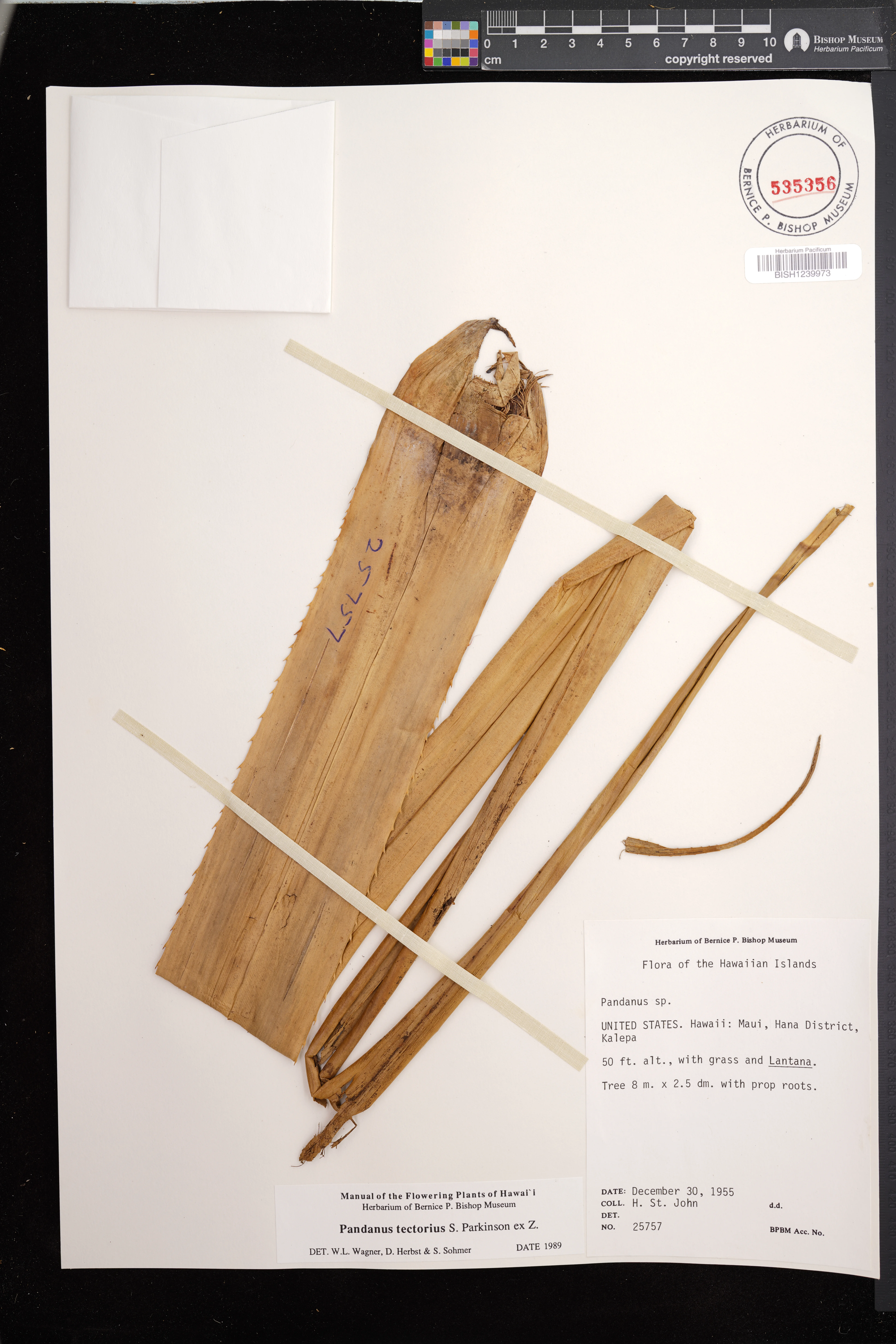 Tree about 20 ft. high; spreading about 20 ft.; shrubby; branching immediately where main aerial roots begin to radiate downward; brs. ending in large tufts of long lvs. which have wide white band down |