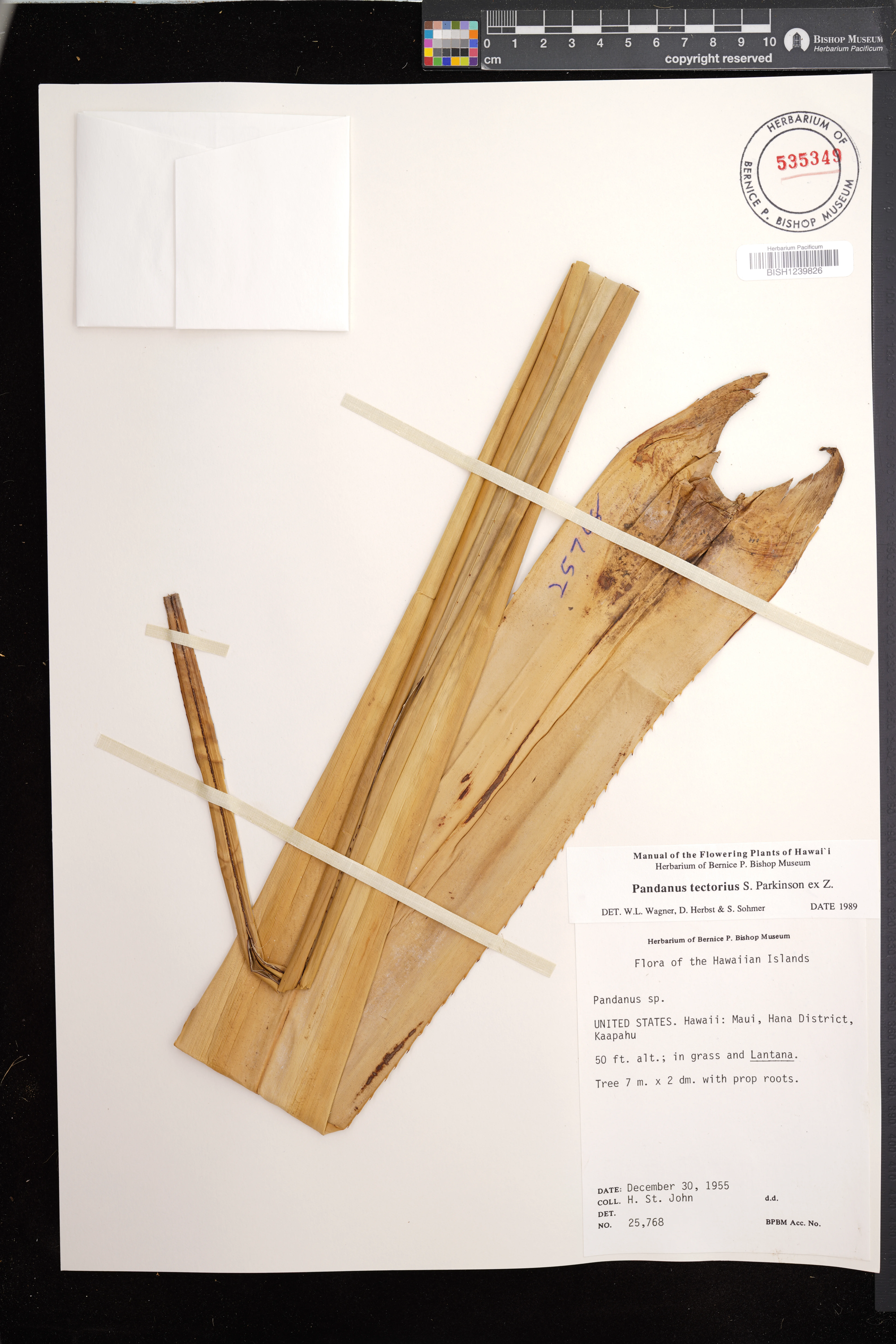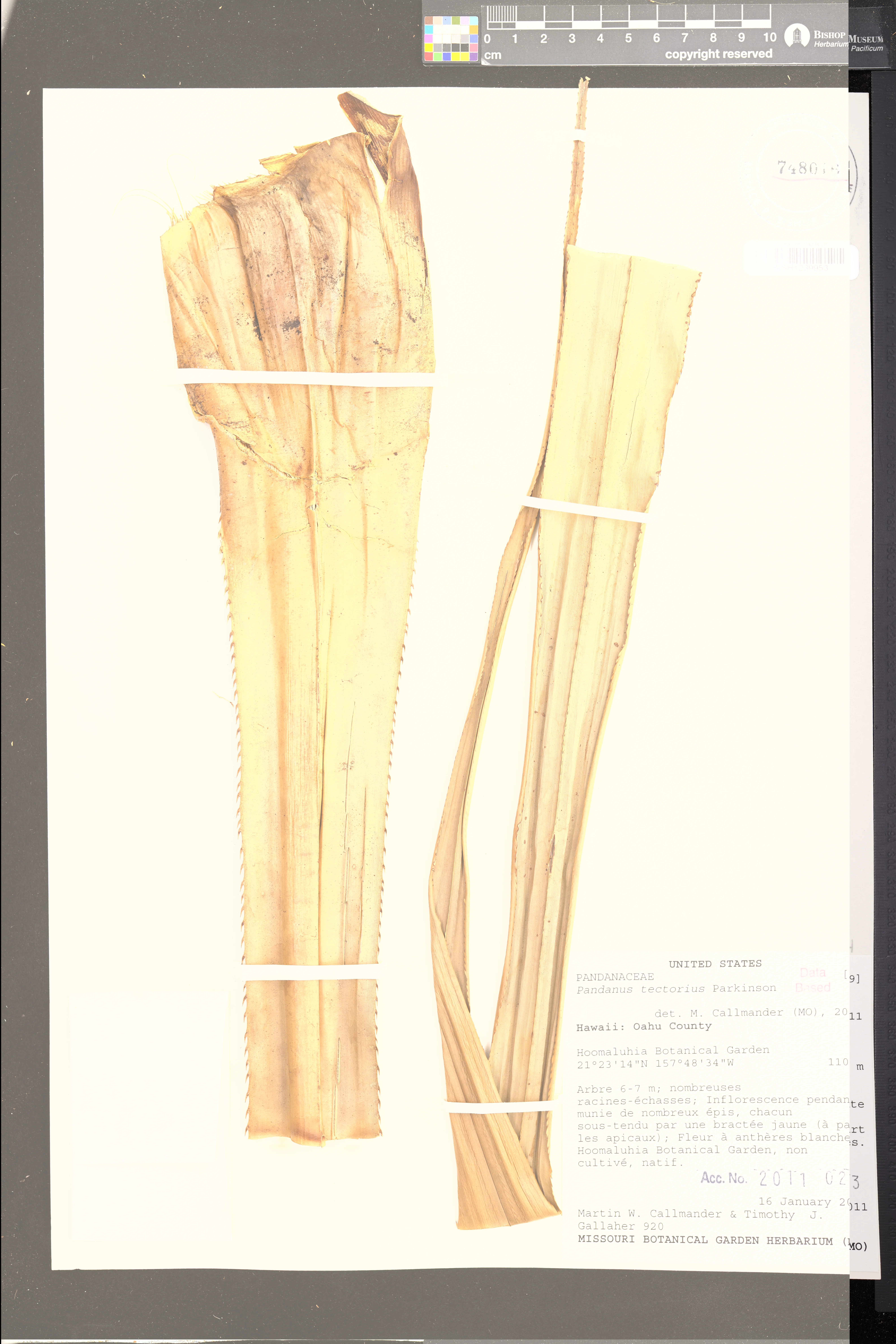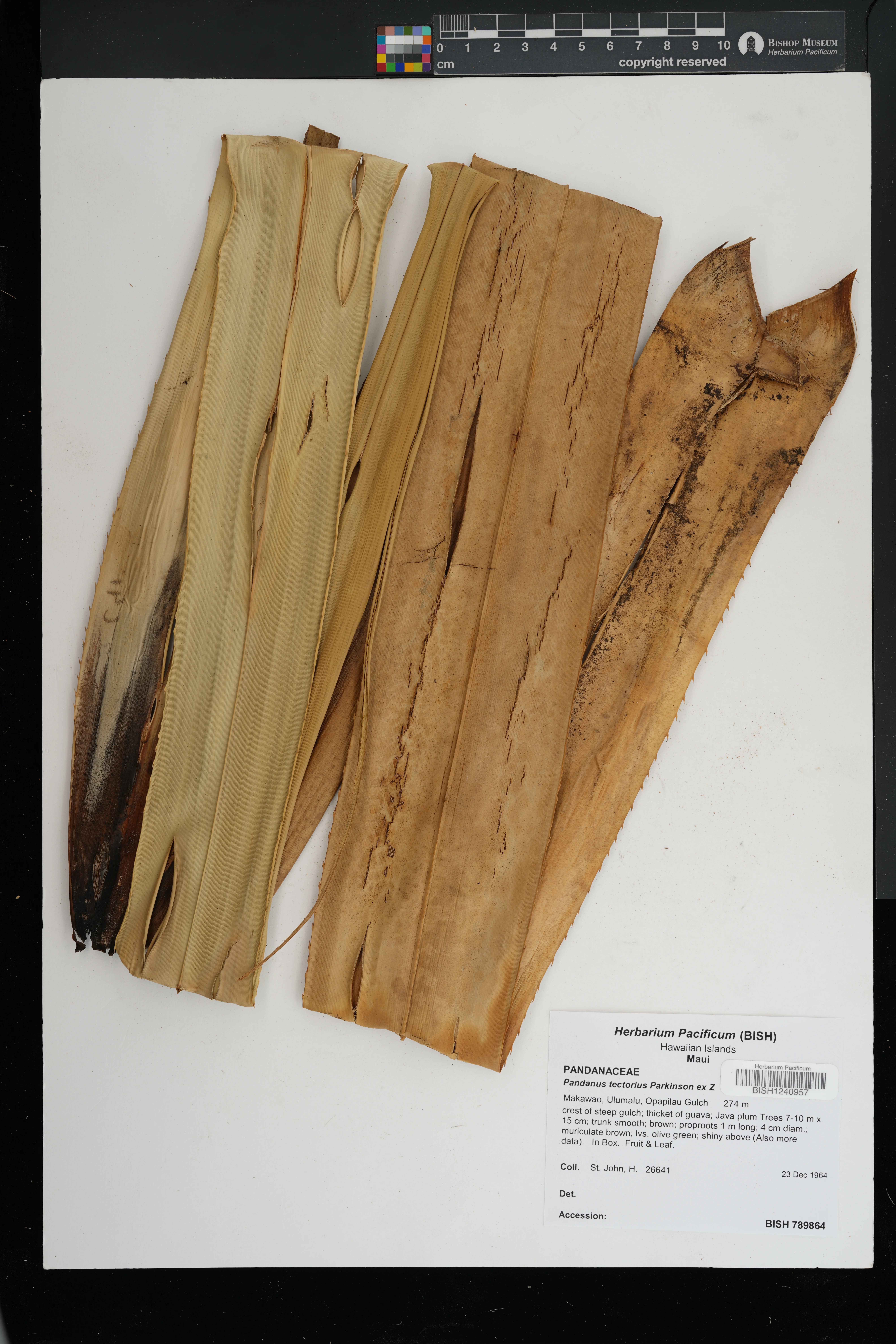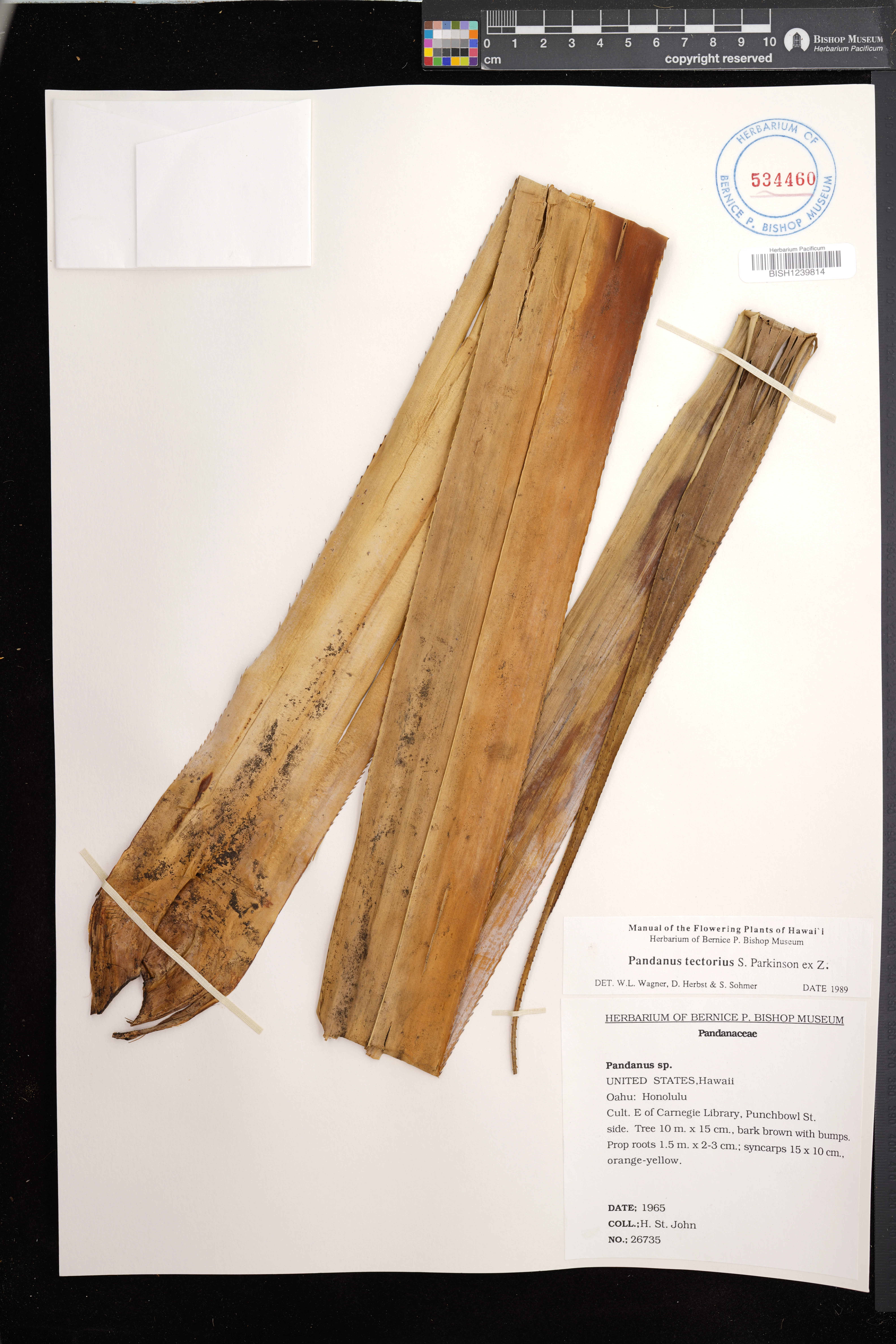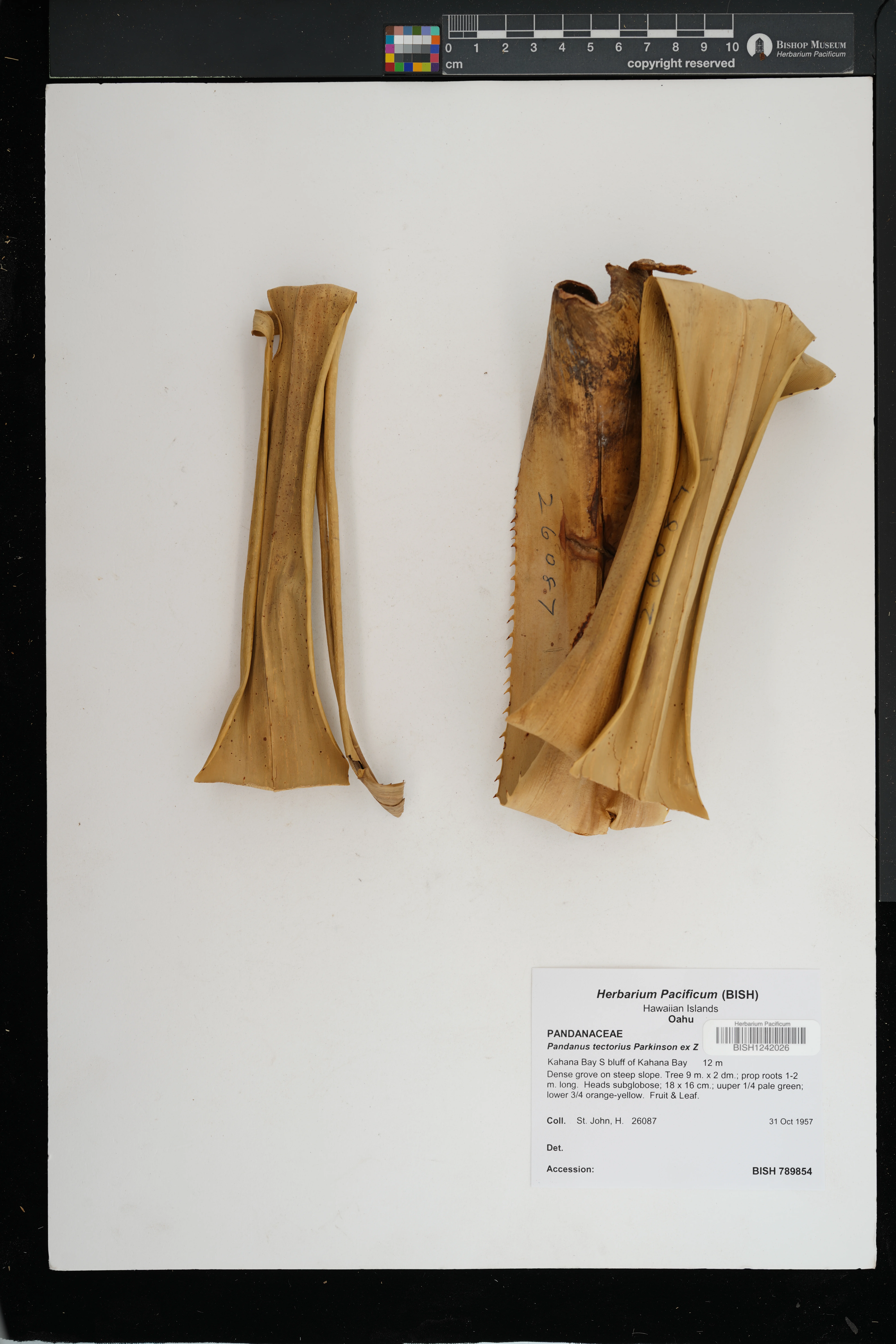 Tree about 20 ft. high; spreading about 20 ft.; shrubby; branching immediately where main aerial roots begin to radiate downward; brs. ending in large tufts of long lvs. which have wide white band down |