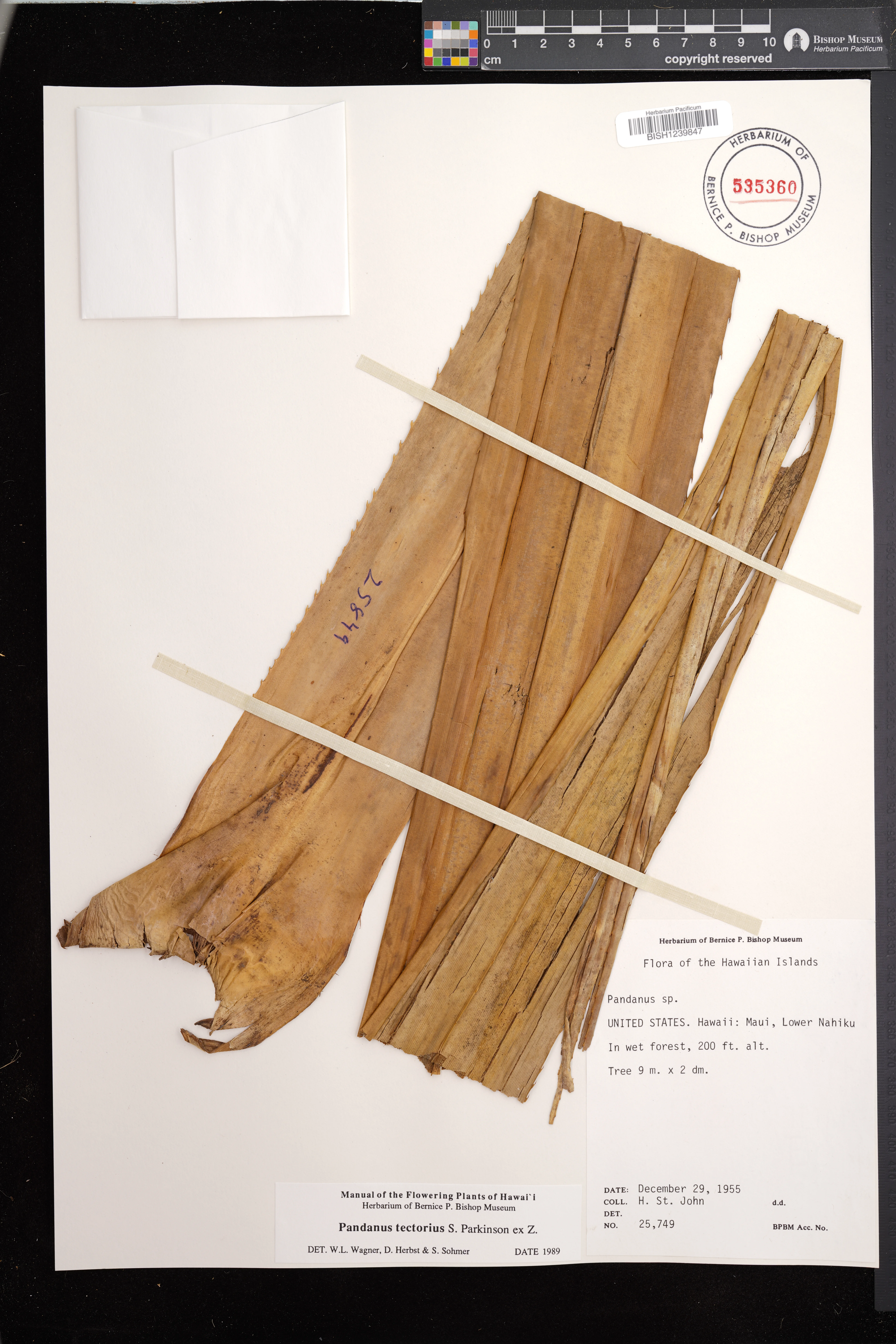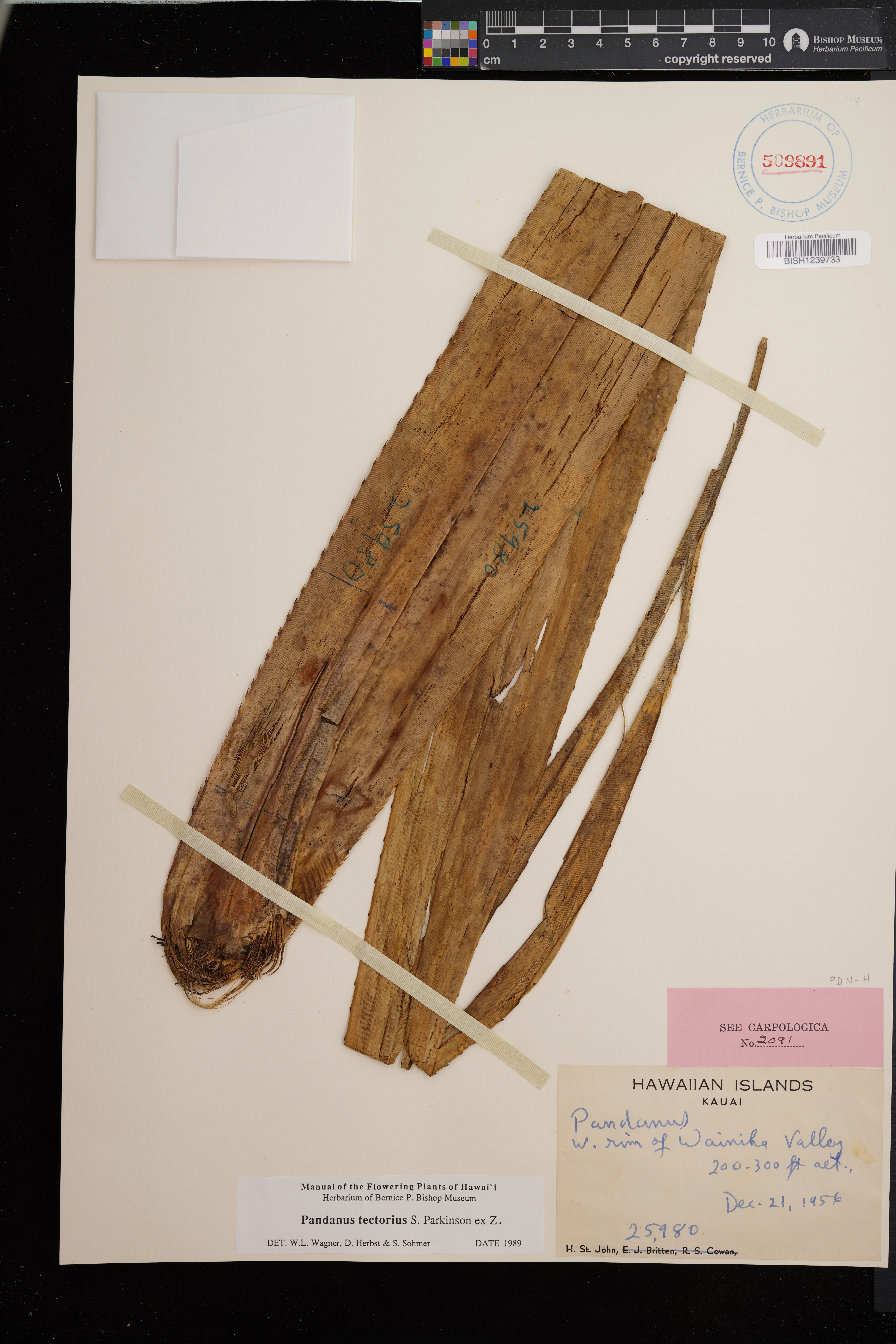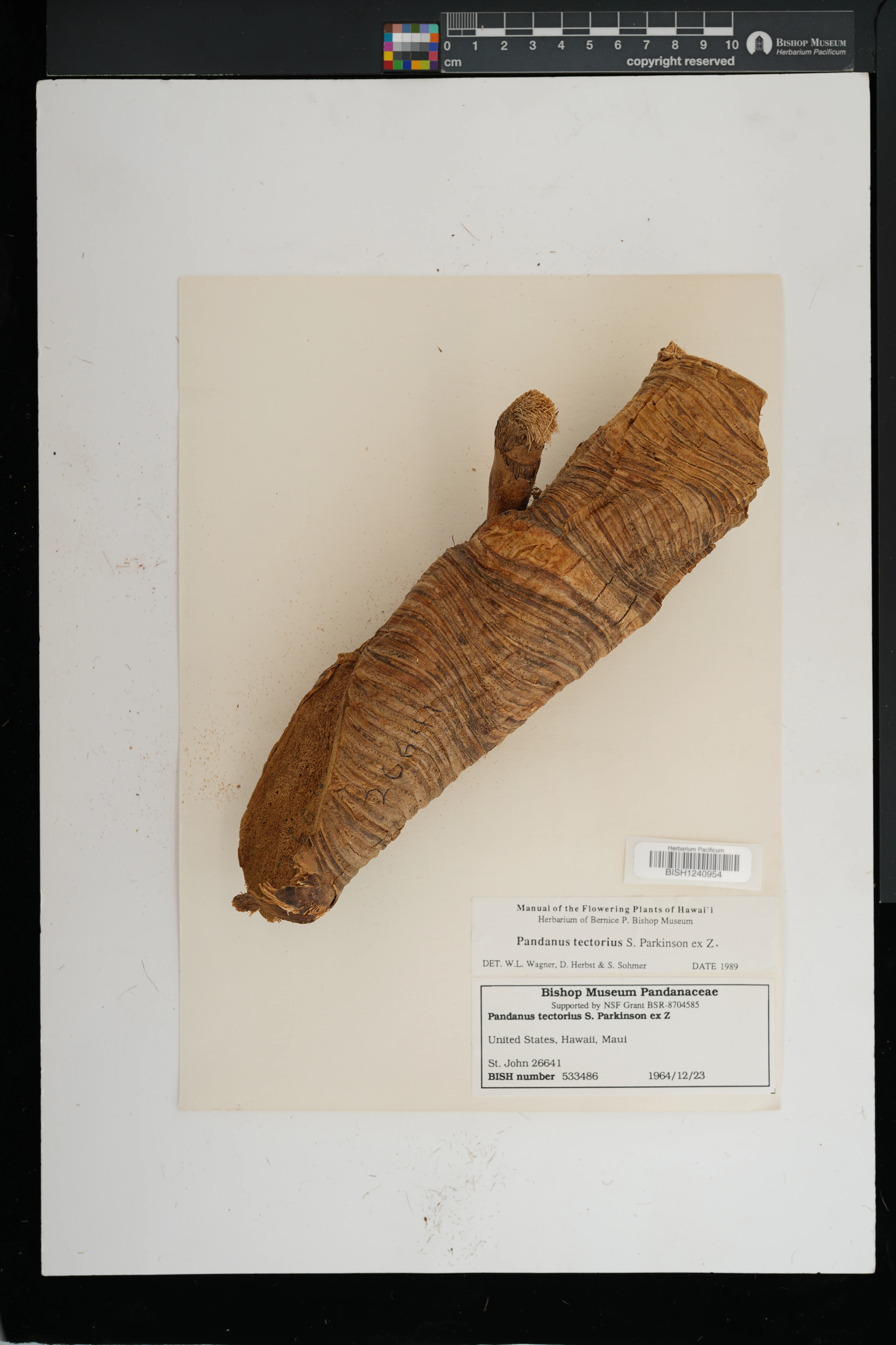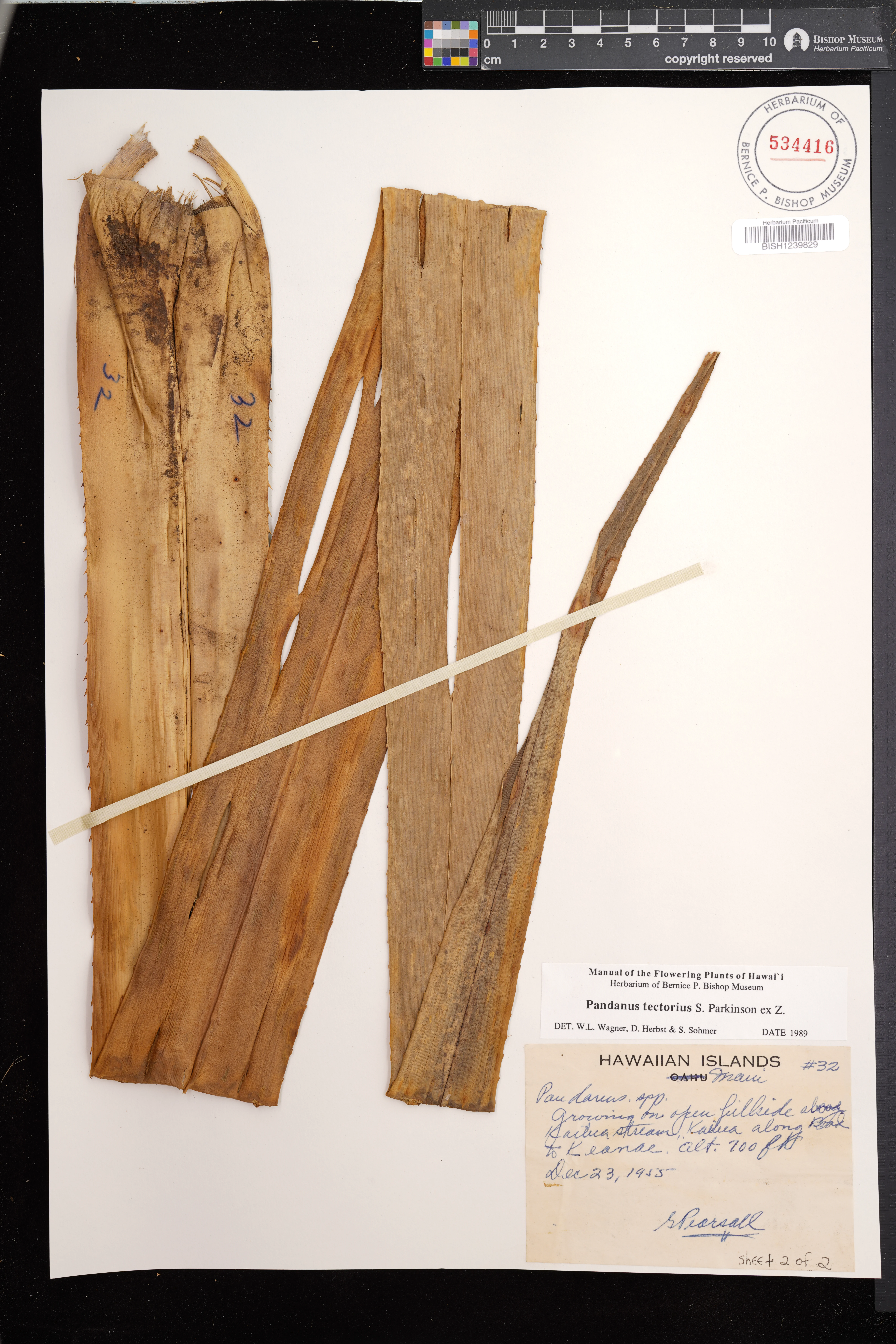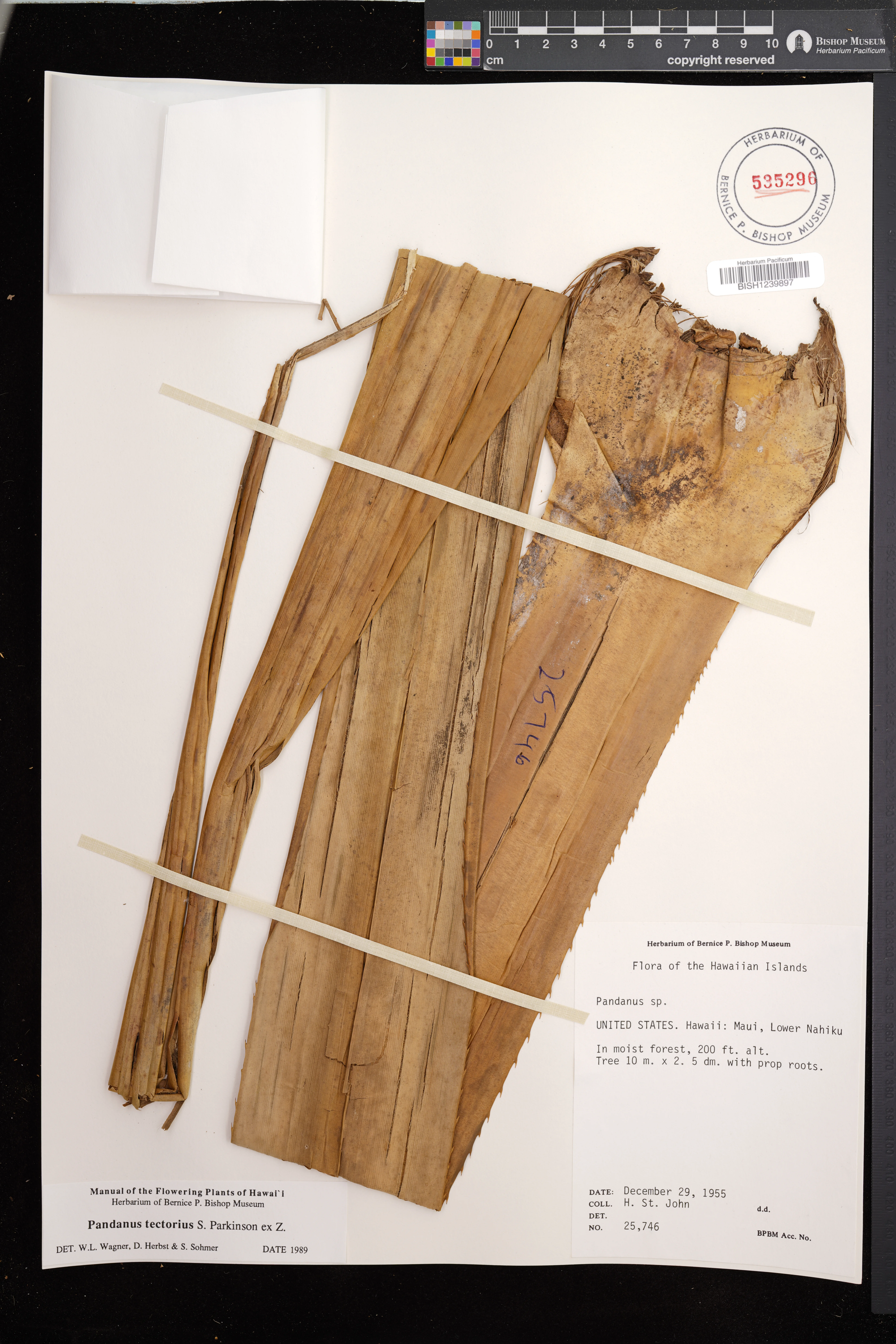 Tree about 20 ft. high; spreading about 20 ft.; shrubby; branching immediately where main aerial roots begin to radiate downward; brs. ending in large tufts of long lvs. which have wide white band down |