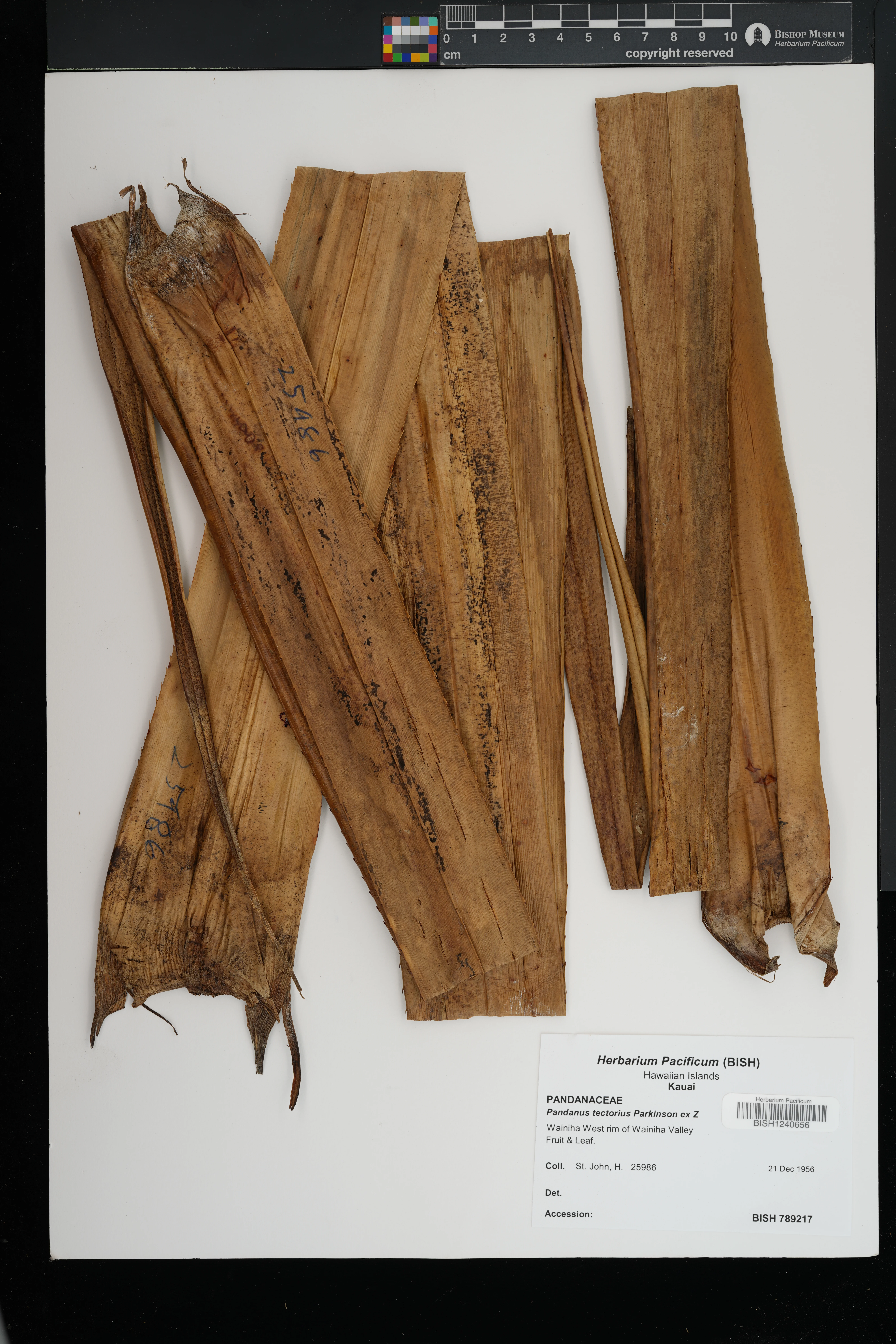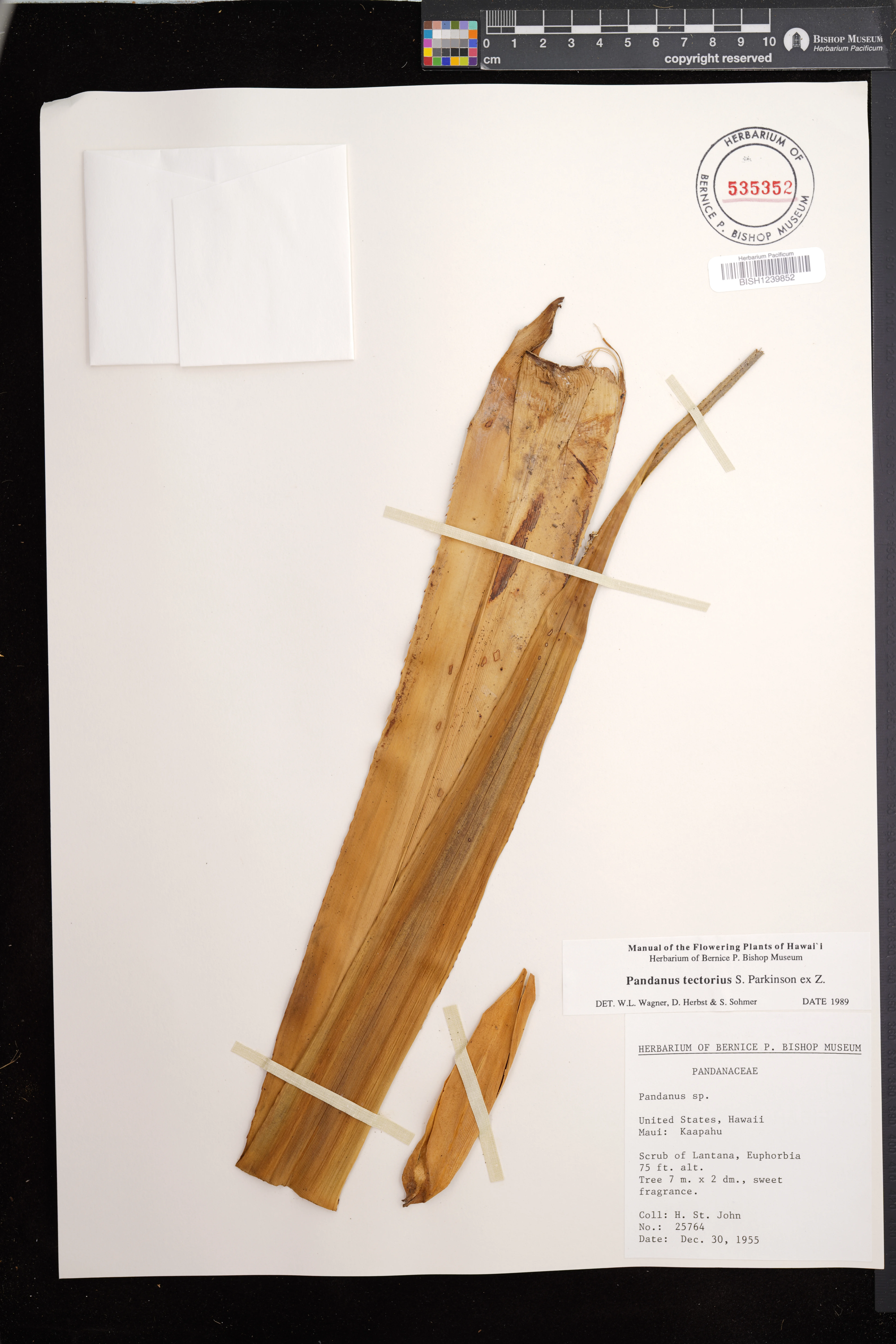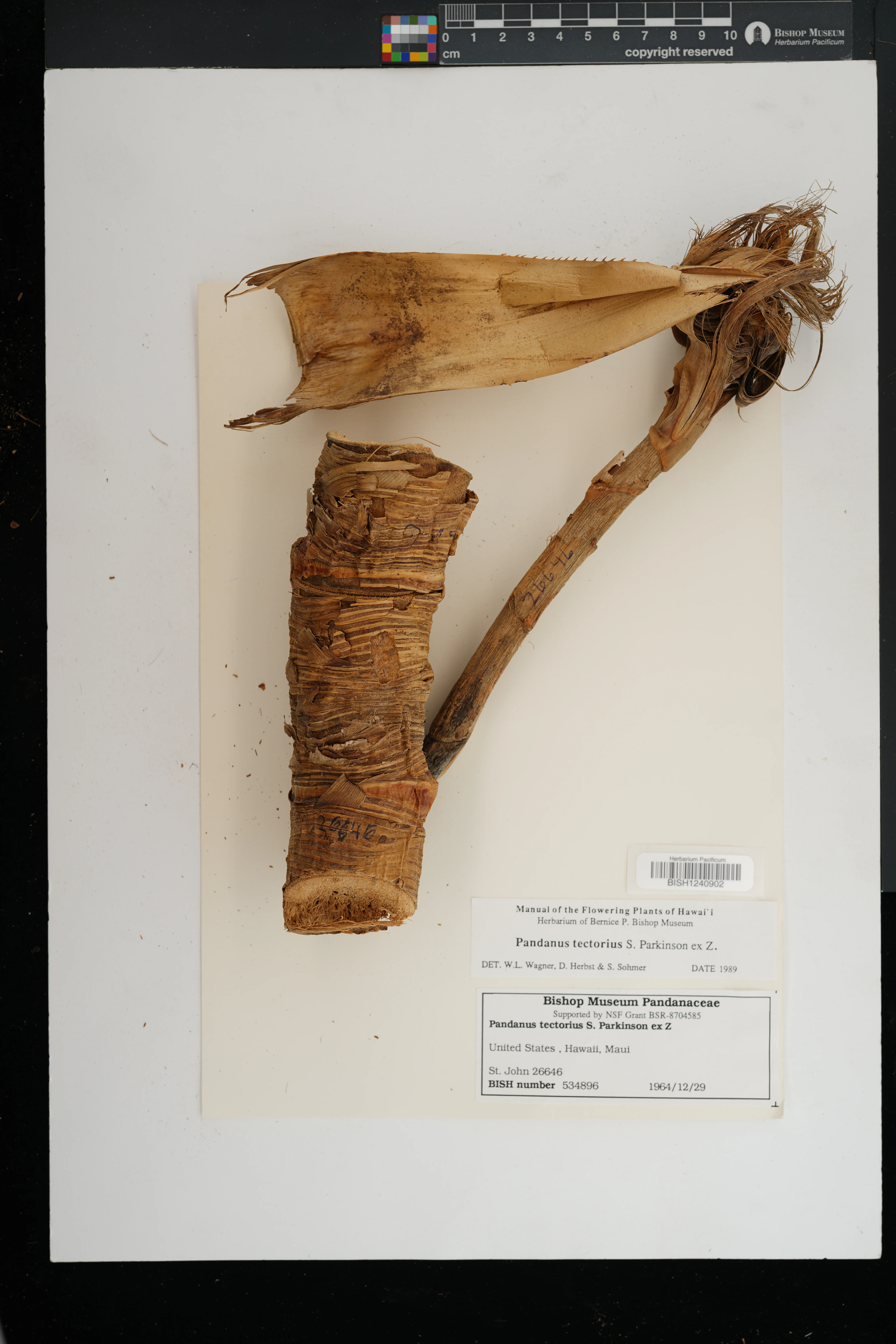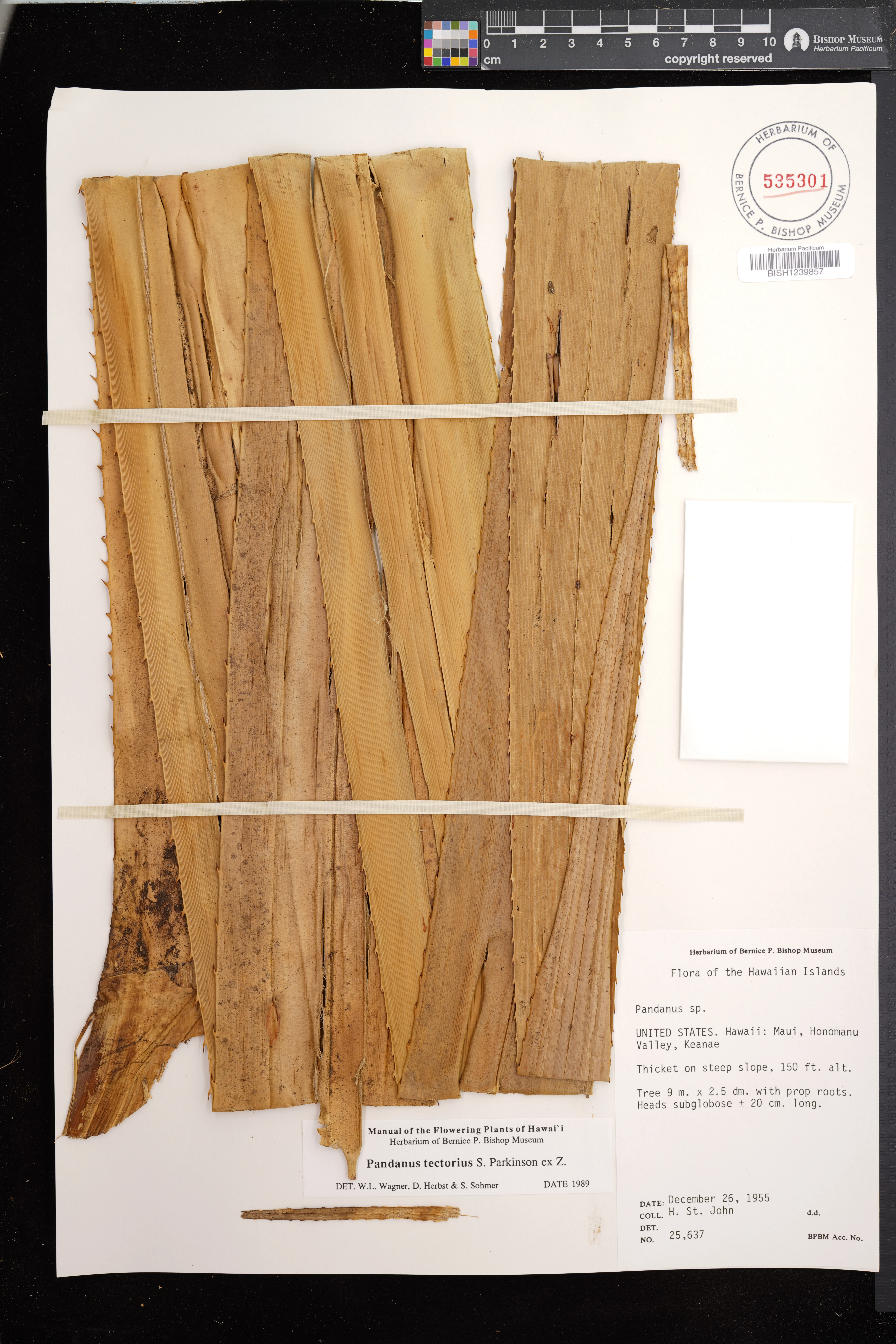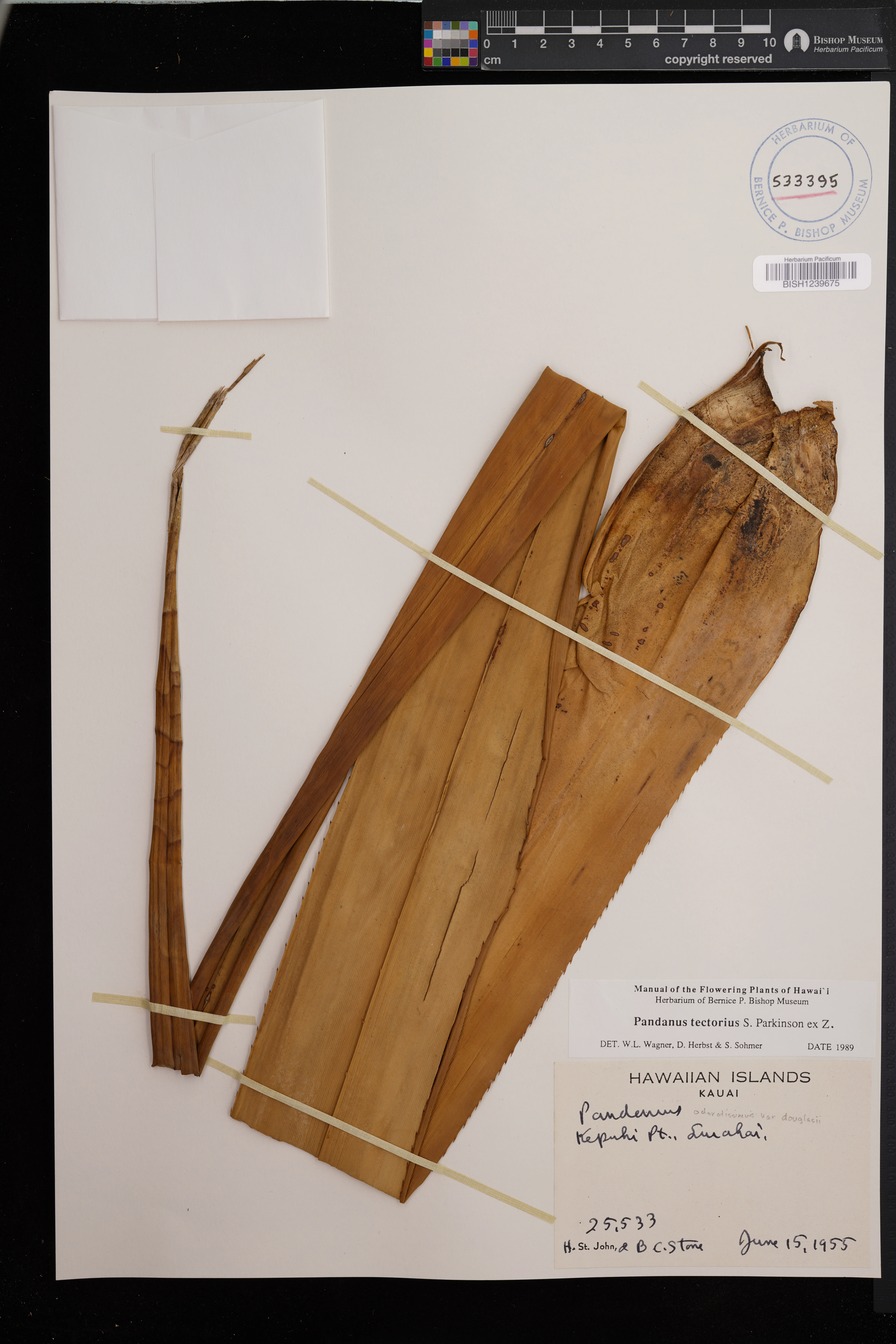 Tree about 20 ft. high; spreading about 20 ft.; shrubby; branching immediately where main aerial roots begin to radiate downward; brs. ending in large tufts of long lvs. which have wide white band down |