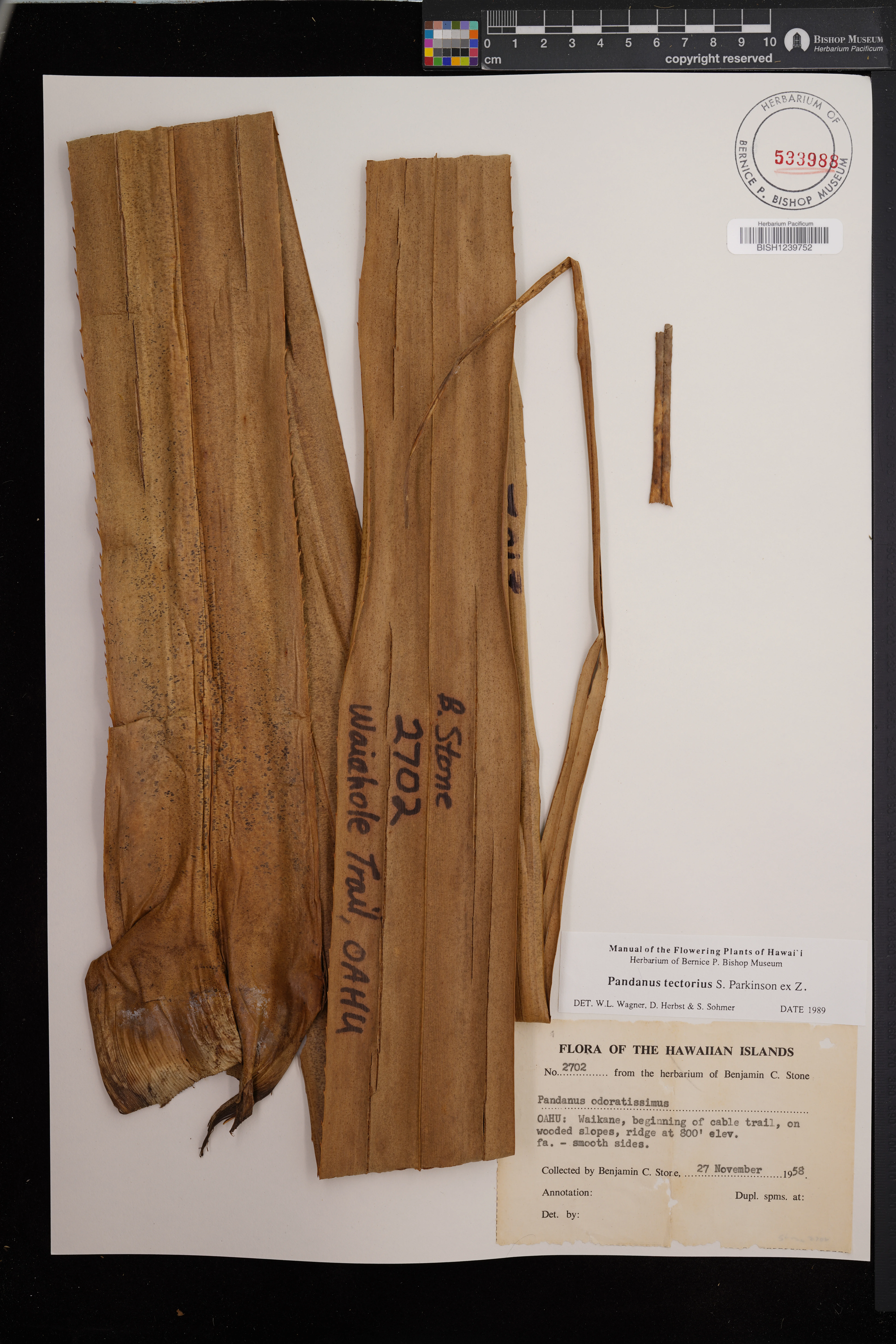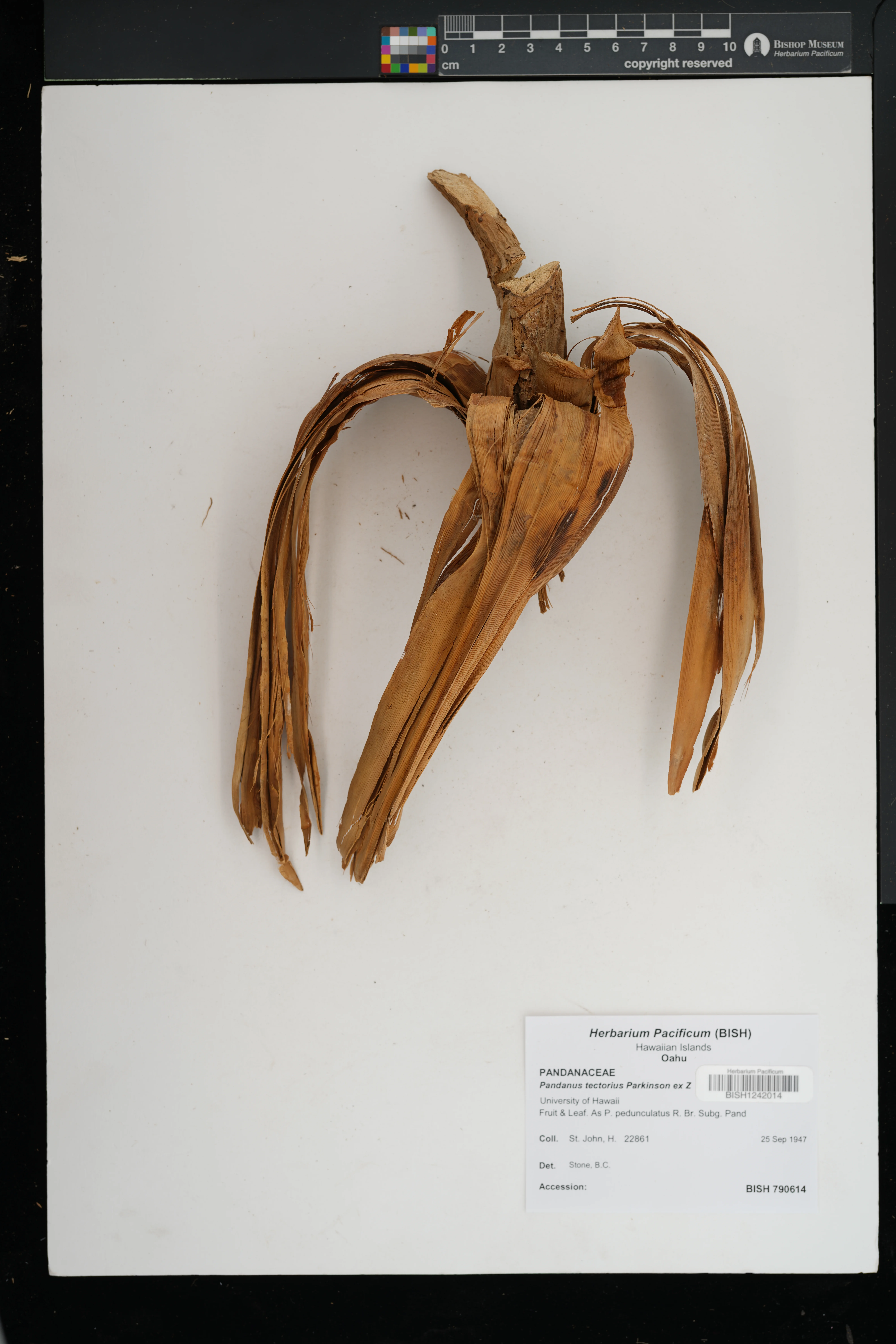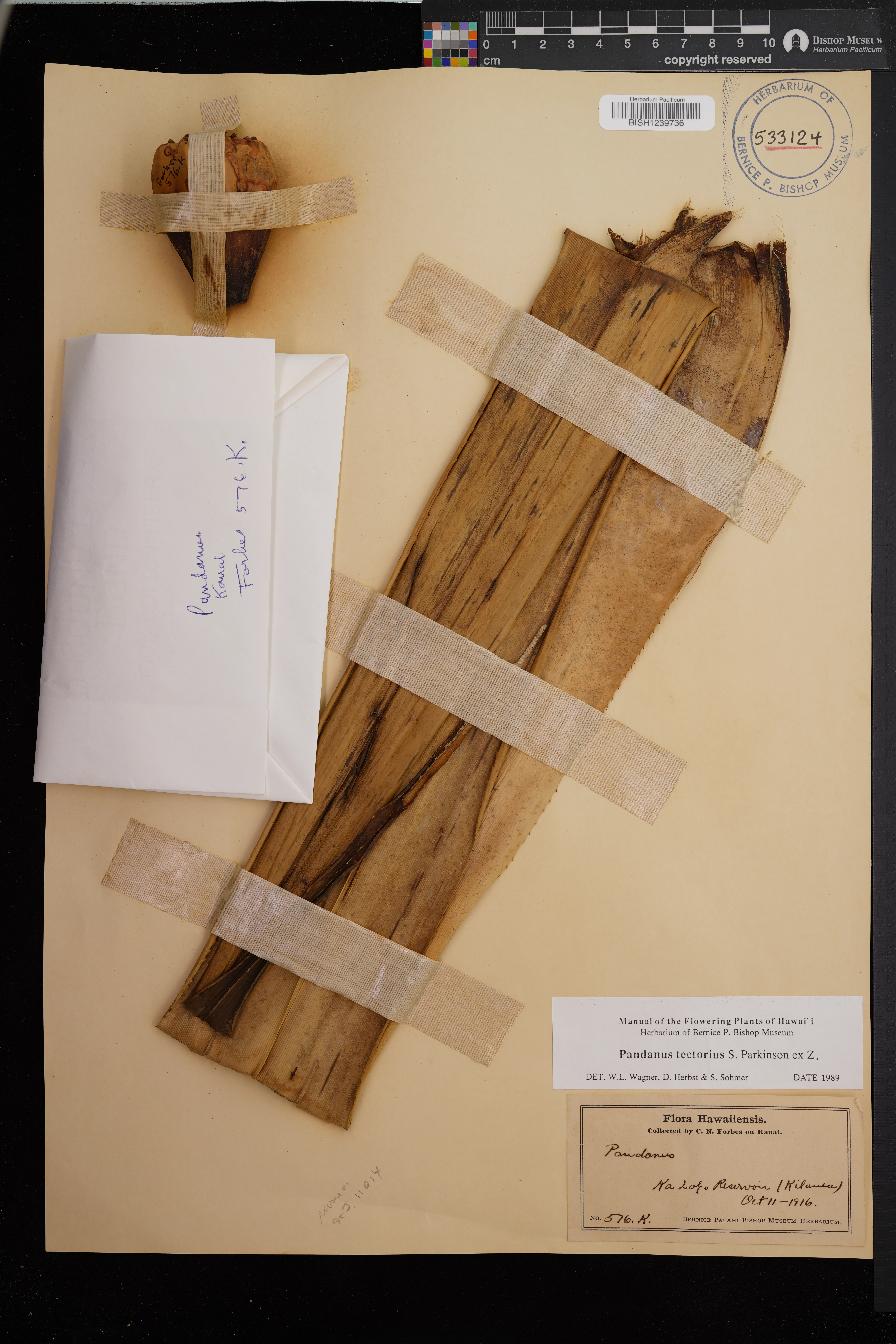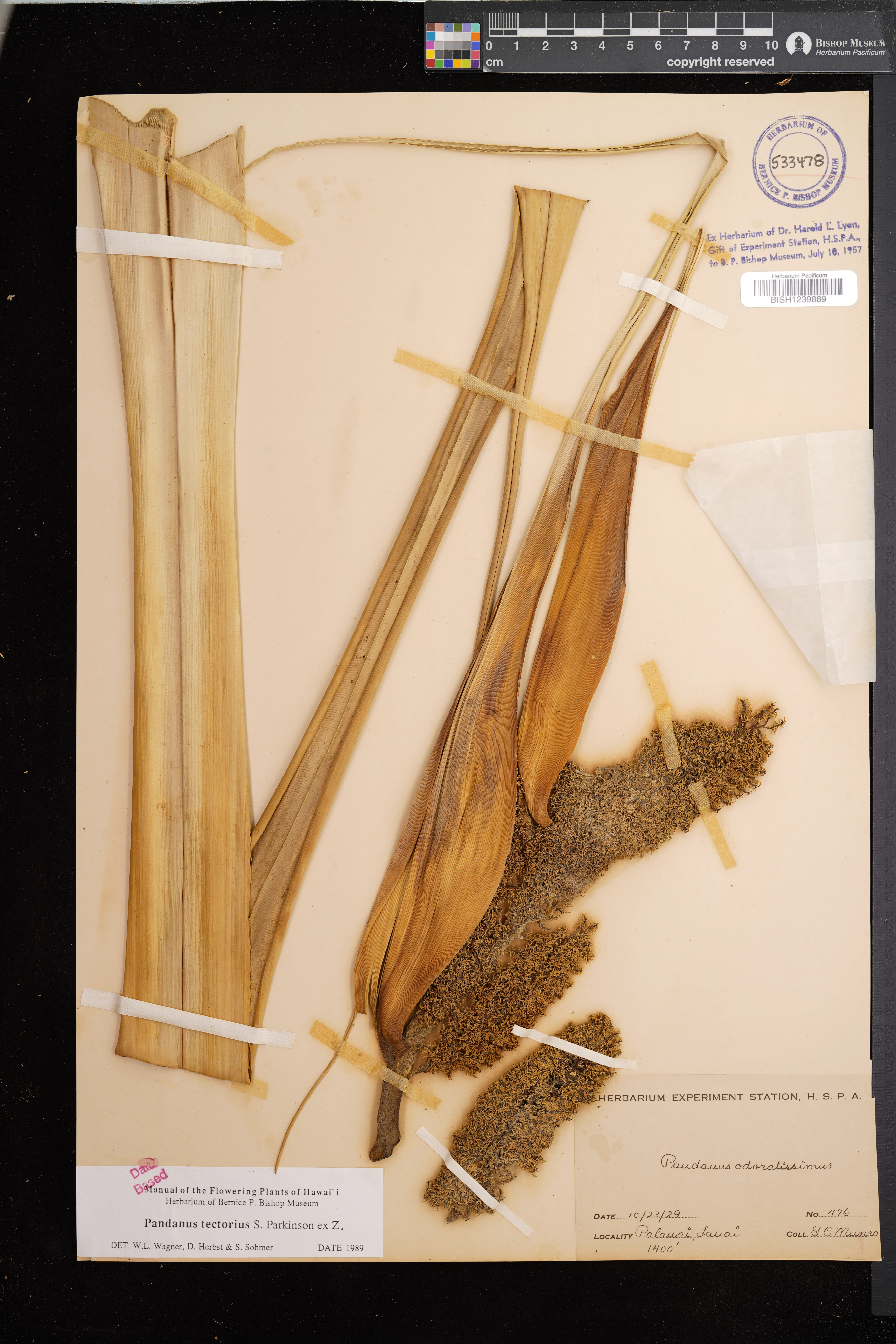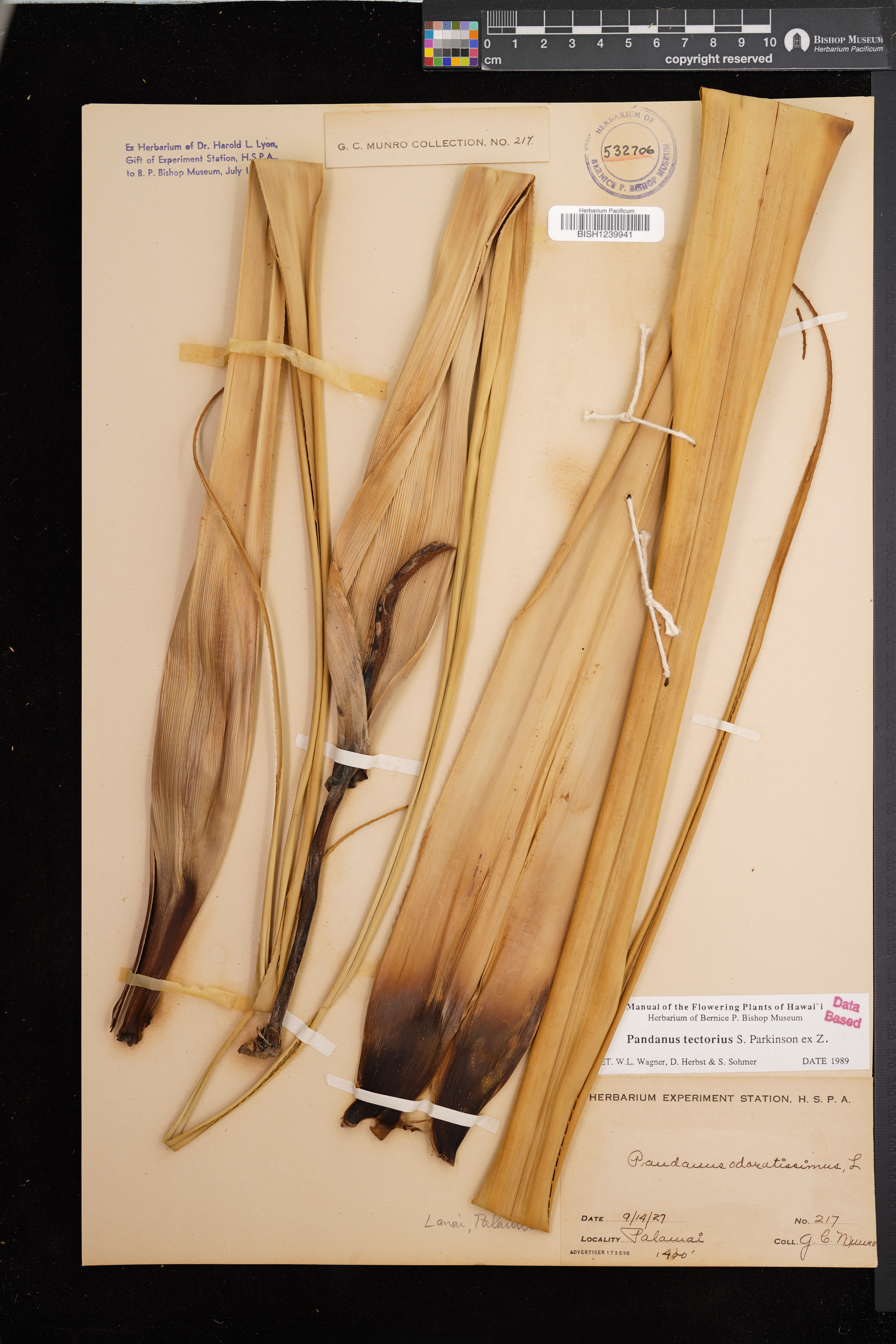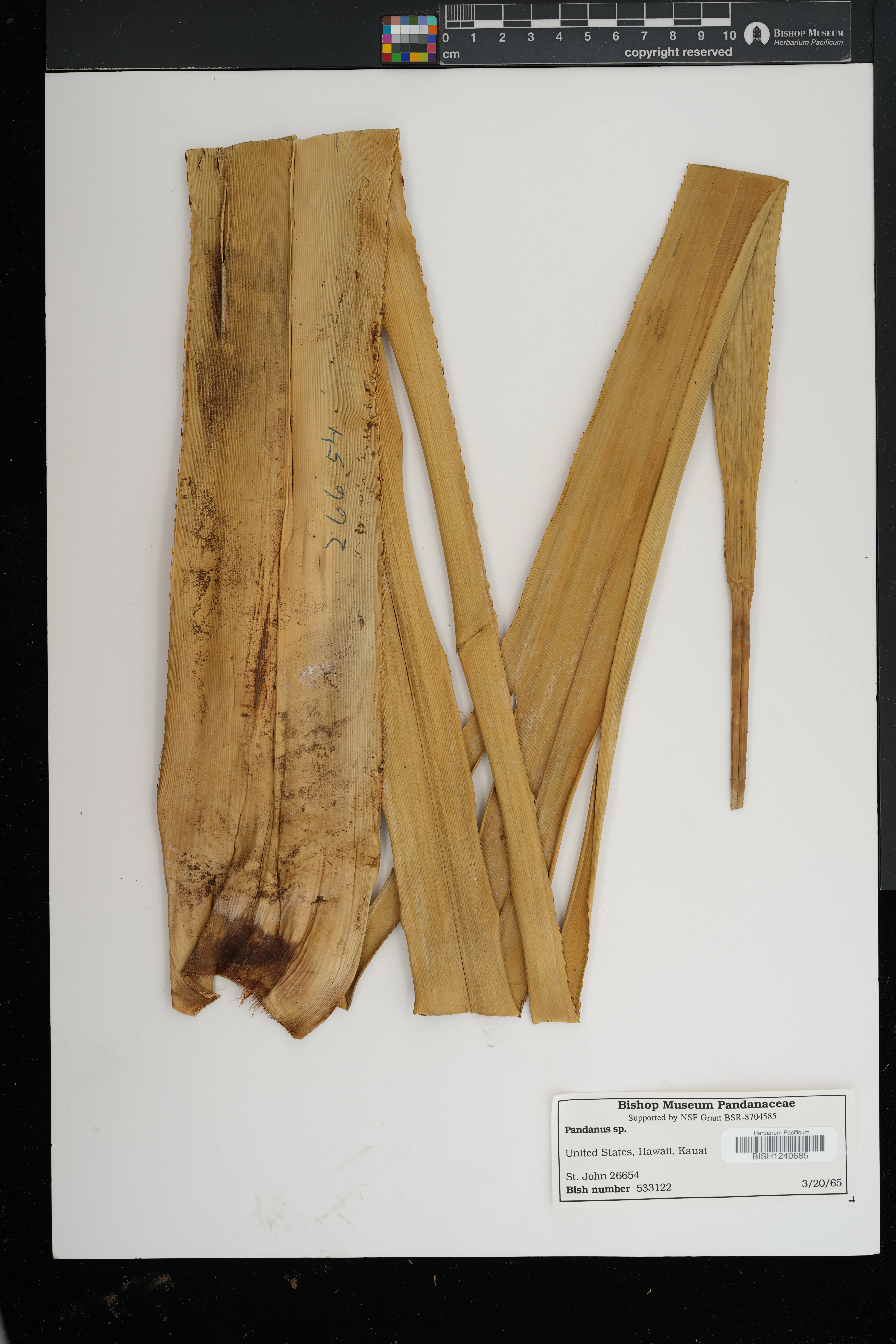 Tree about 20 ft. high; spreading about 20 ft.; shrubby; branching immediately where main aerial roots begin to radiate downward; brs. ending in large tufts of long lvs. which have wide white band down |