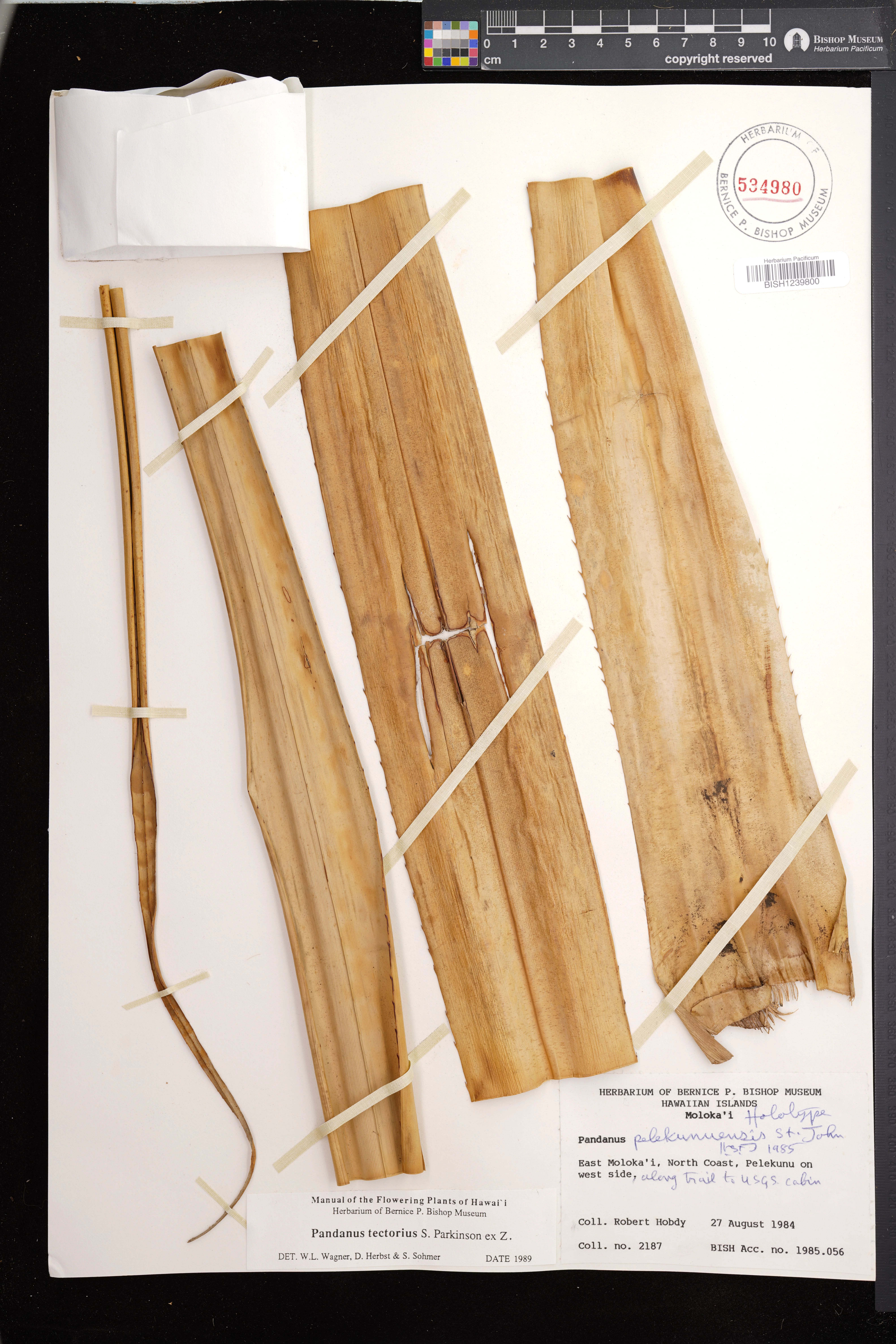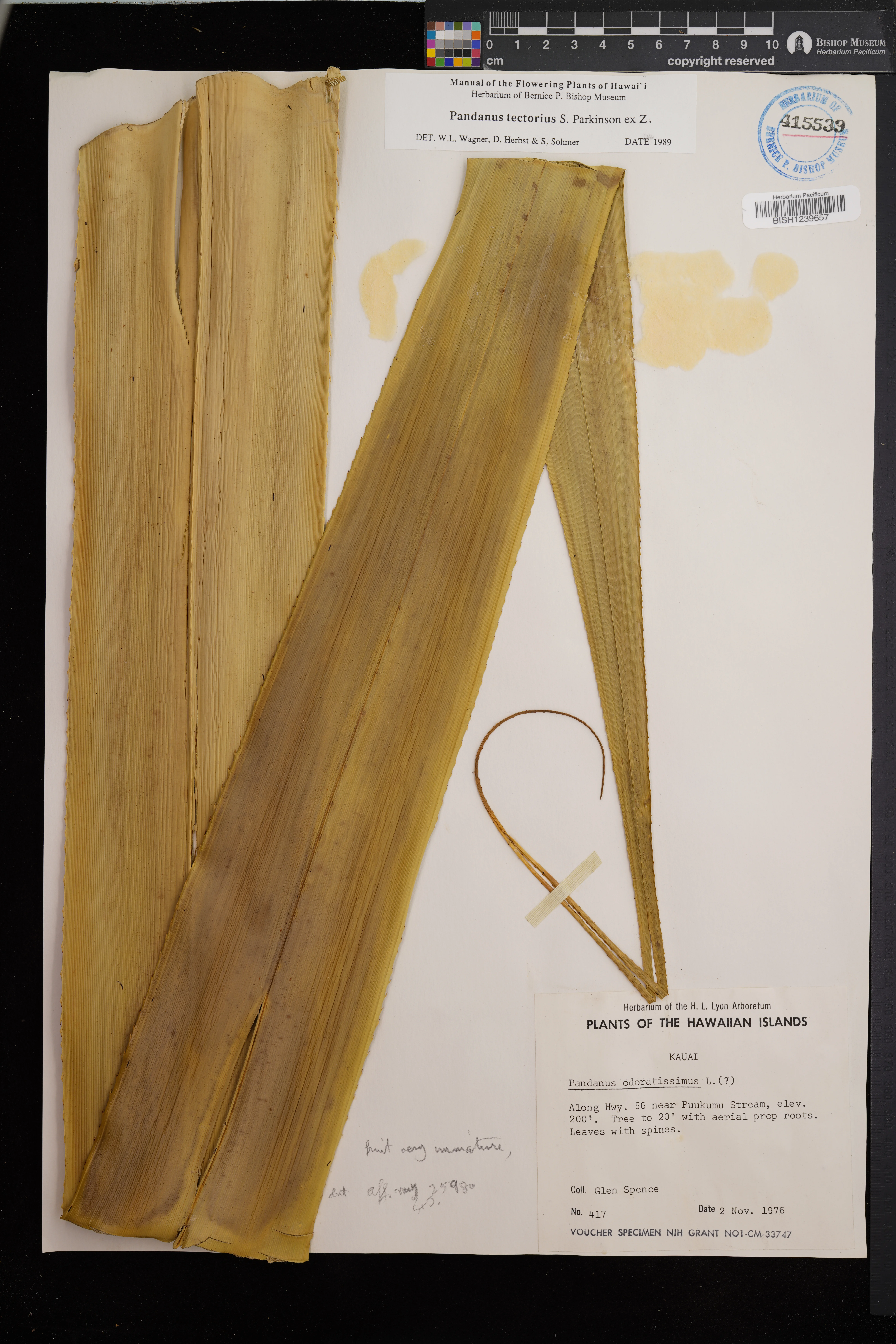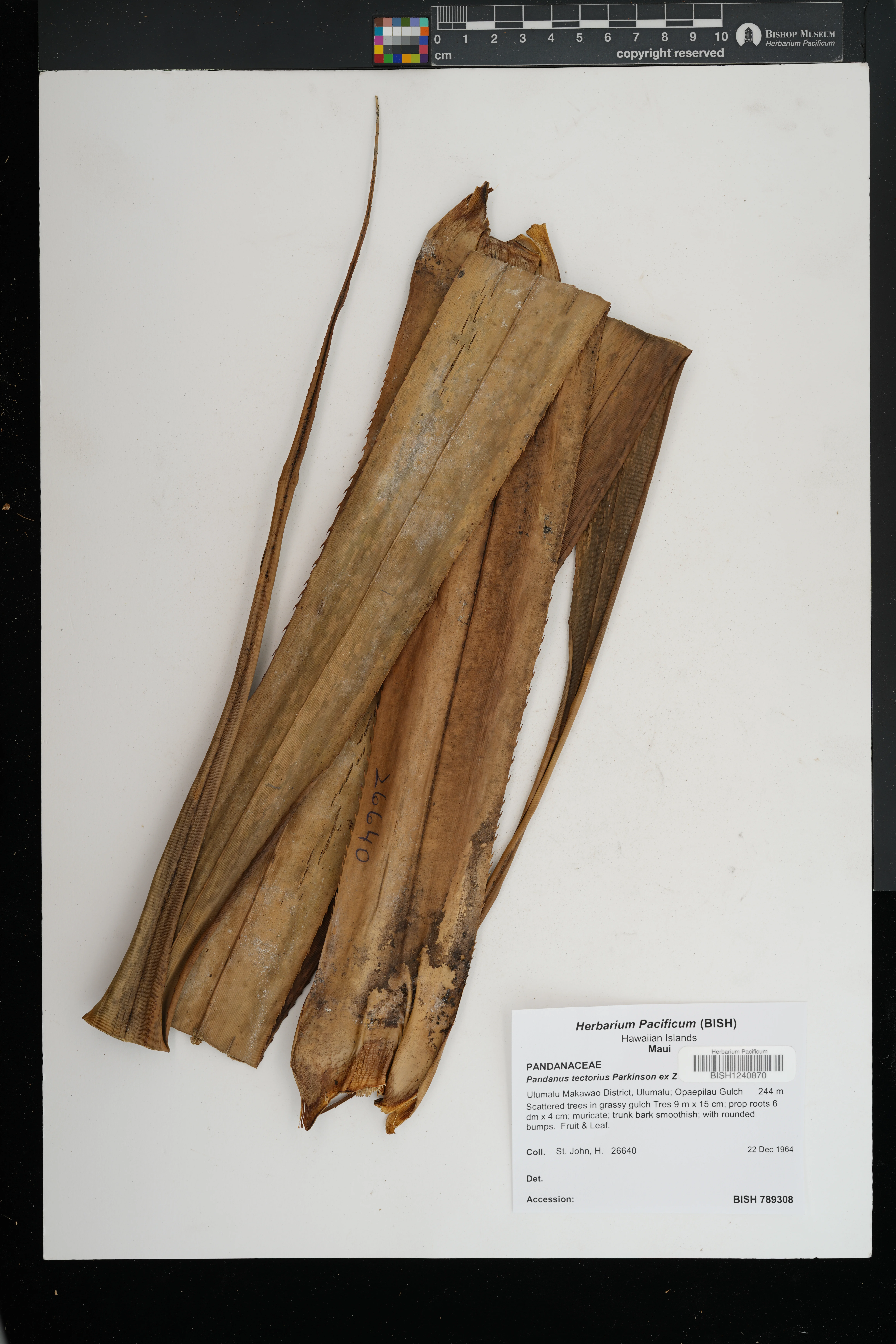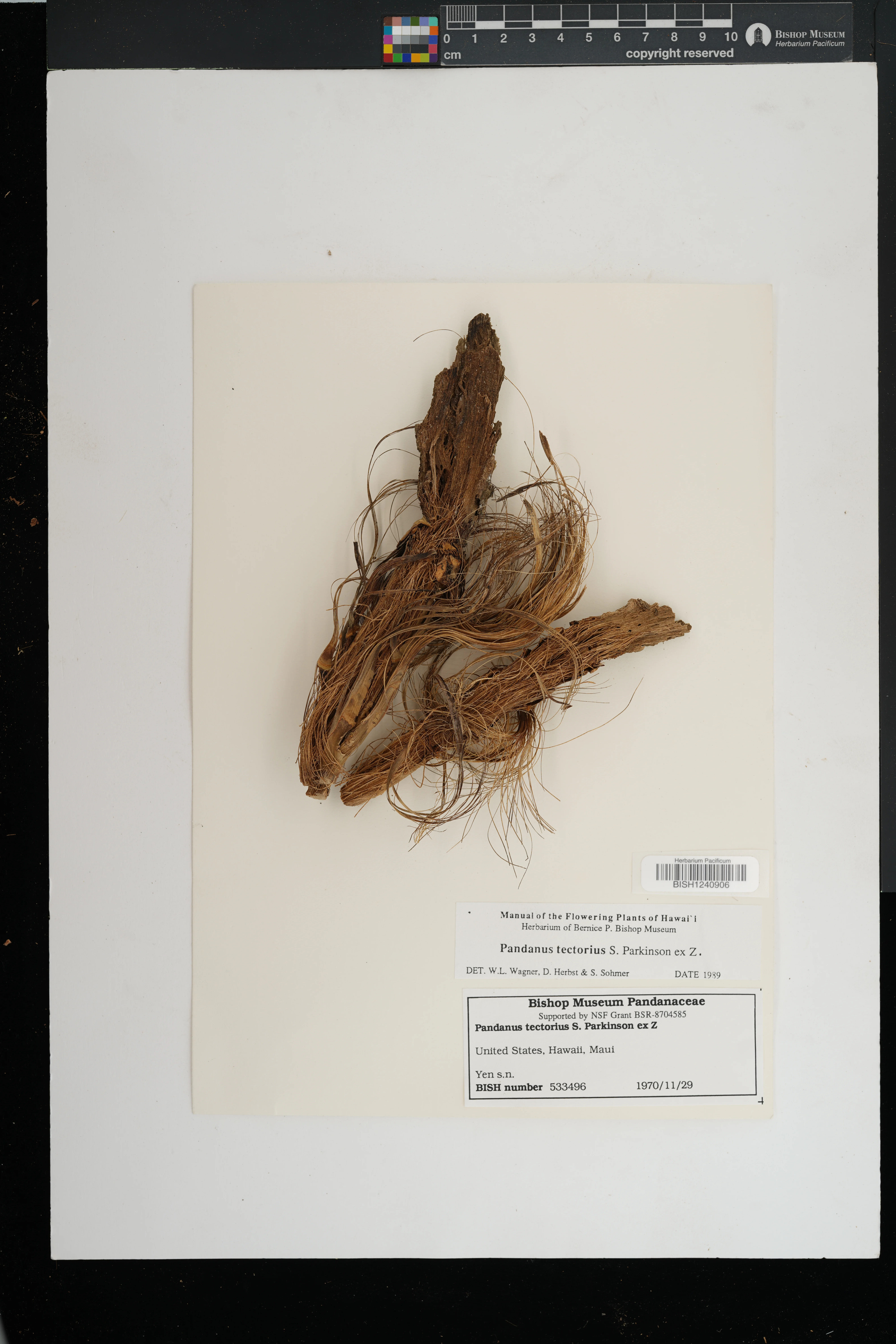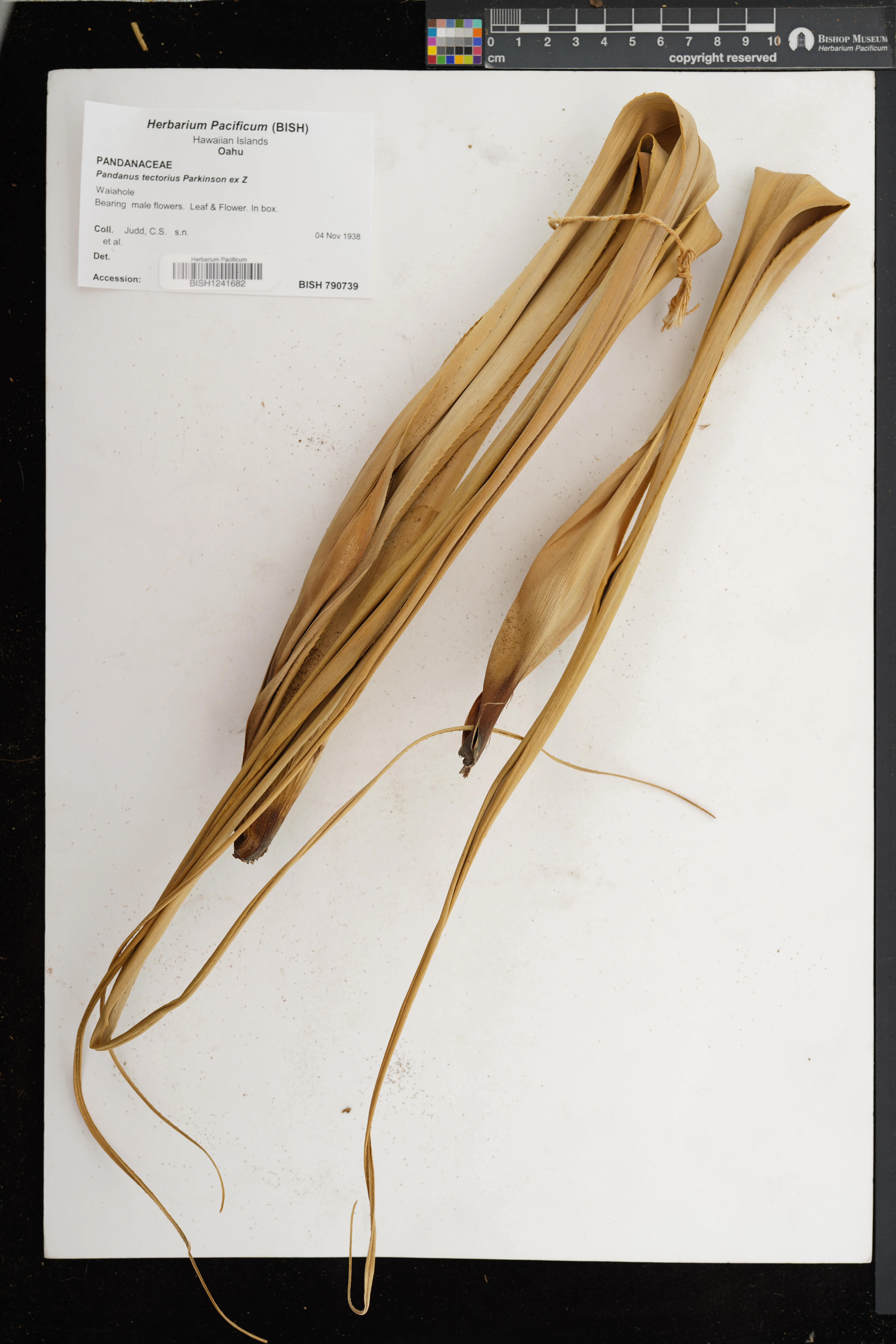 Tree about 20 ft. high; spreading about 20 ft.; shrubby; branching immediately where main aerial roots begin to radiate downward; brs. ending in large tufts of long lvs. which have wide white band down |