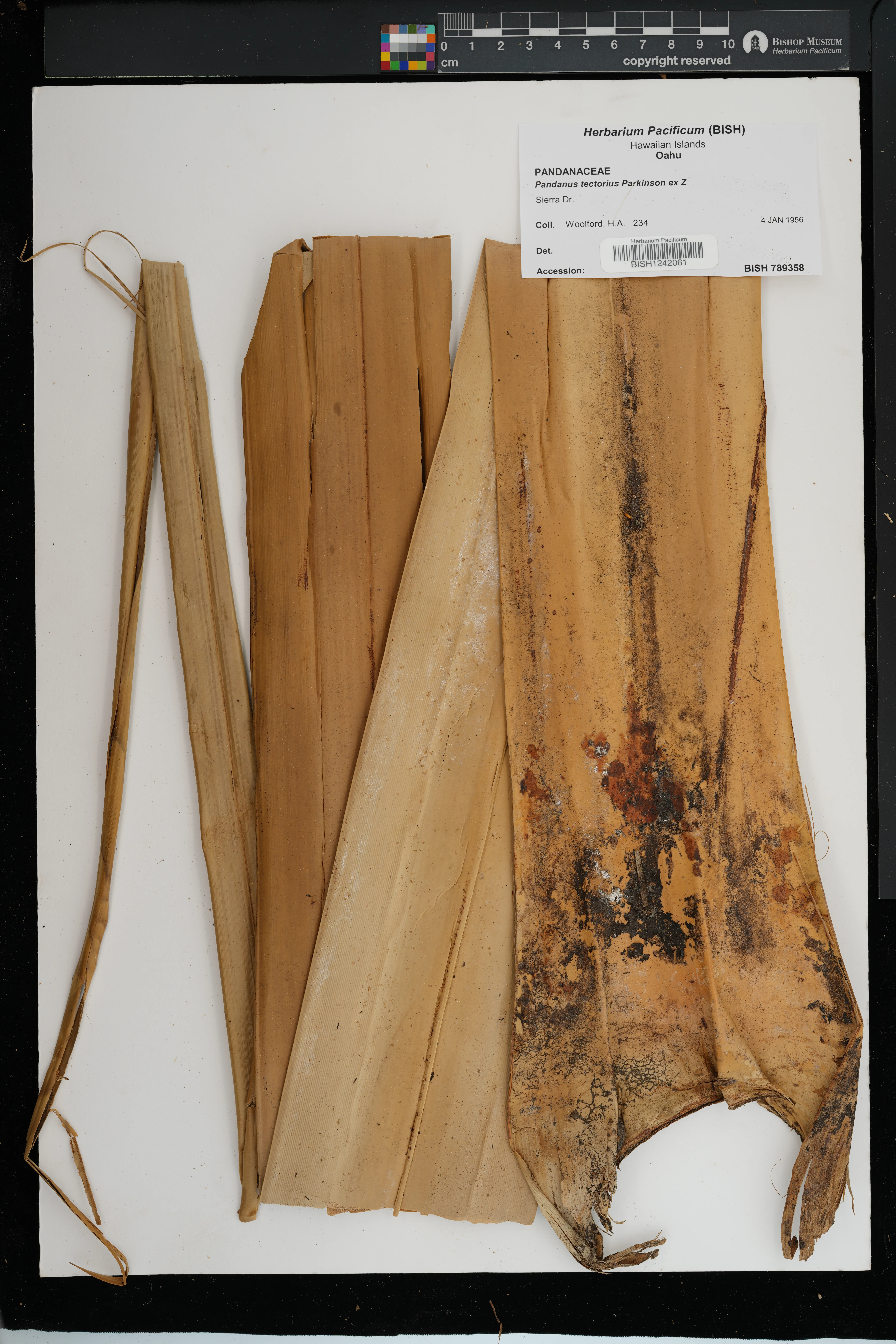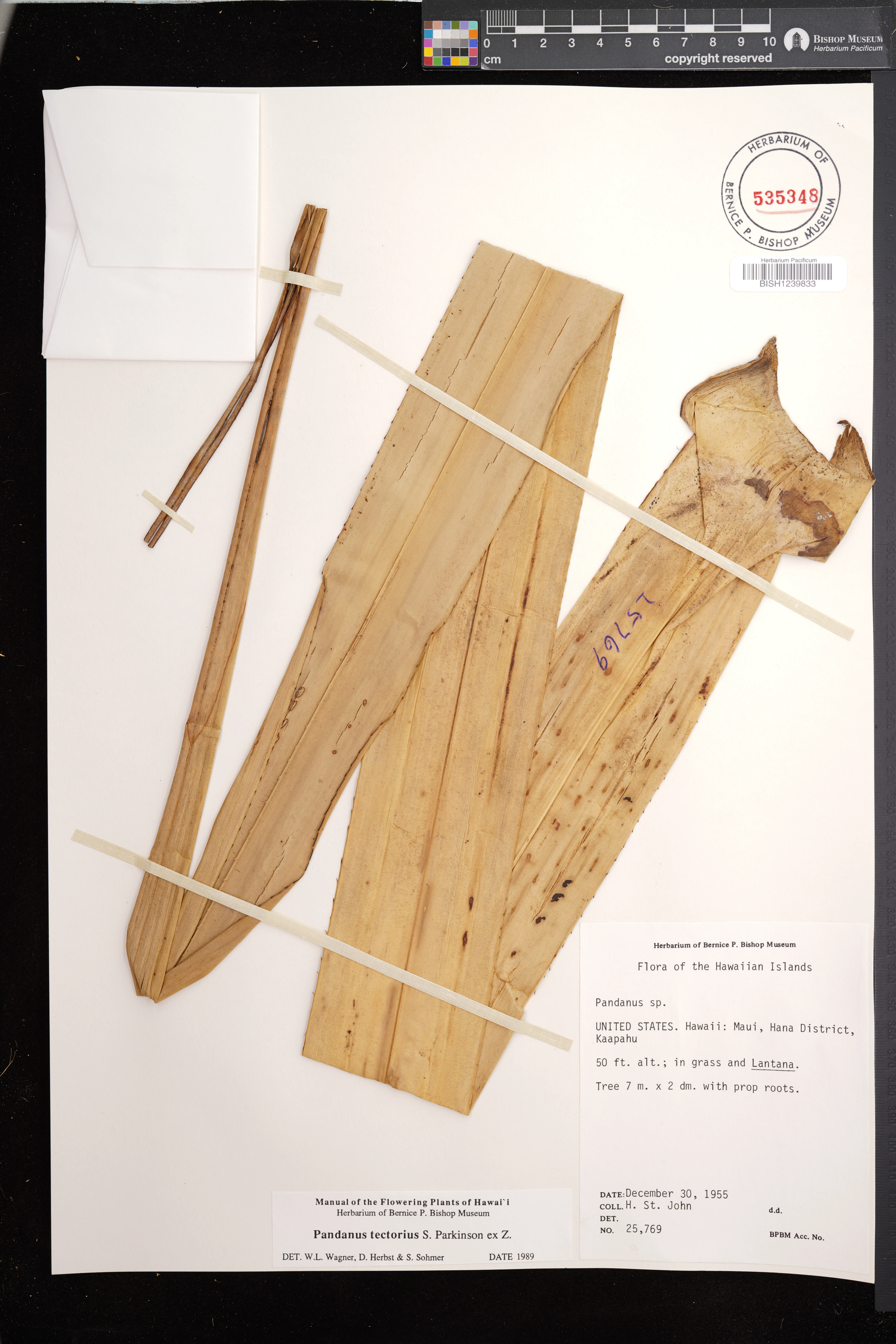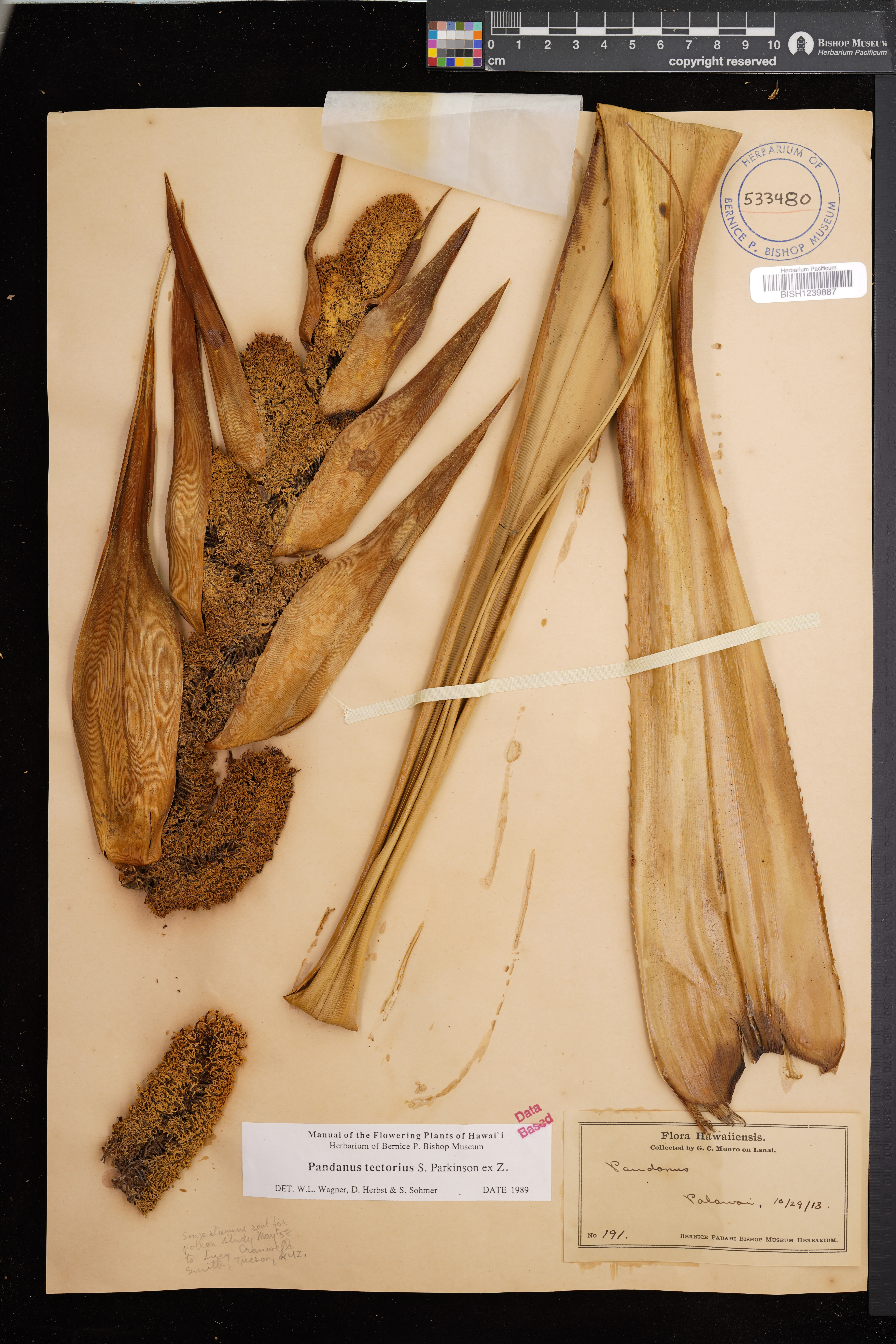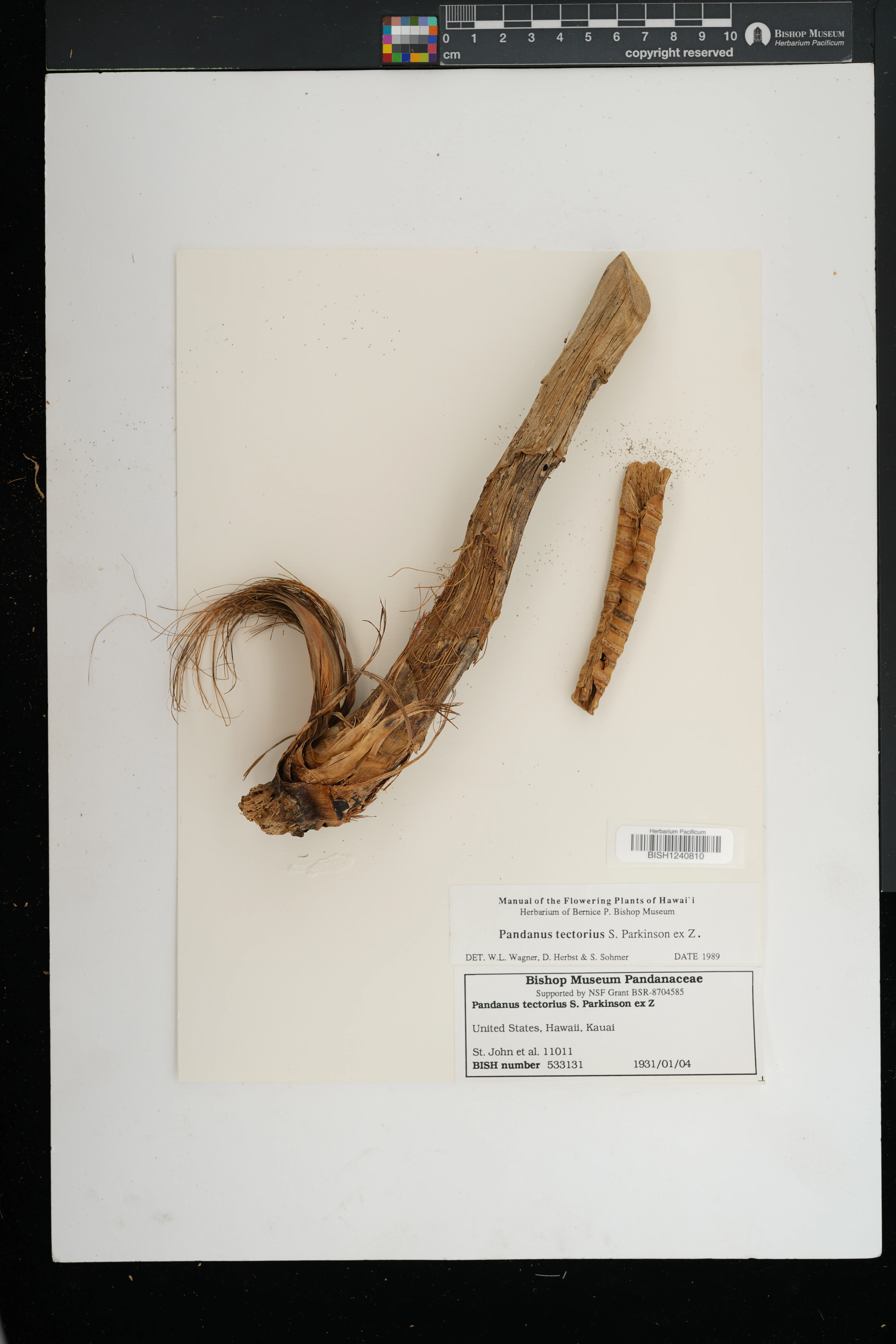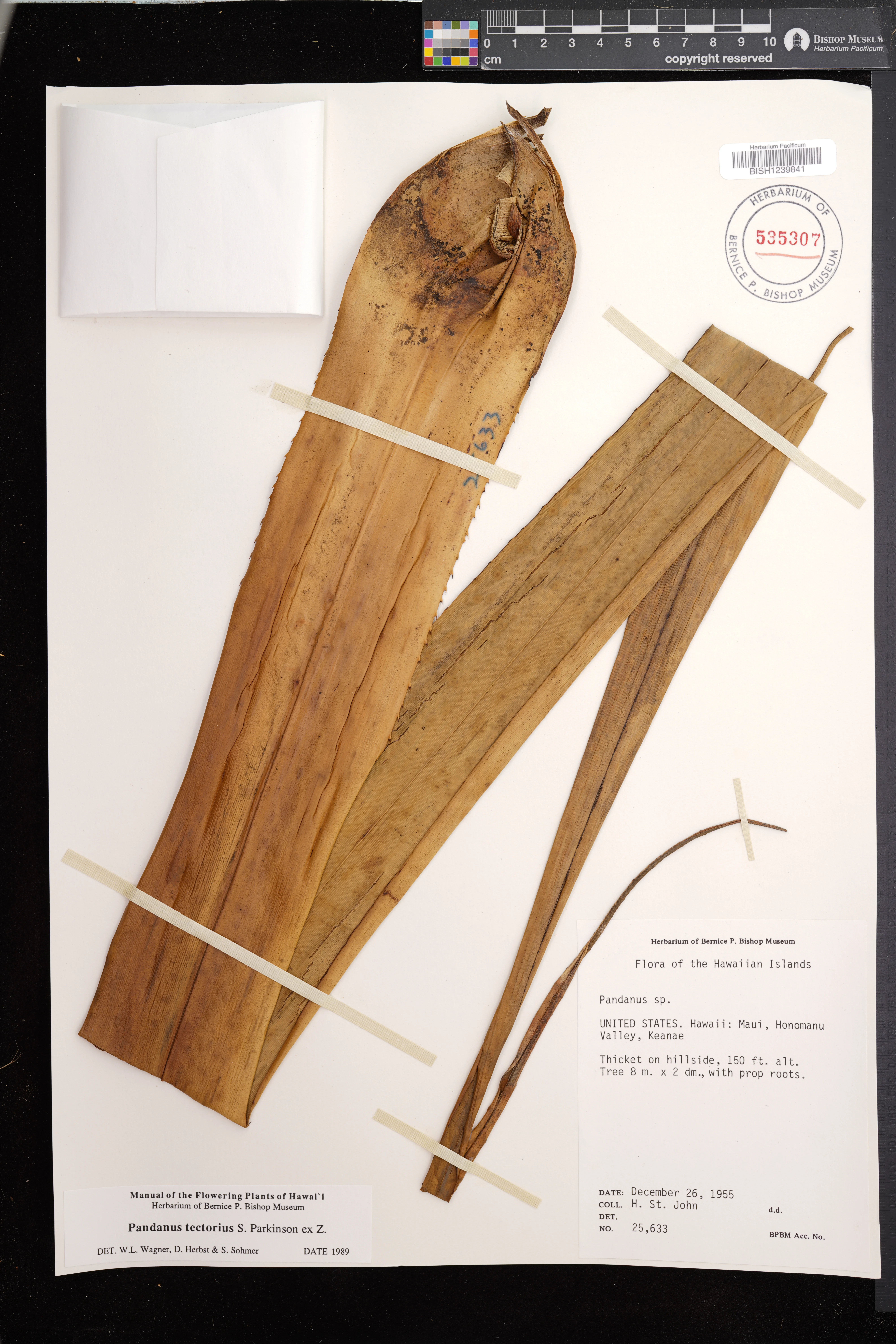 Tree about 20 ft. high; spreading about 20 ft.; shrubby; branching immediately where main aerial roots begin to radiate downward; brs. ending in large tufts of long lvs. which have wide white band down |