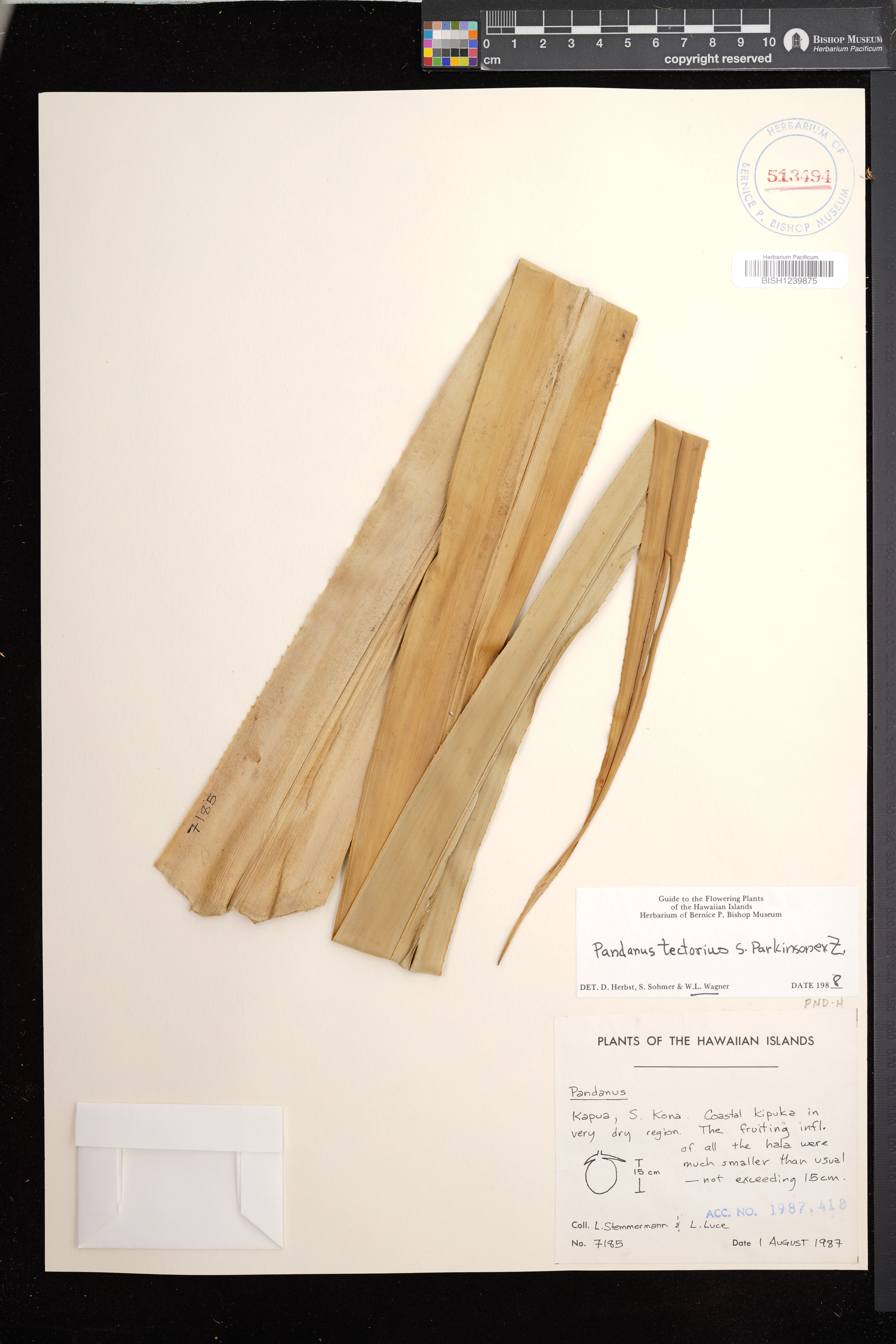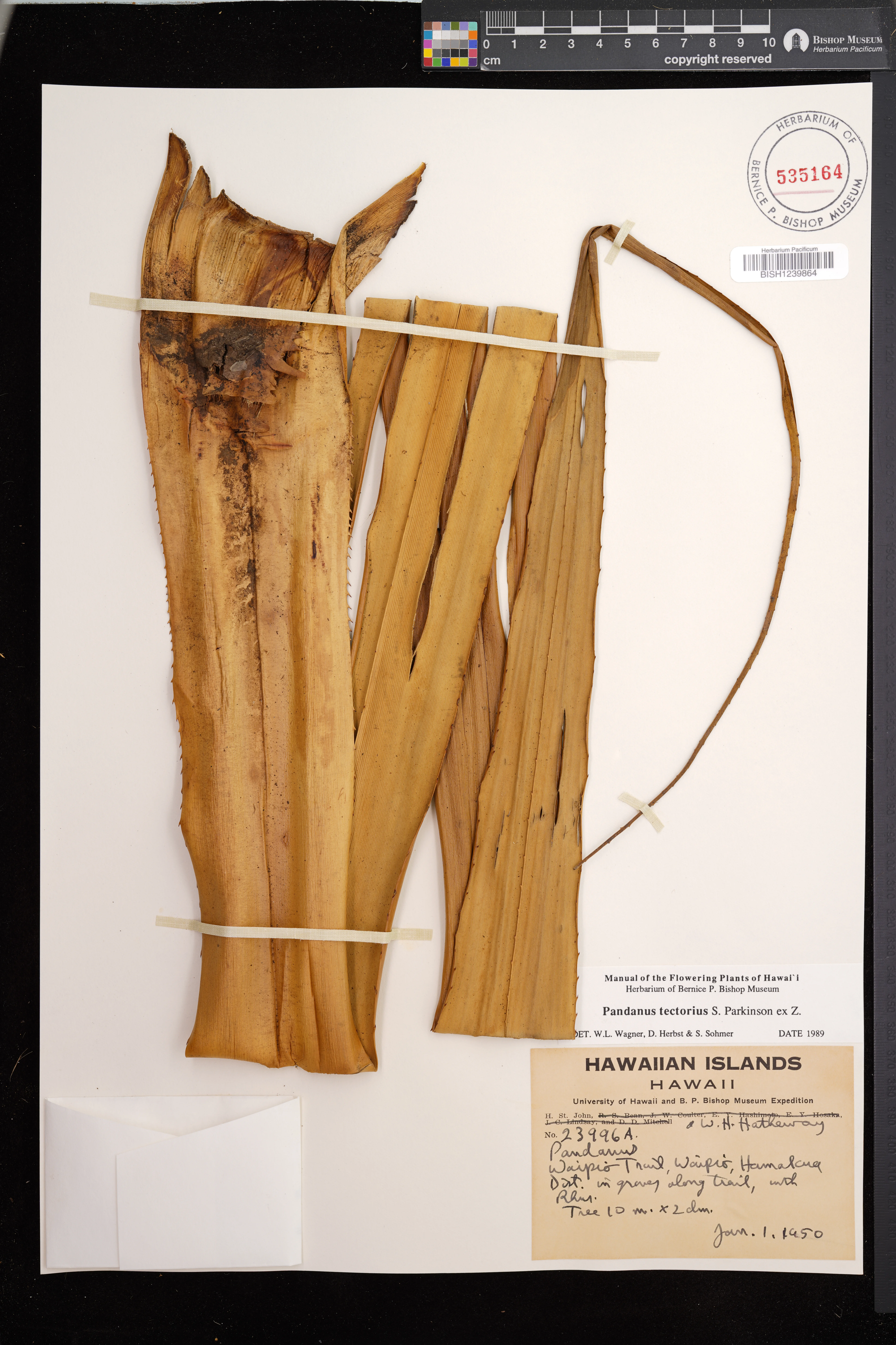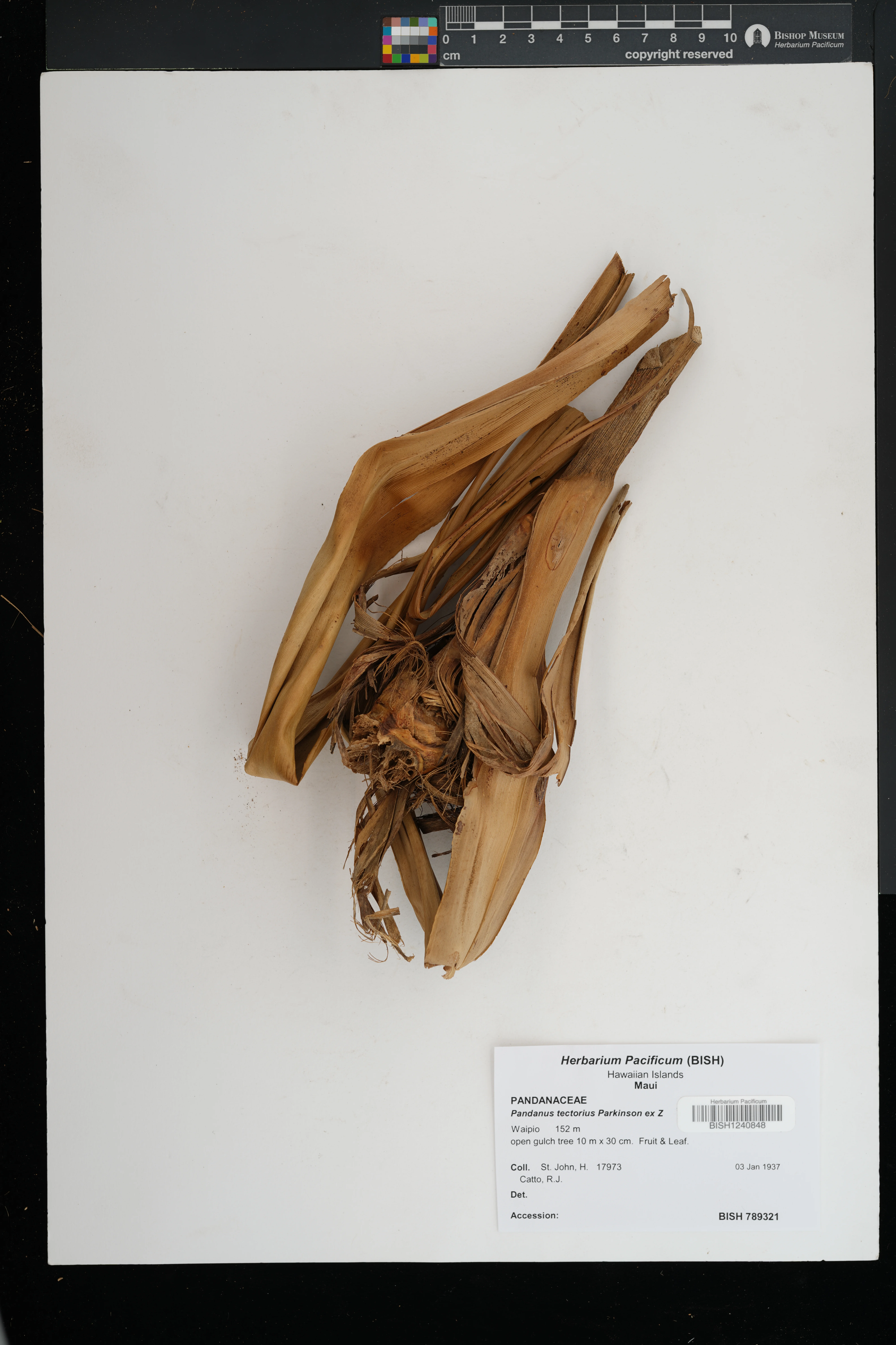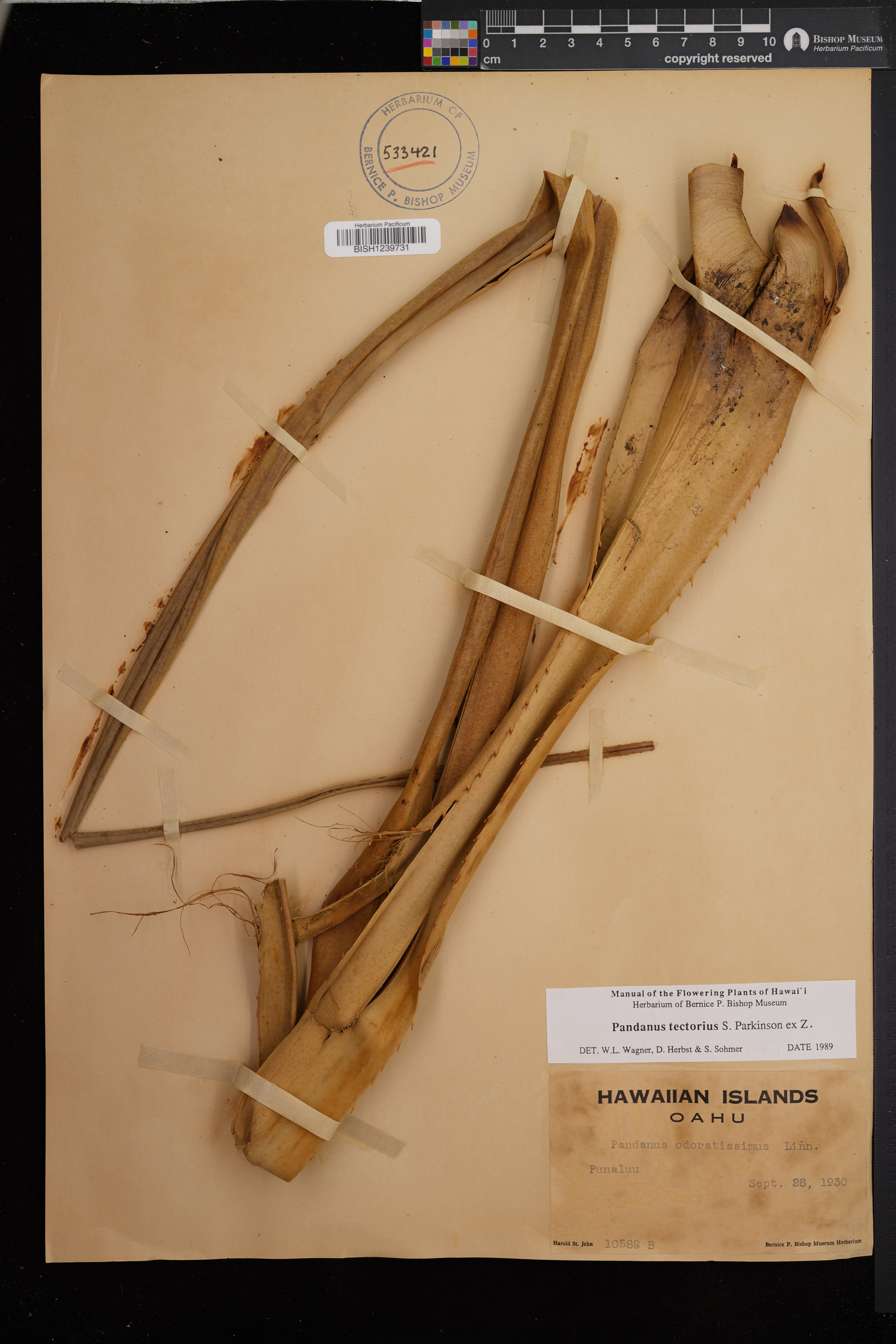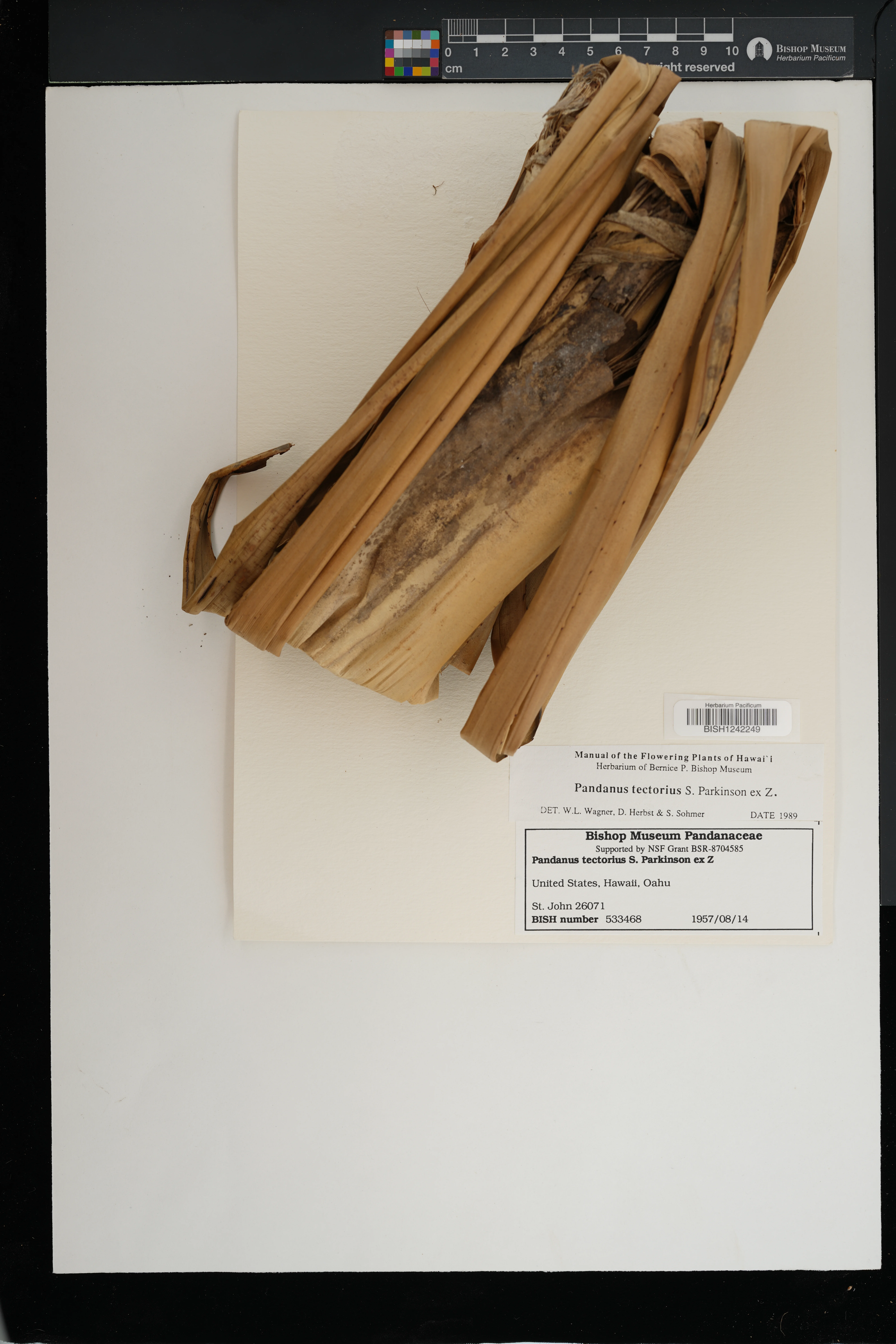 Tree about 20 ft. high; spreading about 20 ft.; shrubby; branching immediately where main aerial roots begin to radiate downward; brs. ending in large tufts of long lvs. which have wide white band down |