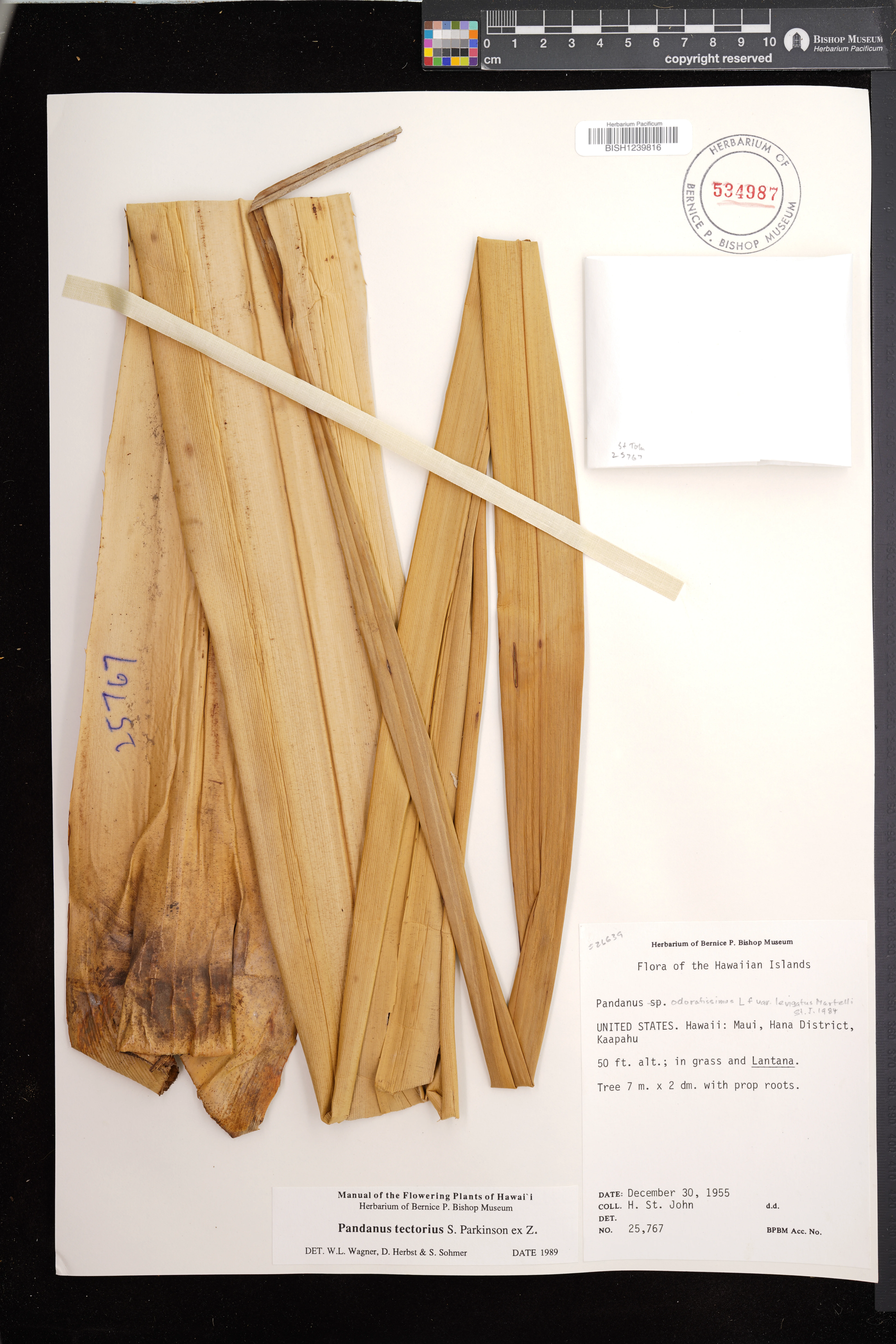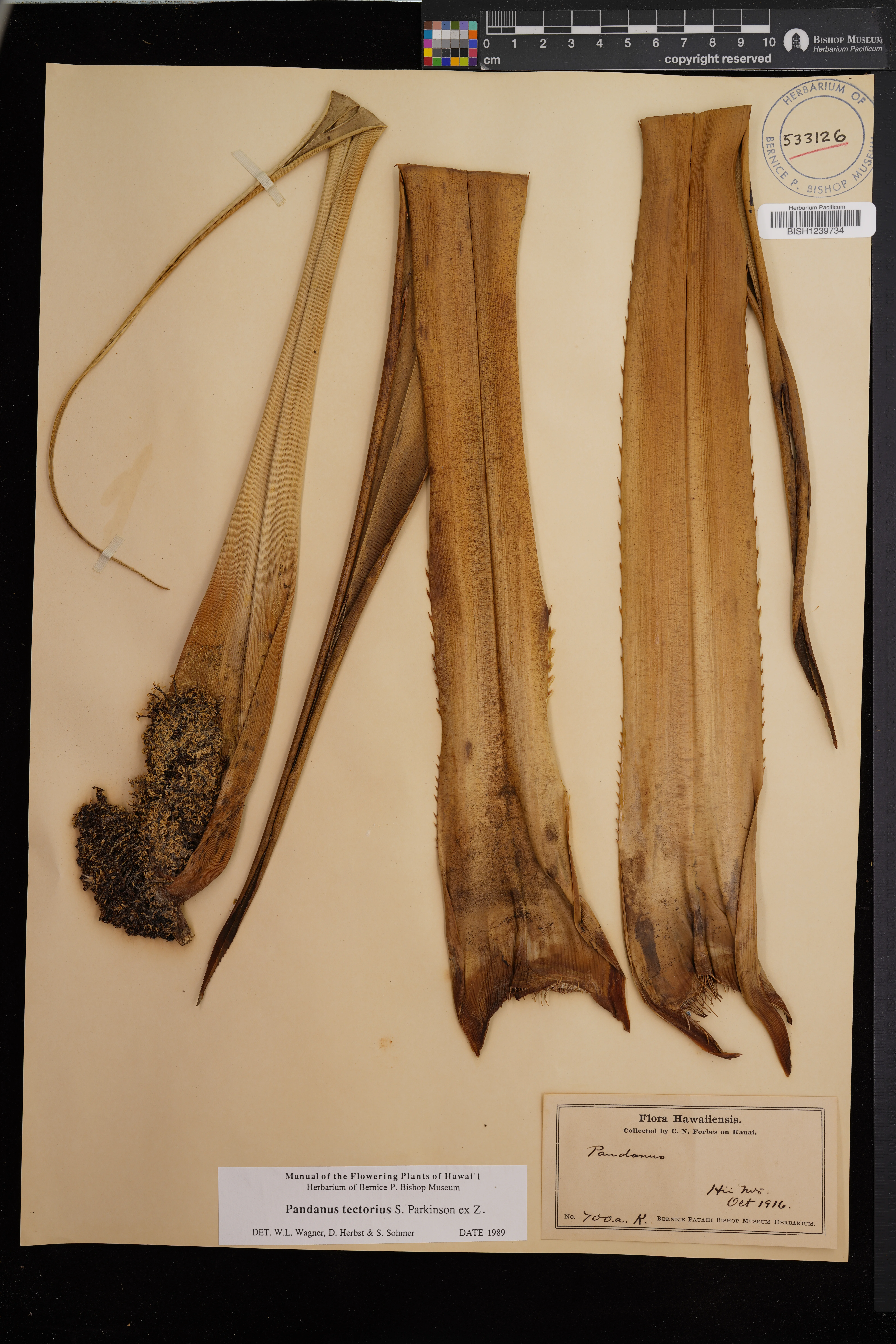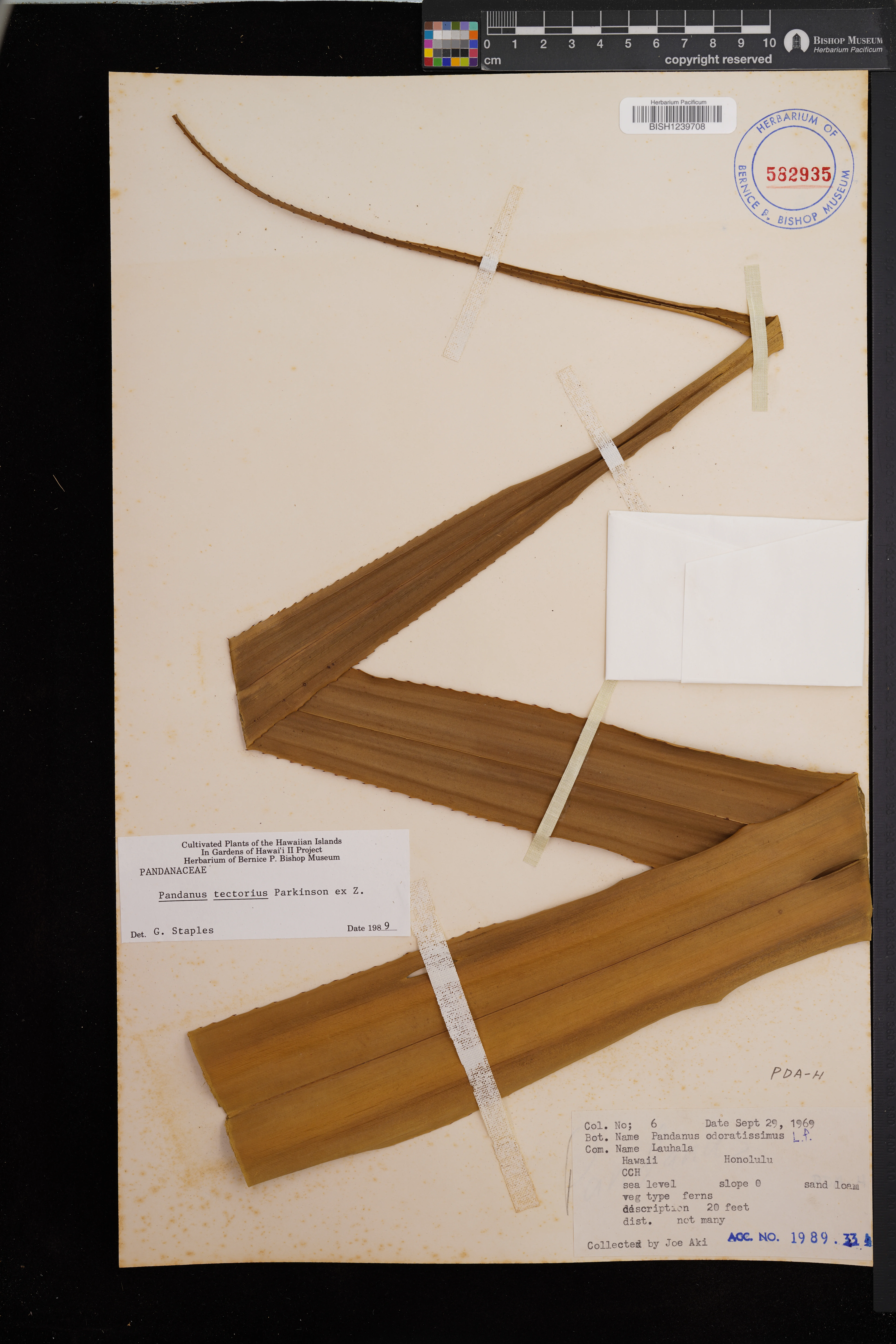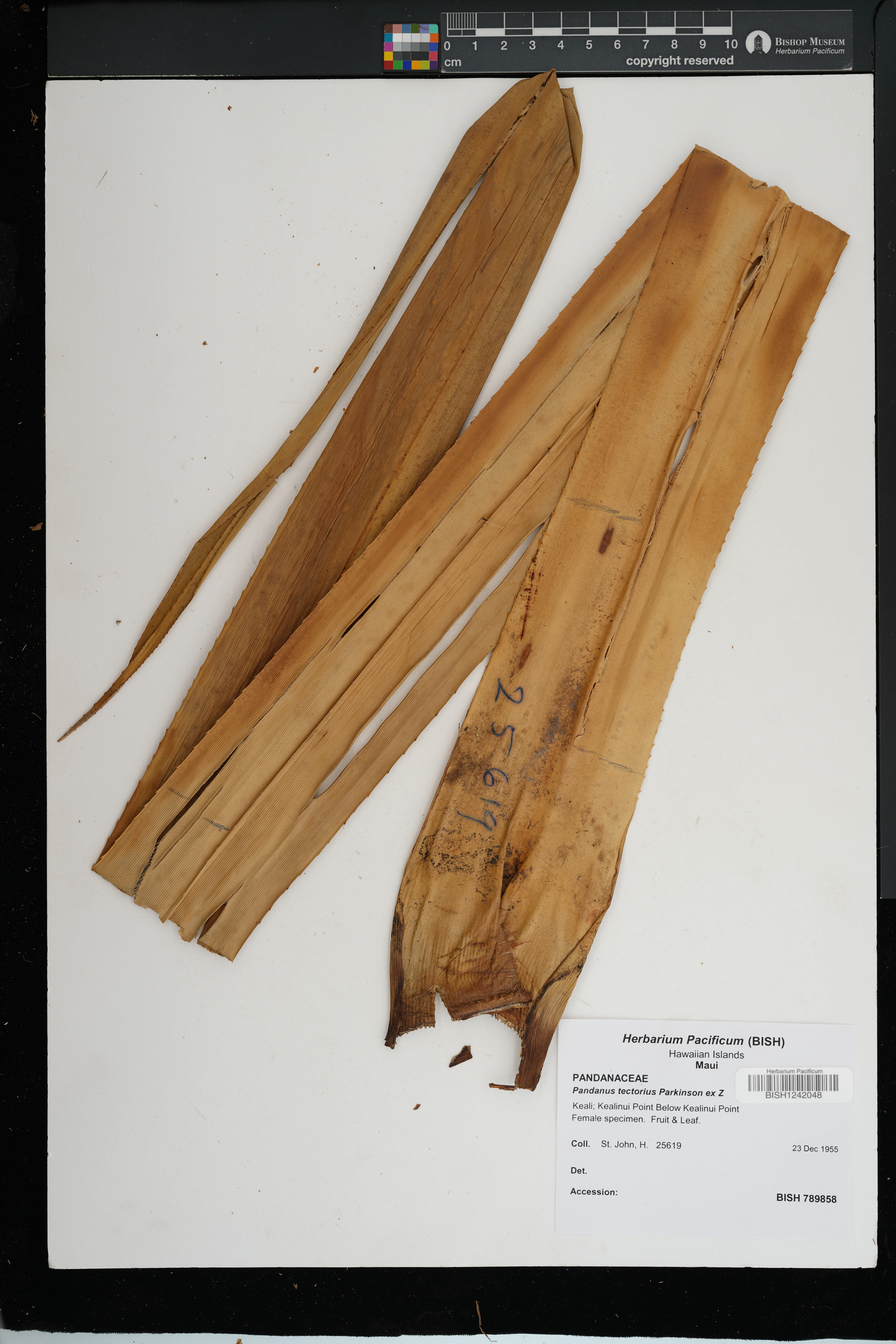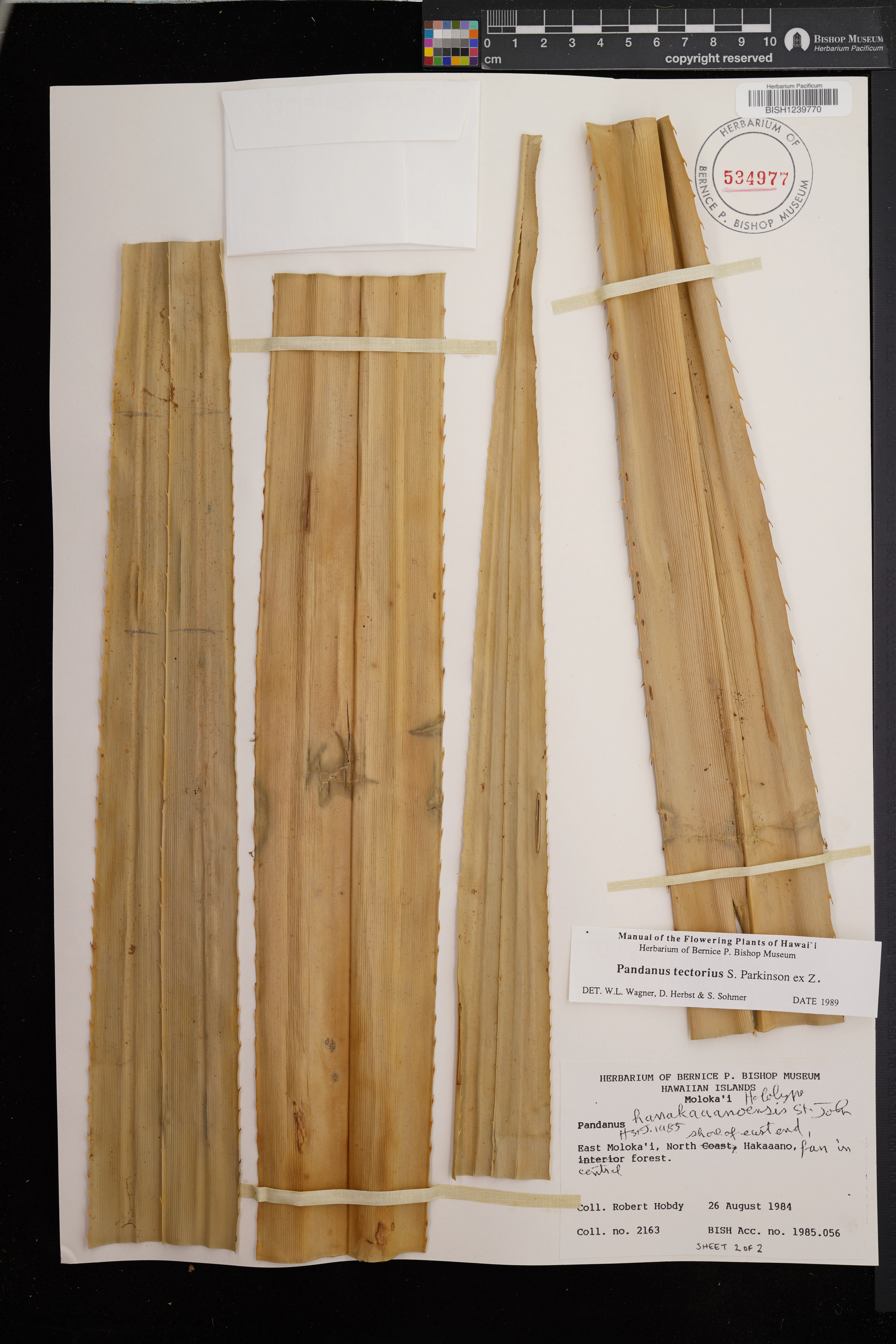 Tree about 20 ft. high; spreading about 20 ft.; shrubby; branching immediately where main aerial roots begin to radiate downward; brs. ending in large tufts of long lvs. which have wide white band down |