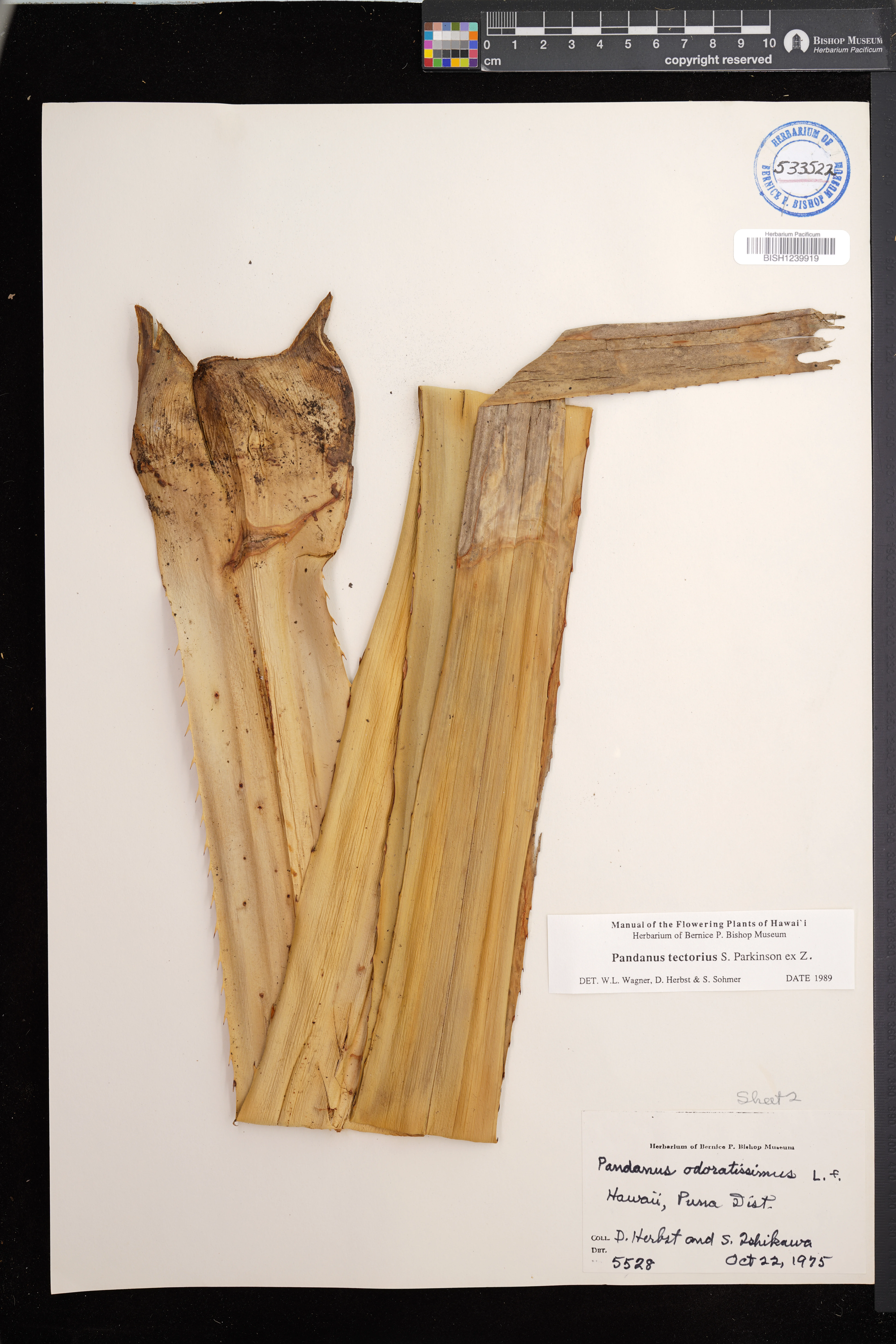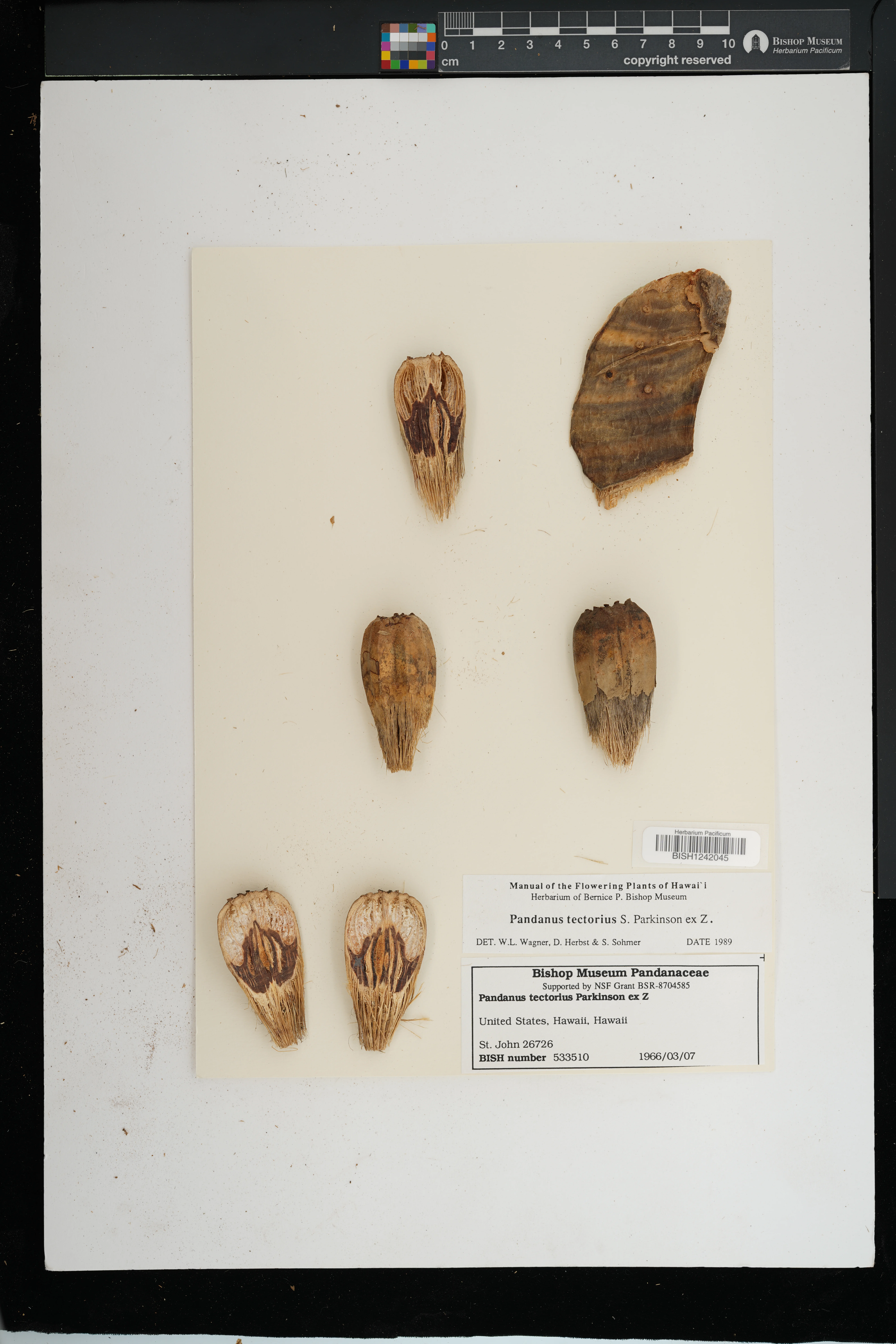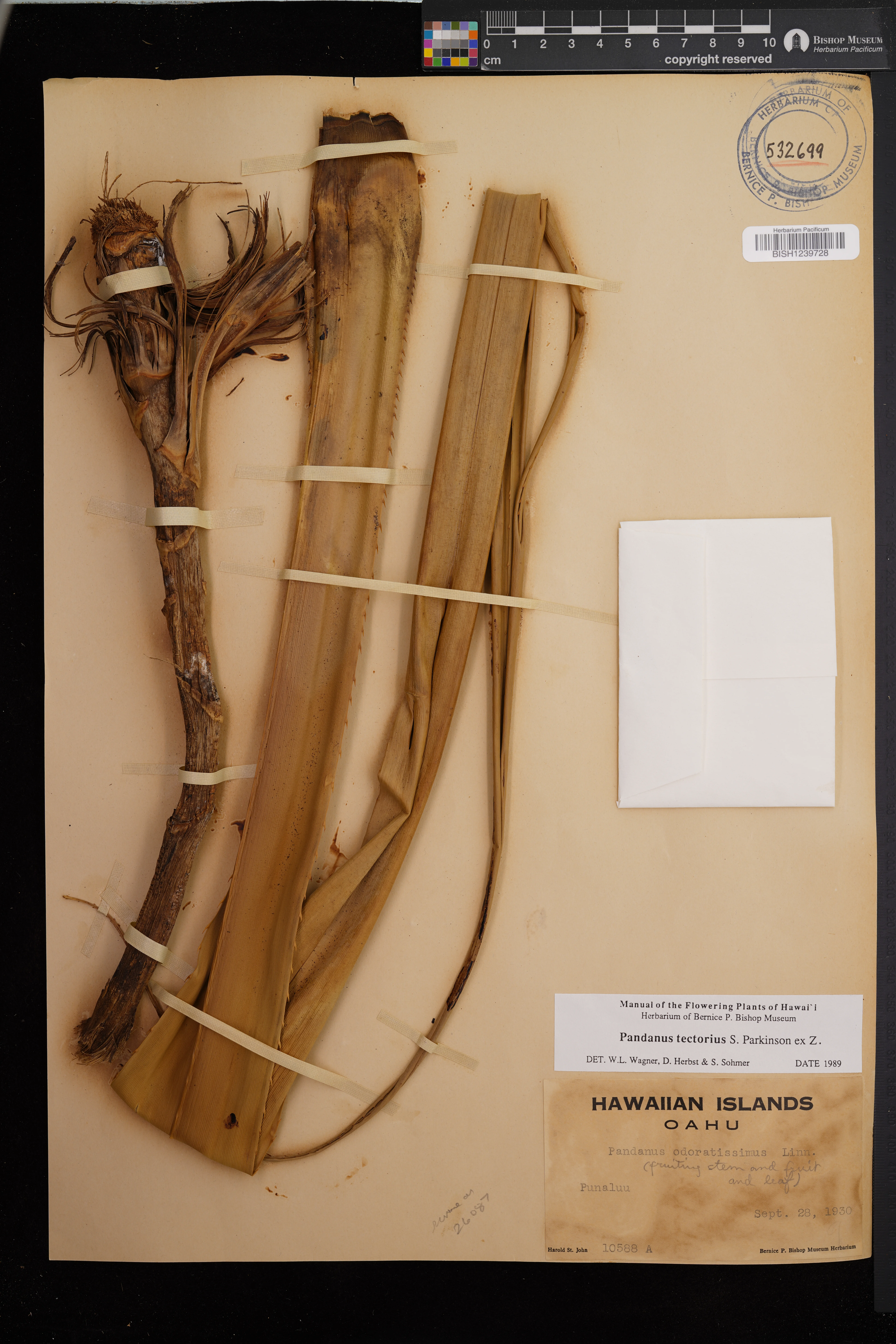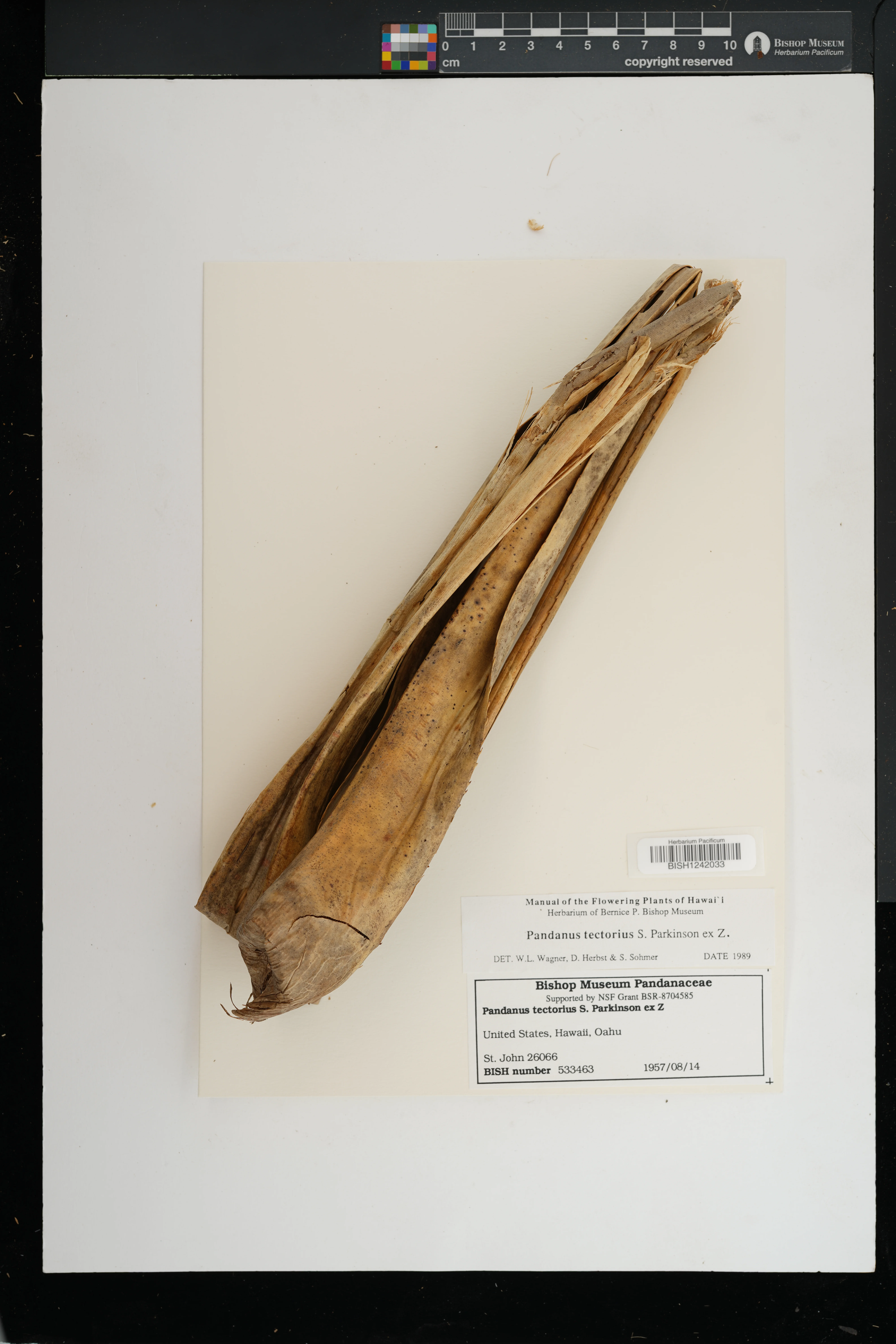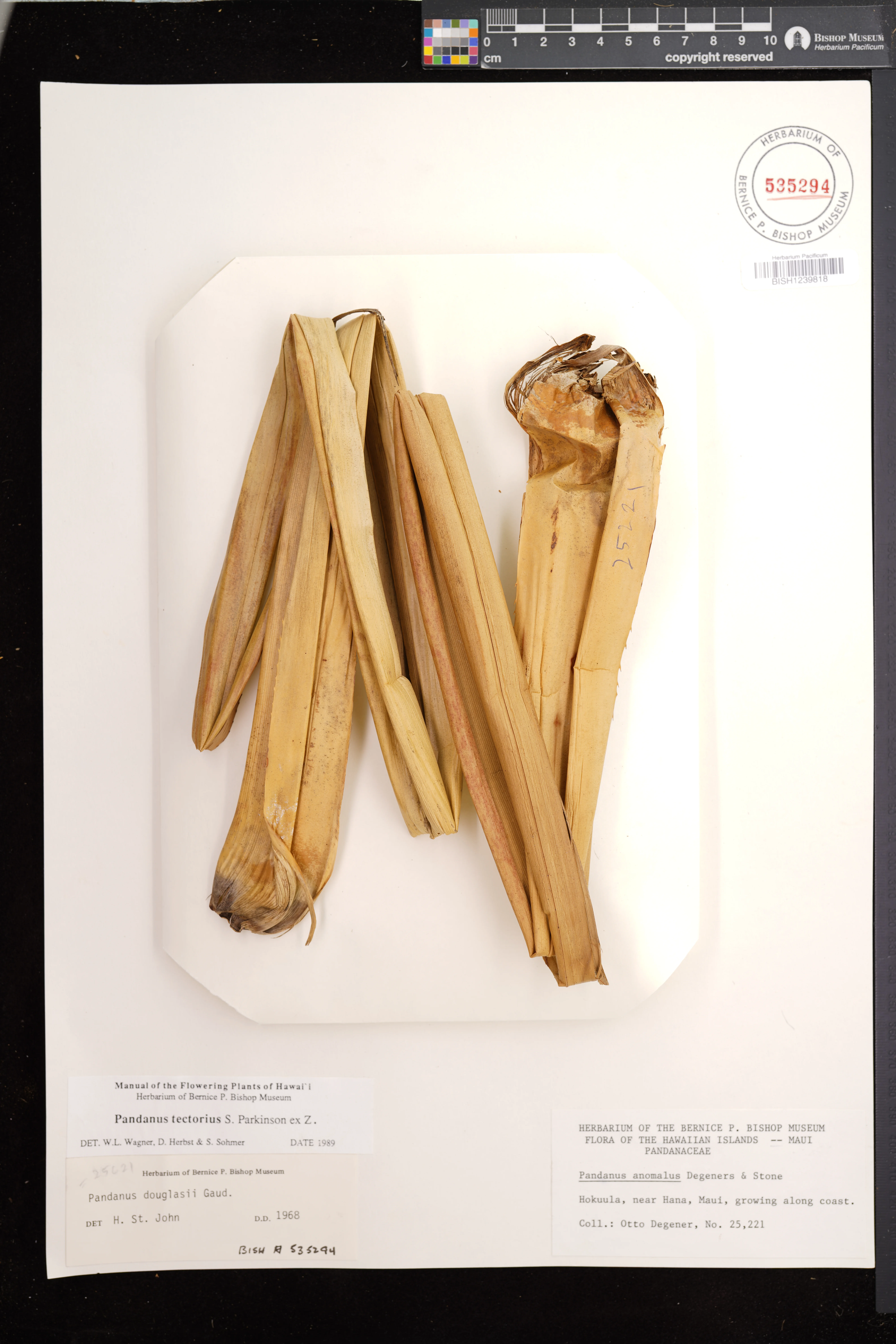 Tree about 20 ft. high; spreading about 20 ft.; shrubby; branching immediately where main aerial roots begin to radiate downward; brs. ending in large tufts of long lvs. which have wide white band down |