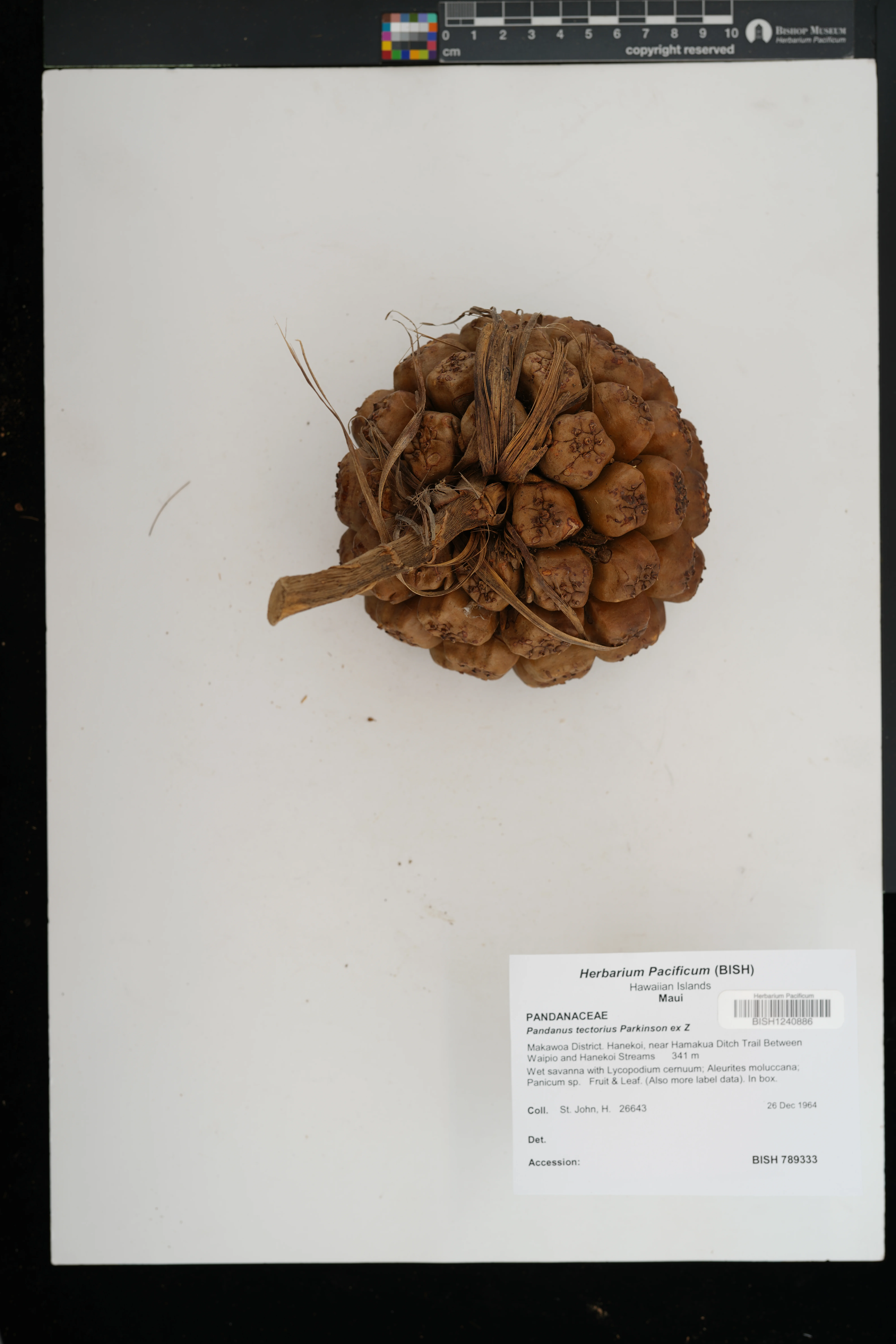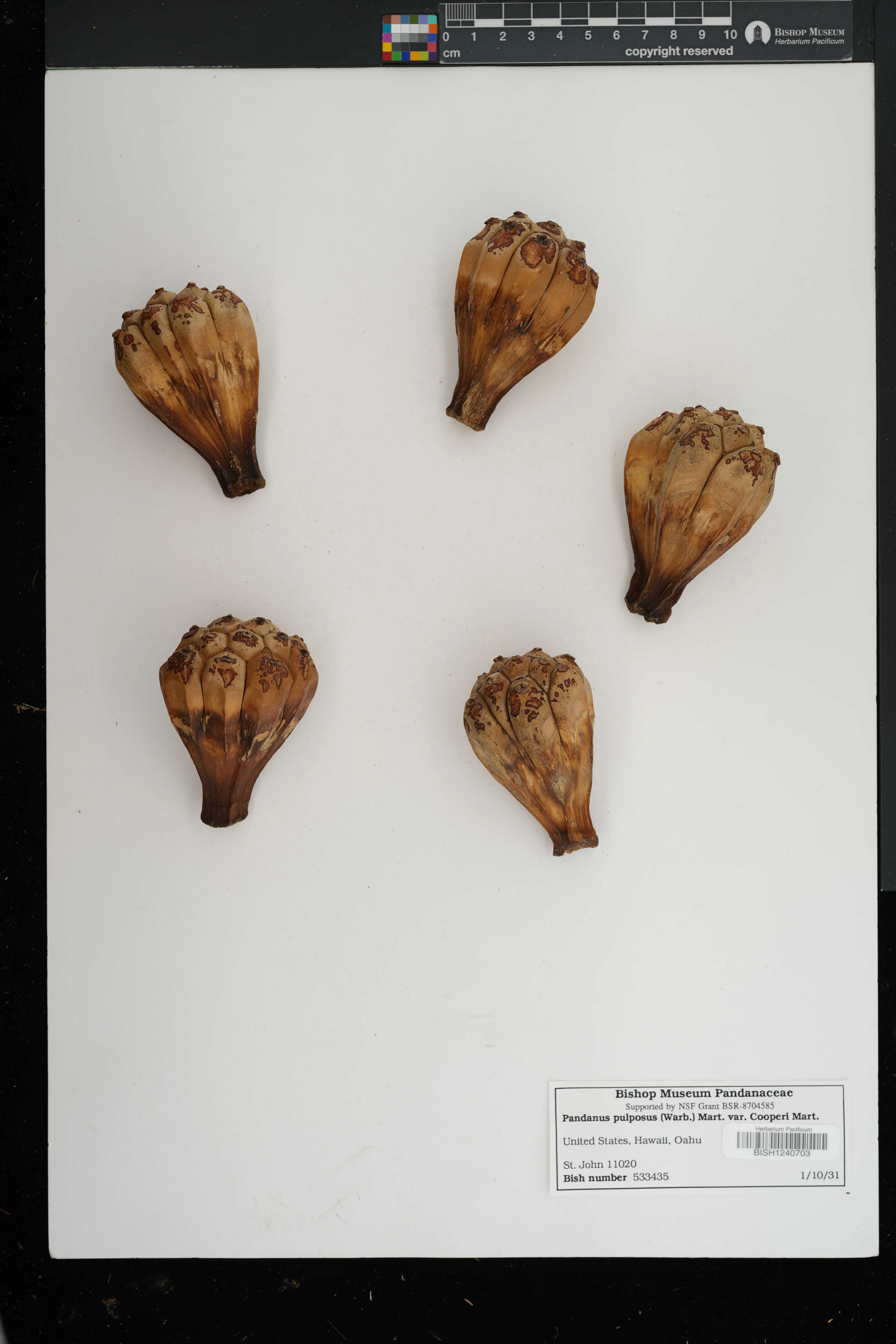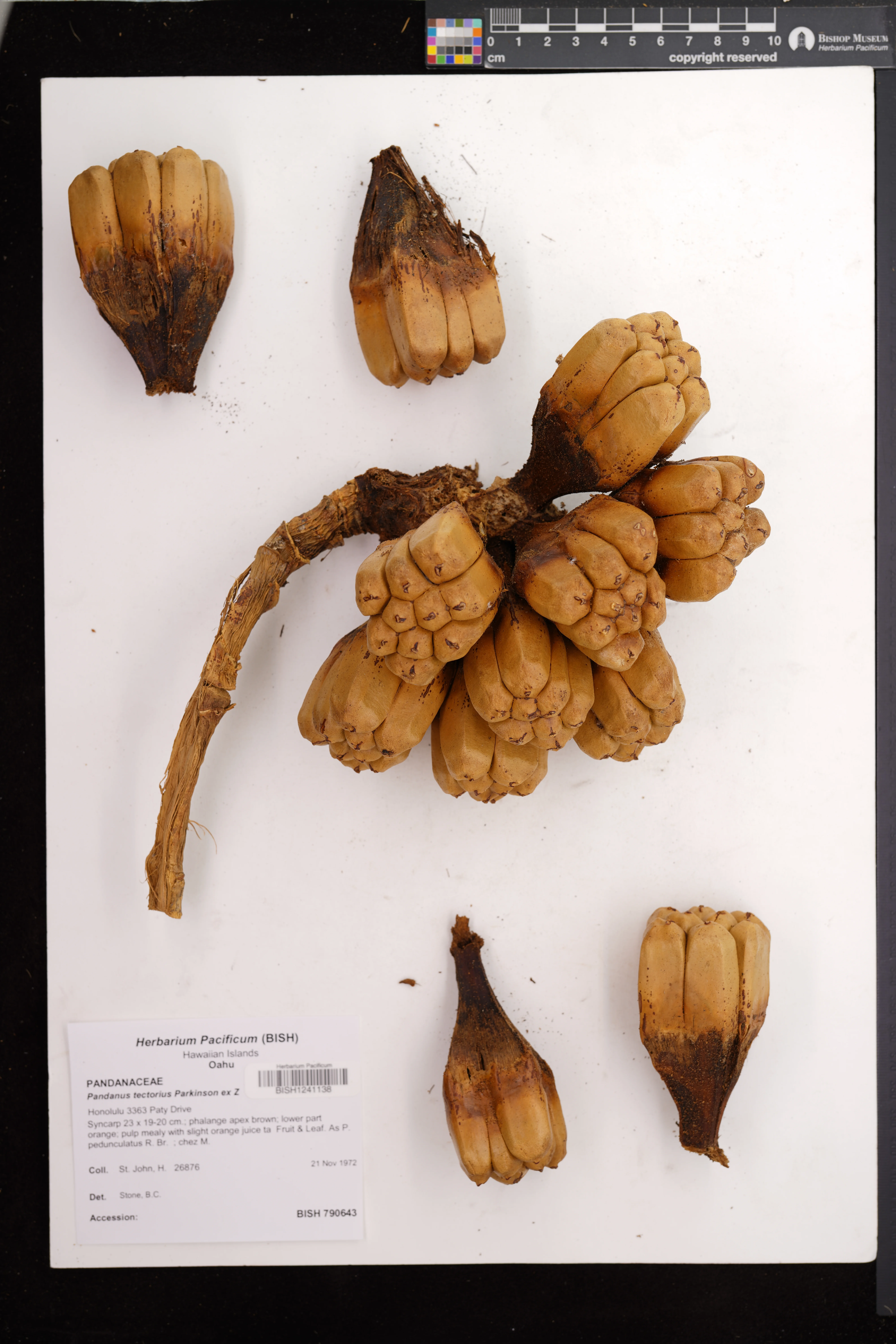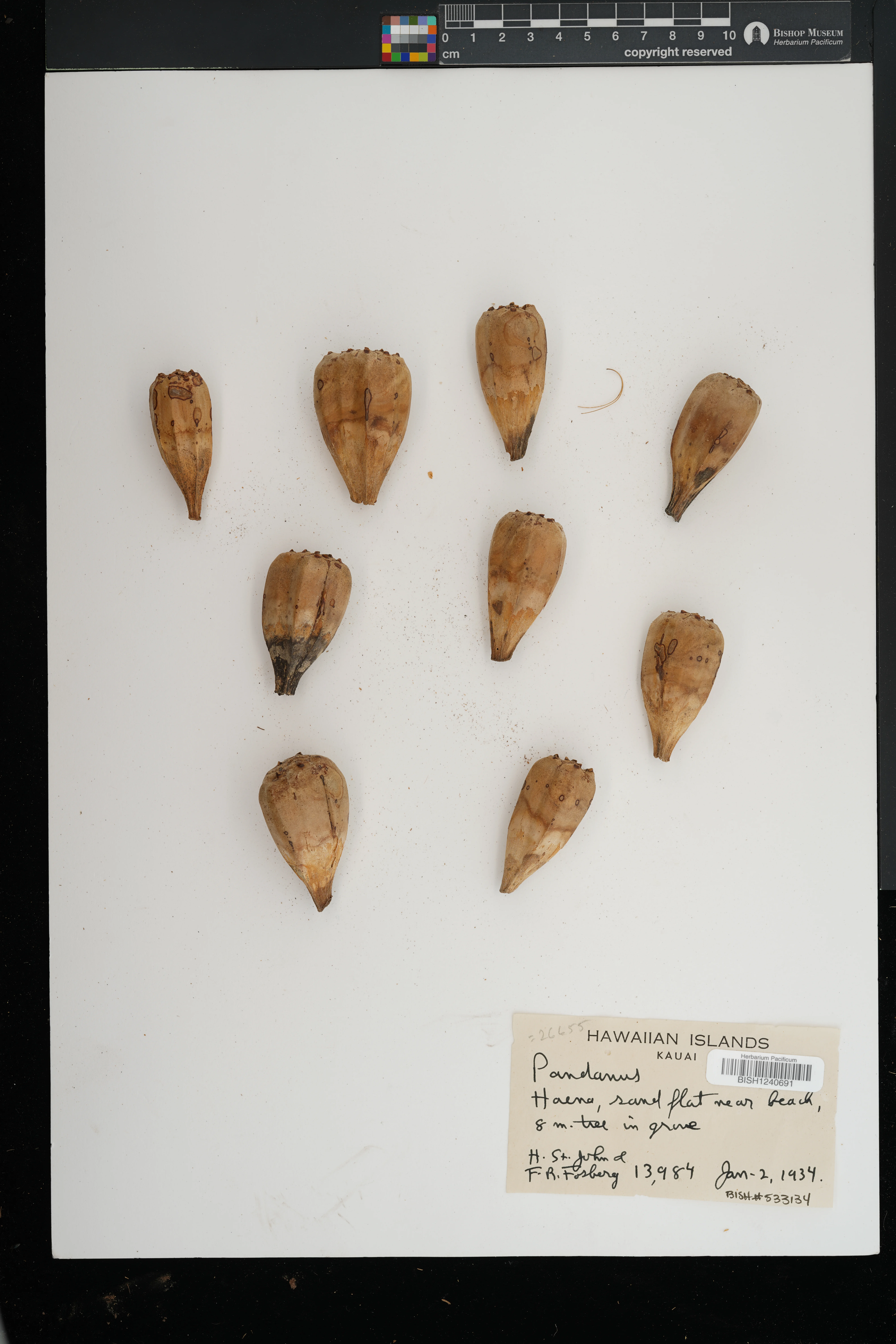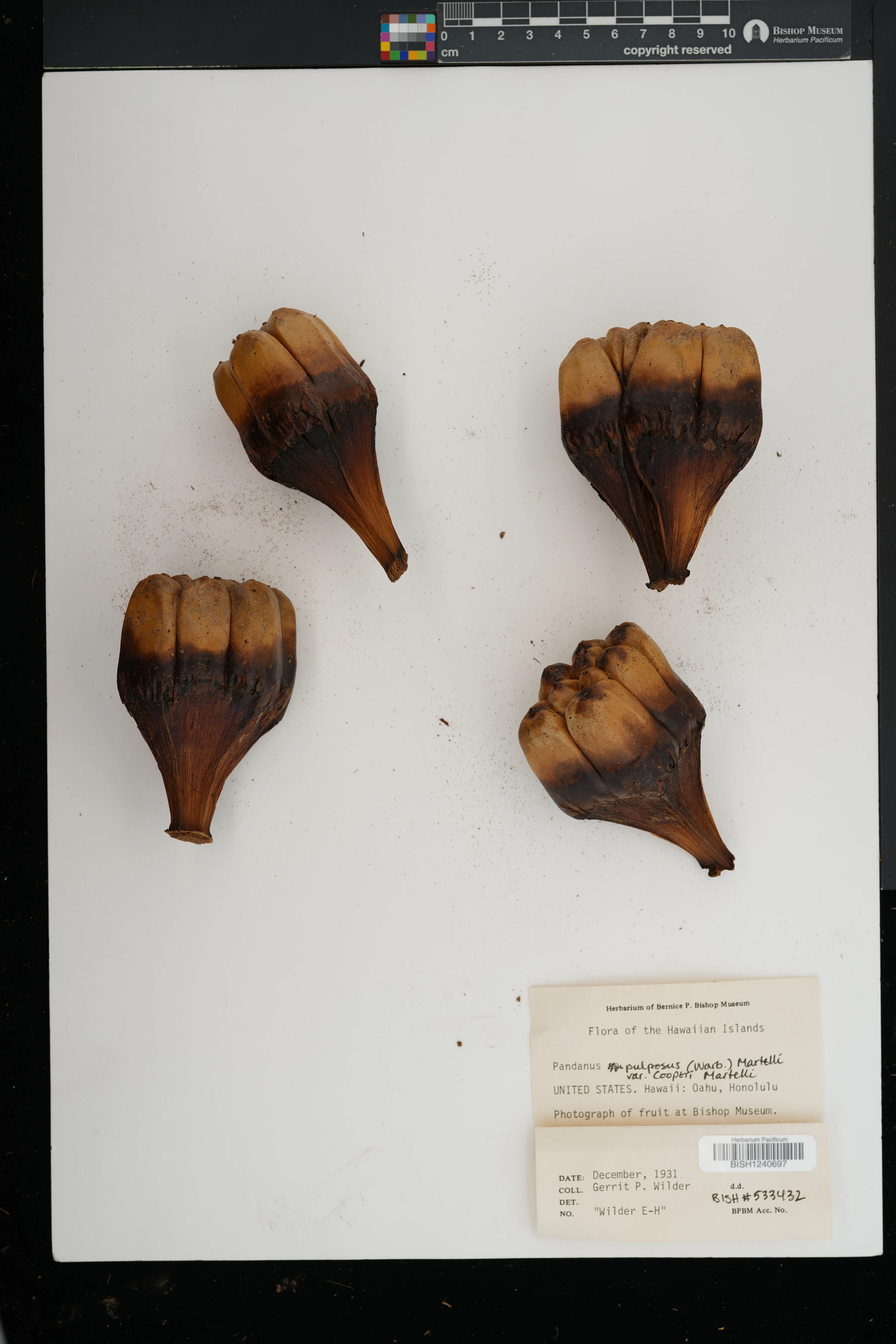 Tree 9m tall; roots spreading laterally at ground level; prop roots from 1m above ground; fruits orange at maturity; fruiting head exceptionally large |