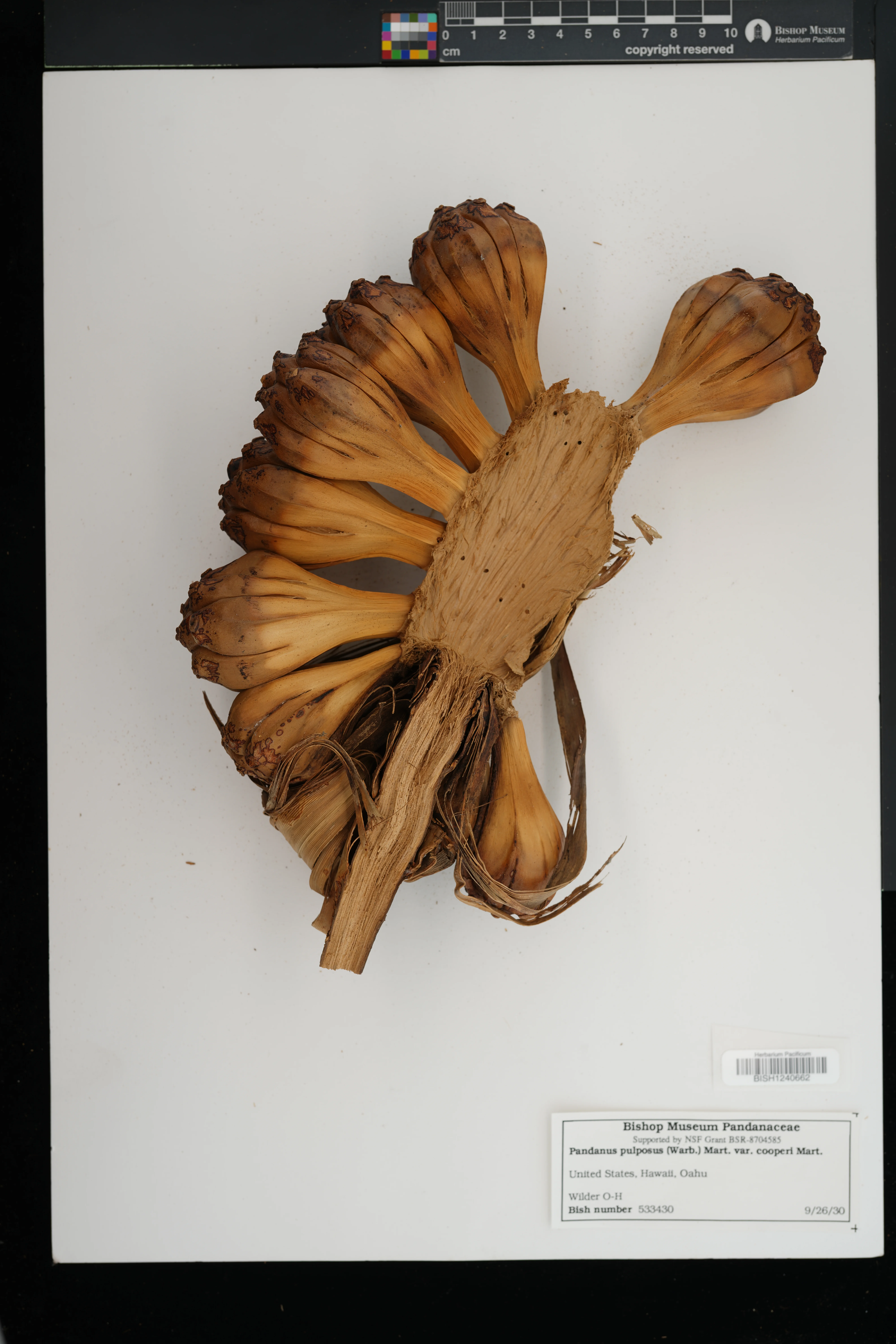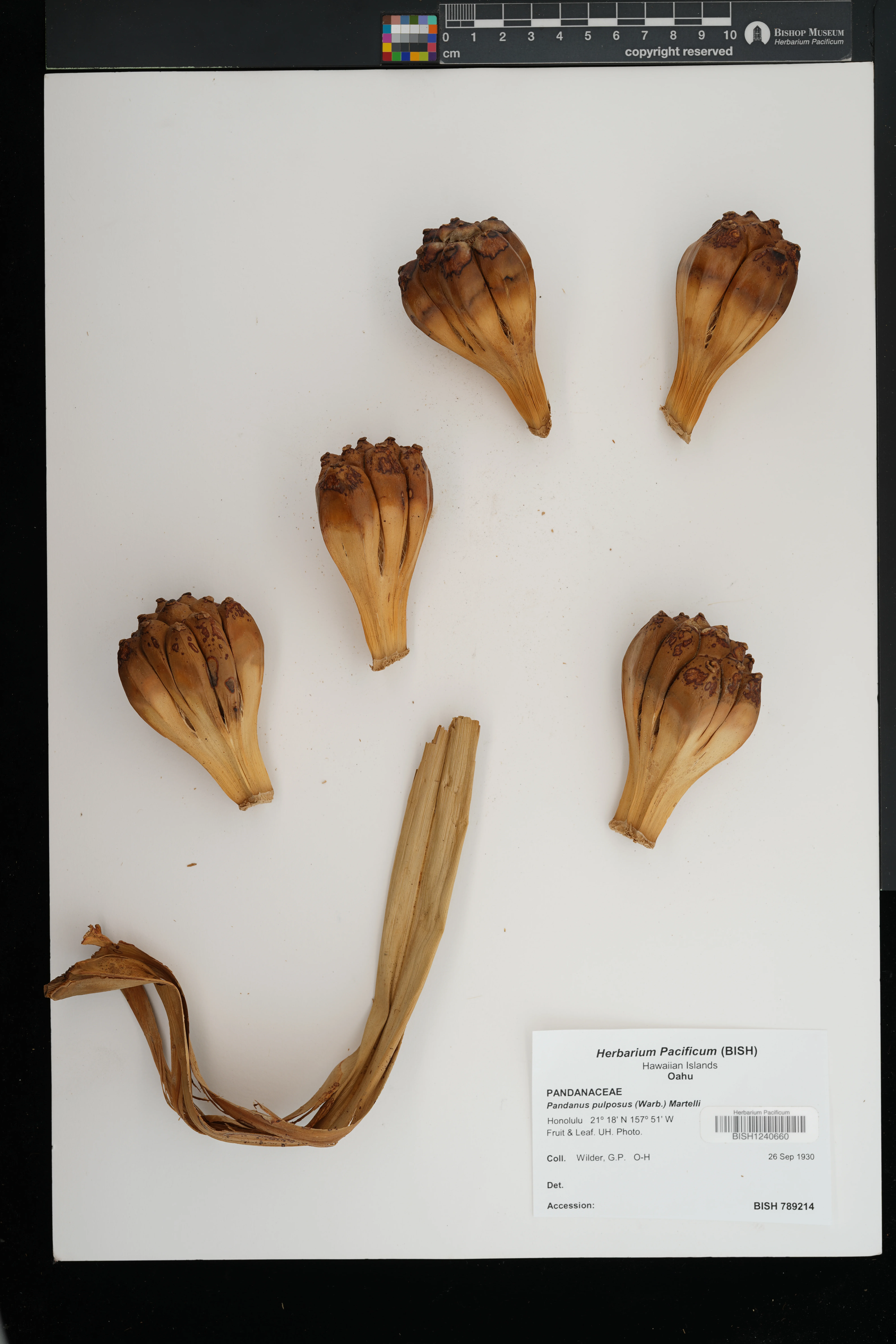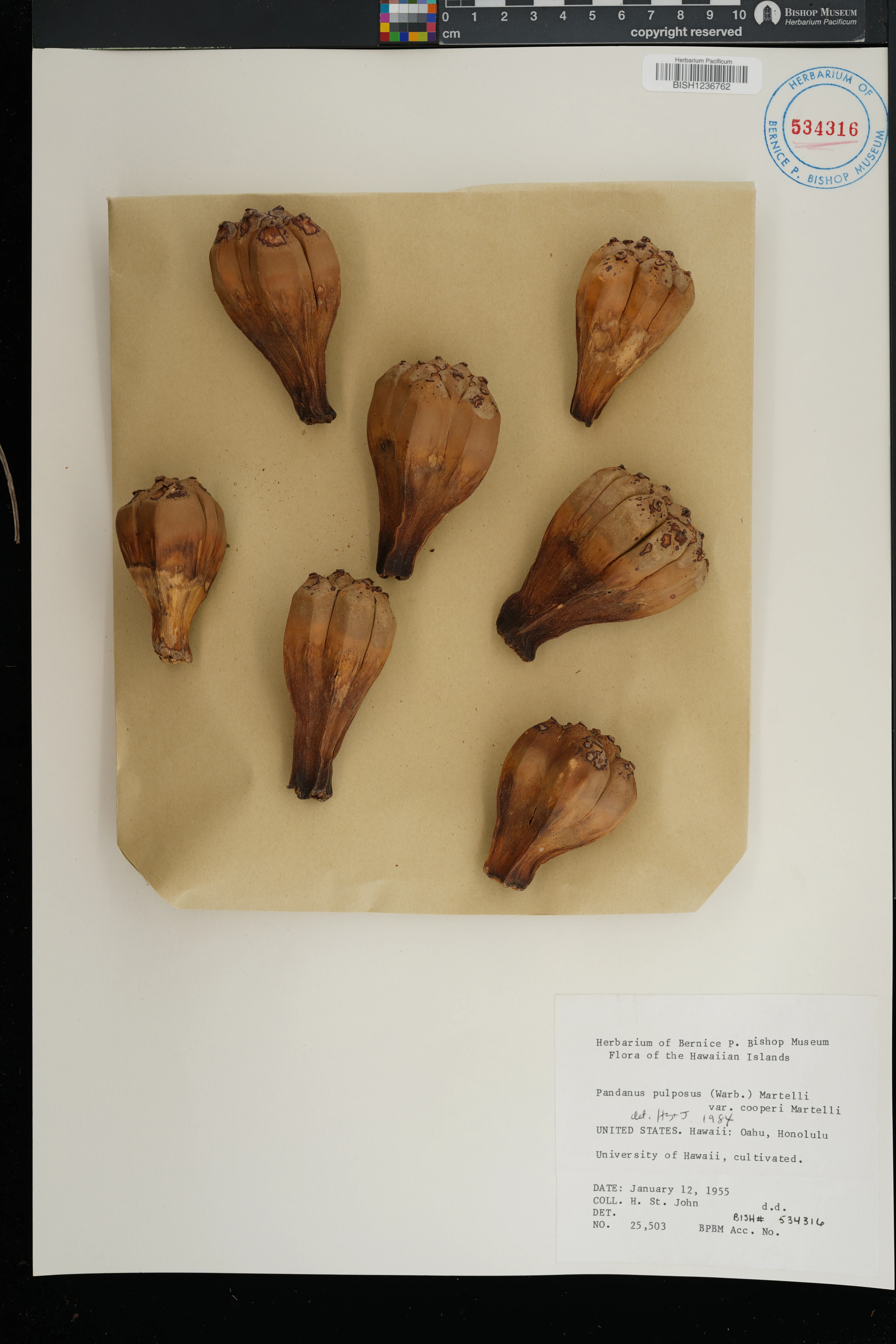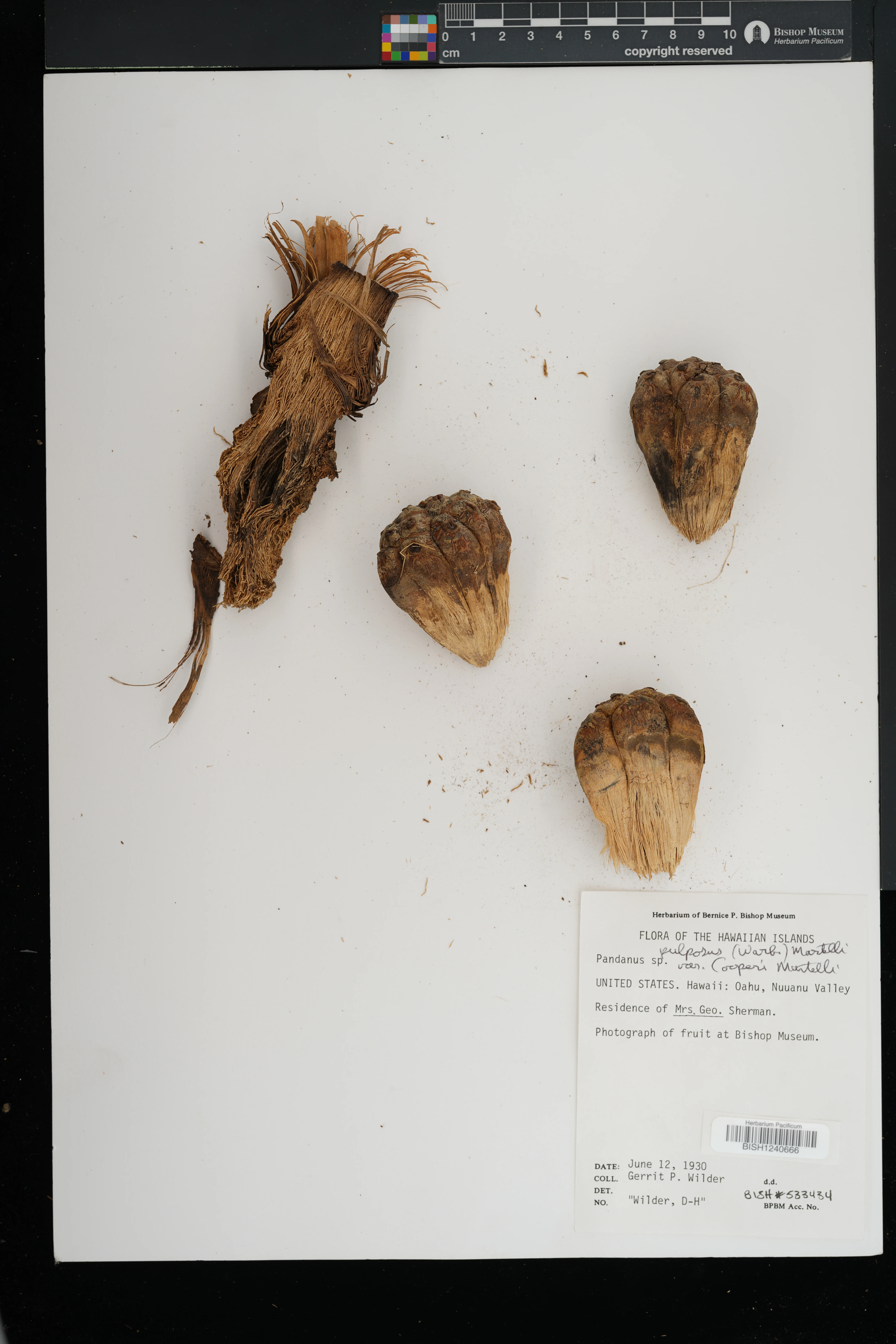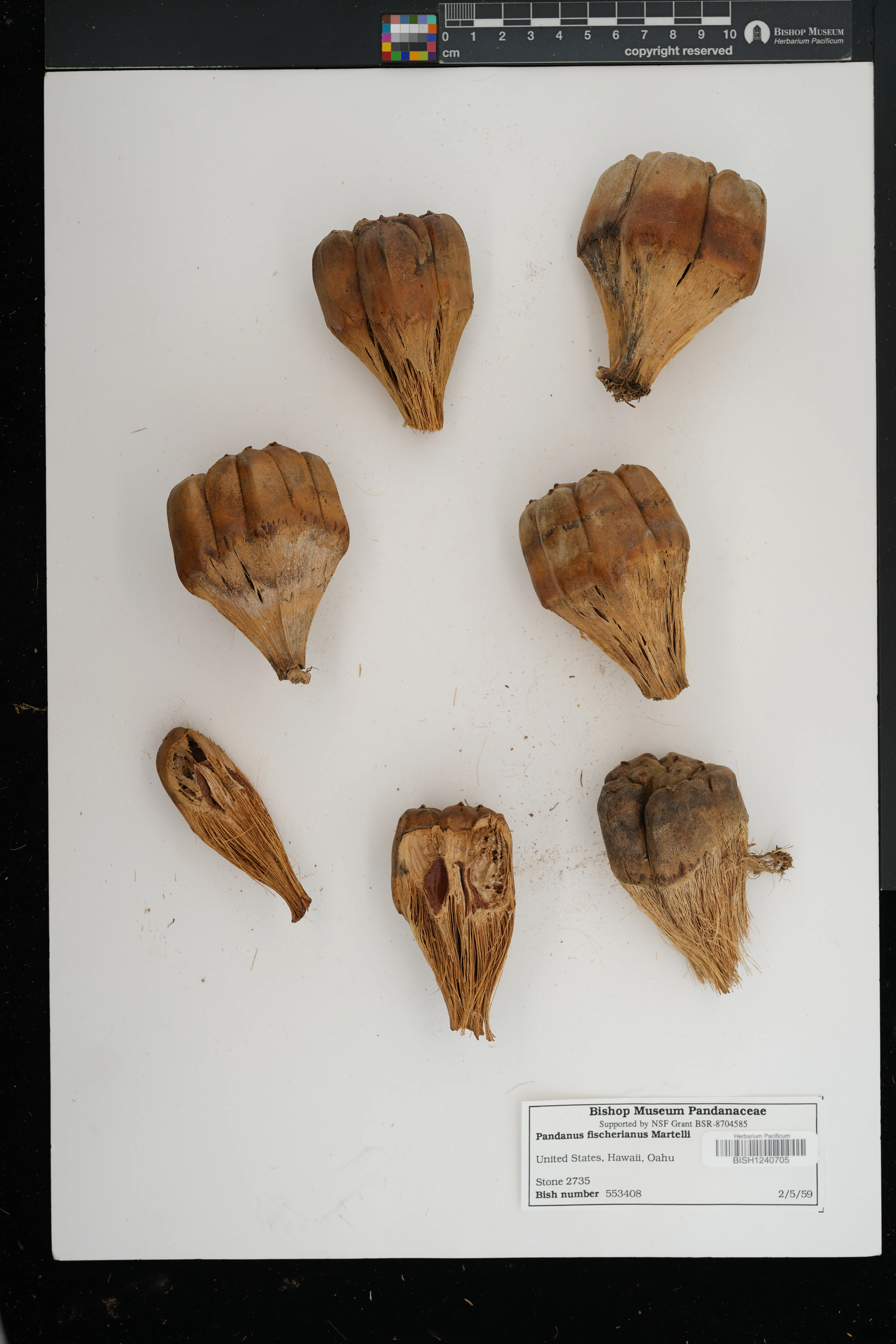 Tree 9m tall; roots spreading laterally at ground level; prop roots from 1m above ground; fruits orange at maturity; fruiting head exceptionally large |