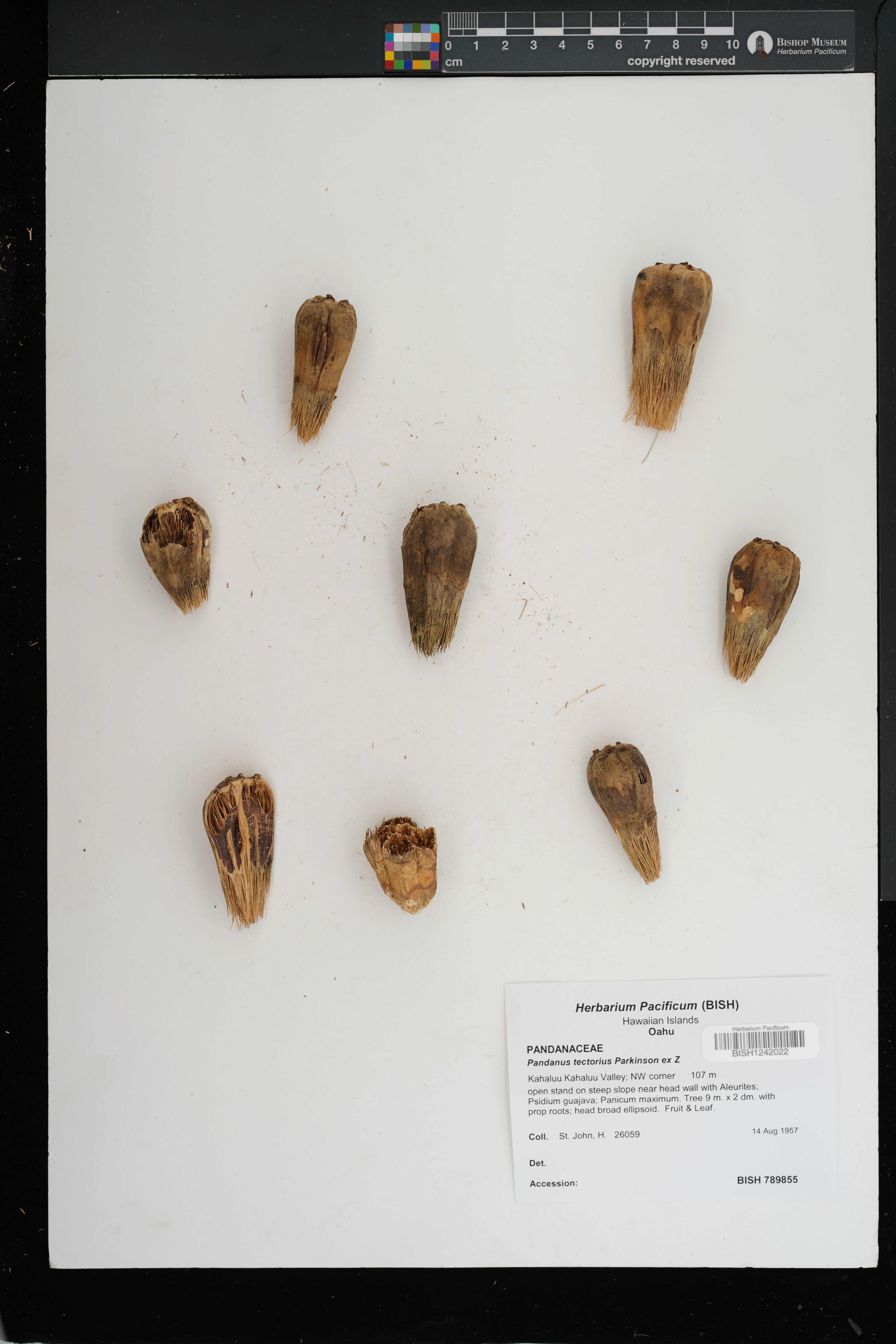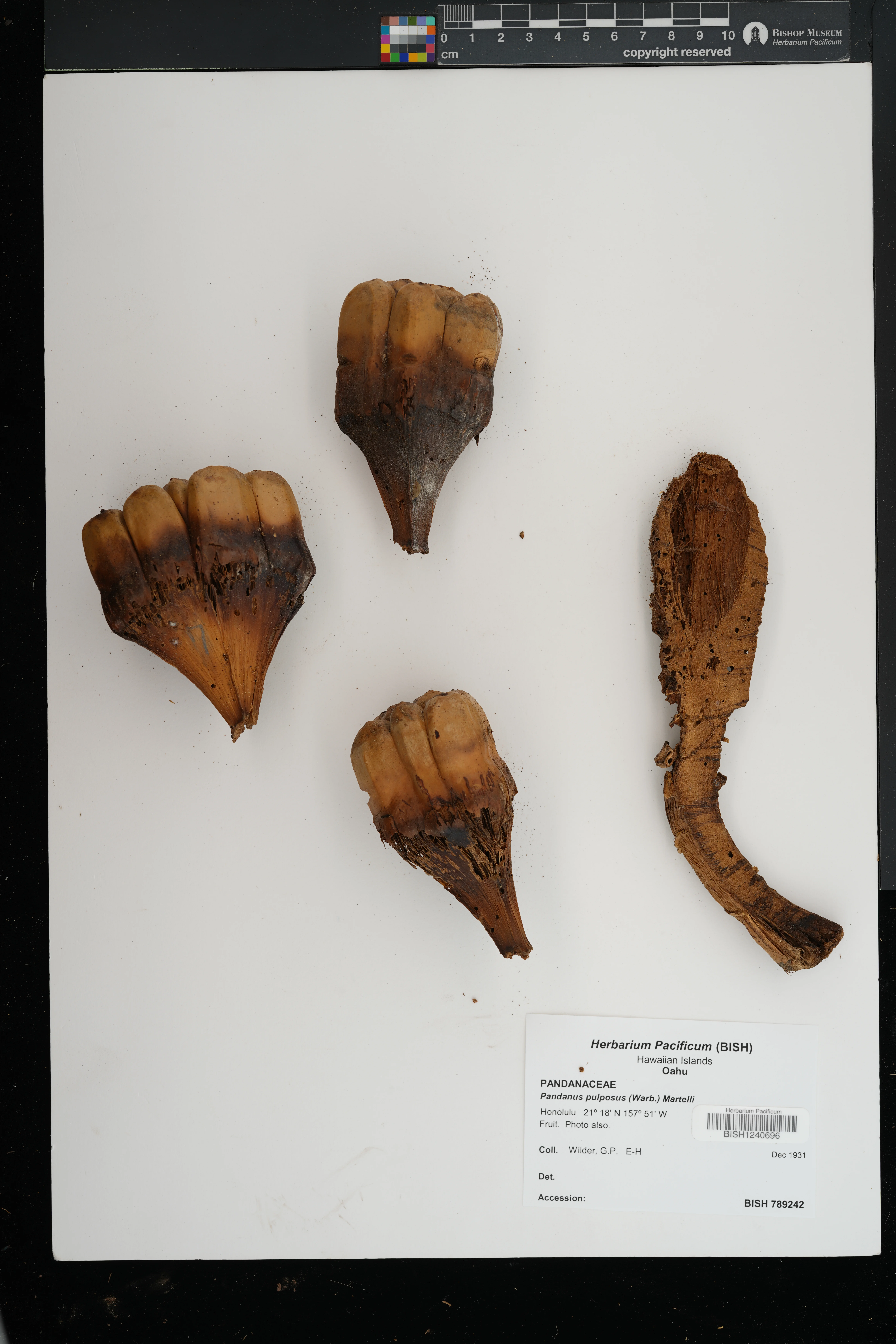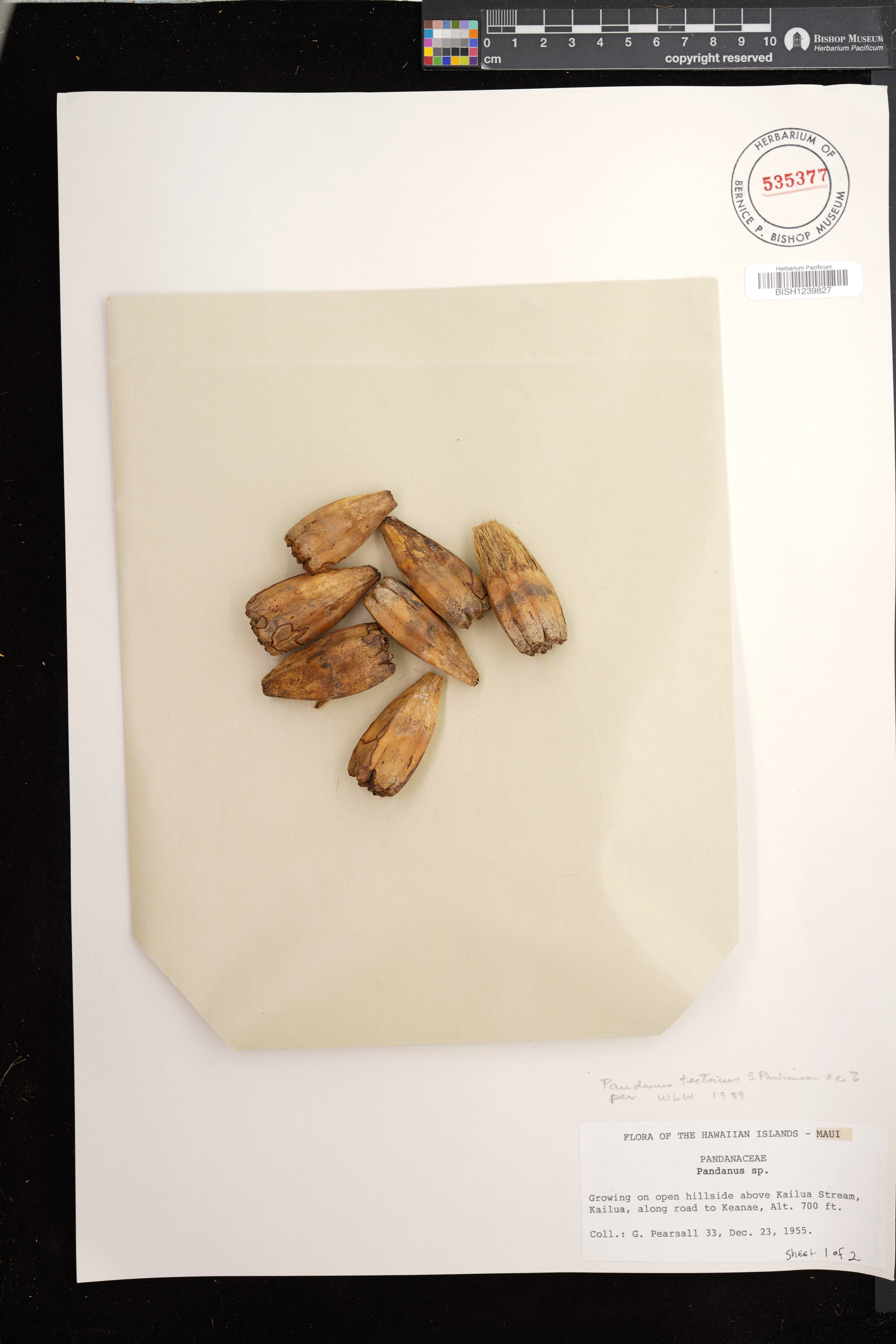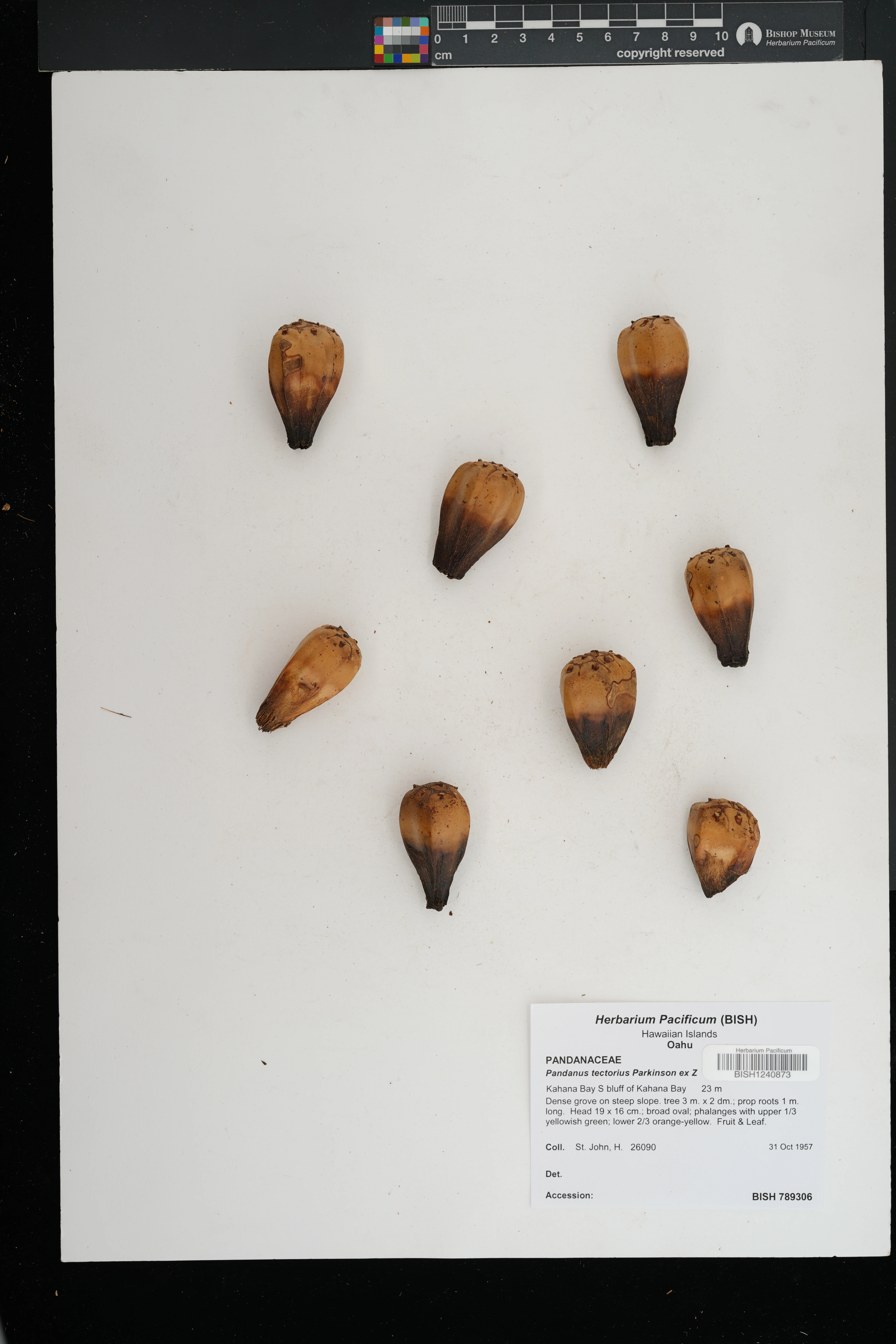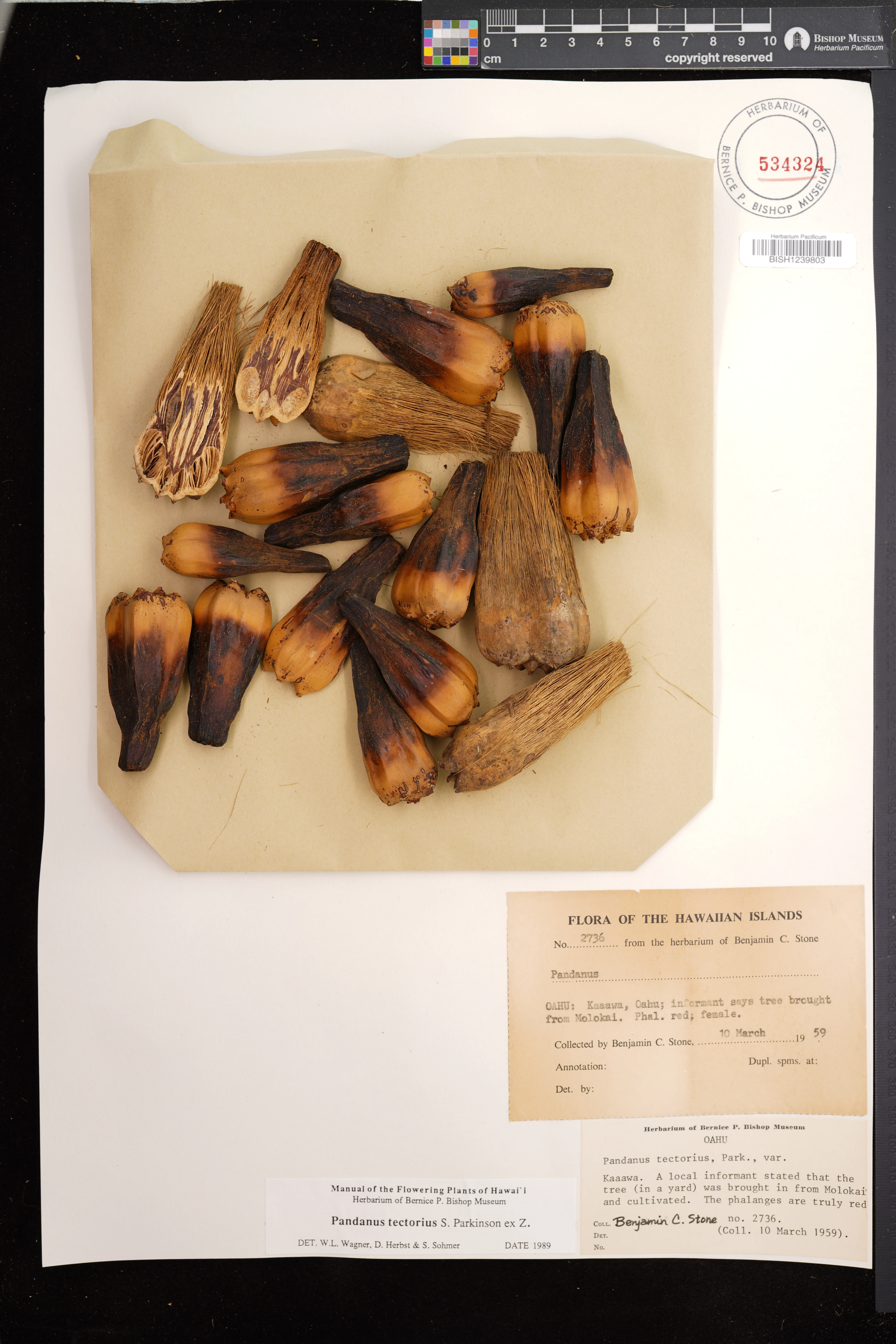 Tree 9m tall; roots spreading laterally at ground level; prop roots from 1m above ground; fruits orange at maturity; fruiting head exceptionally large |
