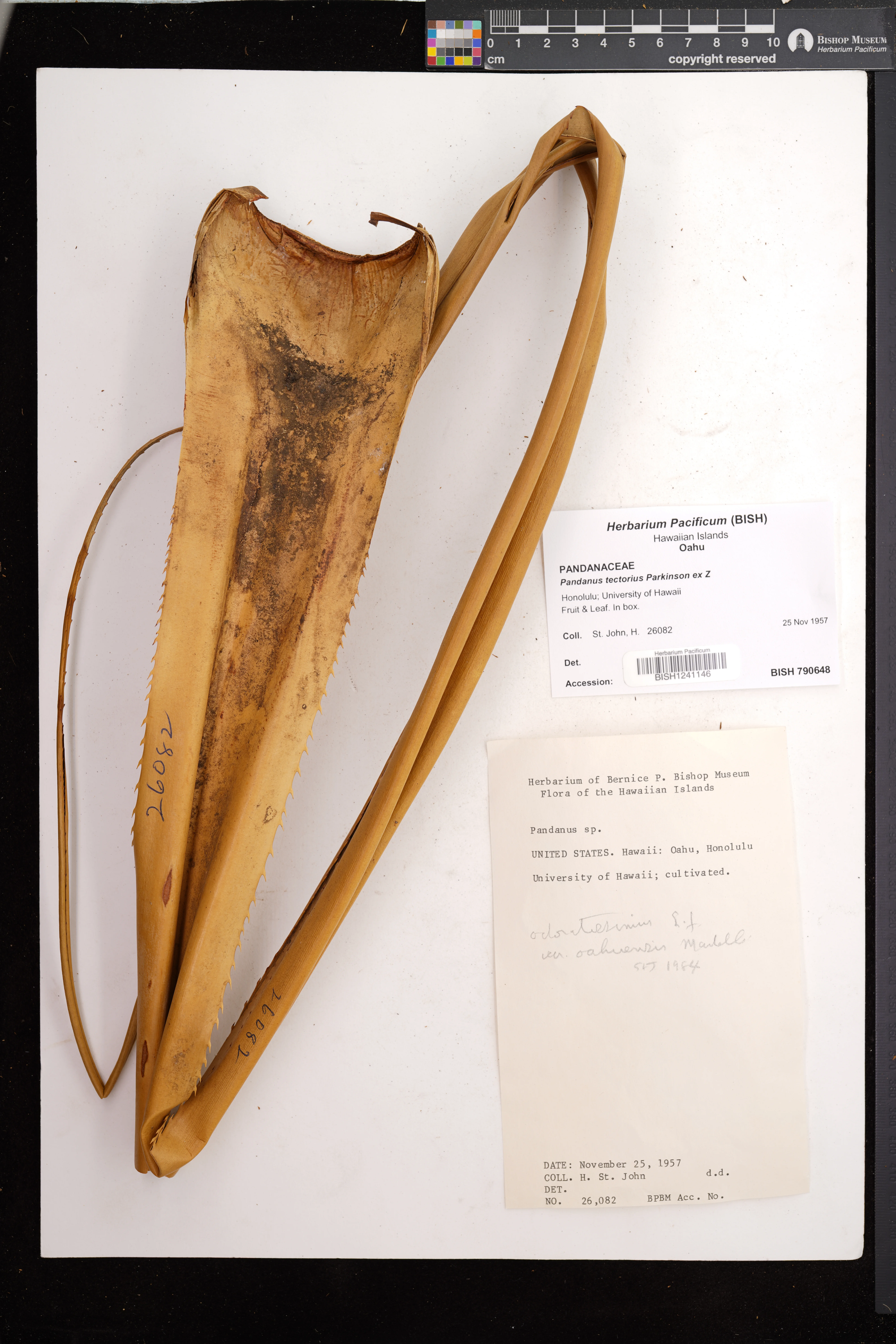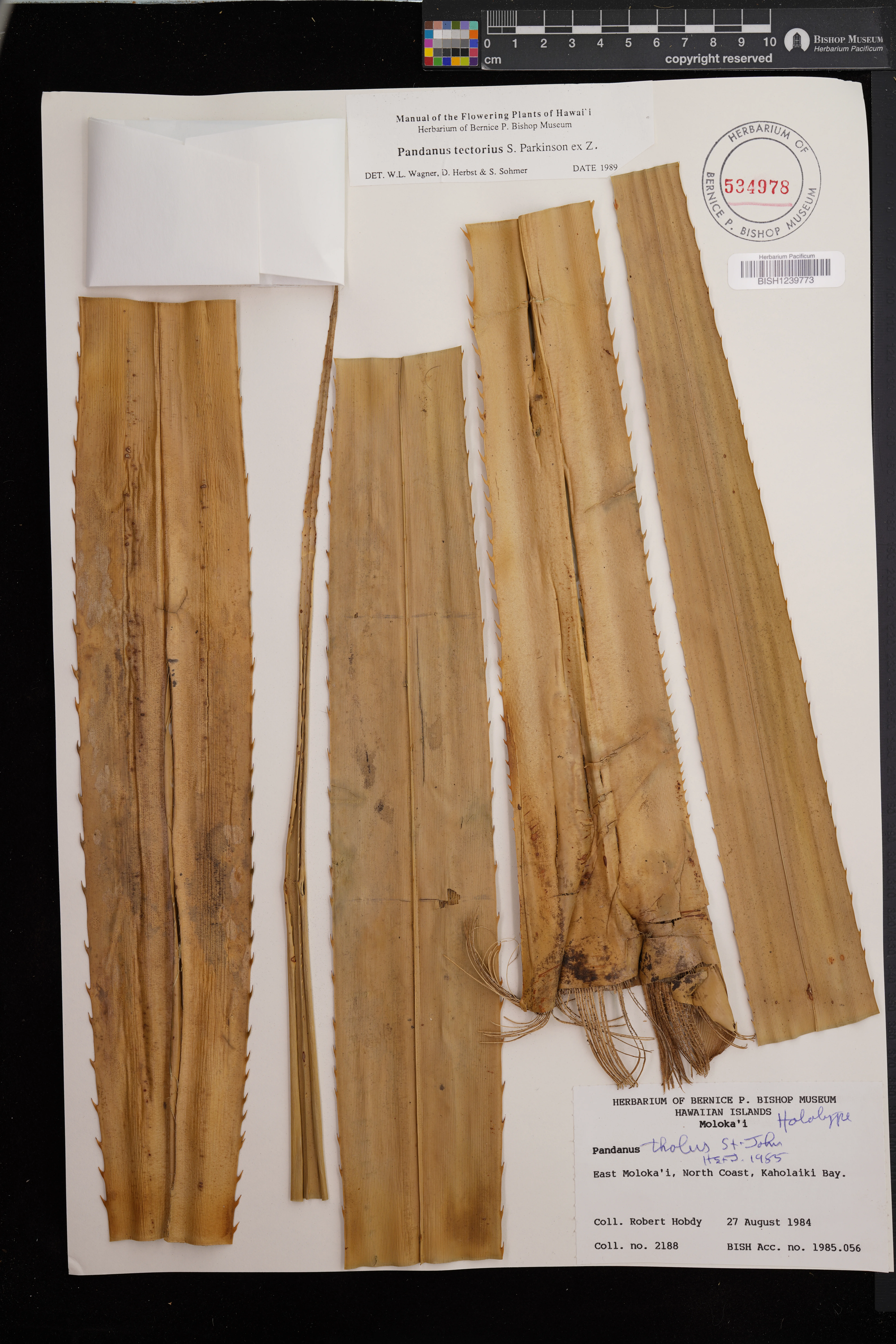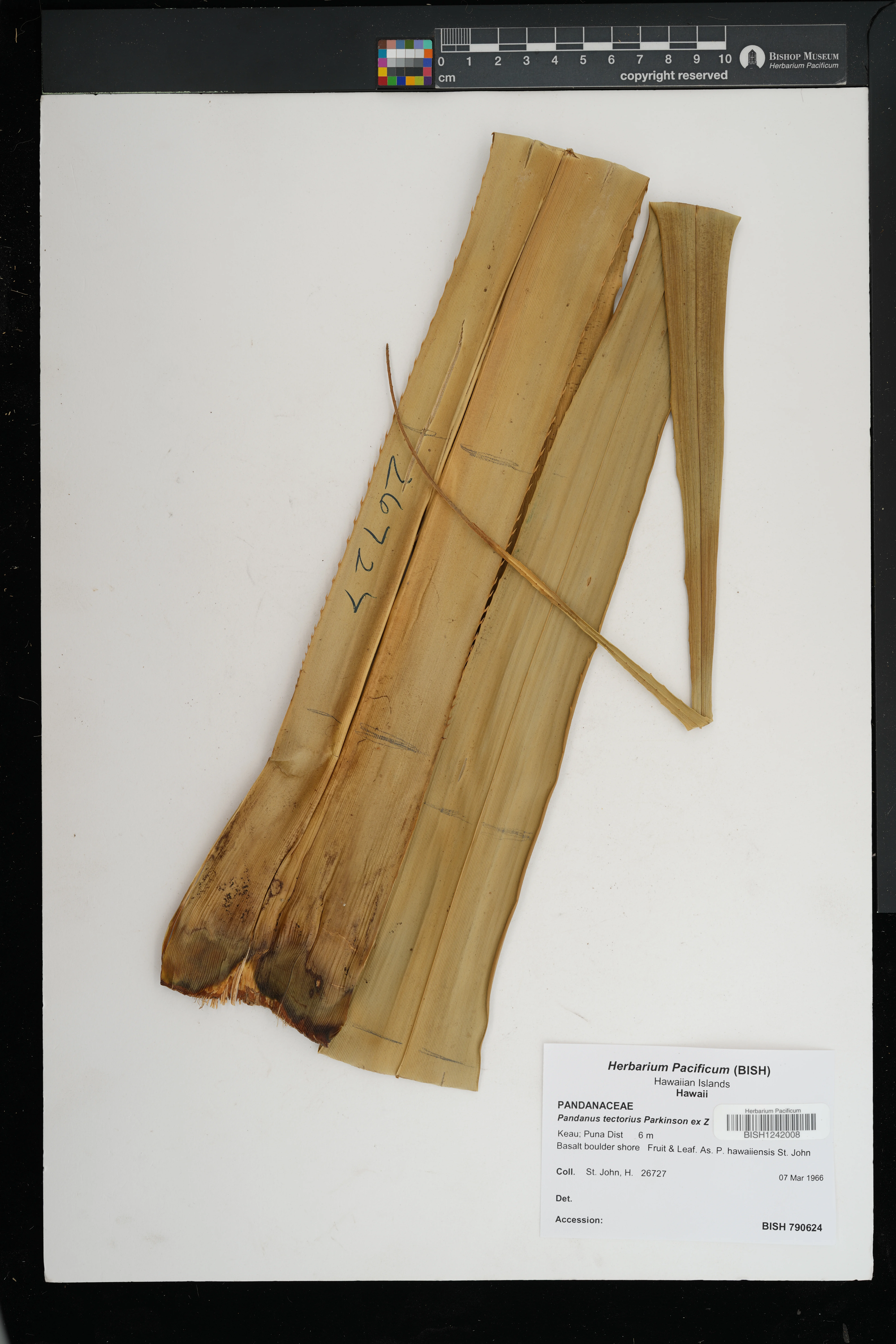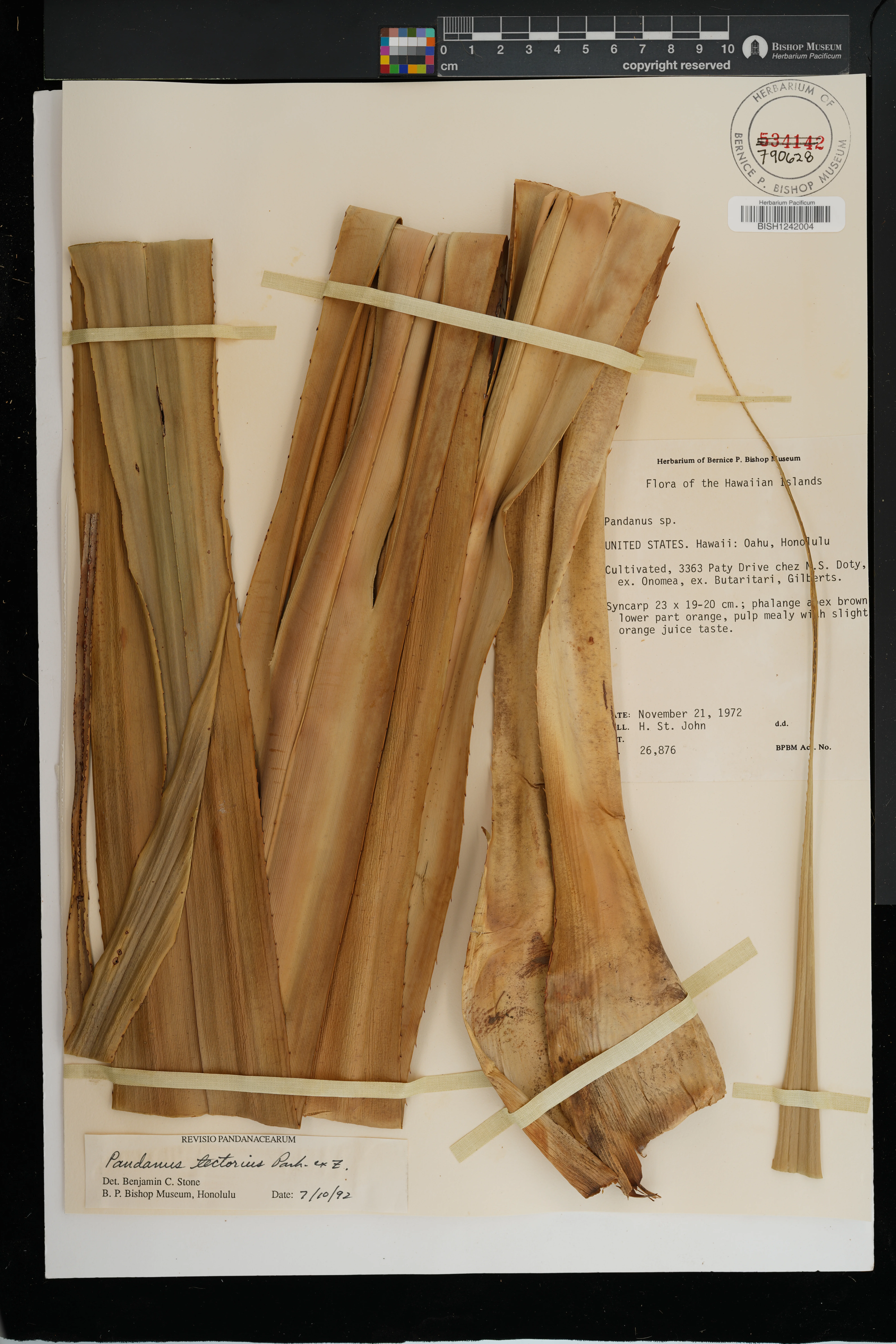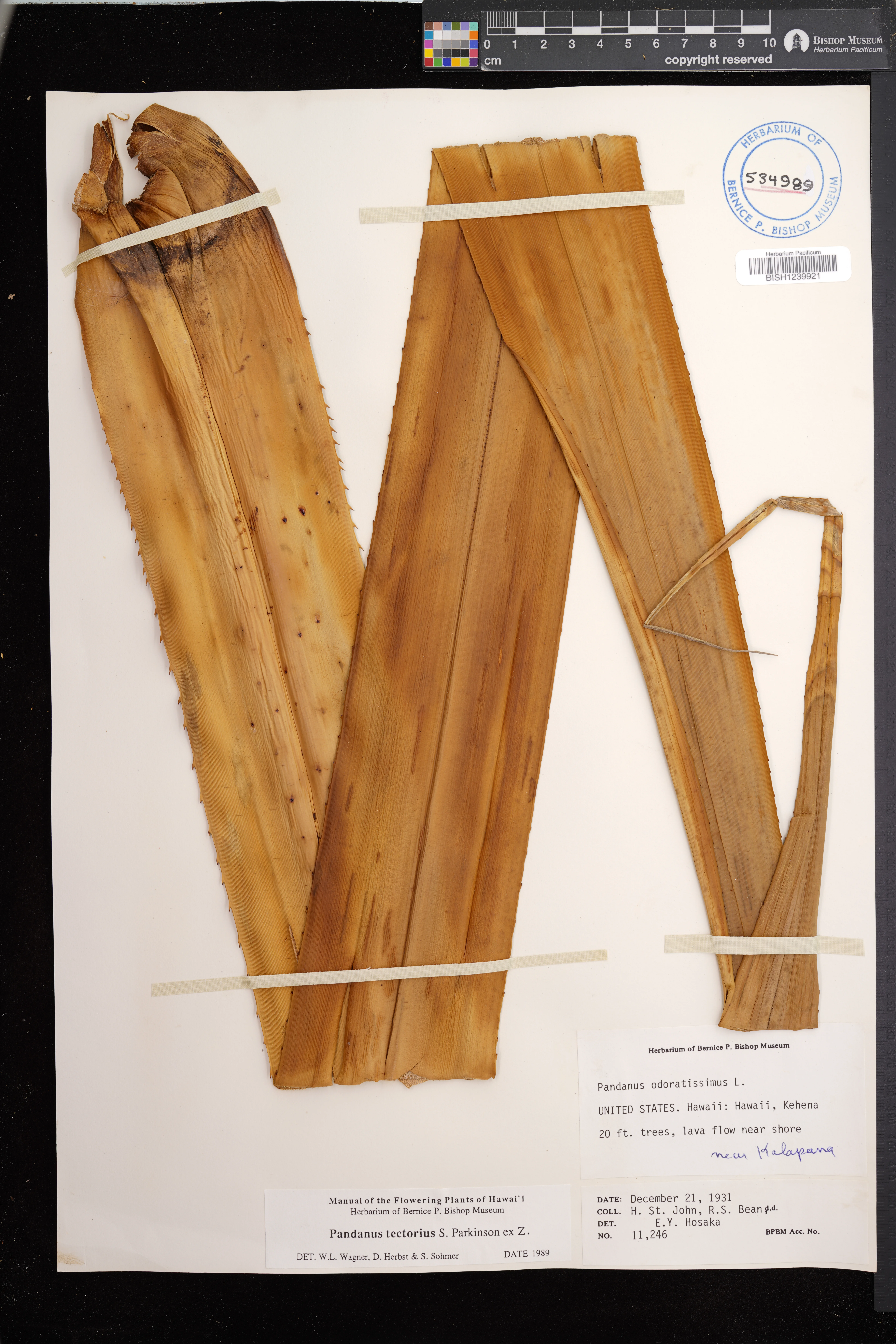 Tree 2 m tall. Thick prop roots. Leaves thornless except along driptip. Collection consists of a single ripe fruit. |