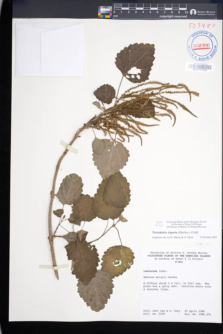 | 1 | Tetradenia riparia | (Hochst.) Codd | Wahiawa Botanic Garden | PRESERVED_SPECIMEN | Lau, J. | 2218 | Oahu | BISH | 4/7/1986 | |