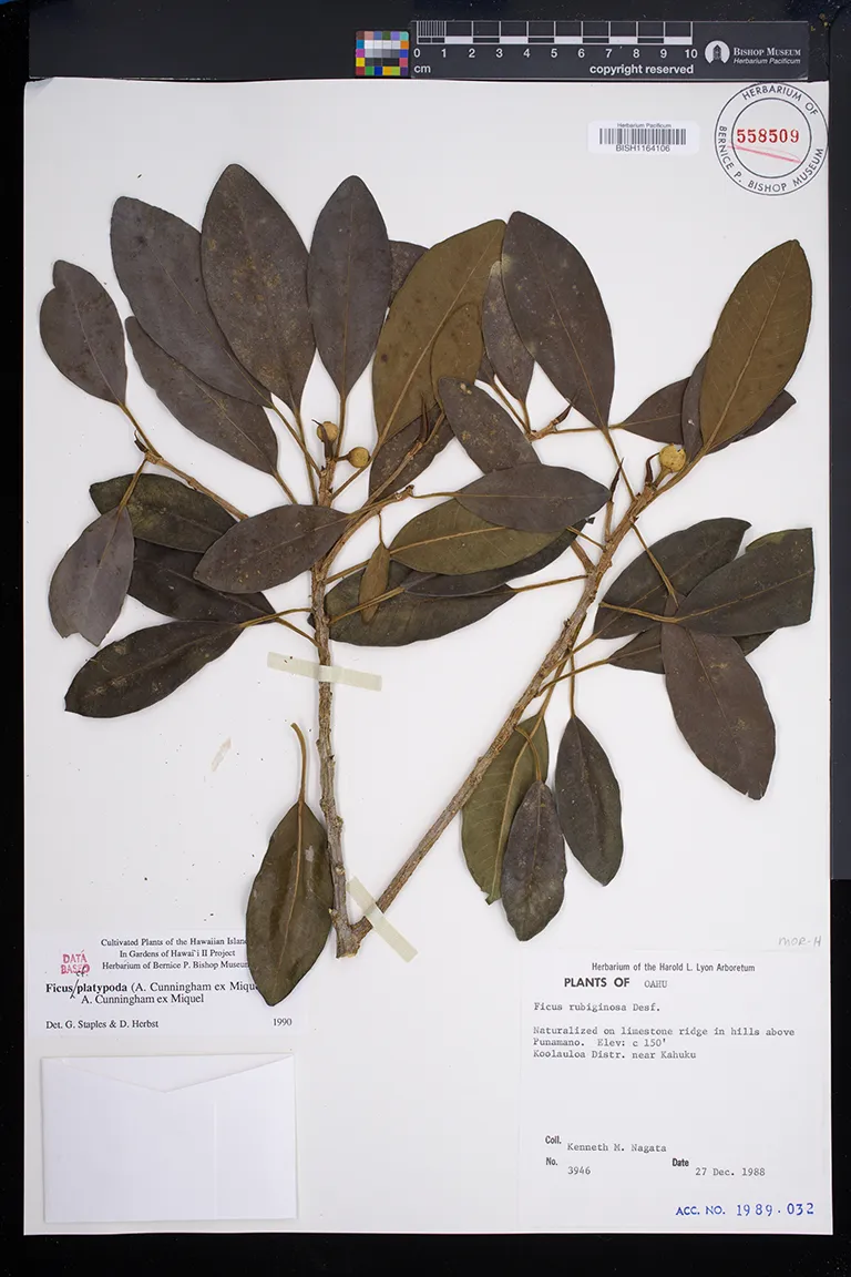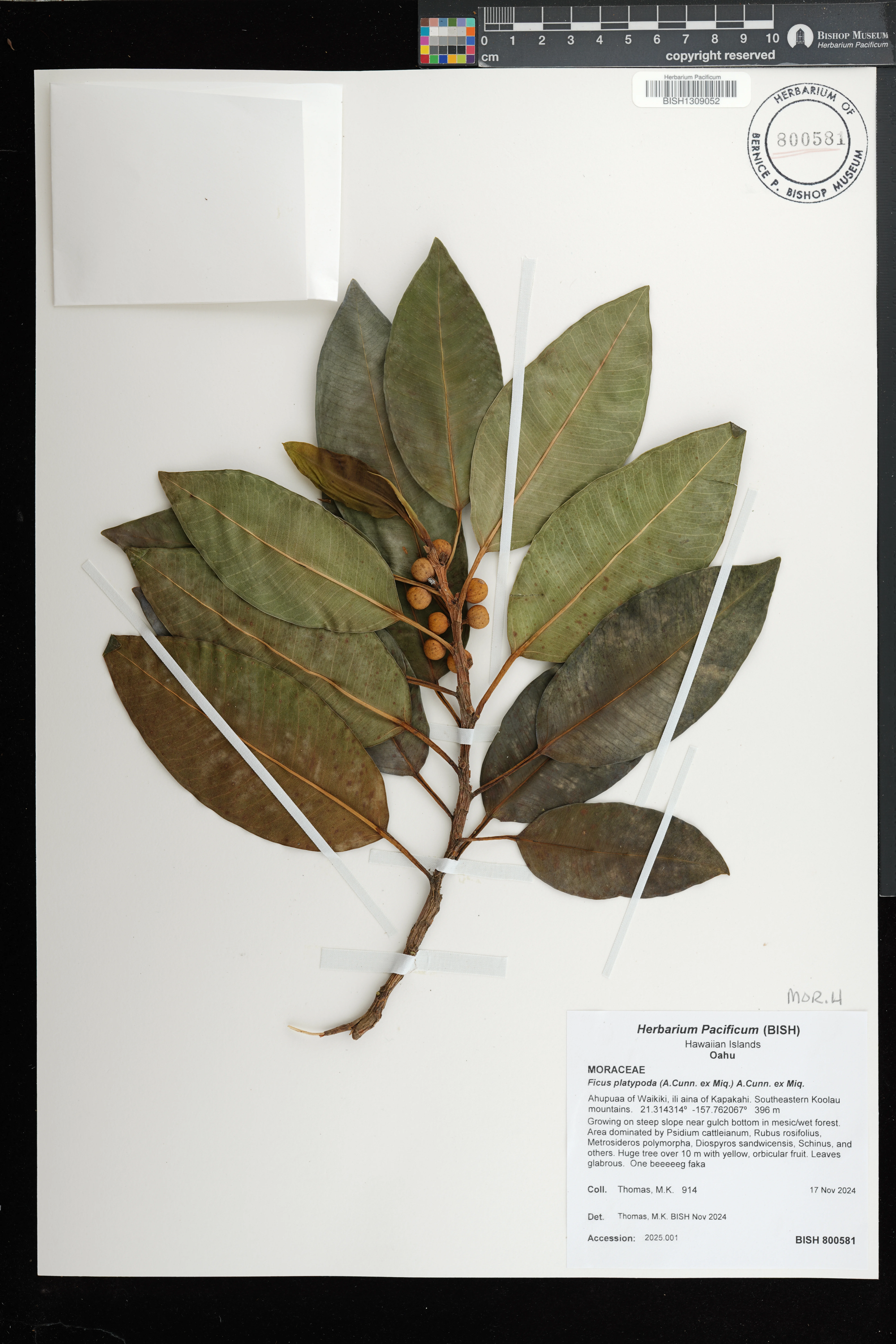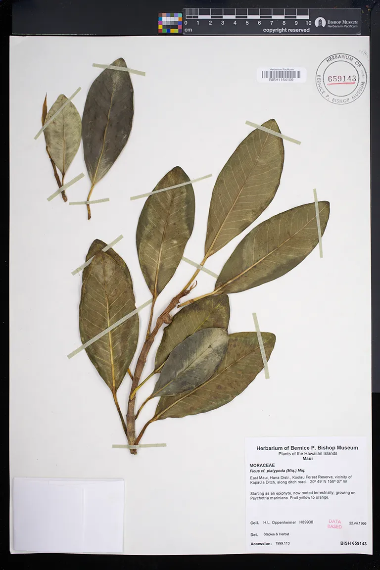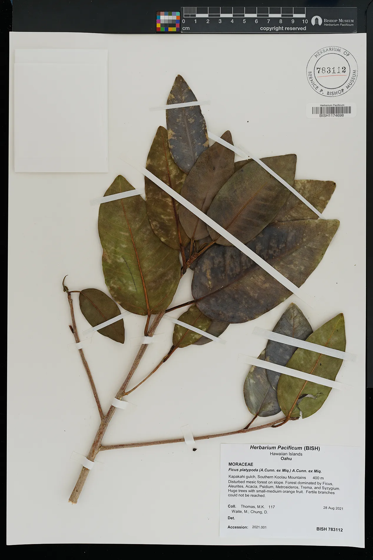 Associated vegetation: Canopy: several Ficus species, Spathodea campanulata, Leucaena leucocephala, Macaranga tanarius, Aleurites moluccana, Enterolobium cyclocarpum, Cinnamomum burmanii. Understory: Various grasses and herbs, mowed into lawn and Urochloa maxima. |