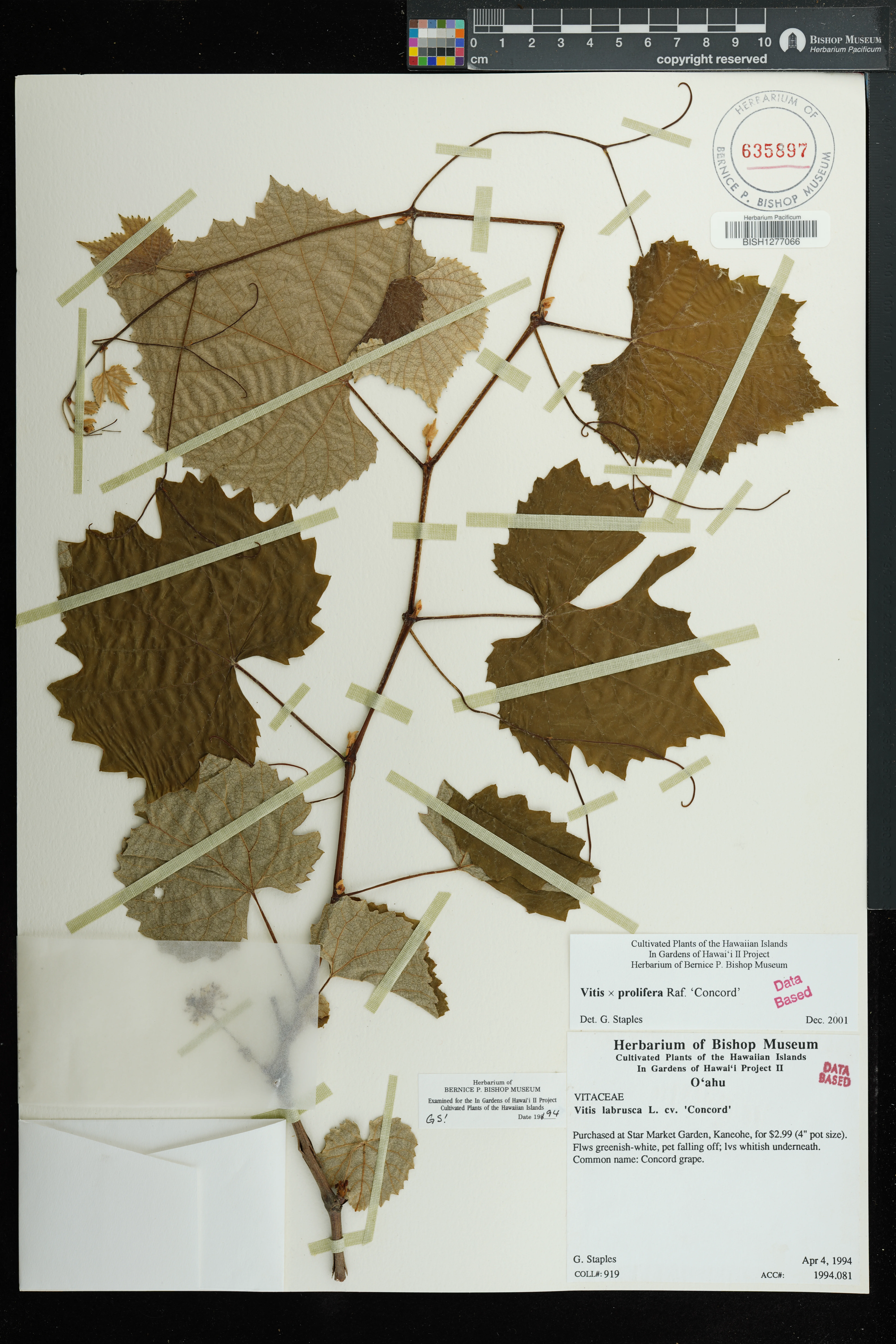 | 1 | Vitis × alexanderi | Prince ex Jacques | Purchased at Star Market Garden, Kaneohe, for $2.99 (4" pot size) | PRESERVED_SPECIMEN | Staples, G. | 919 | Oahu | BISH | 4/4/1994 |