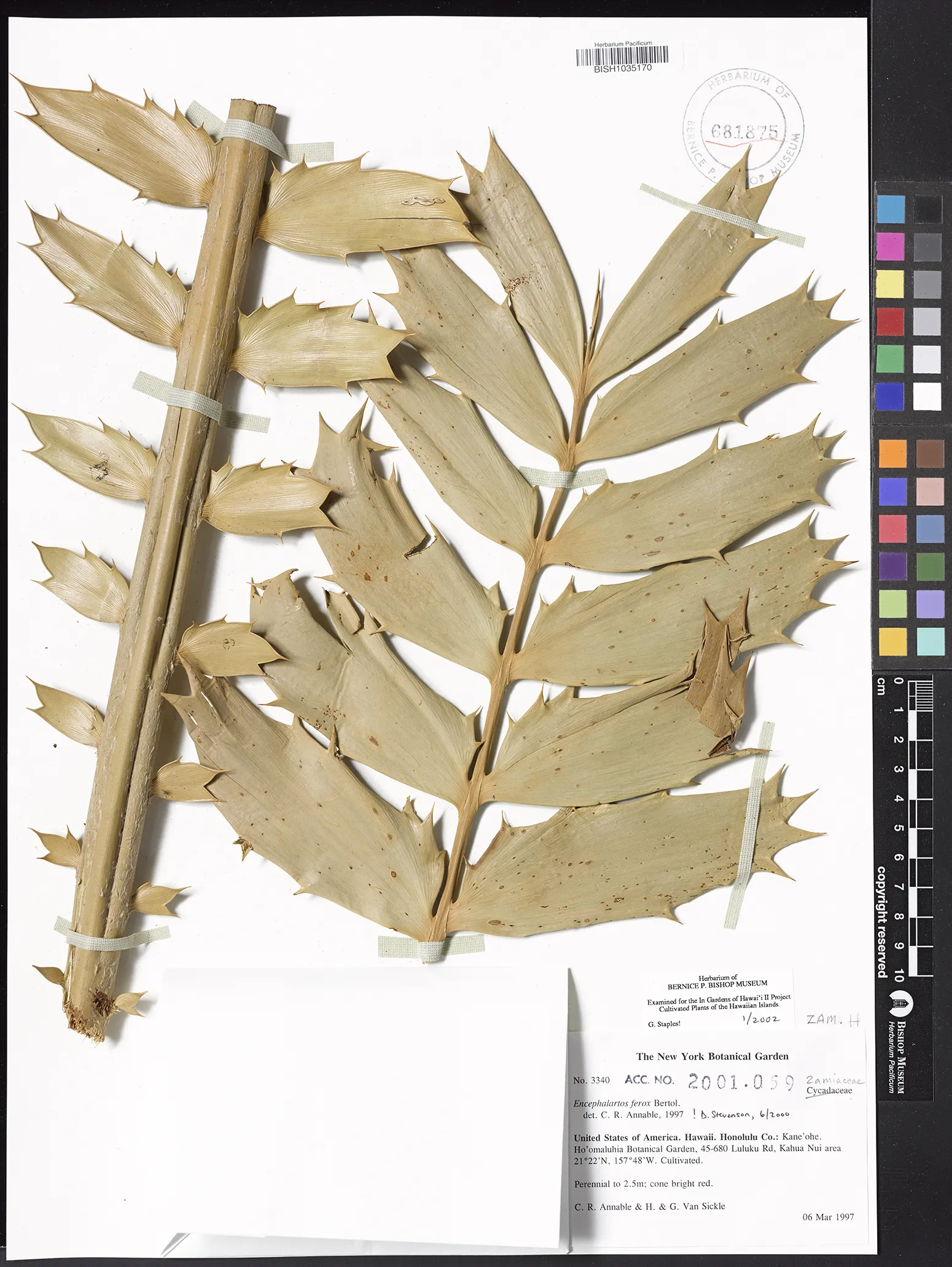 | 2 | Encephalartos ferox | G.Bertol. | kaneohe, hoomaluhia botanical garden, 45-680 luluku rd, kahua nui area | PRESERVED_SPECIMEN | annable, c.r. van sickle, h.; van sickle, g. | collector number: 3340 | Oahu | BISH | 3/6/1997 | |