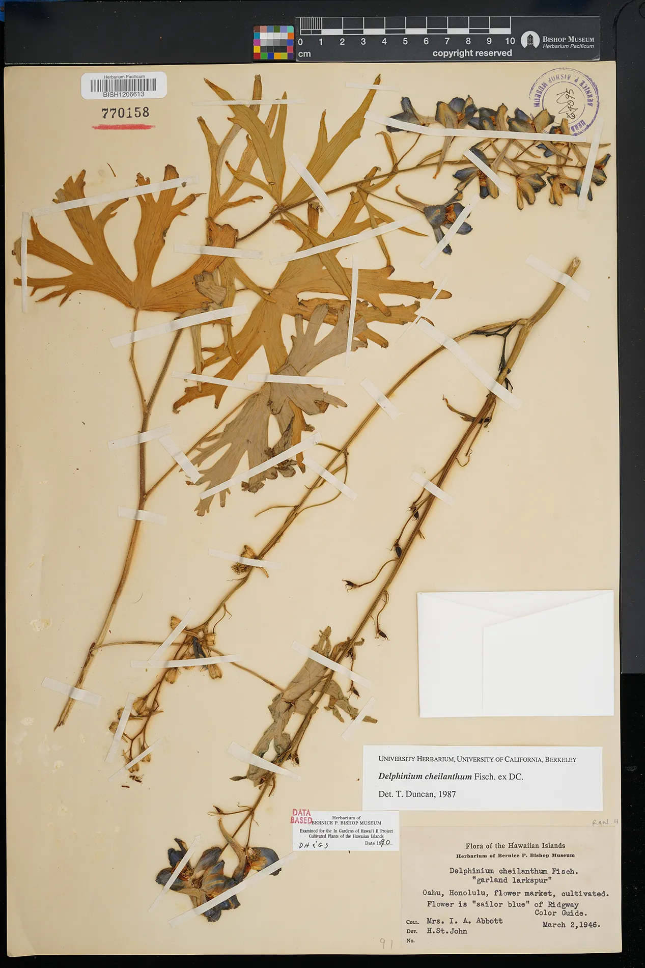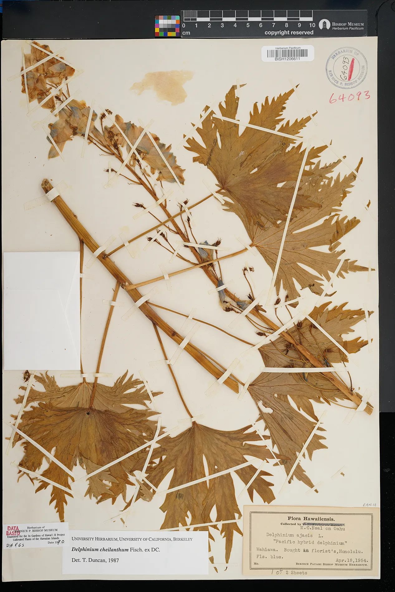 | 3 | Delphinium cheilanthum | Fisch. ex DC. | honolulu: flower market | PRESERVED_SPECIMEN | abbott, i.a. | collector number: s.n. | Oahu | BISH | 3/2/1946 | |