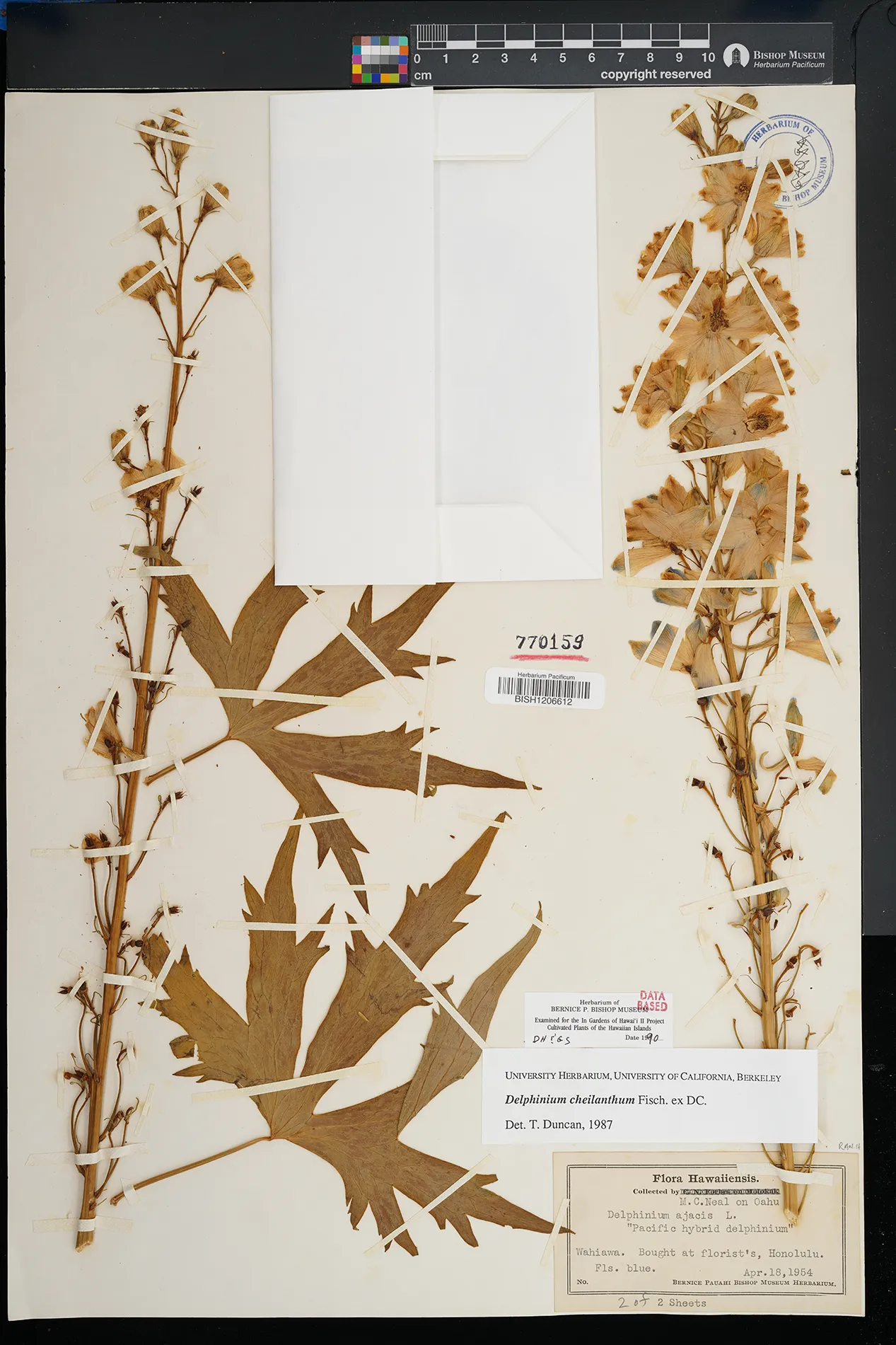 | 5 | Delphinium cheilanthum | Fisch. ex DC. | Wahiawa: bought at florist's in Honolulu | PRESERVED_SPECIMEN | Neal, M.C. | s.n. | Oahu | BISH | 4/18/1954 | |