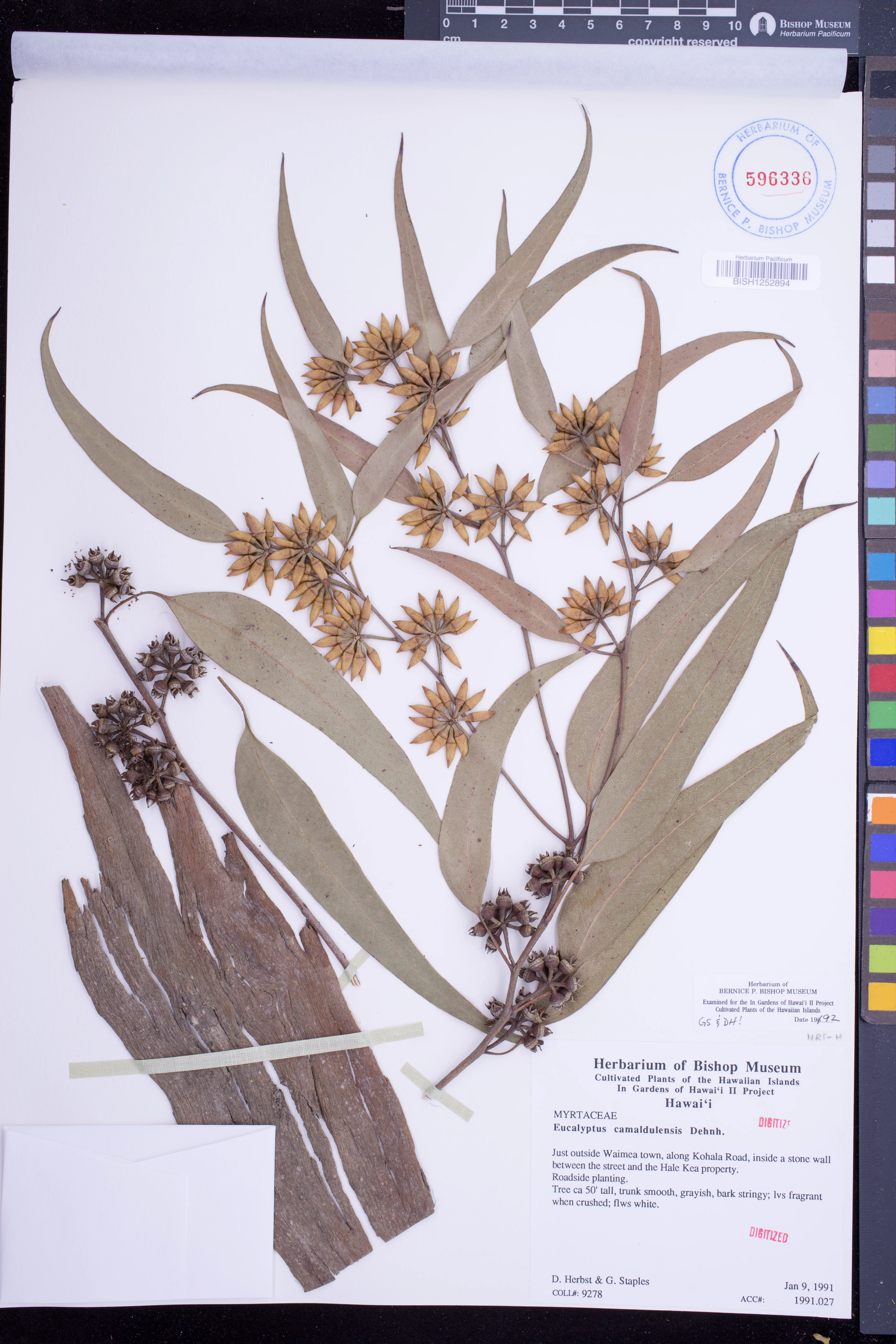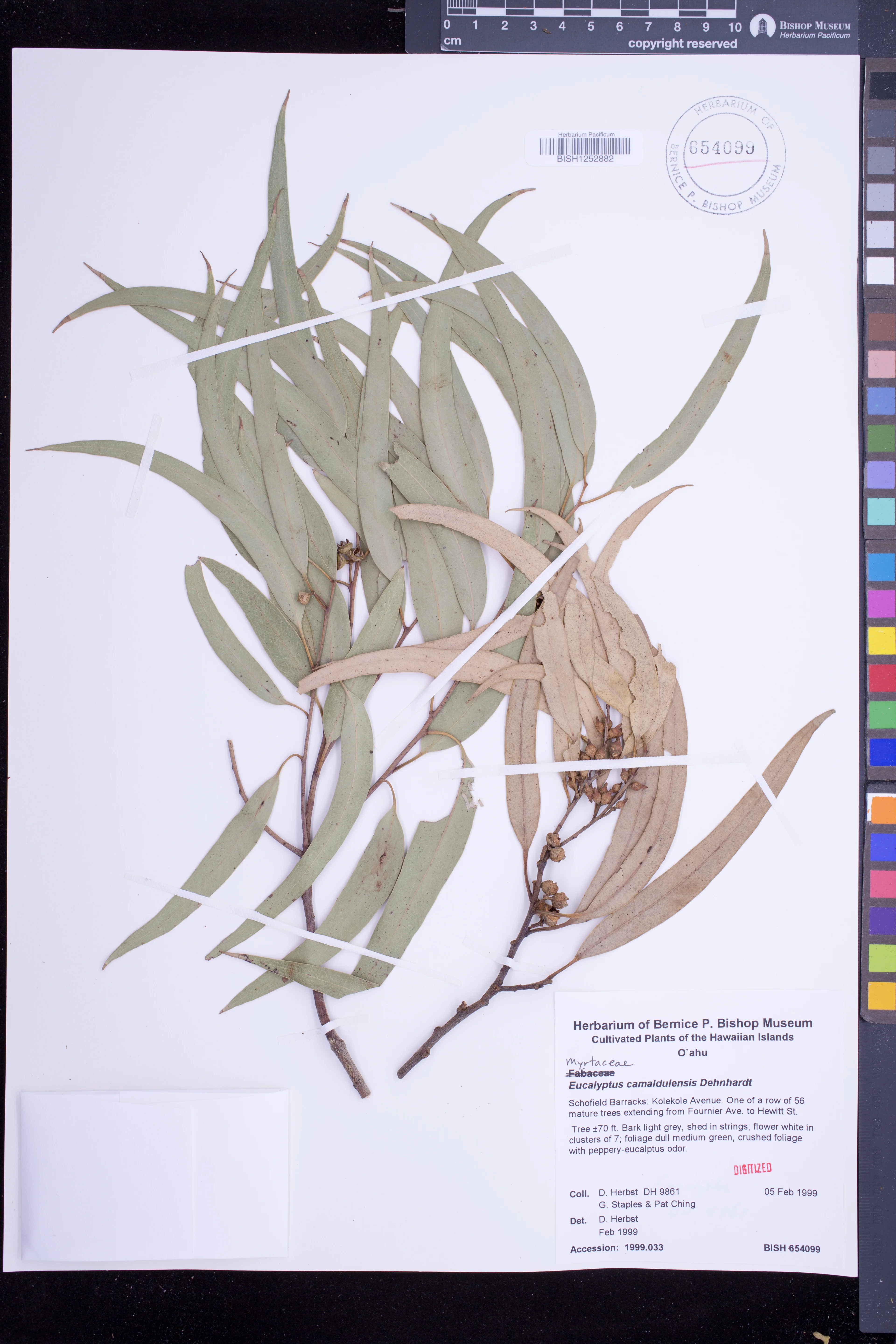 | 10 | Eucalyptus camaldulensis | Dehnh. | schofield barracks: kolekole avenue. one of a row of 56 mature trees extending from fournier ave. to hewitt st | PRESERVED_SPECIMEN | herbst, d.r. staples iii, g.w.; p.ching | collector number: 9861 | Oahu | BISH | 2/5/1999 | |