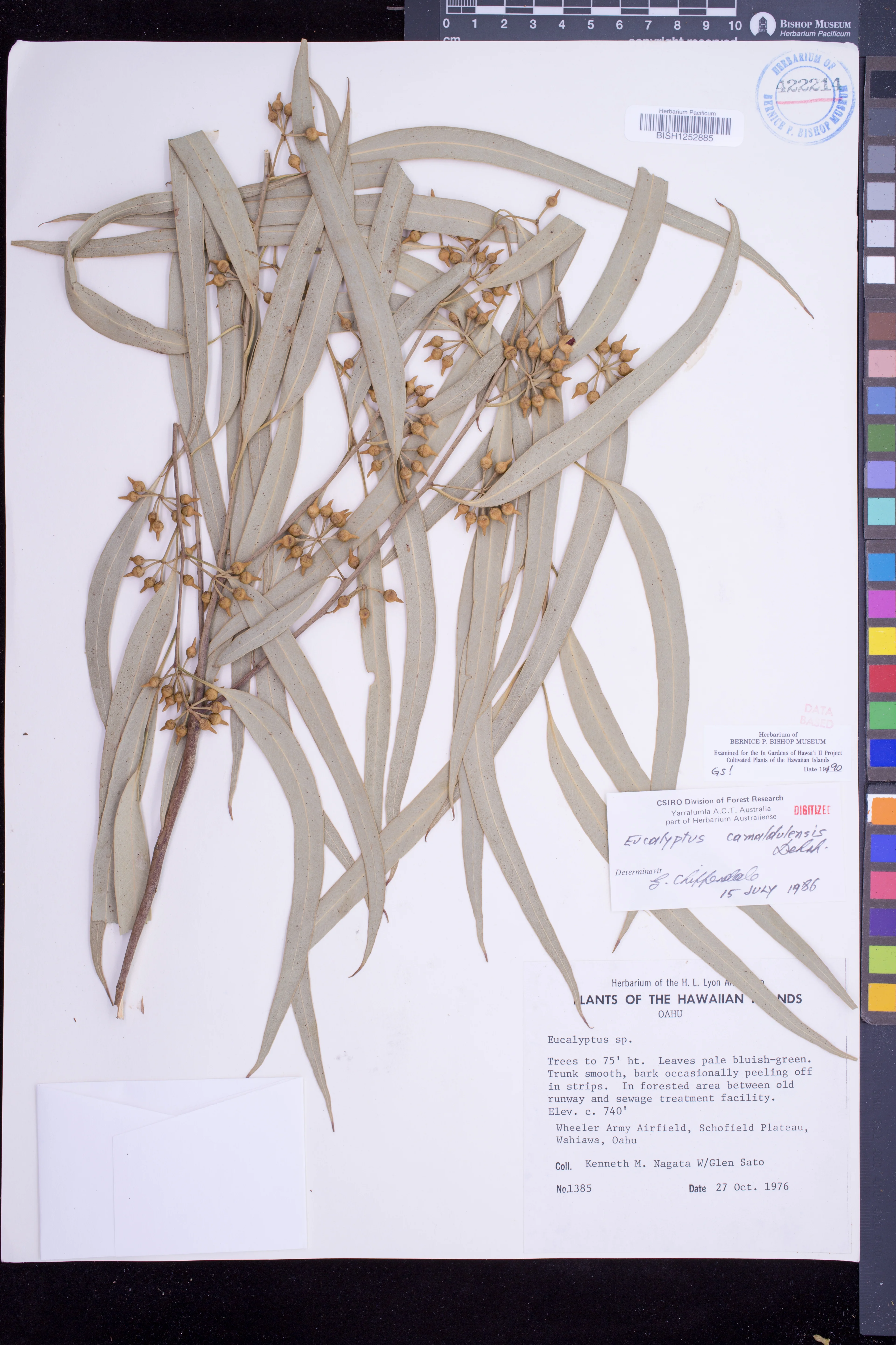 | 16 | Eucalyptus camaldulensis | Dehnh. | wheeler army airfield, schofield plateau, wahiawa, oahu. between old runway and sewage treatment facility | In forested area | PRESERVED_SPECIMEN | nagata, k.m. sato, g. | collector number: 1385 | Oahu | BISH | 10/27/1976 |