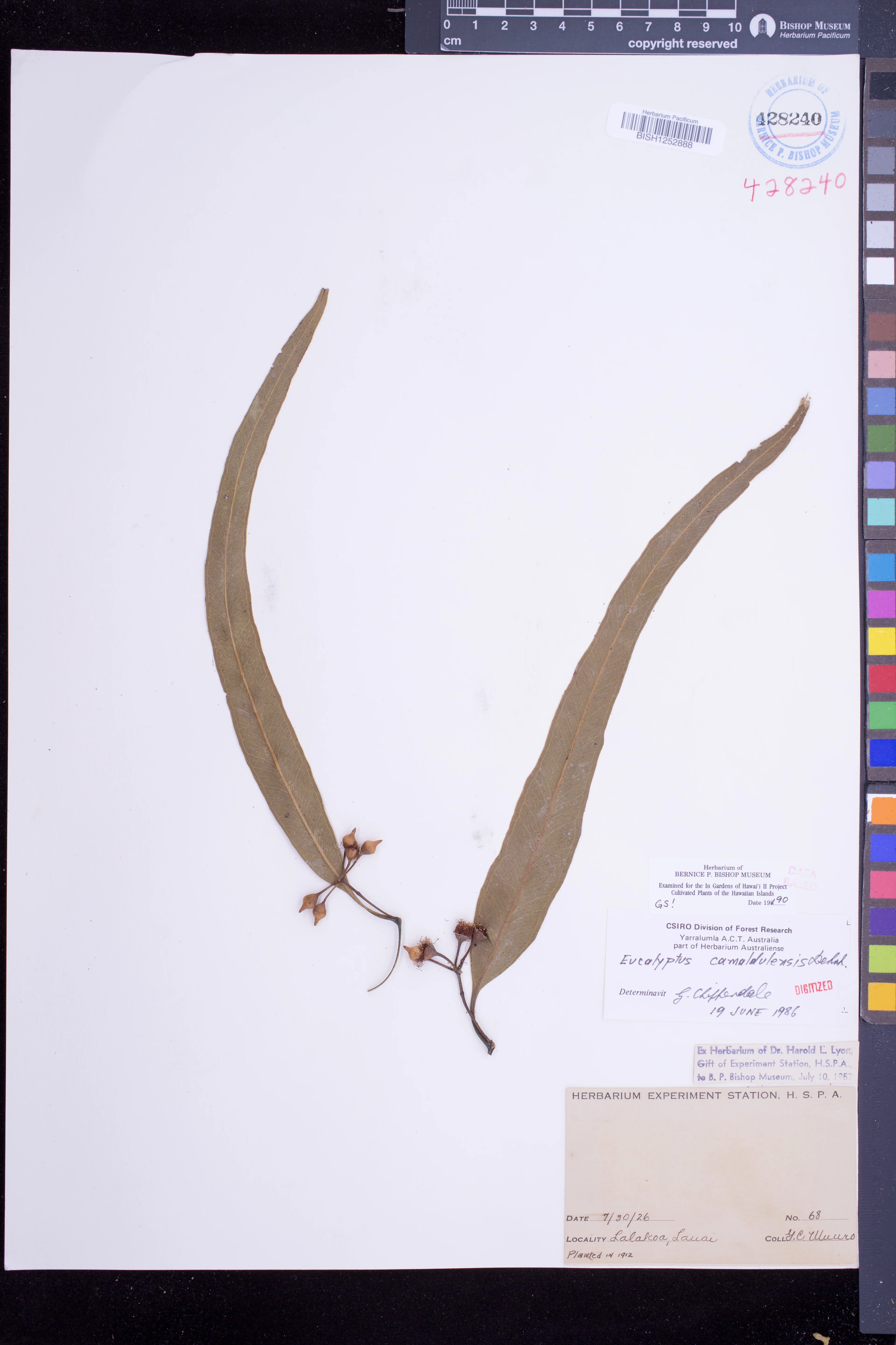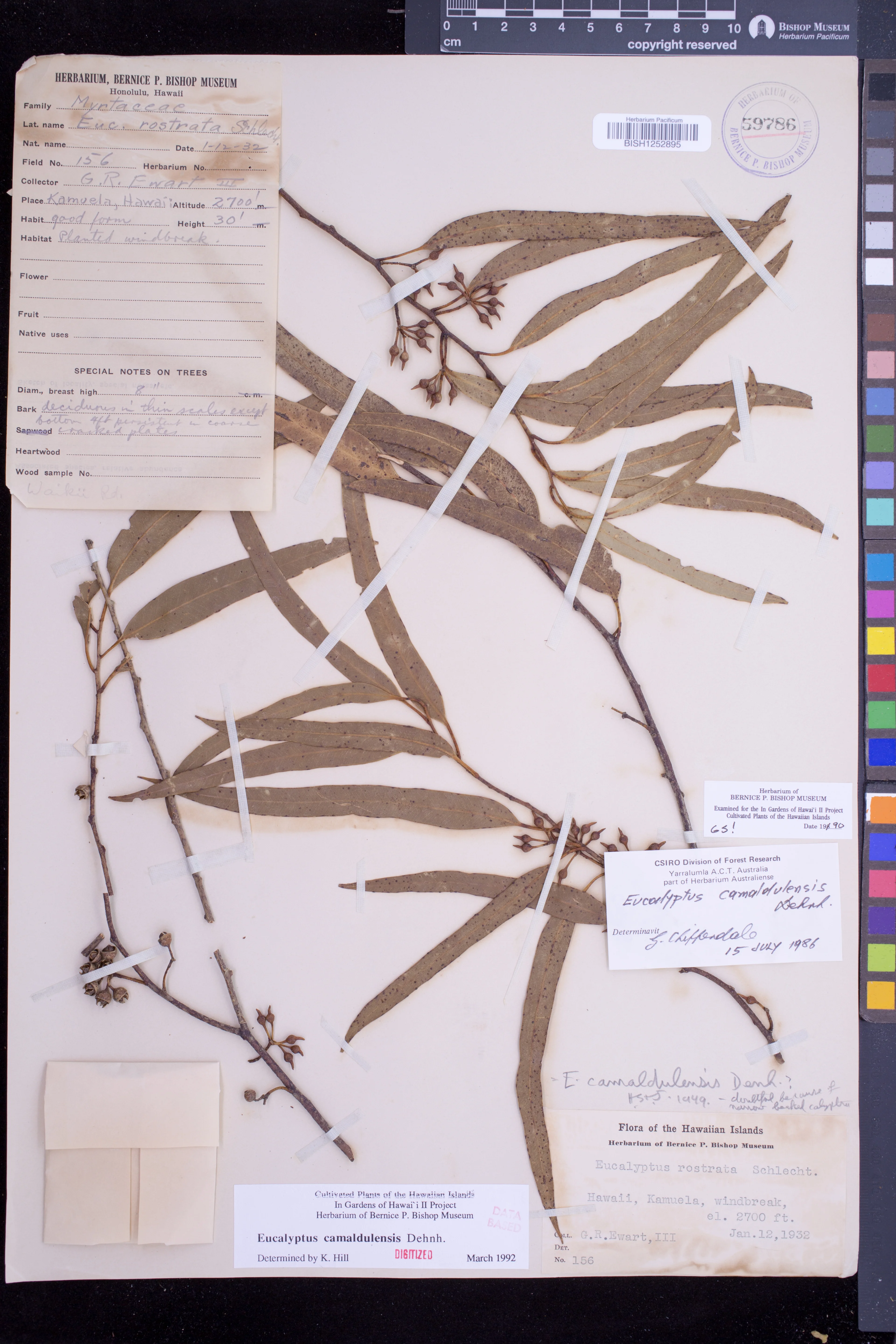 | 2 | Eucalyptus camaldulensis | Dehnh. | Kamuela, windbreak | Planted windbreak | PRESERVED_SPECIMEN | Ewart III, G.R. | 156 | Hawaii | BISH | 1/12/1932 |
