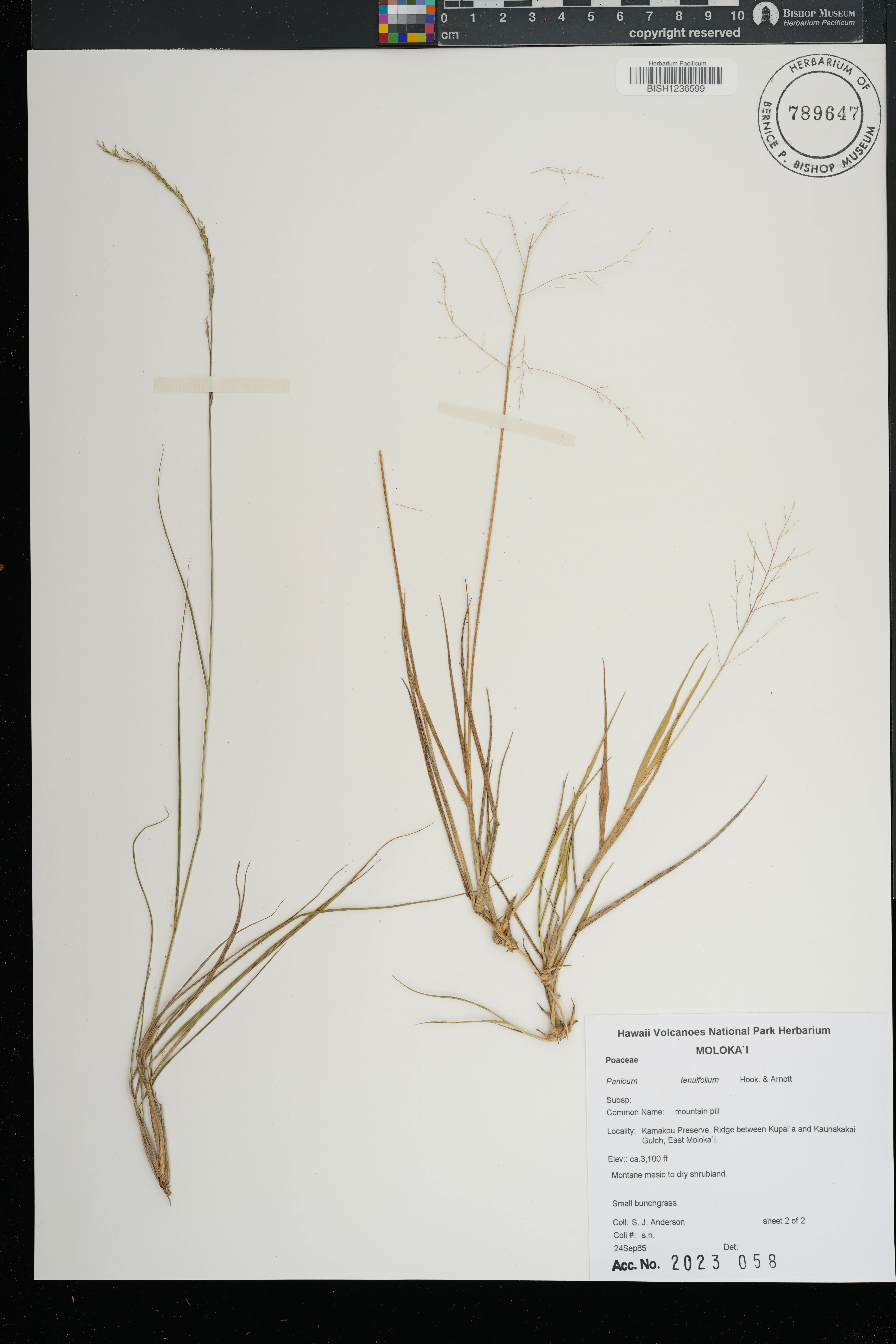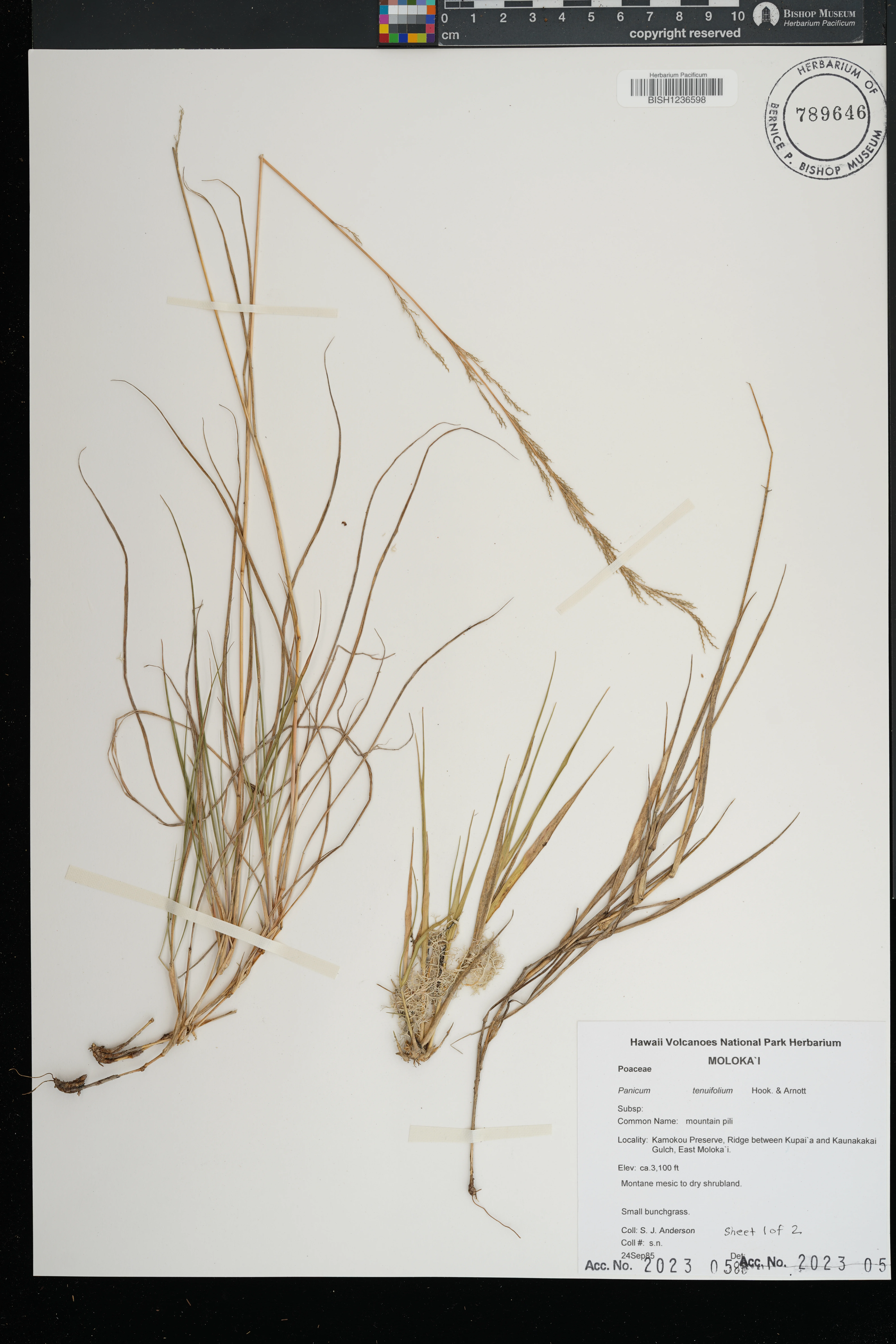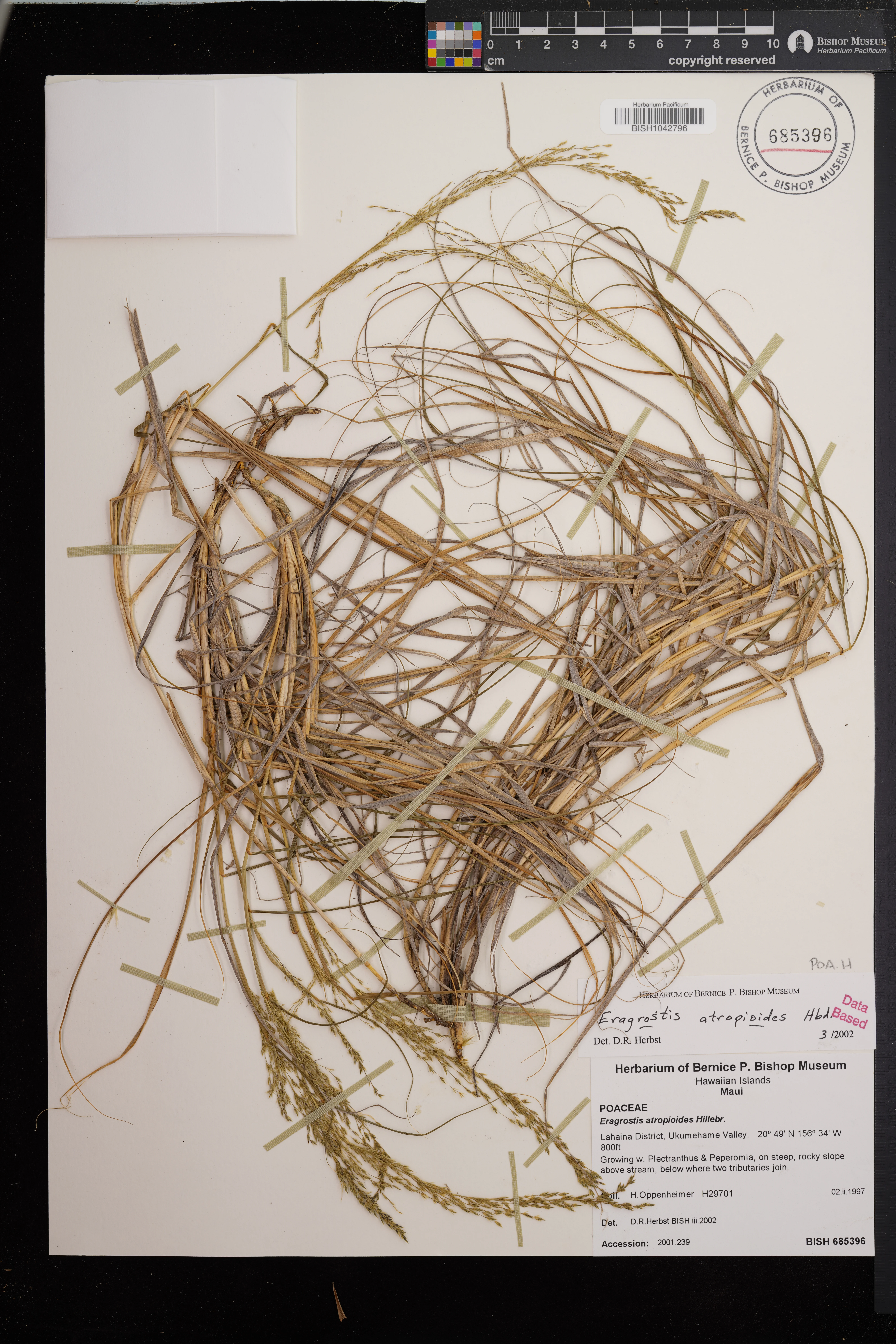 On dry streambed with Anthoxanthum and Setaria under Osmanthus, Dodonaea, and Styphelia. |