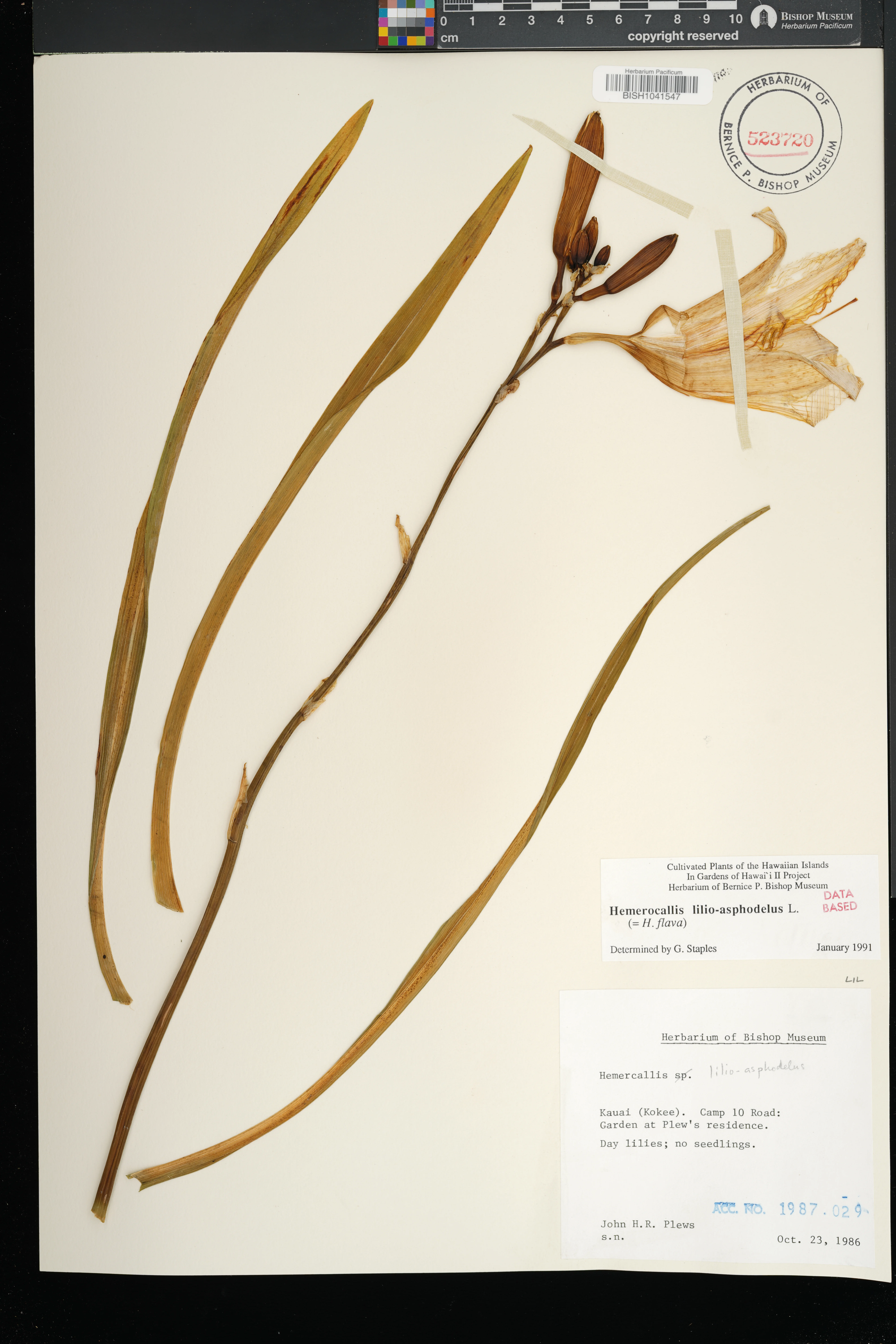 | 8 | Hemerocallis lilioasphodelus | L. | Kokee; Camp 10 road, Plew's residence | Garden. | PRESERVED_SPECIMEN | Plews, J.H.R. | s.n. | Kauai | BISH | 10/23/1986 |