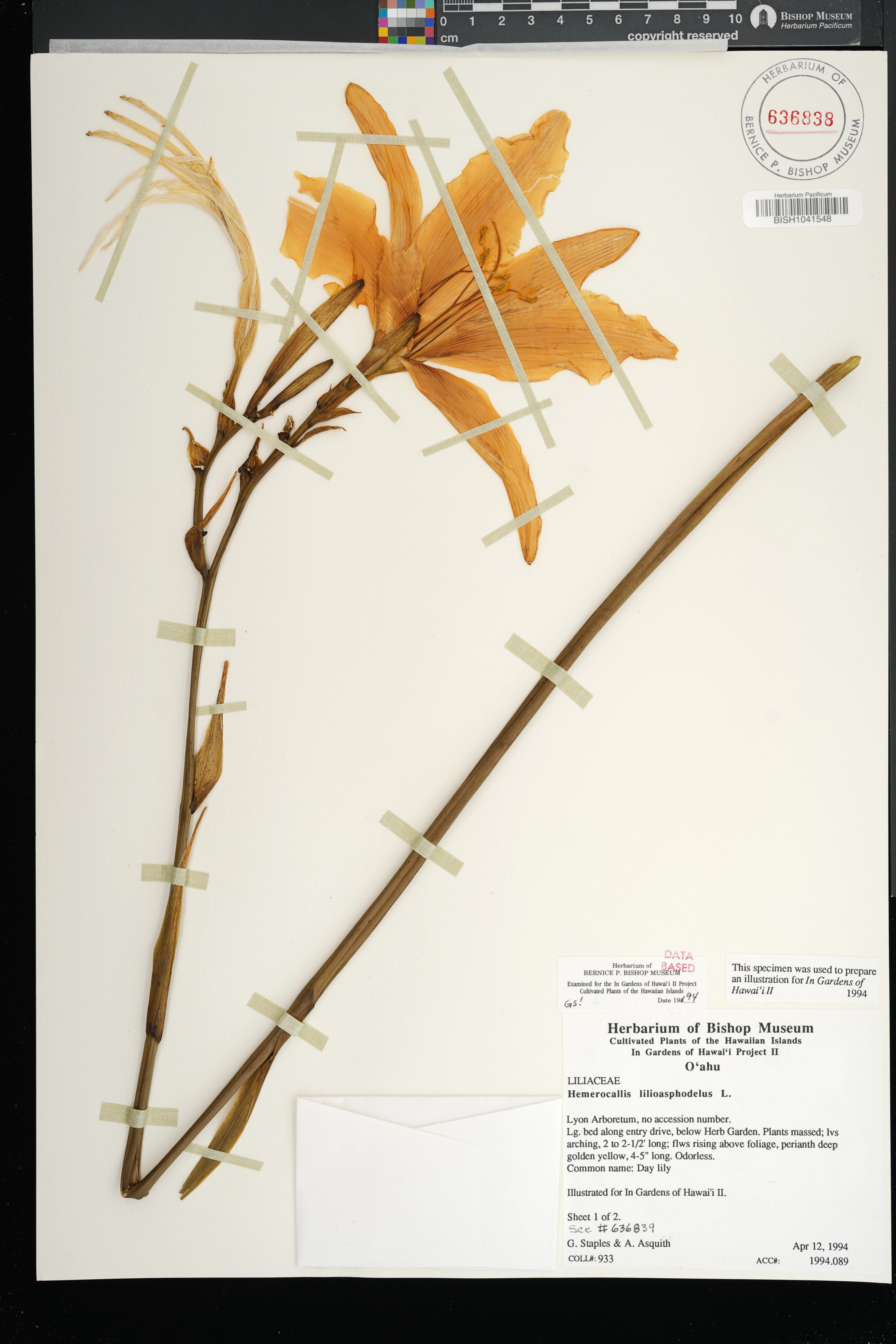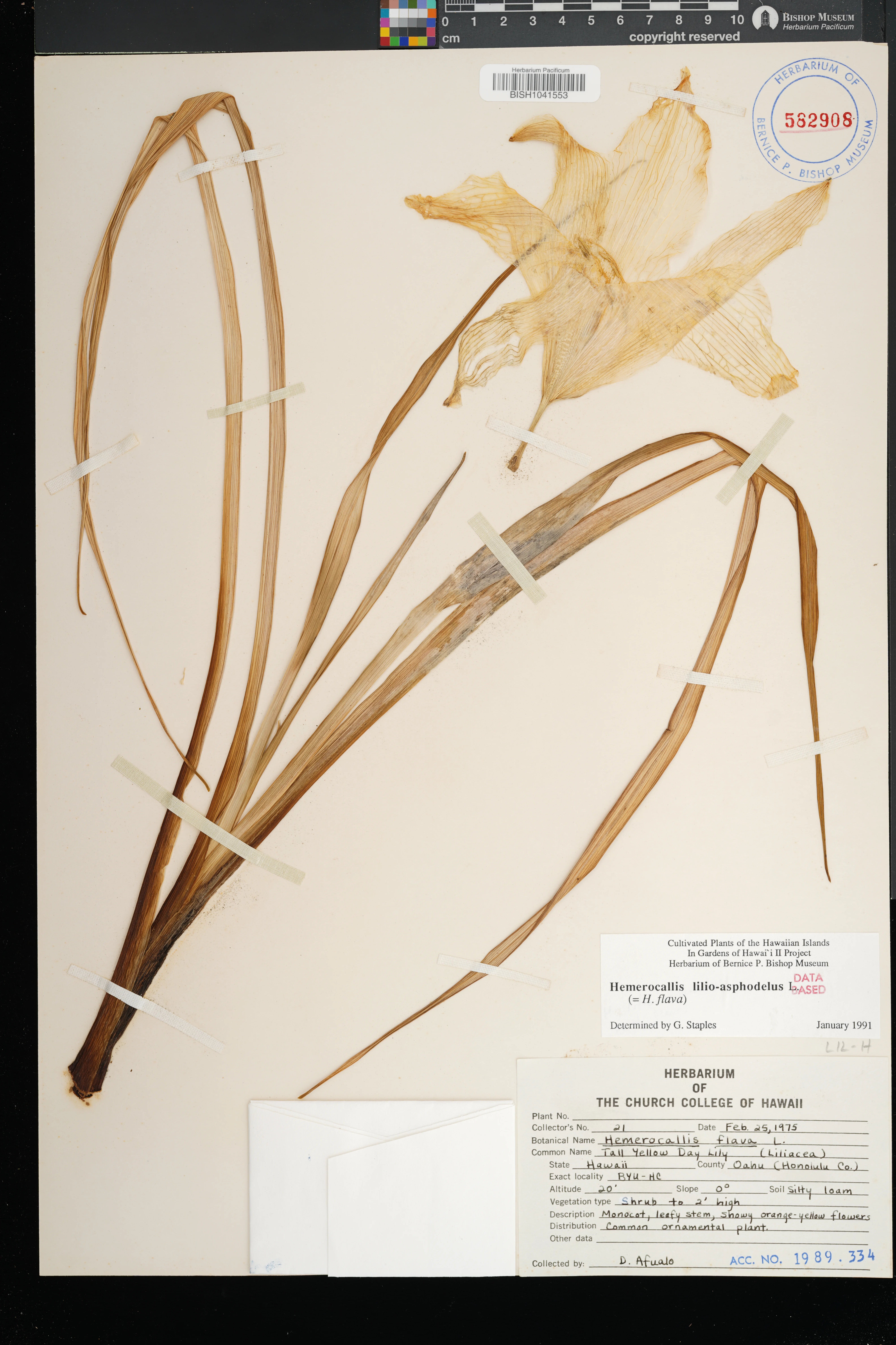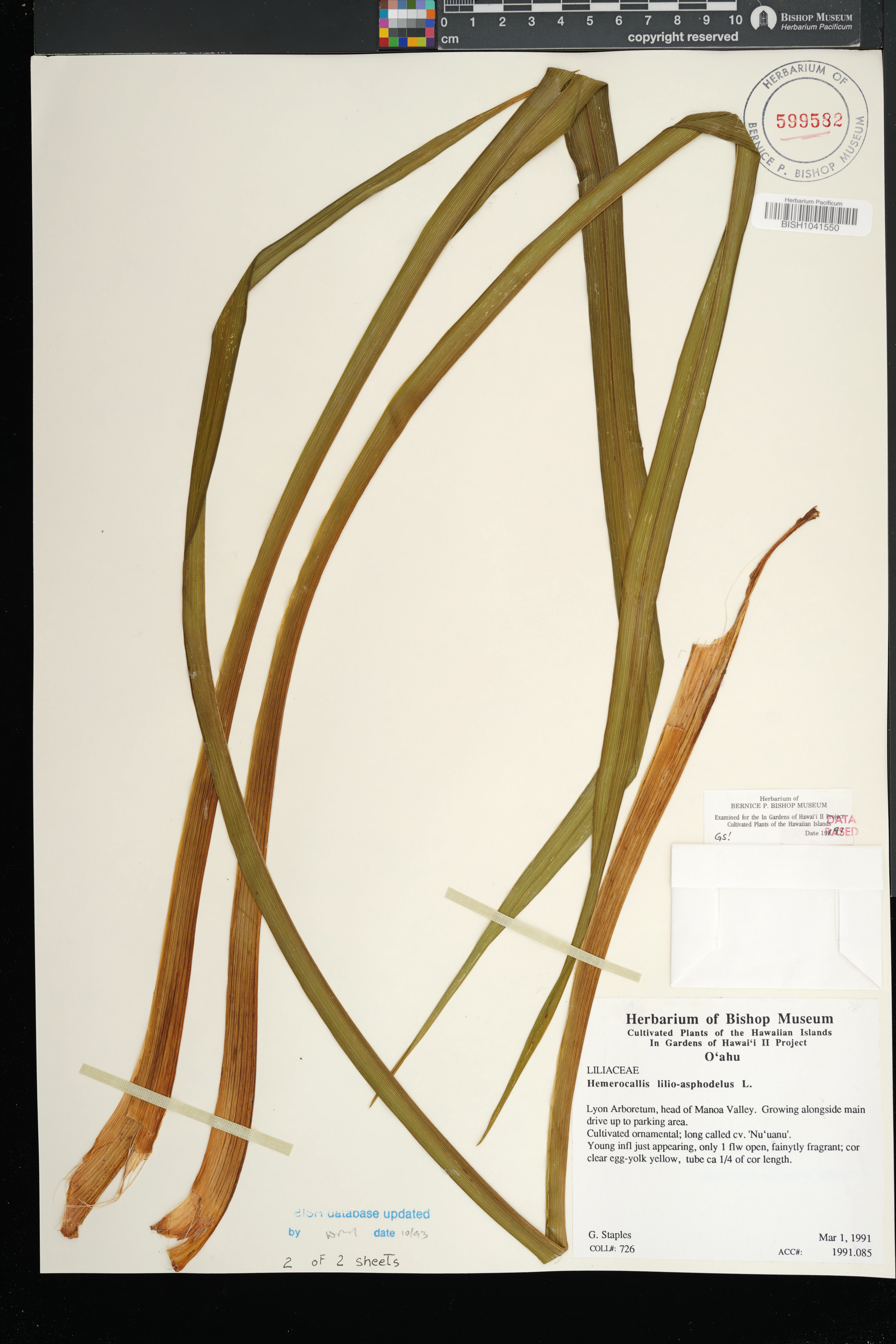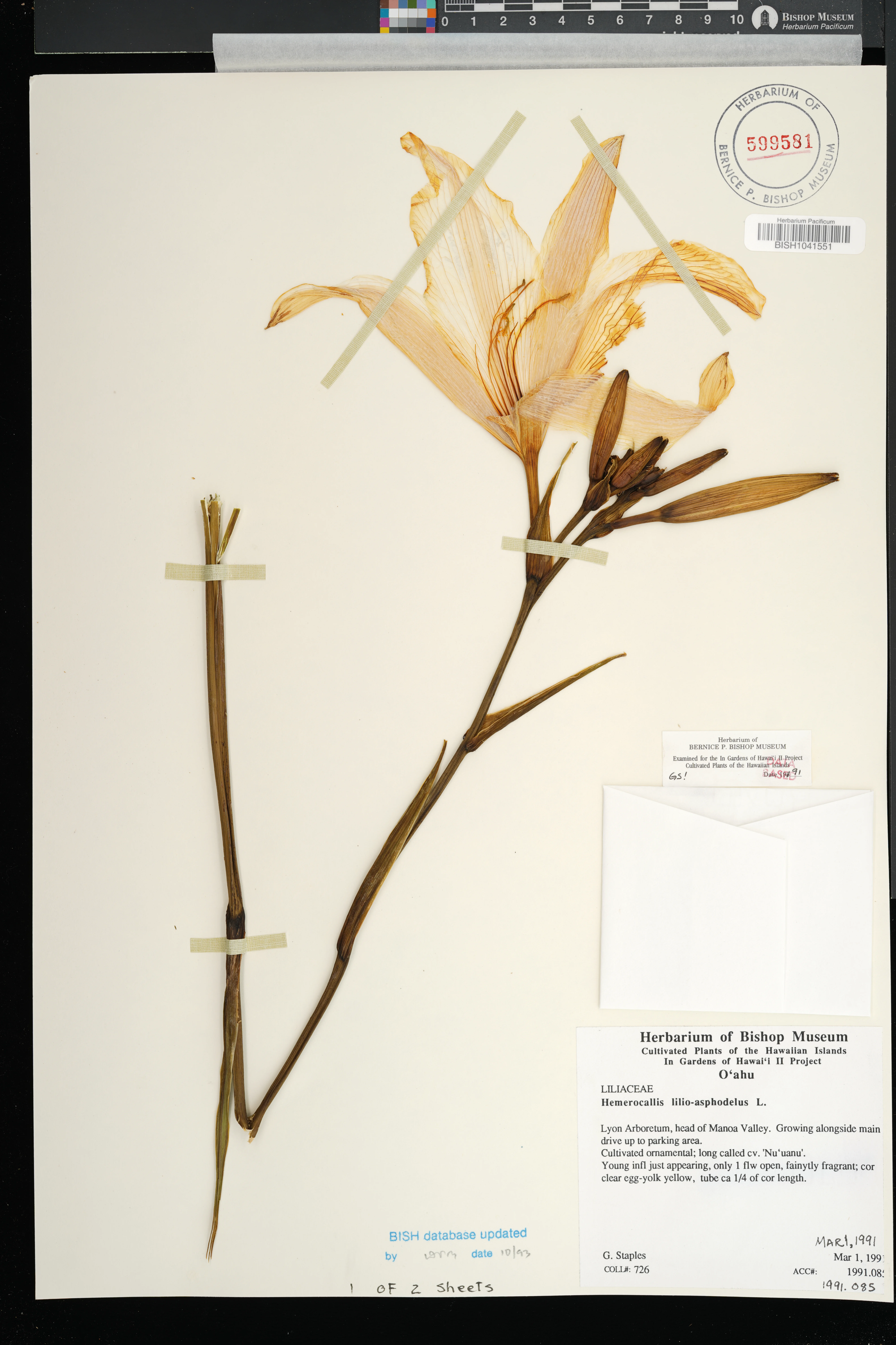 | 7 | Hemerocallis lilioasphodelus | L. | Lyon Arboretum; large bed along entry drive, below Herb garden | PRESERVED_SPECIMEN | Staples, G. | 933 | Oahu | BISH | 4/12/1994 | |