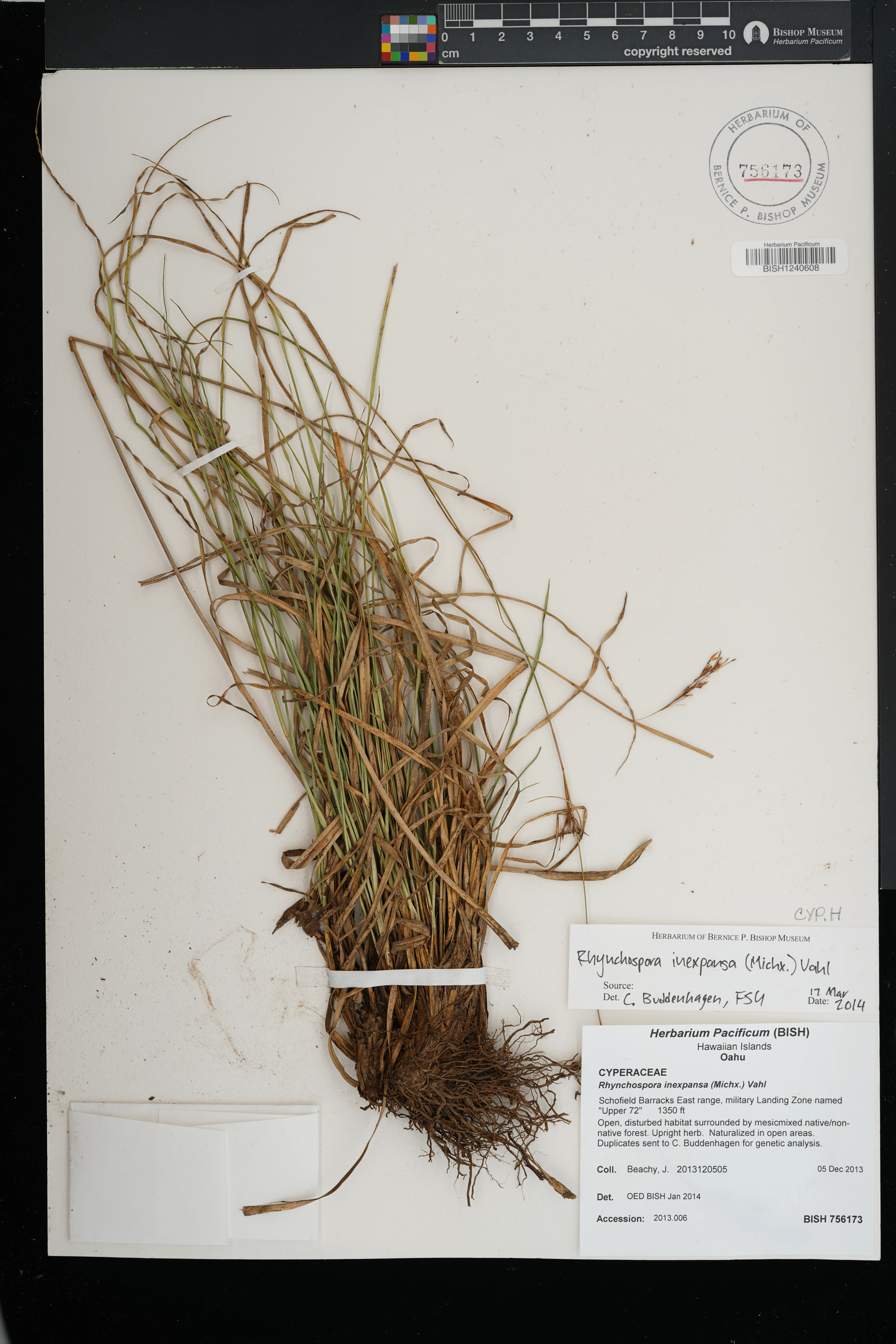 | 3 | Rhynchospora inexpansa | (Michx.) Vahl | Schofield Barracks East range, military Landing Zone named "Upper 72" | Open, disturbed habitat surrounded by mesicmixed native/non-native forest. | PRESERVED_SPECIMEN | Beachy, J. | 2013120505 | Oahu | BISH | 12/5/2013 |