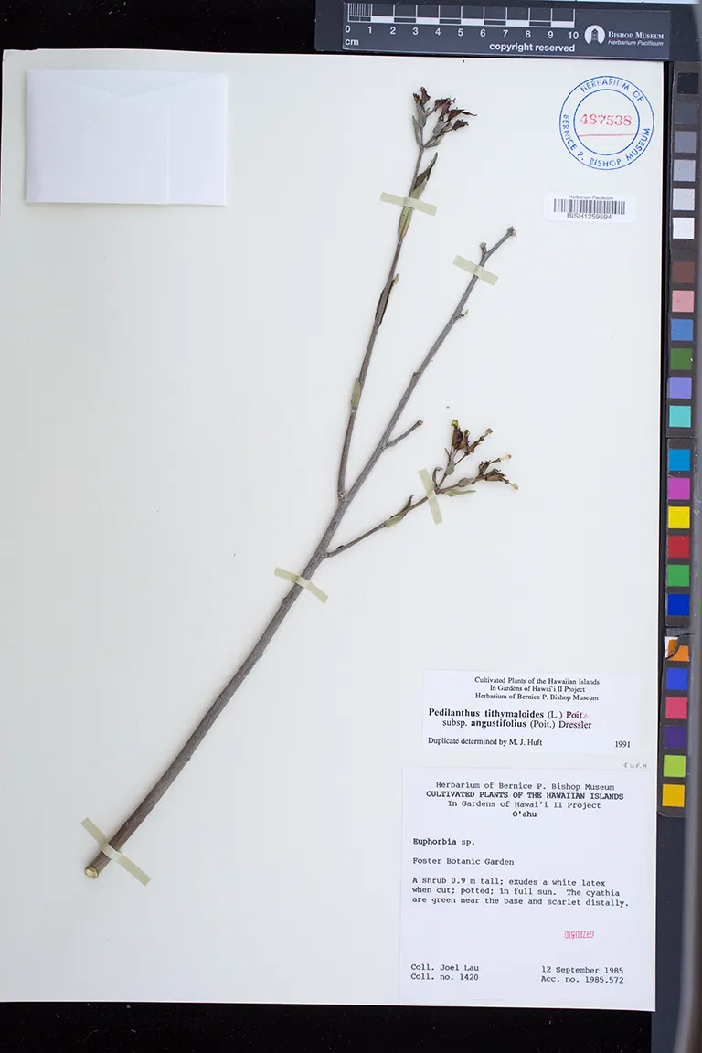 | 2 | Euphorbia tithymaloides subsp. angustifolia | (Poit.) V.W.Steinm. | Foster Botanic Garden | potted, full sun | PRESERVED_SPECIMEN | Lau, J. | 1420 | Oahu | BISH | 9/12/1985 |