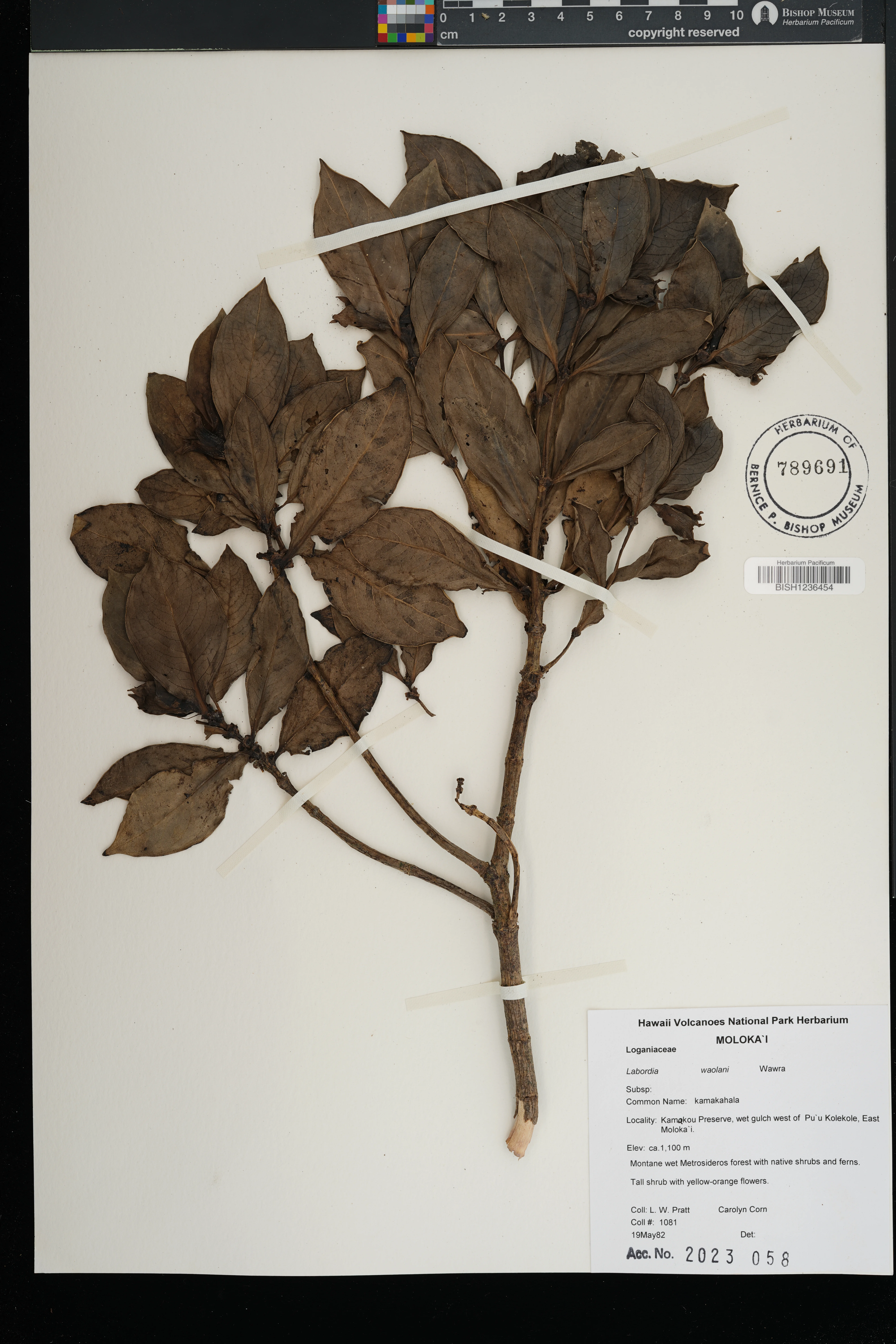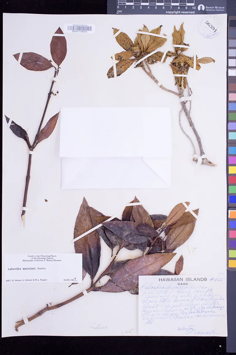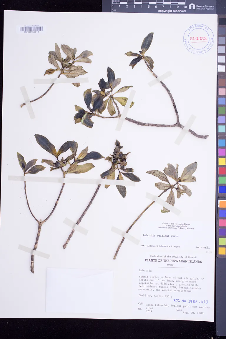 Growing on side of ridge with Gouldia spp., Straussia spp., Wikstroemia oahuensis, Smilax sandwicensis, etc. |