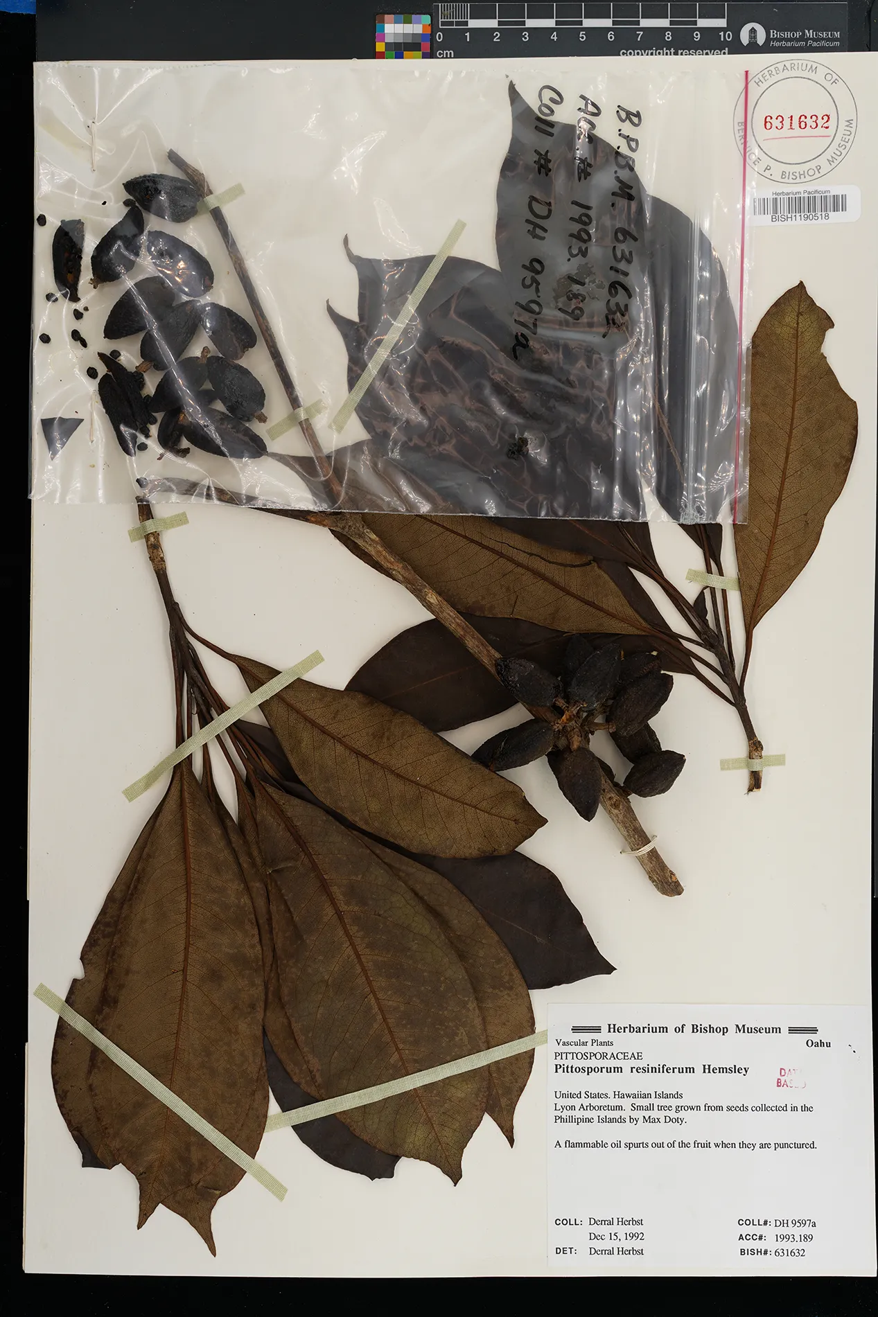 | 1 | Pittosporum resiniferum | Hemsl. | lyon arboretum | PRESERVED_SPECIMEN | herbst, d.r. | collector number: 9597a | Oahu | BISH | 12/15/1992 | |