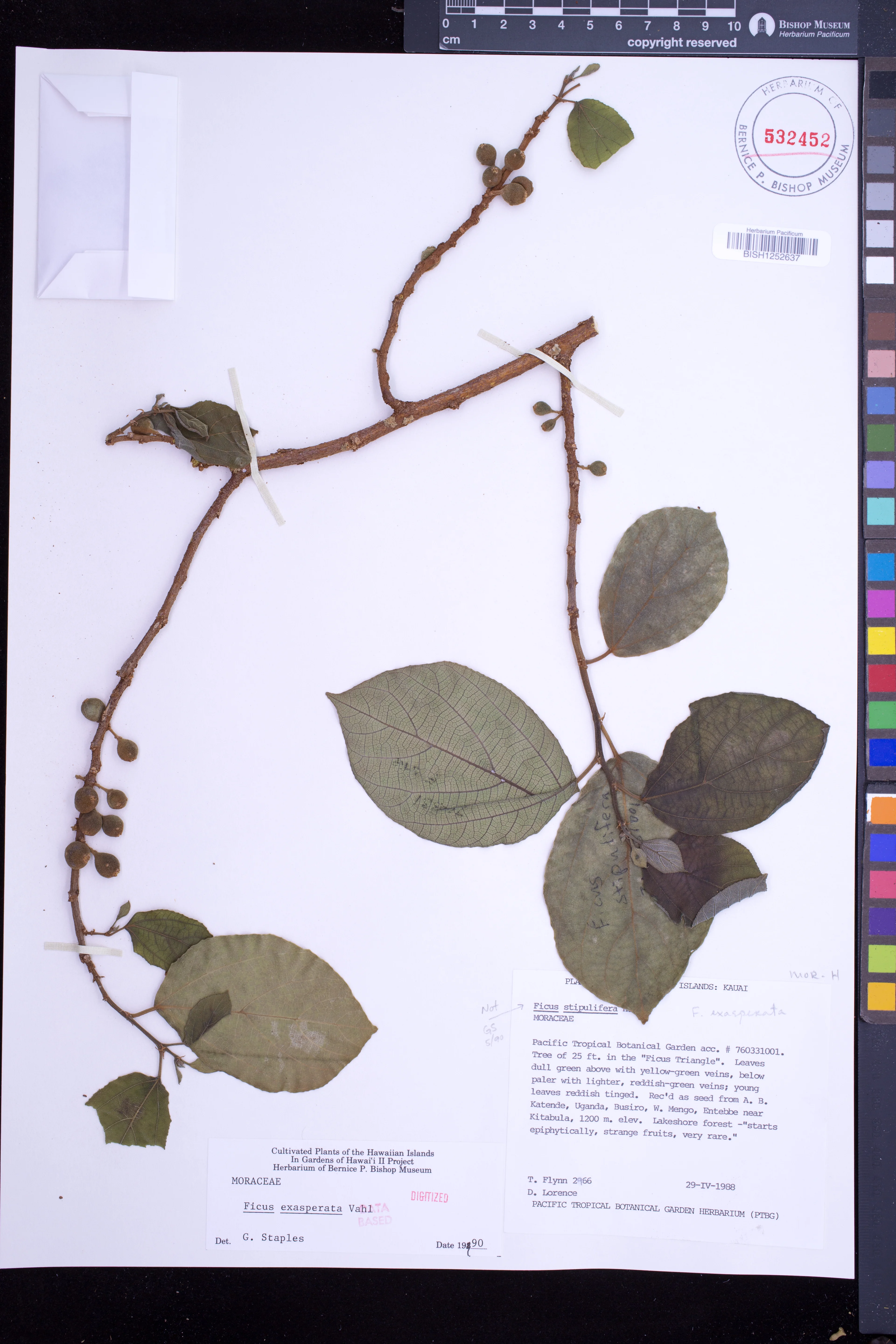 | 2 | Ficus exasperata | Vahl | Lawai Valley. National Tropical Botanical Garden, Ficus Triangle. | Cultivated. | PRESERVED_SPECIMEN | Tim Flynn | 2966 | Kauai | PTBG | 4/29/1988 |