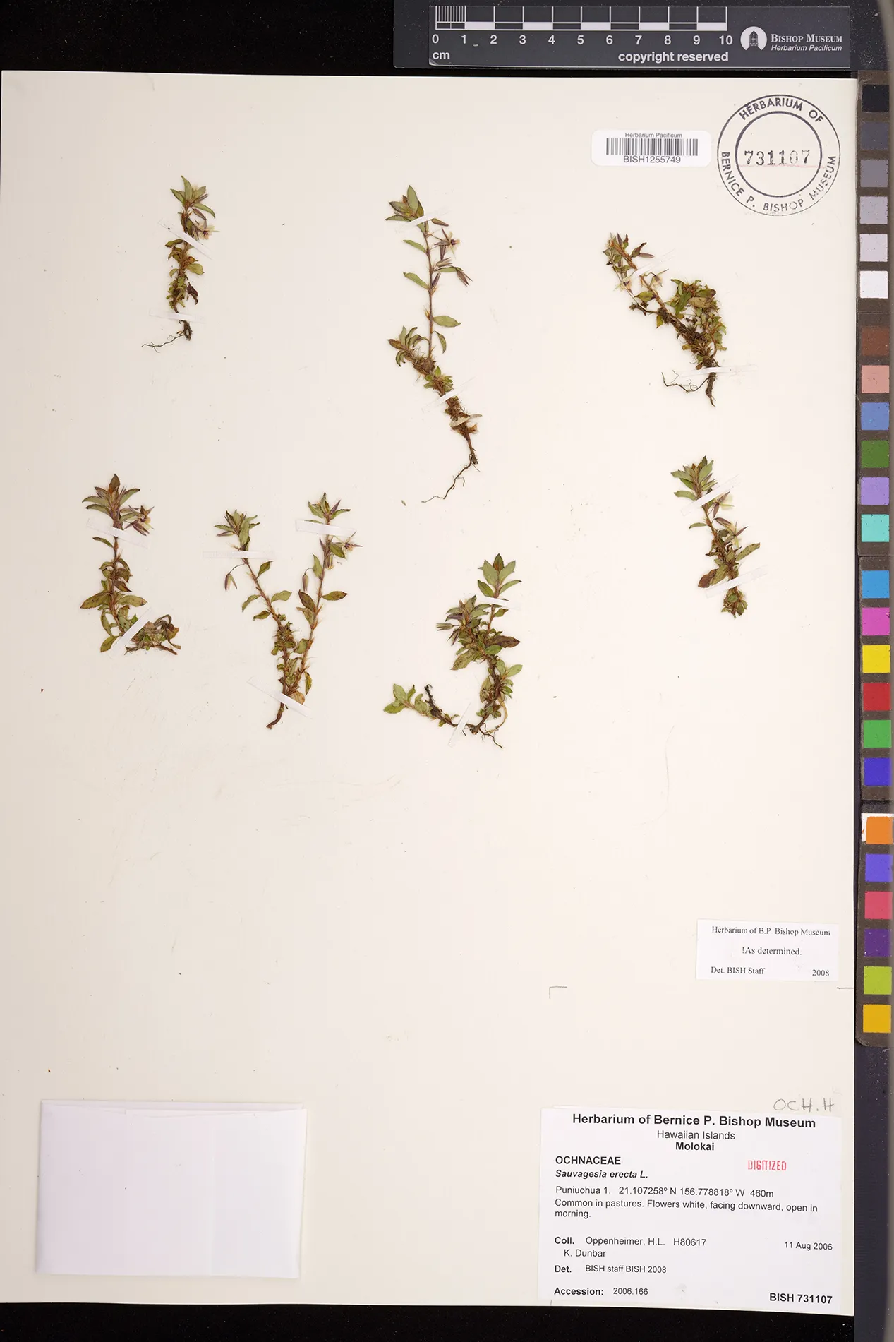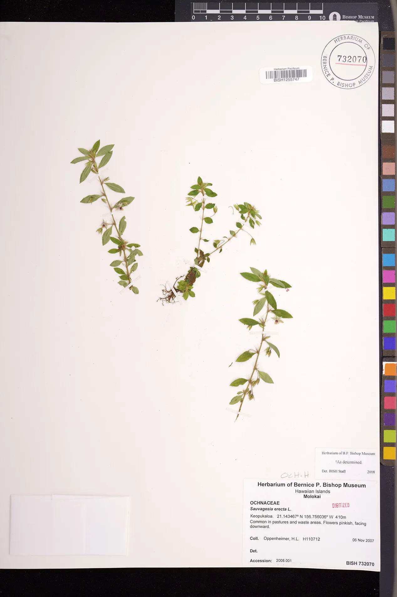 | 11 | Sauvagesia erecta | L. | Keopukaloa | Common in pastures and waste areas. | PRESERVED_SPECIMEN | Oppenheimer, H.L. | Collector Number: H110712 | Molokai | BISH | 11/6/2007 |