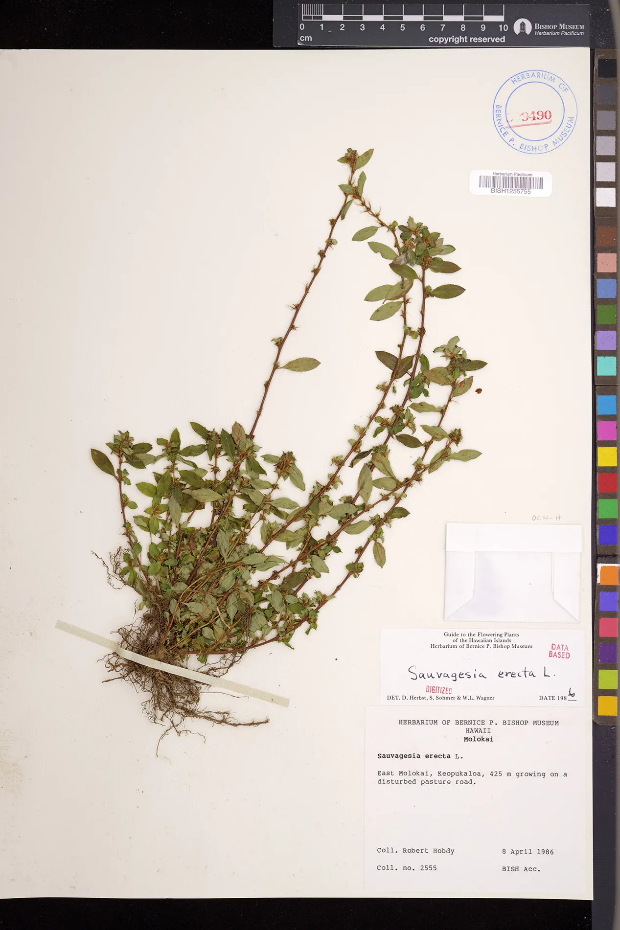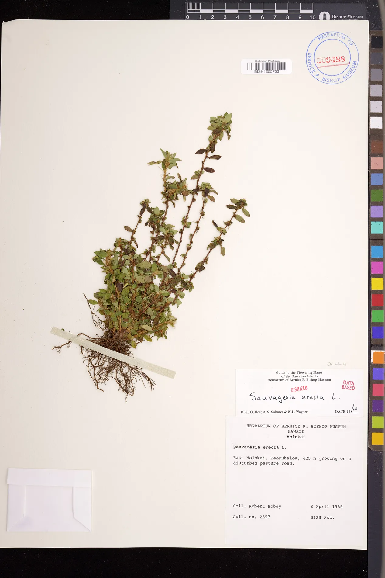 | 5 | Sauvagesia erecta | L. | east island, keopukaloa | disturbed pasture road | PRESERVED_SPECIMEN | hobdy, r.w. | collector number: 2557 | Molokai | BISH | 4/8/1986 |