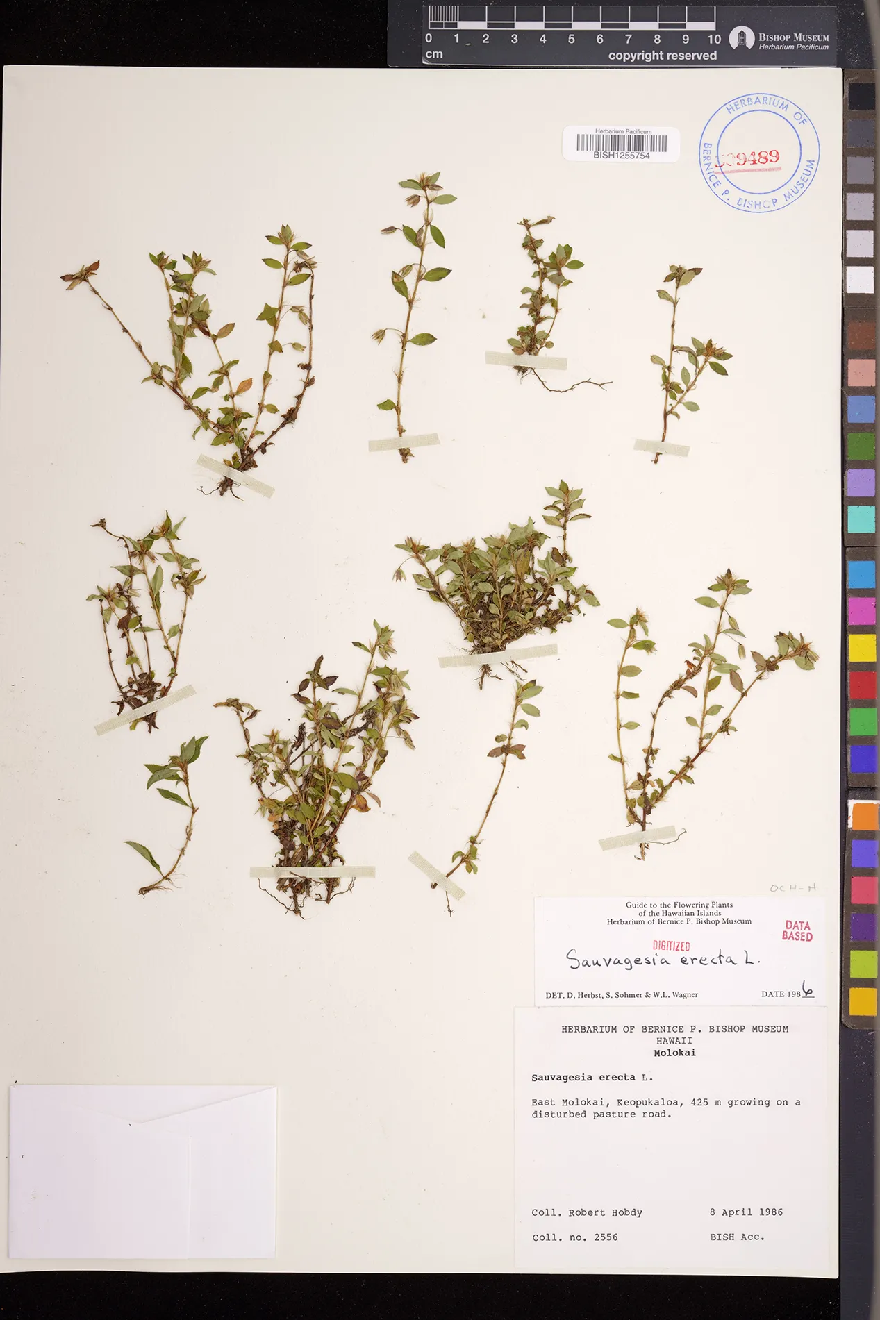 | 8 | Sauvagesia erecta | L. | east island, keopukaloa | disturbed pasture road | PRESERVED_SPECIMEN | hobdy, r.w. | collector number: 2560 | Molokai | BISH | 4/8/1986 |