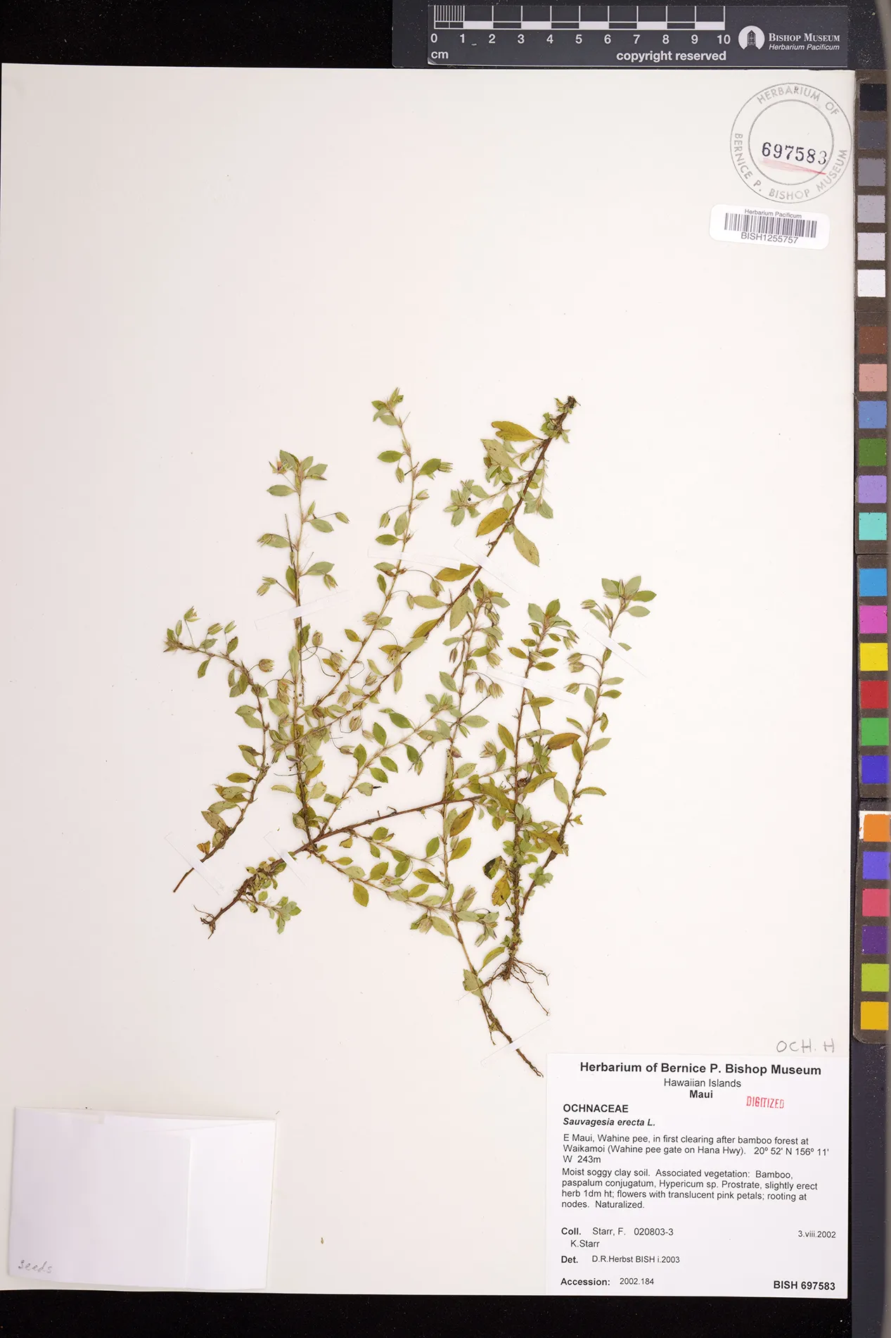 | 32 | Sauvagesia erecta | L. | East Maui, Wahine pee, in first clearing after bamboo forest at Waikamoi (Wahine pee gate on Hana Hwy) | Moist soggy clay soil. Associated vegetation: Bamboo, Paspalum conjugatum, Hypericum sp. | PRESERVED_SPECIMEN | Starr, F. | 020803-3 | Maui | BISH | 8/3/2002 |
