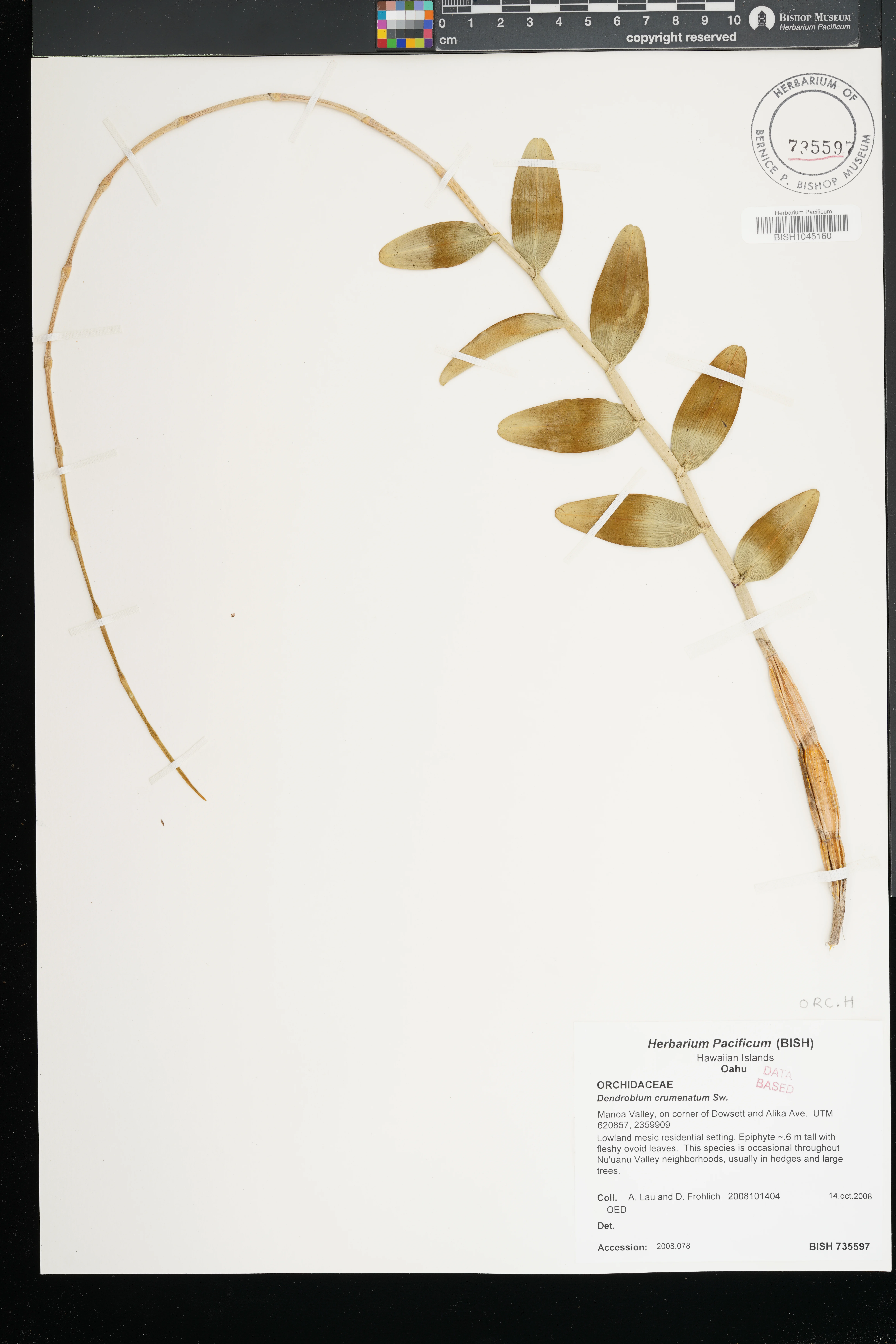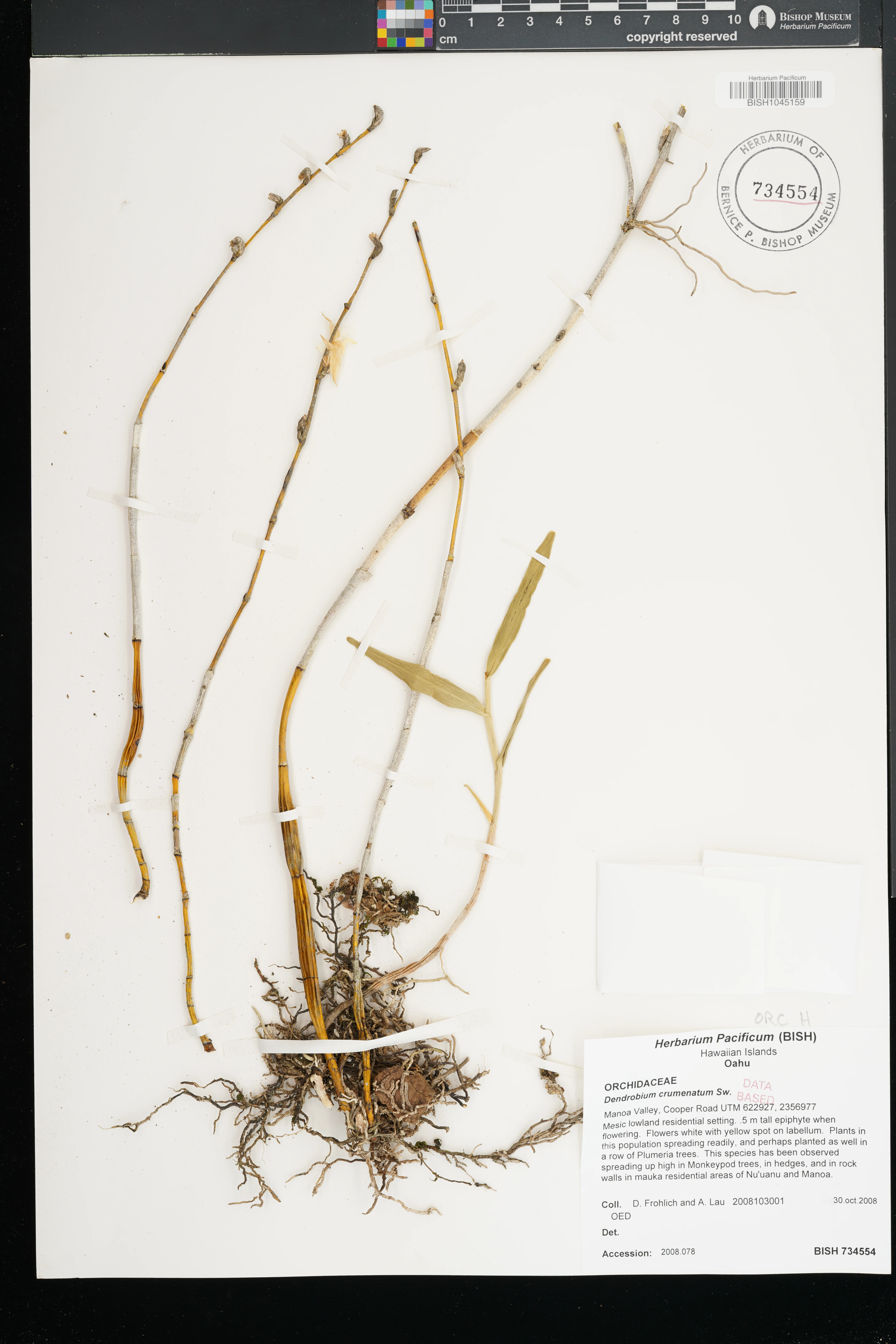 | 7 | Dendrobium crumenatum | Sw. | manoa valley, cooper road utm 622927, 2356977 | Mesic lowland residential setting. | PRESERVED_SPECIMEN | oed frohlich, d.; lau, a. | collector number: 2008103001 | Oahu | BISH | 10/30/2008 |