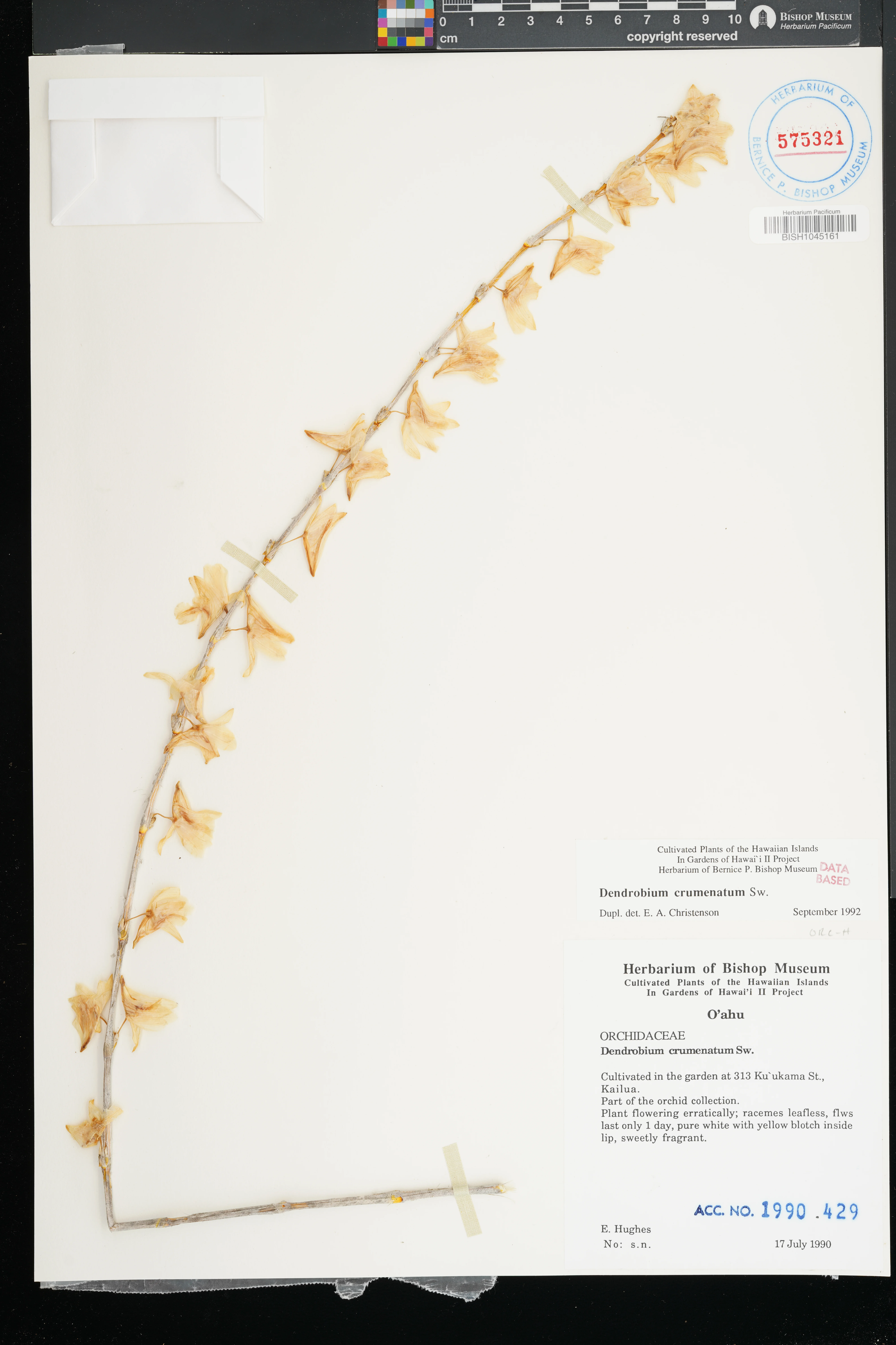 | 5 | Dendrobium crumenatum | Sw. | cultivated in the garden at 313 kuukama street, kailua | PRESERVED_SPECIMEN | hughes, e. | collector number: s.n. | Oahu | BISH | 7/17/1990 | |