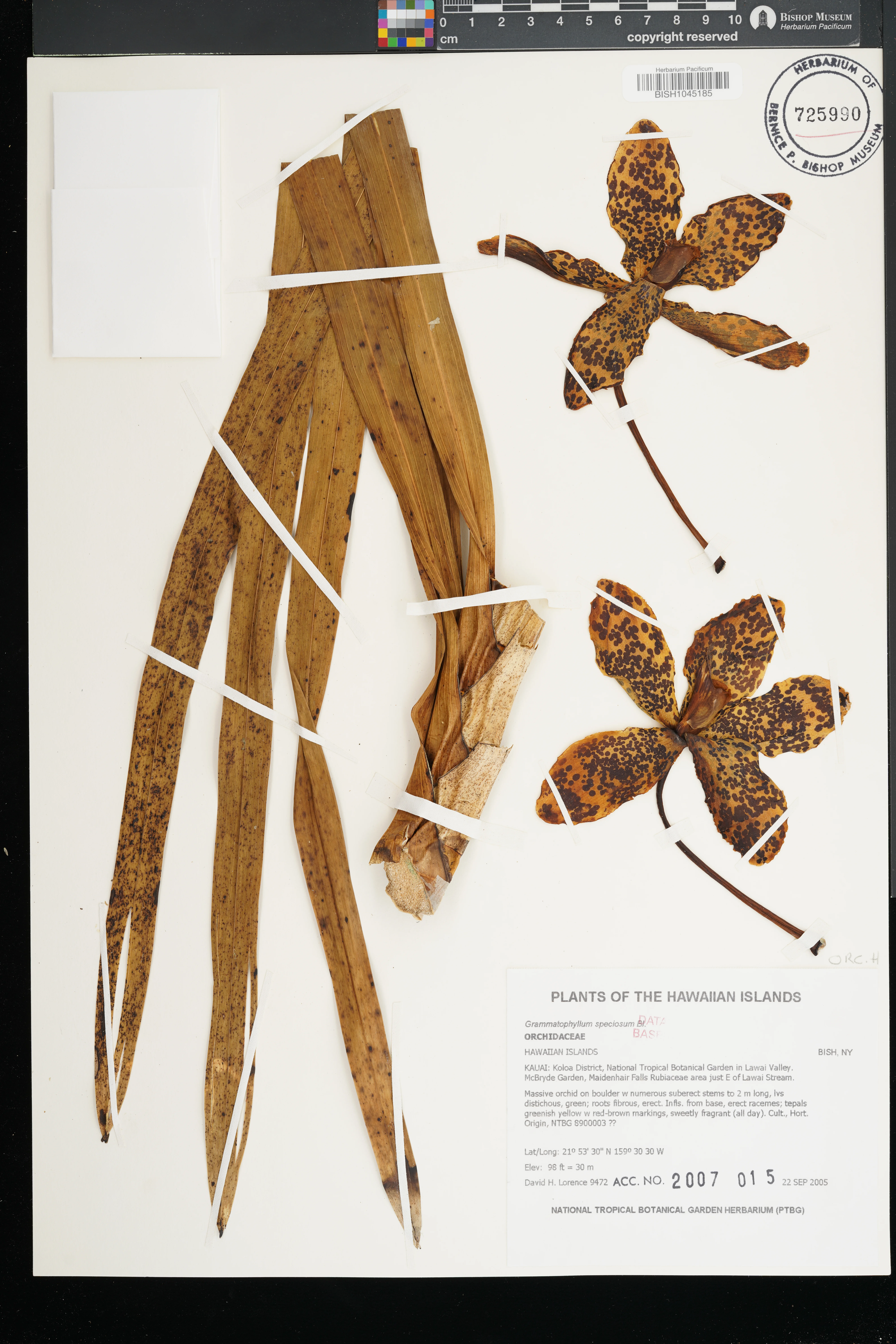 | 2 | Grammatophyllum speciosum | Blume | Koloa, Lawai Valley, NTBG, McBryde Garden, Maidenhair Falls, E of Lawai Stream | on boulder | PRESERVED_SPECIMEN | Lorence, D.H. | Collector Number: 9472 | Kauai | BISH | 9/22/2005 |