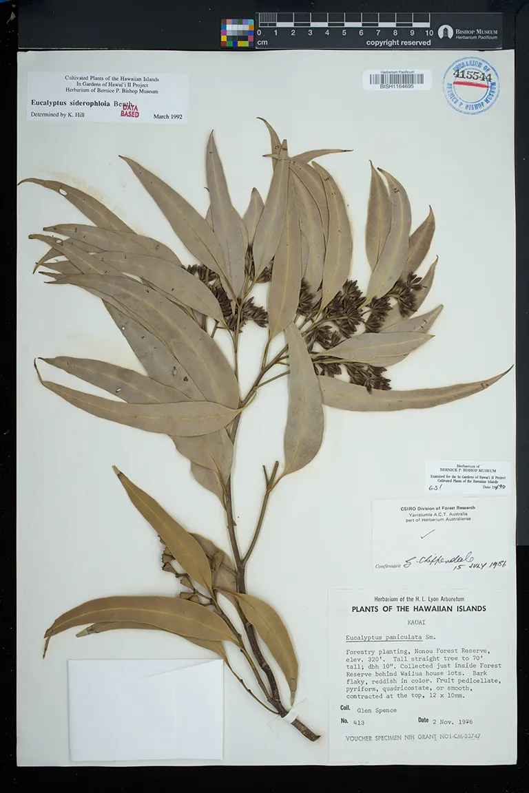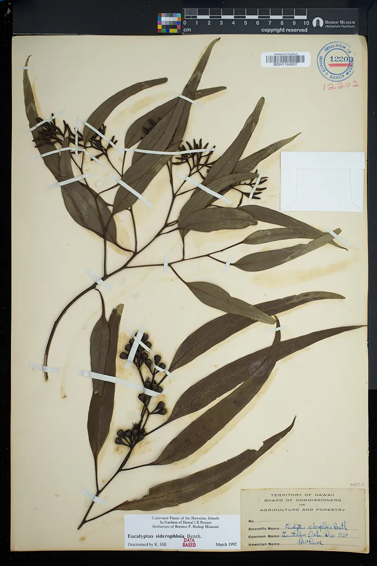 | 7 | Eucalyptus siderophloia | Benth. | tantalus | PRESERVED_SPECIMEN | j. f. rock | 6031 | Oahu | US | 8/8/1909 | |
