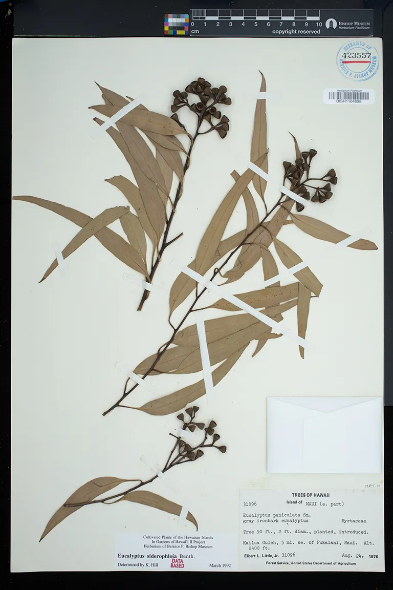 | 5 | Eucalyptus siderophloia | Benth. | East Maui, Kailua Gulch, 5 miles SE of Pukalani | Planted, introduced. | PRESERVED_SPECIMEN | Little Jr., E.L. | 31096 | Maui | BISH | 8/24/1976 |
