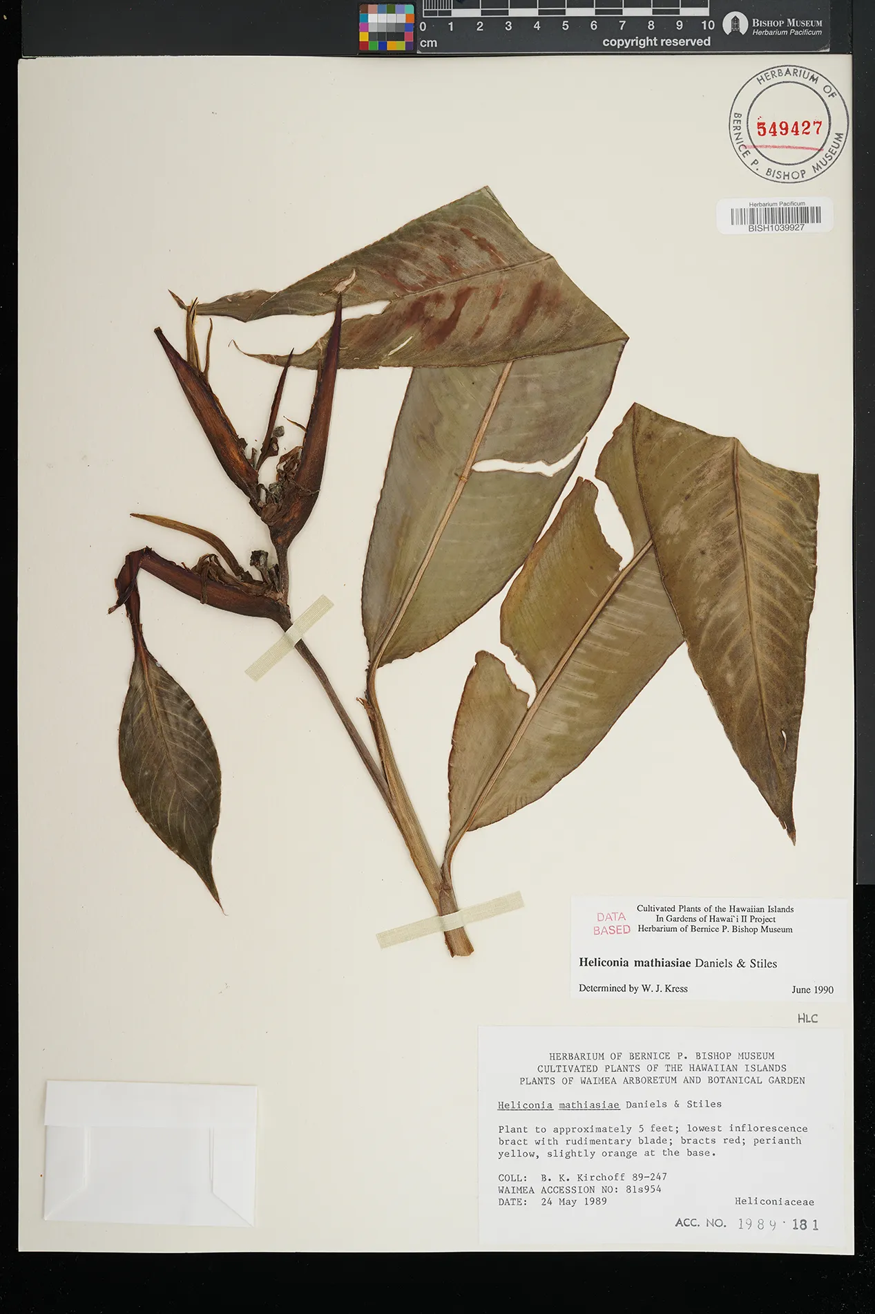 | 2 | Heliconia mathiasiae | Waimea Arboretum & Botanical Garden | Preserved_Specimen | Plant to approximately 5 ft; lowest inflorescence bract w. rudimentary blade; bracts red; perianth yellow, slightly orange at the base. | Kirchoff, B.K. | 89247 | Kauai | BISH | 1989-05-24 |