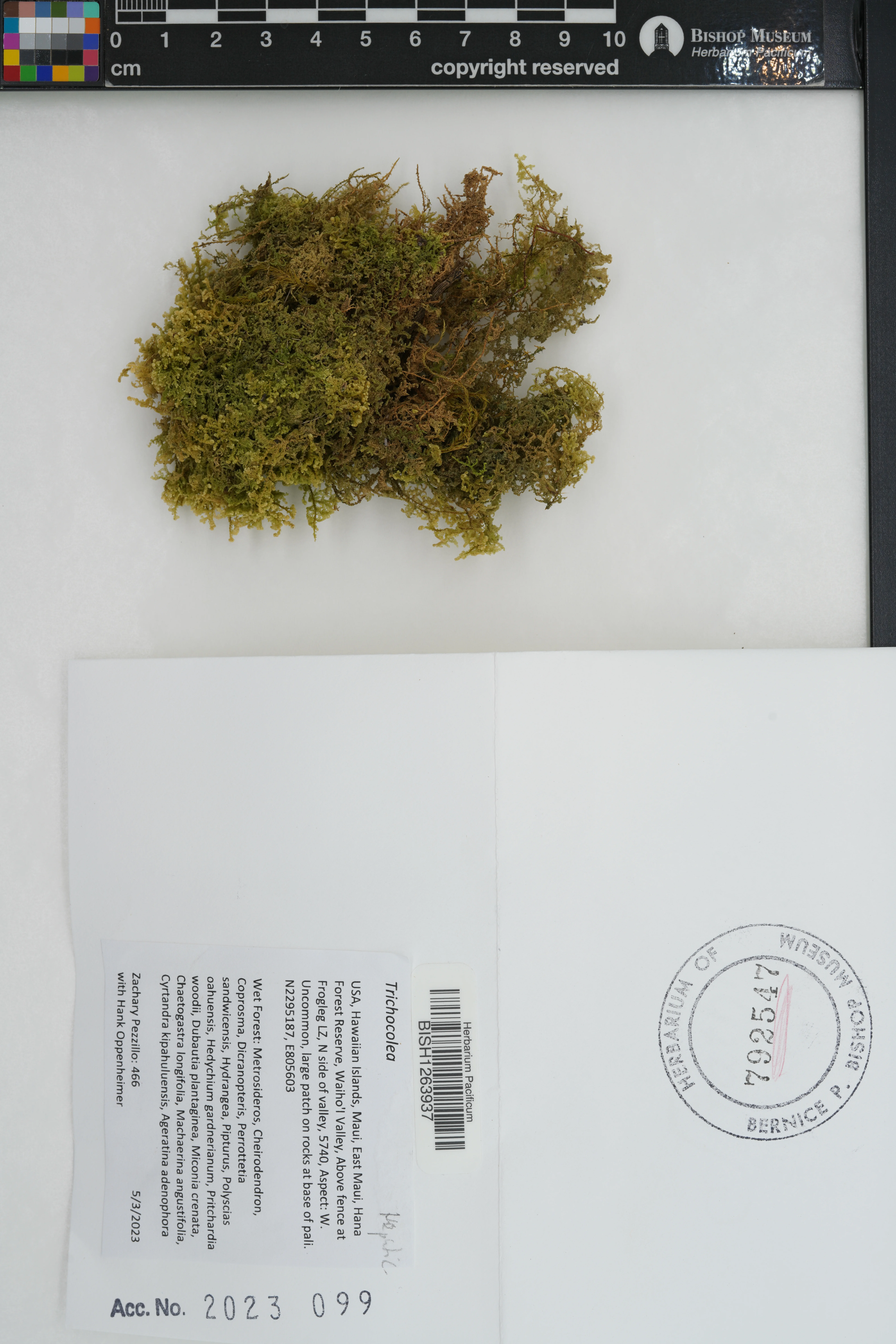 Kingdom: Viridiplantae Phylum: Marchantiophyta Class/Clade: Jungermanniopsida Order: Jungermanniales Family: Trichocoleaceae Genus: Trichocolea