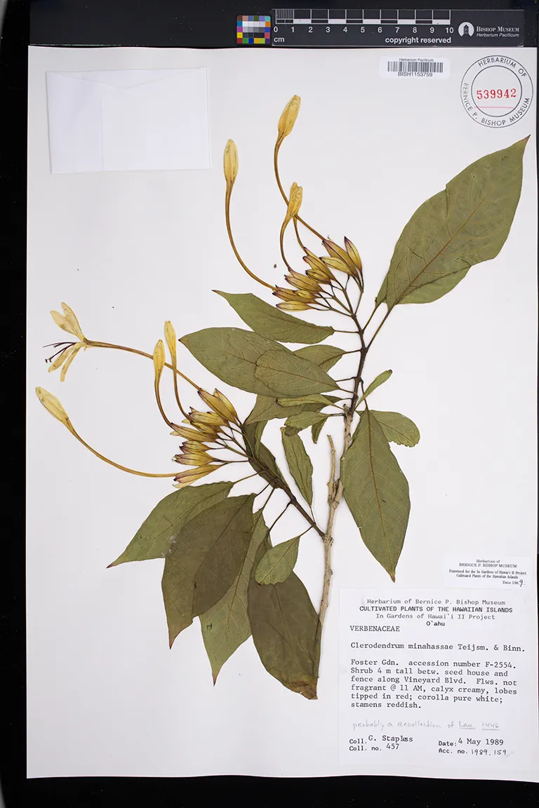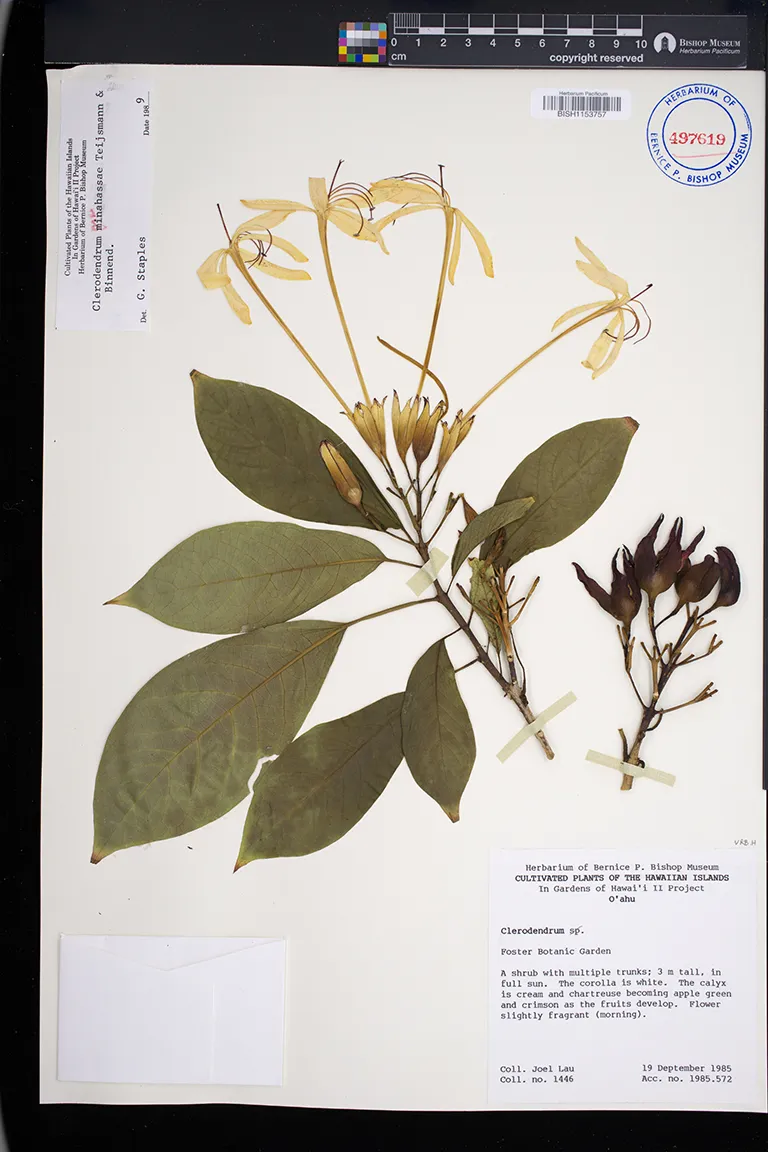 | 4 | Clerodendrum minahassae | Teijsm. & Binn. | Foster Botanic Garden, betw. seed house and fence along Vineyard Blvd | PRESERVED_SPECIMEN | Staples, G. | 457 | Oahu | BISH | 5/4/1989 | |