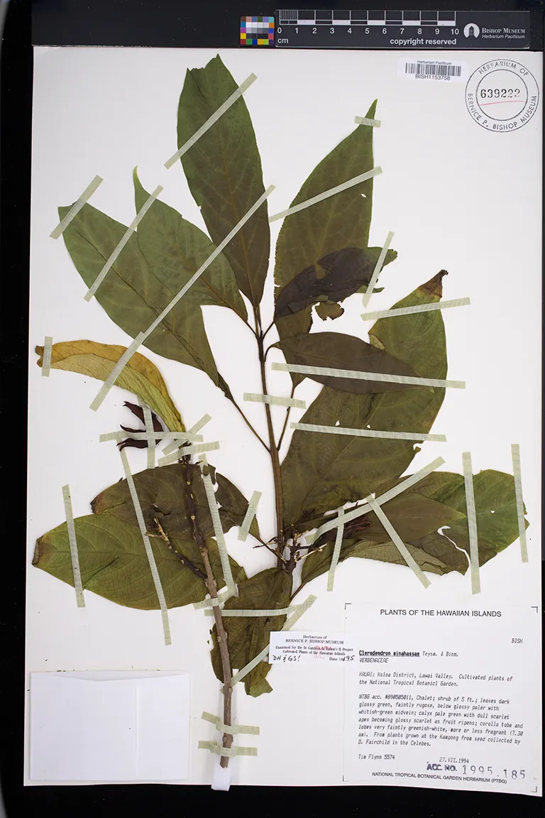 | 5 | Clerodendrum minahassae | Teijsm. & Binn. | Koloa, Lawai Valley, National Tropical Botanical Garden; Chalet | PRESERVED_SPECIMEN | Flynn, T. | 5574 | Kauai | BISH | 7/27/1994 | |
