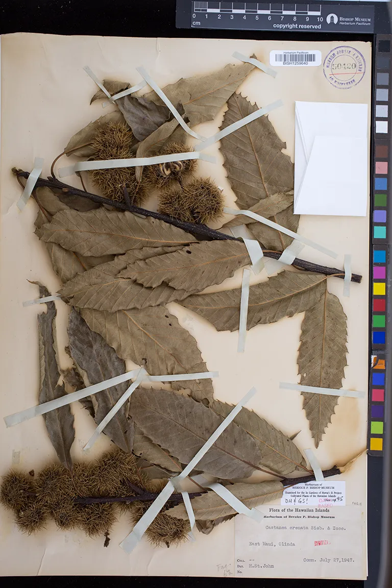 | 7 | Castanea crenata | Siebold & Zucc. | Grove Farm | PRESERVED_SPECIMEN | Duvel, A. | s.n. | Kauai | BISH | 2/27/1926 | |