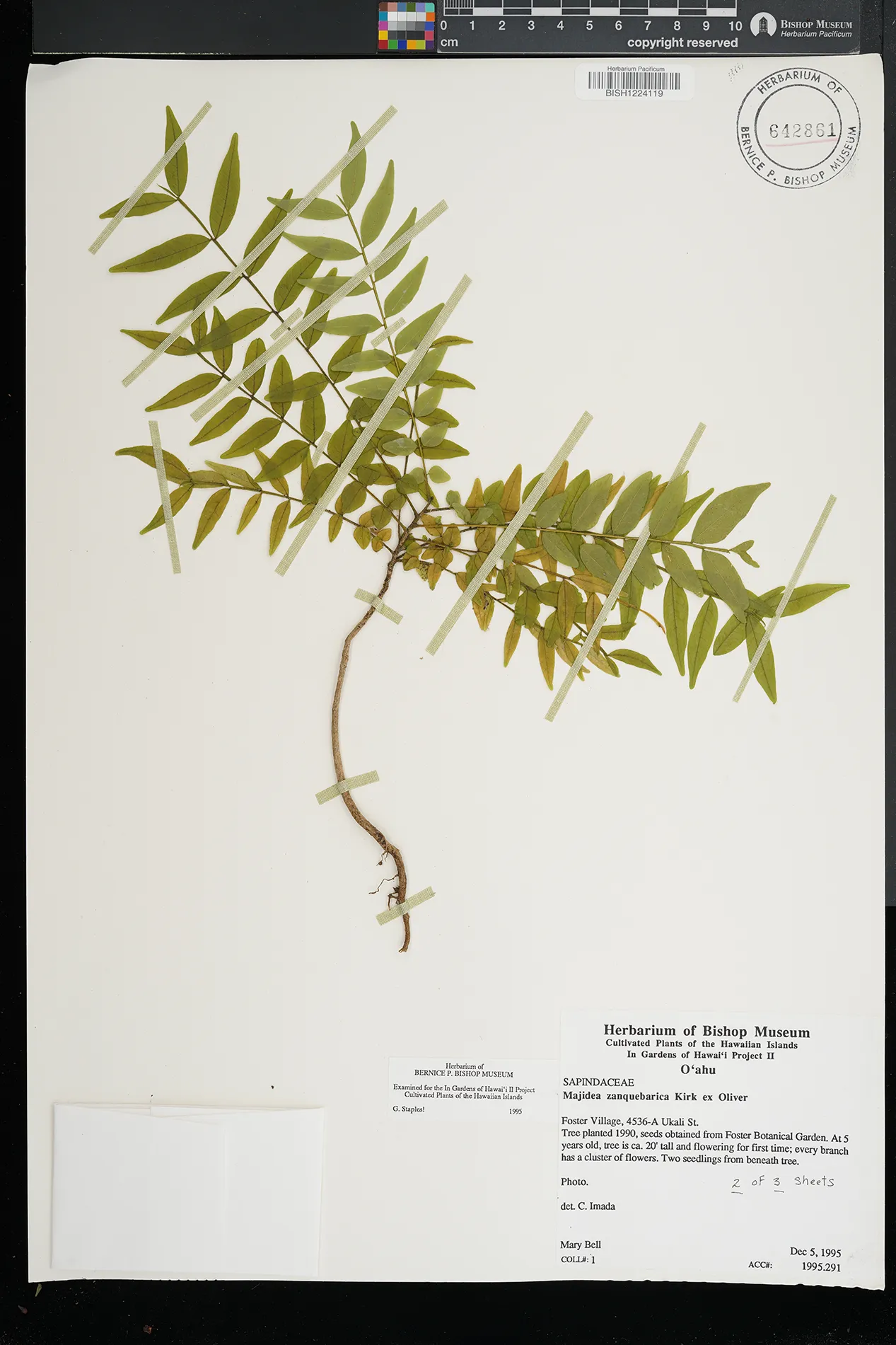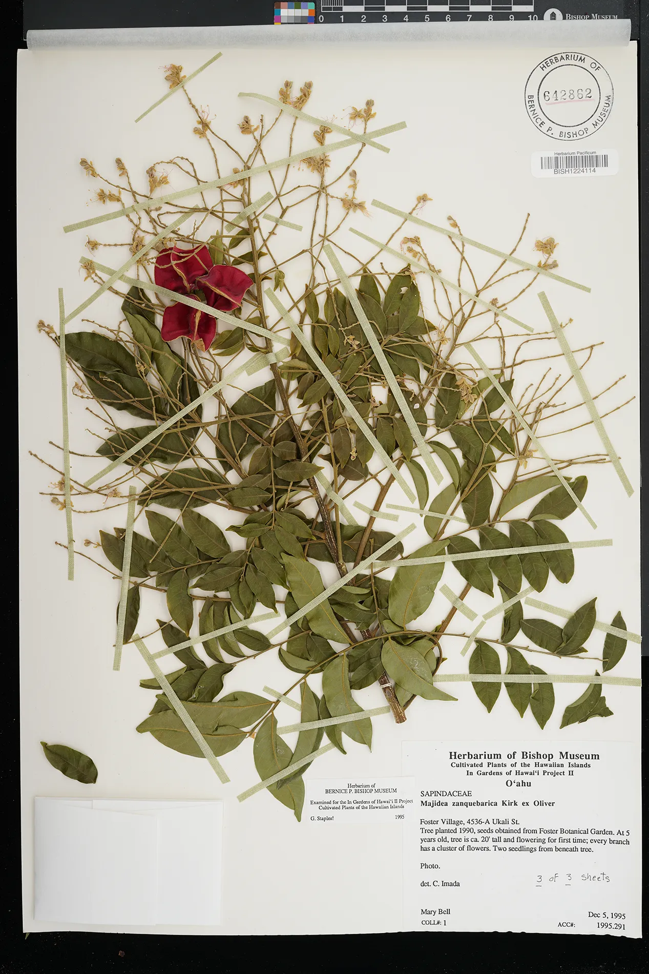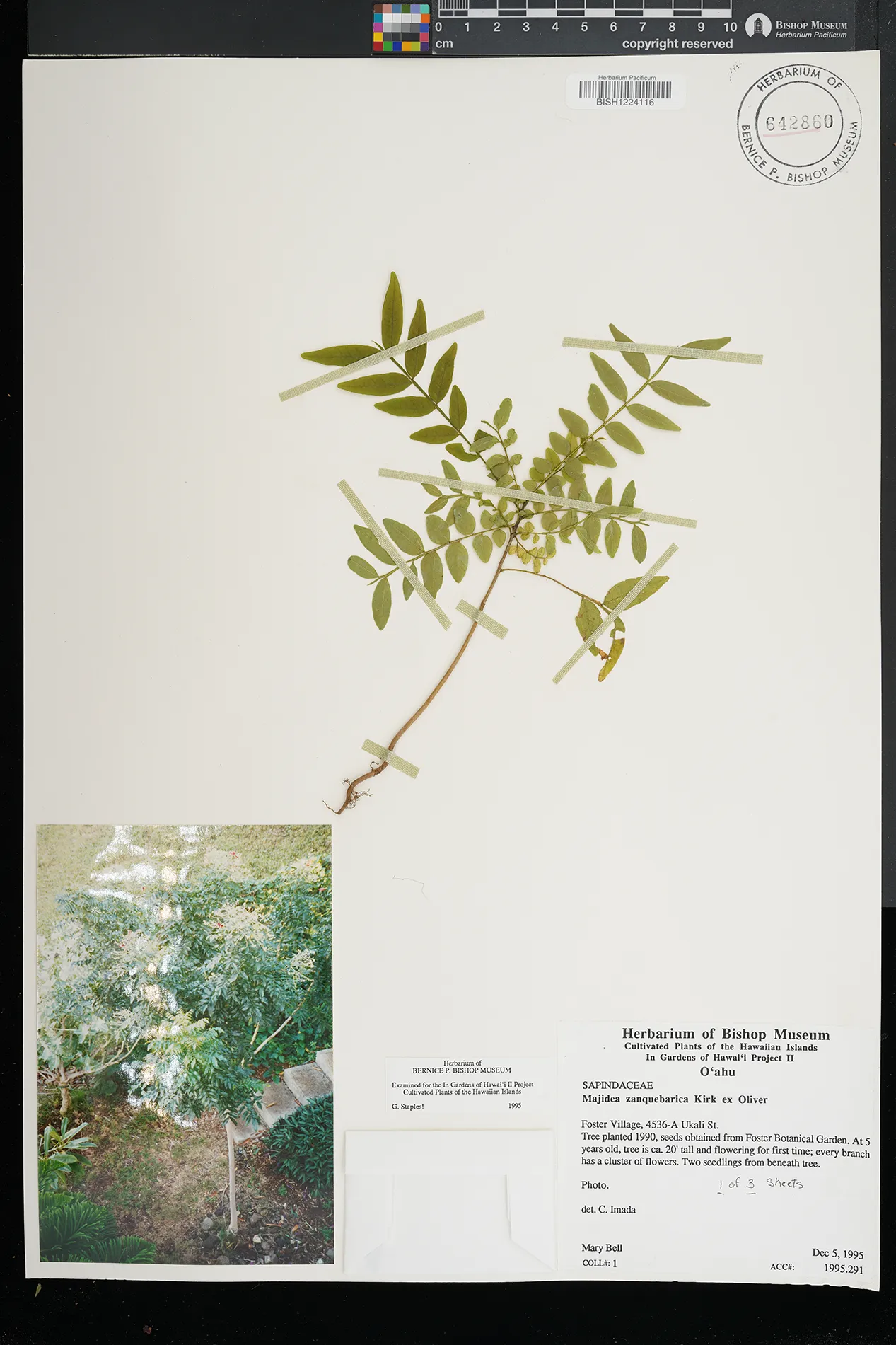 | 5 | Majidea zanguebarica | J.Kirk ex Oliv. | Honolulu; Foster Village, 4536-A, Ukali St | PRESERVED_SPECIMEN | Bell, M. | 1 | Oahu | BISH | 12/5/1995 | |