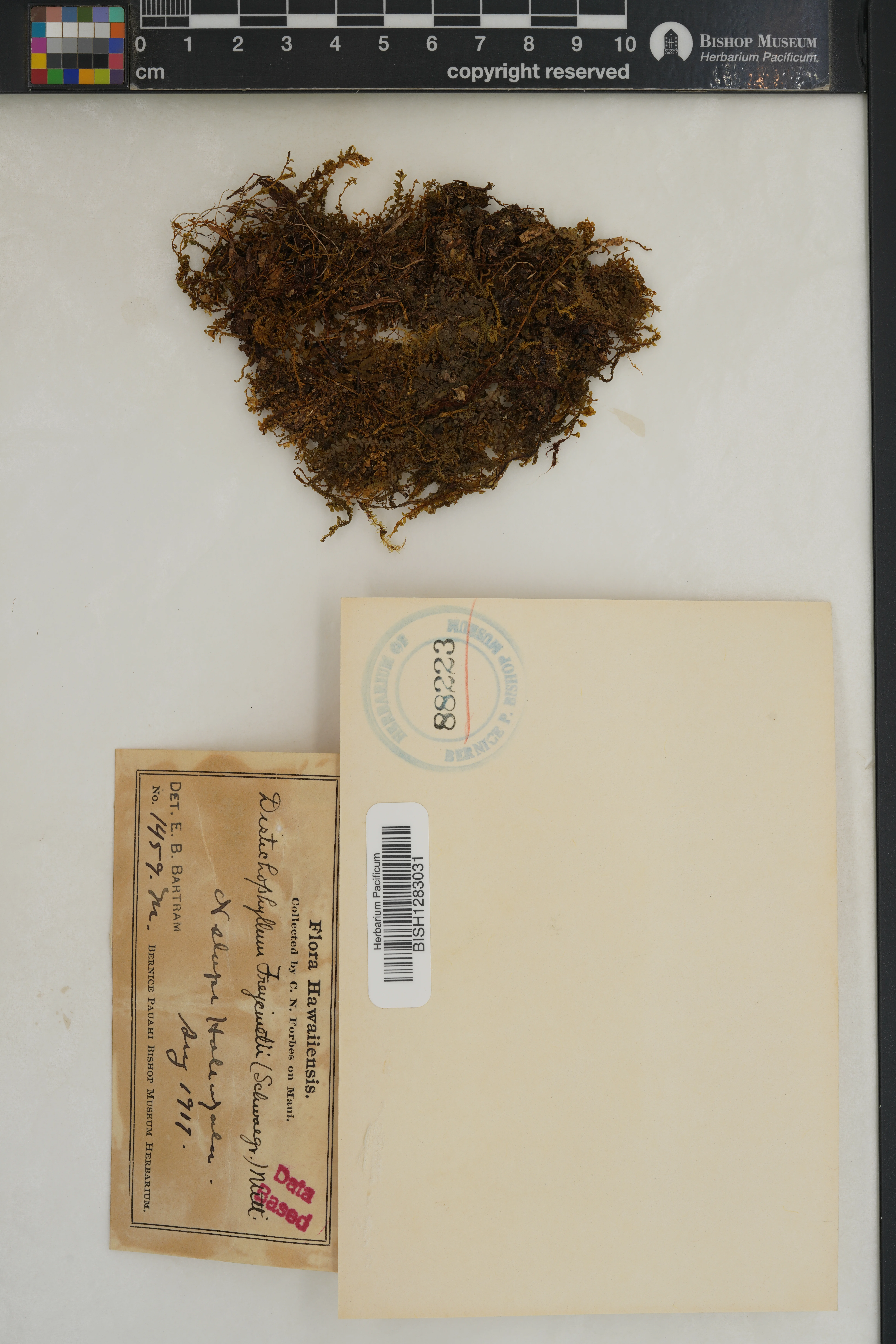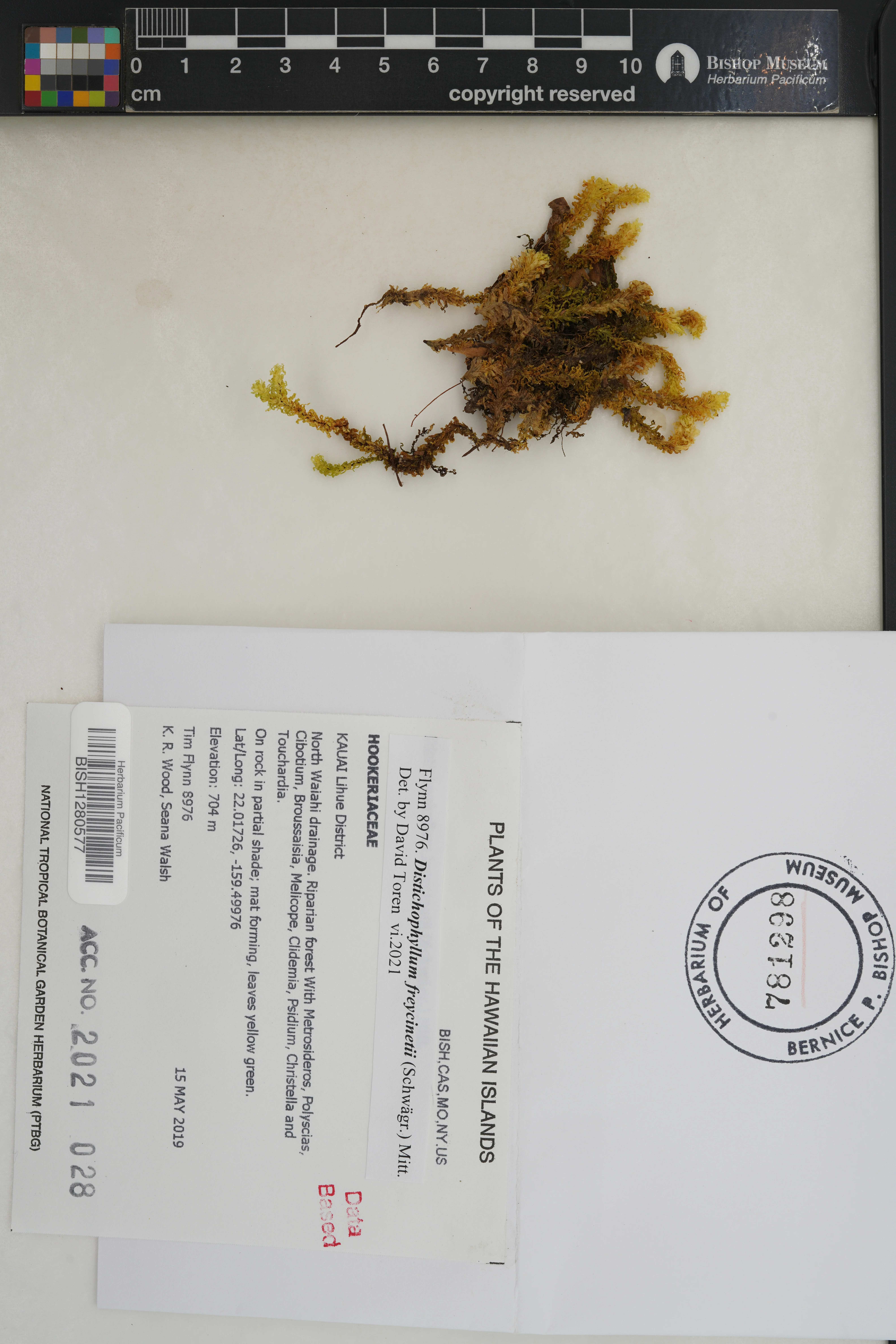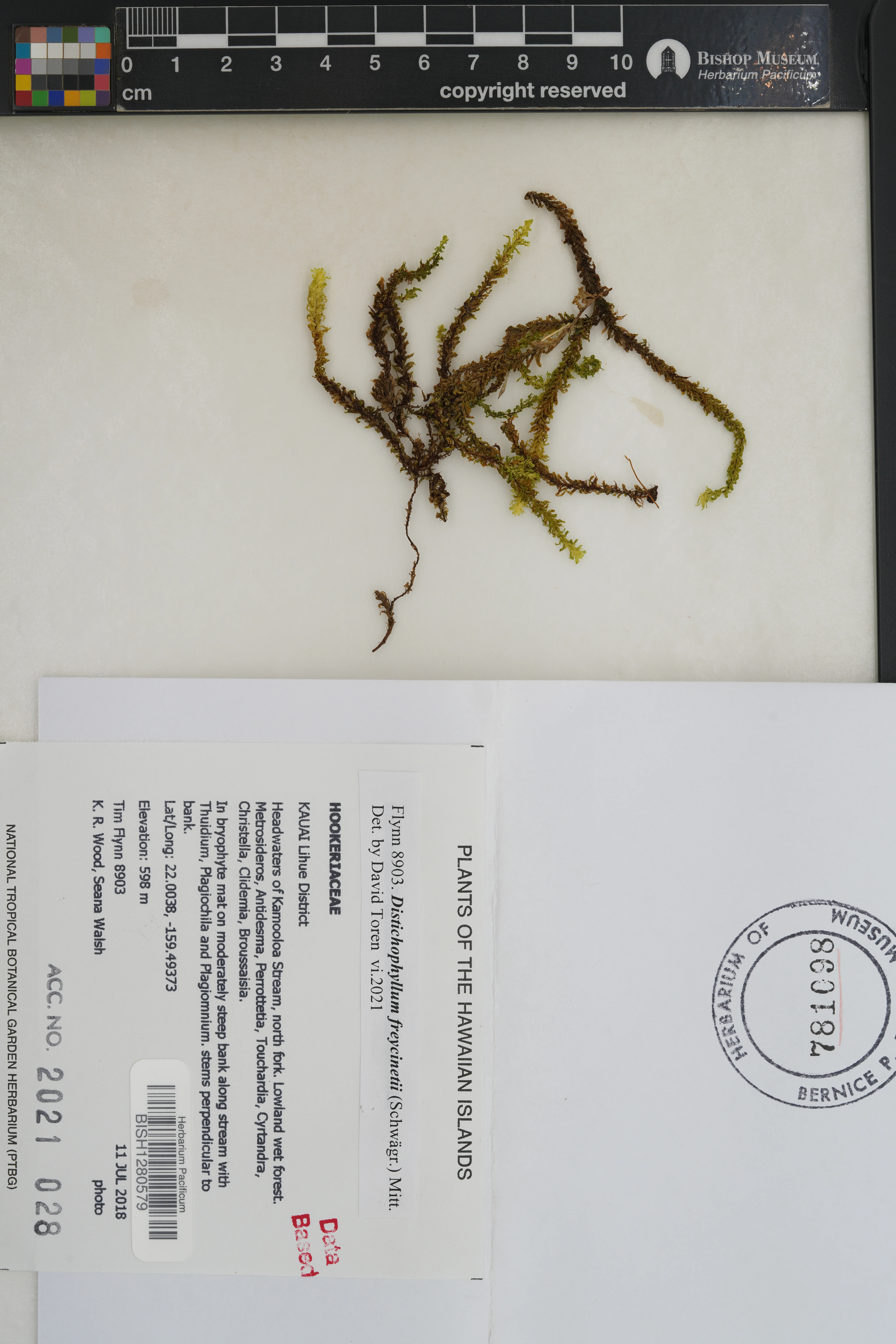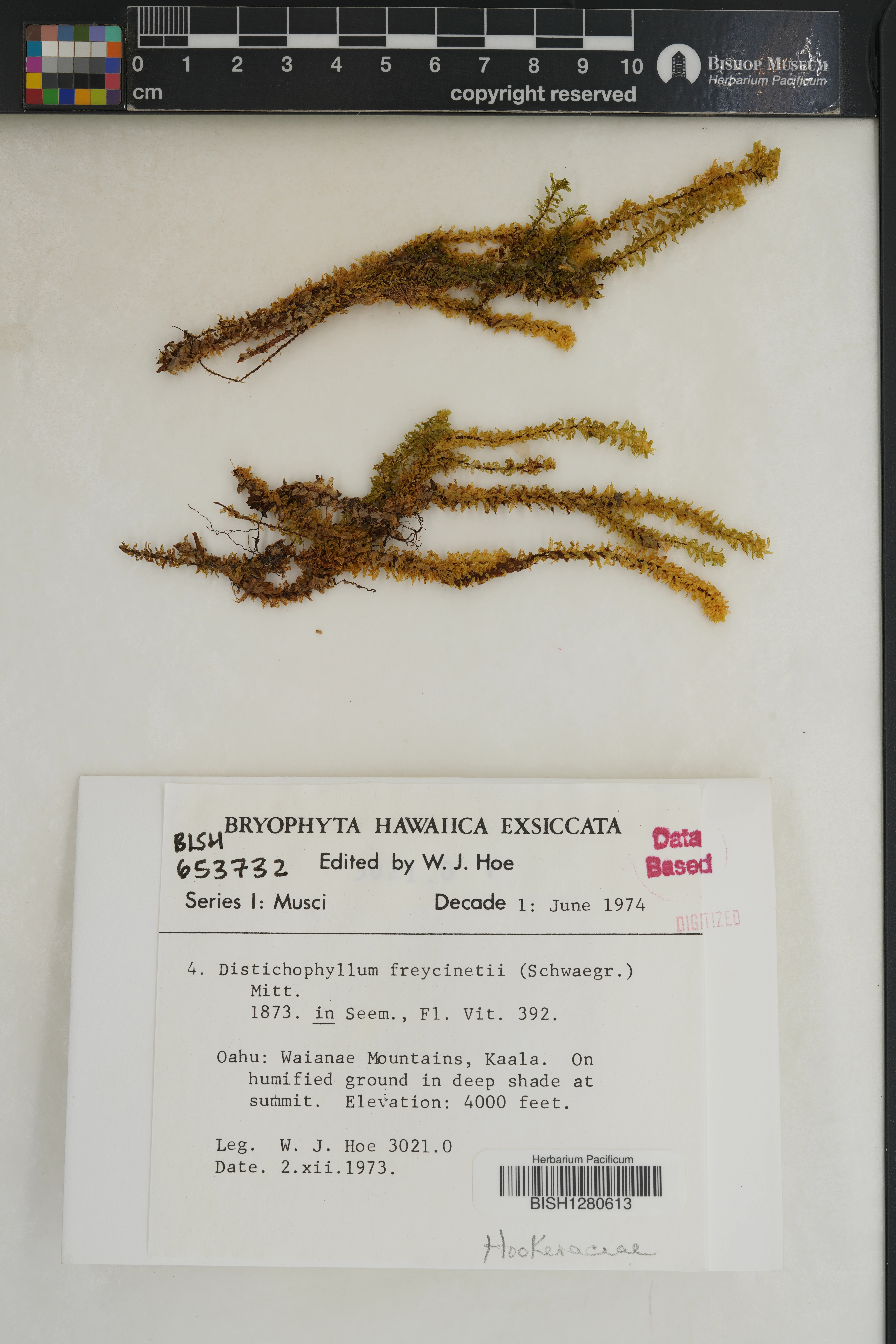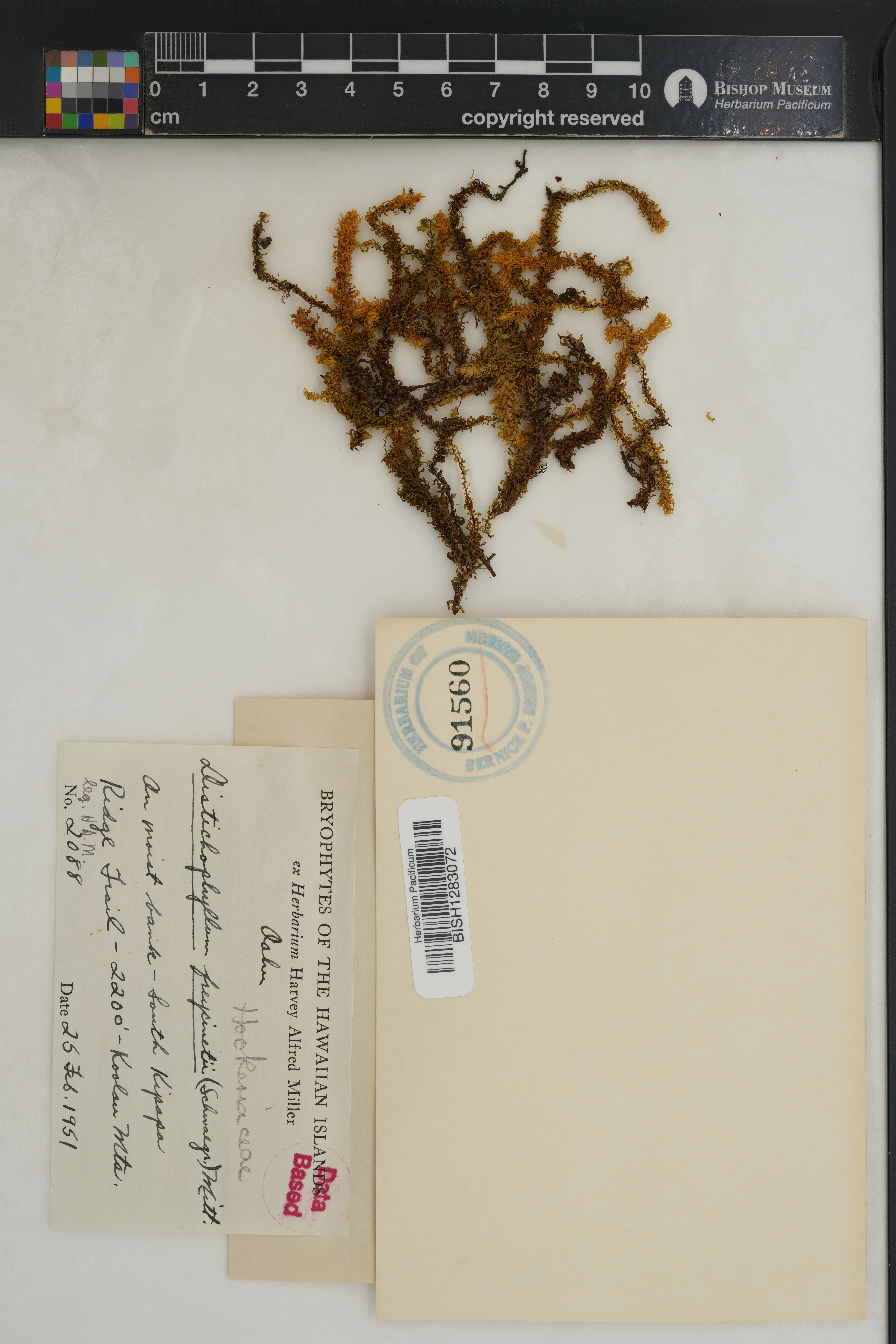 Kingdom: Viridiplantae Phylum: Bryophyta Class/Clade: Bryopsida Order: Hookeriales Family: Hookeriaceae Genus: Distichophyllum