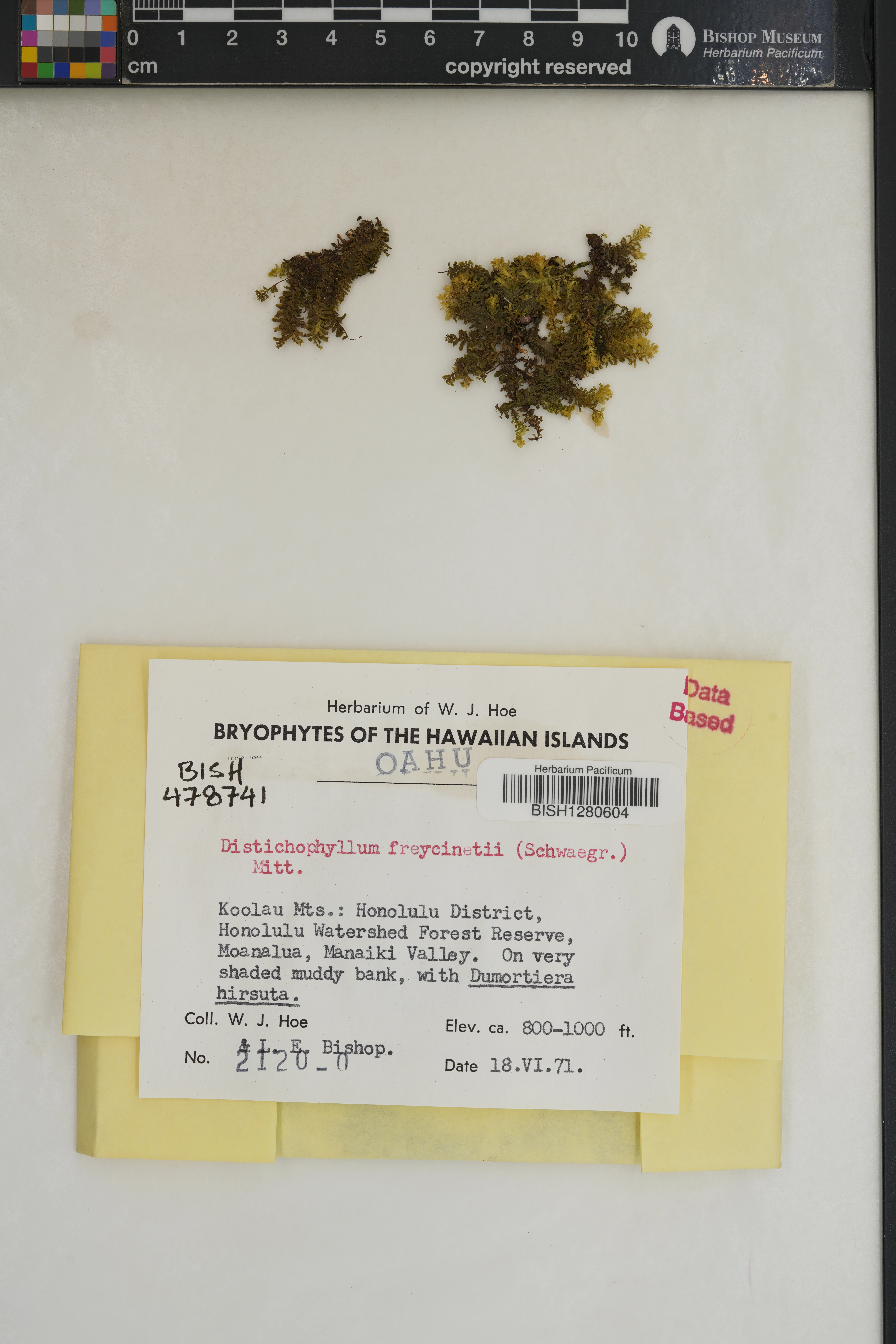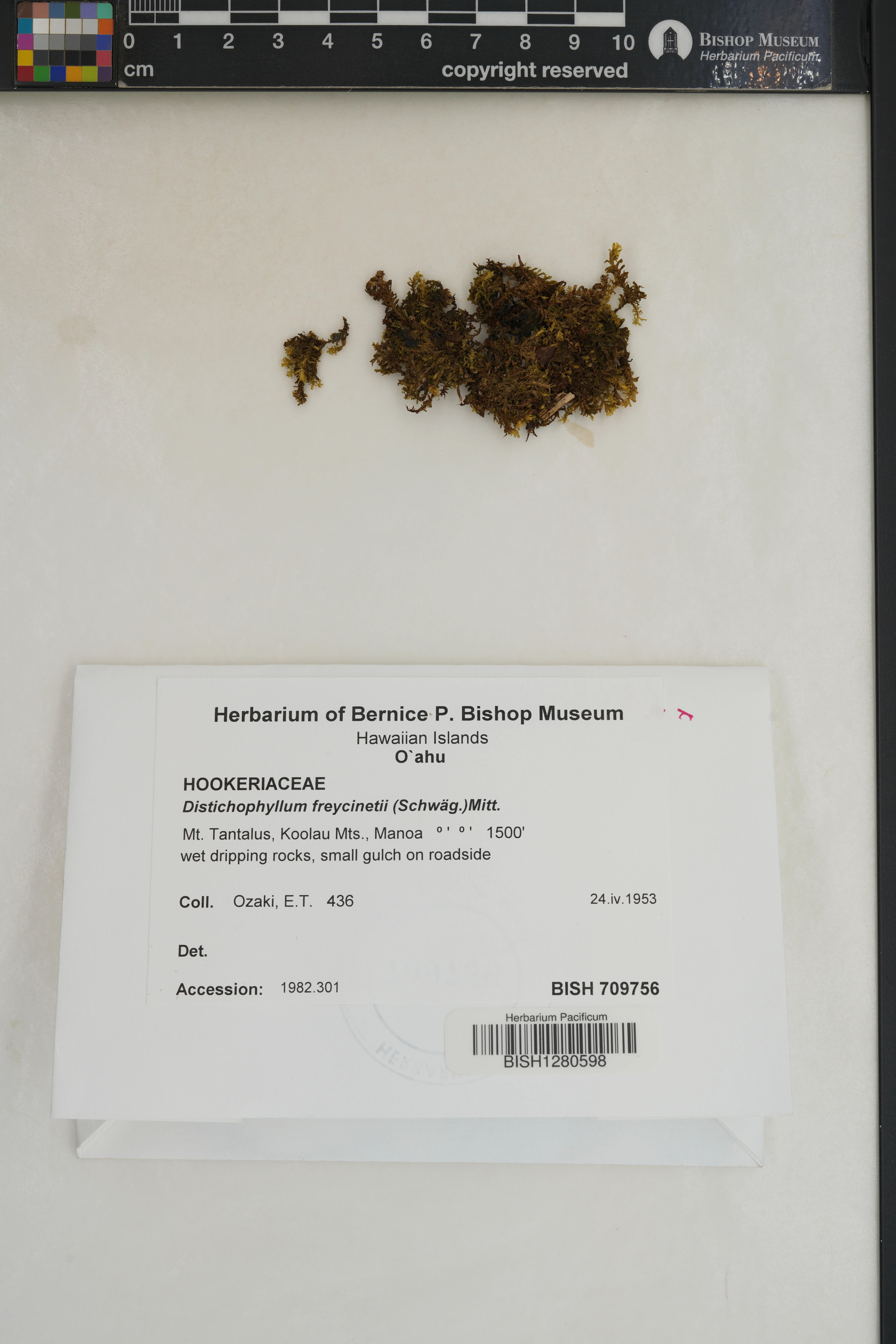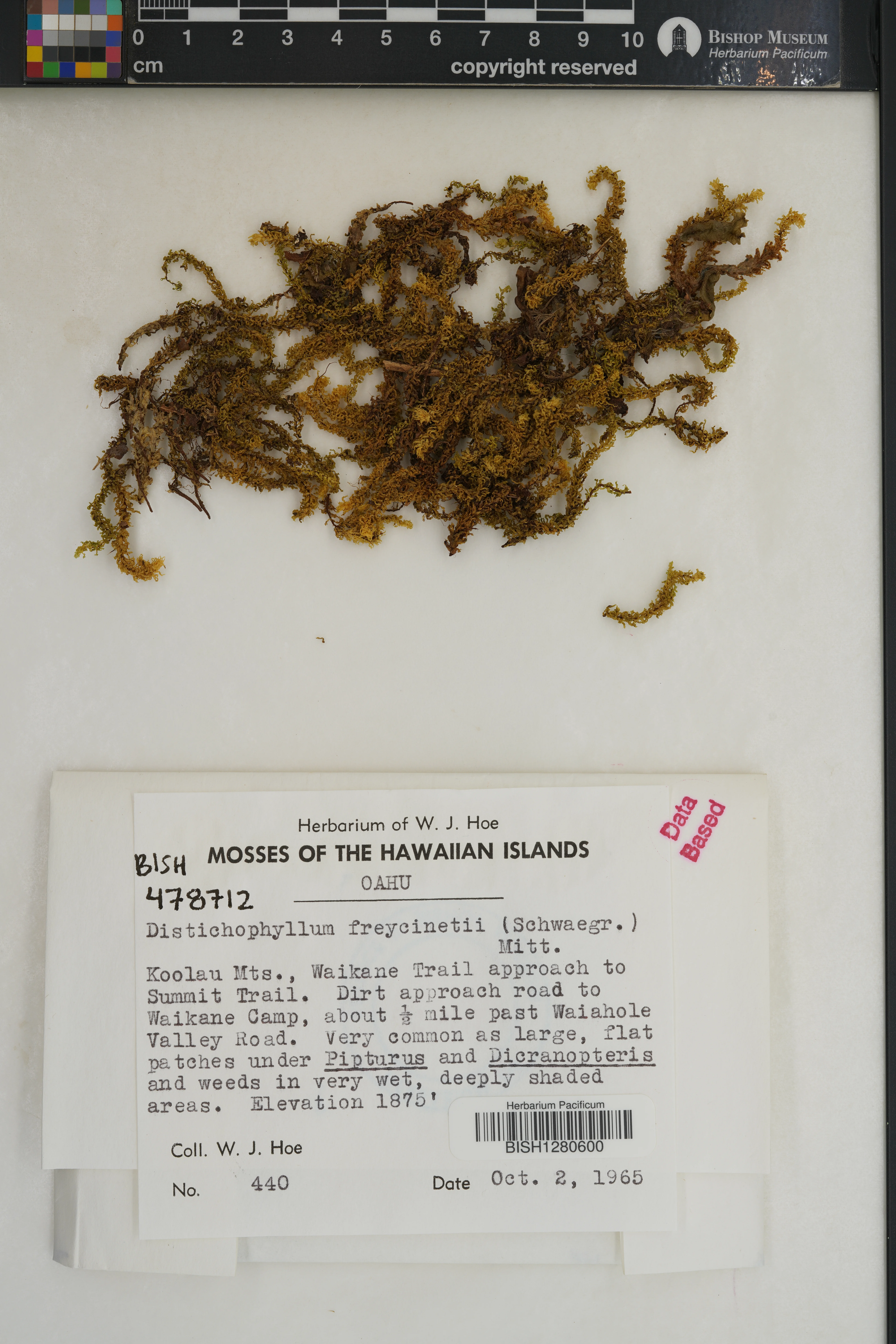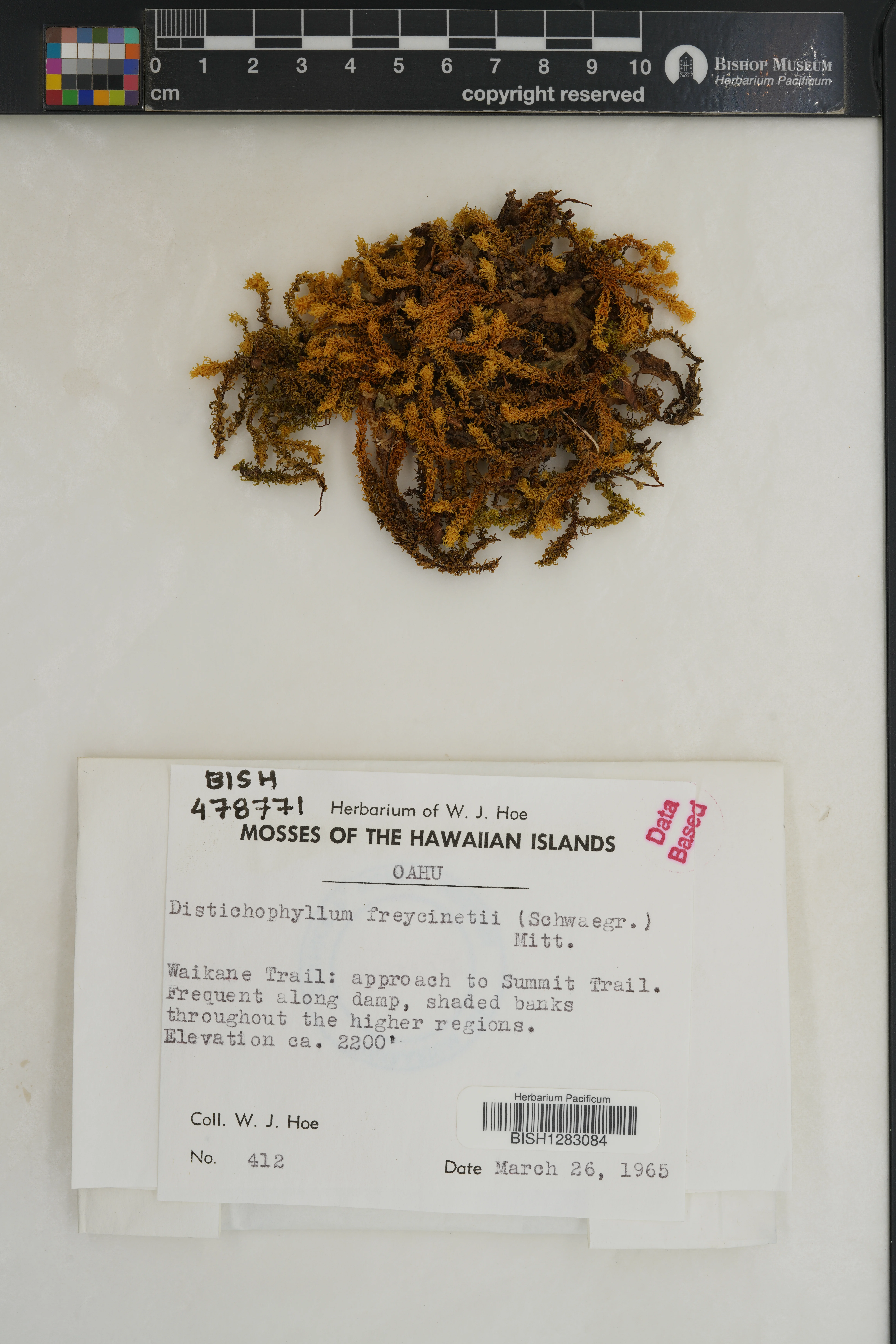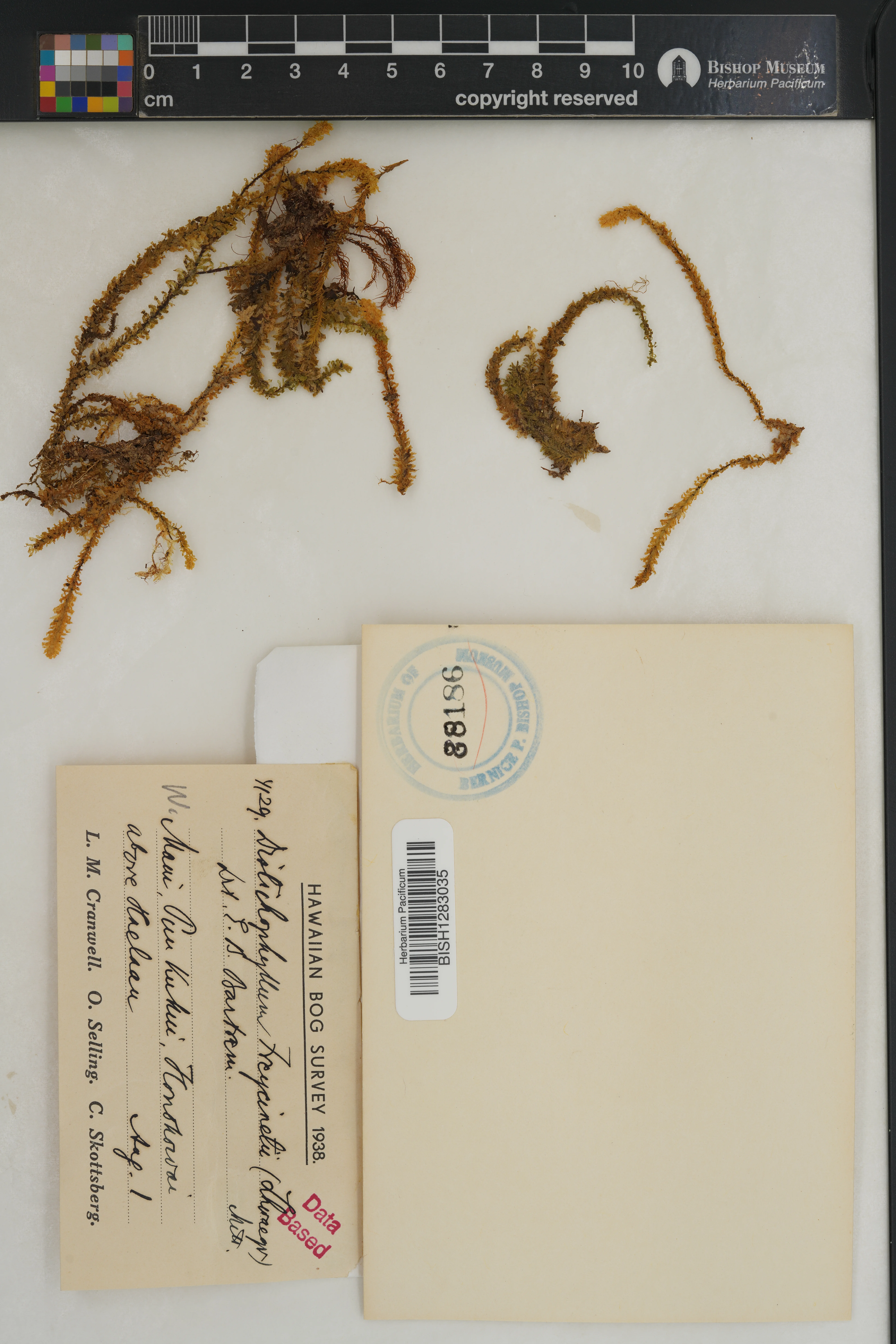 Kingdom: Viridiplantae Phylum: Bryophyta Class/Clade: Bryopsida Order: Hookeriales Family: Hookeriaceae Genus: Distichophyllum