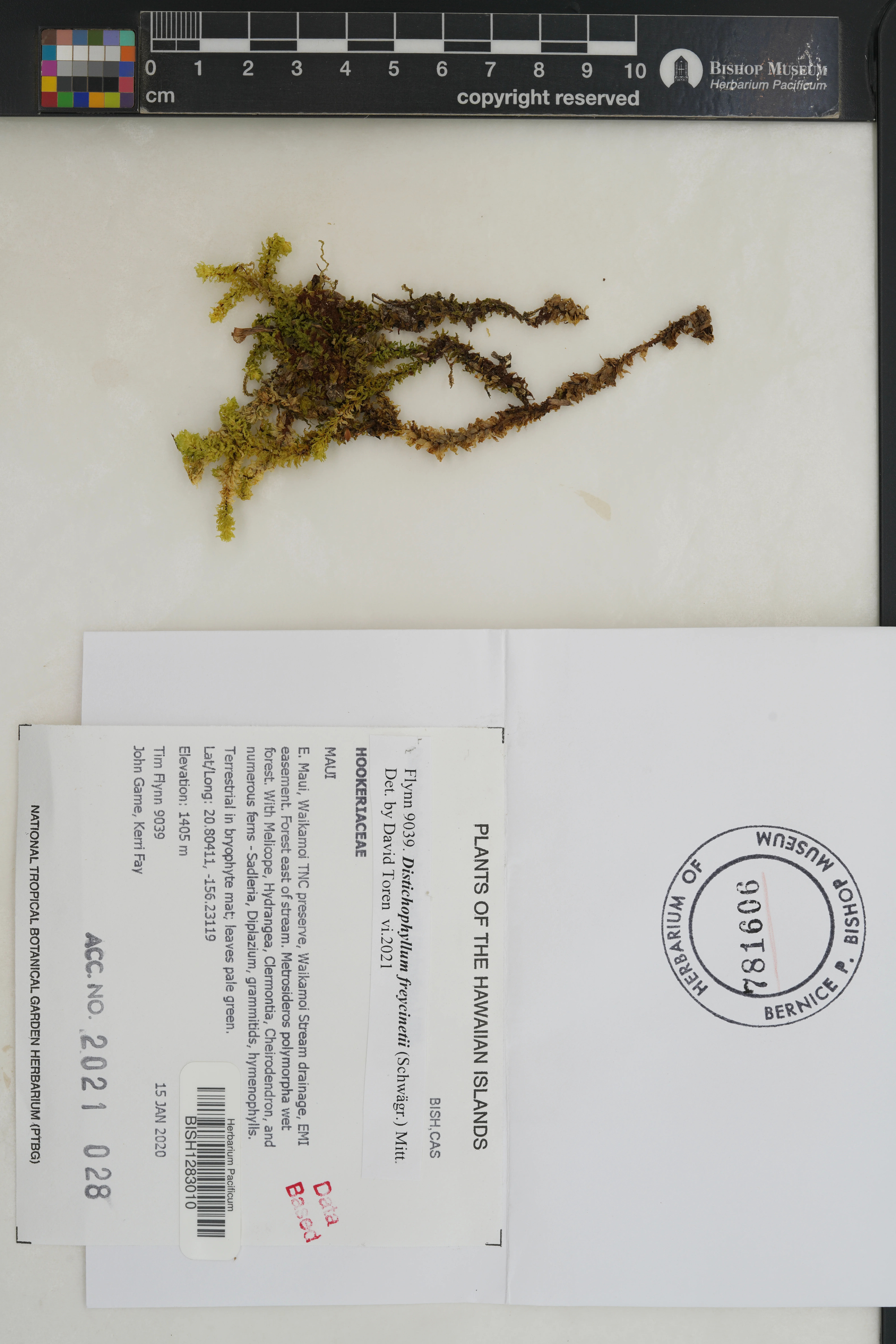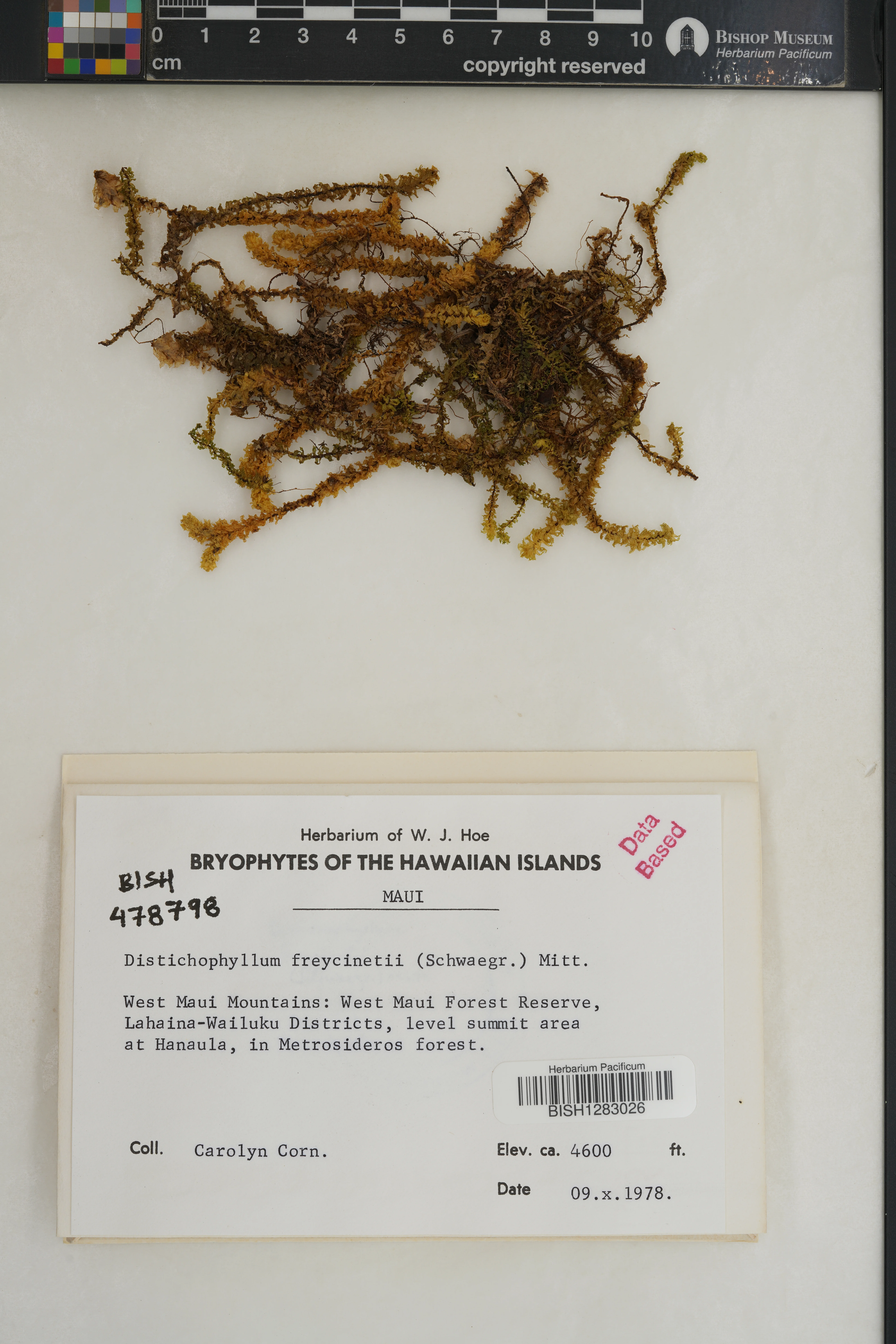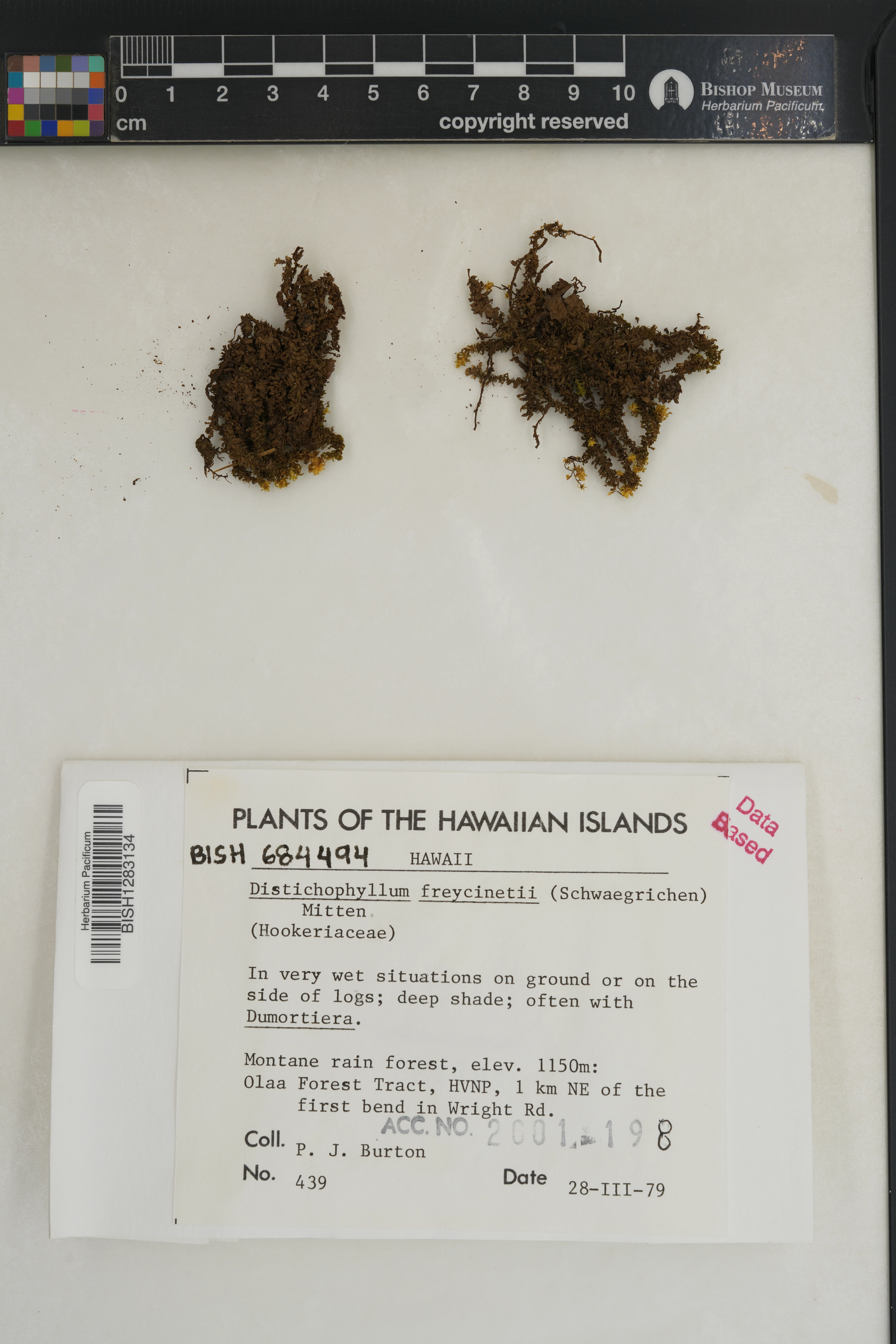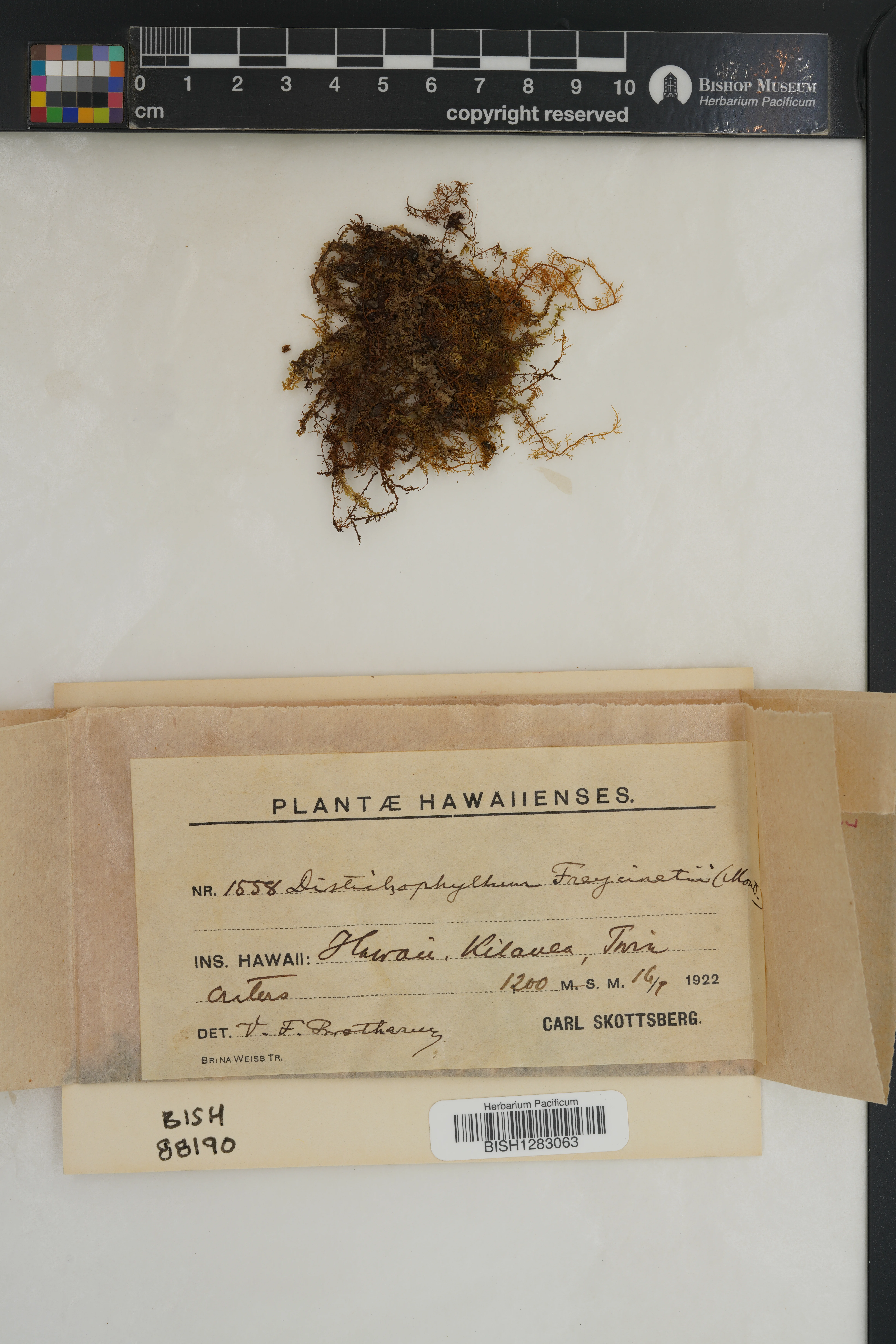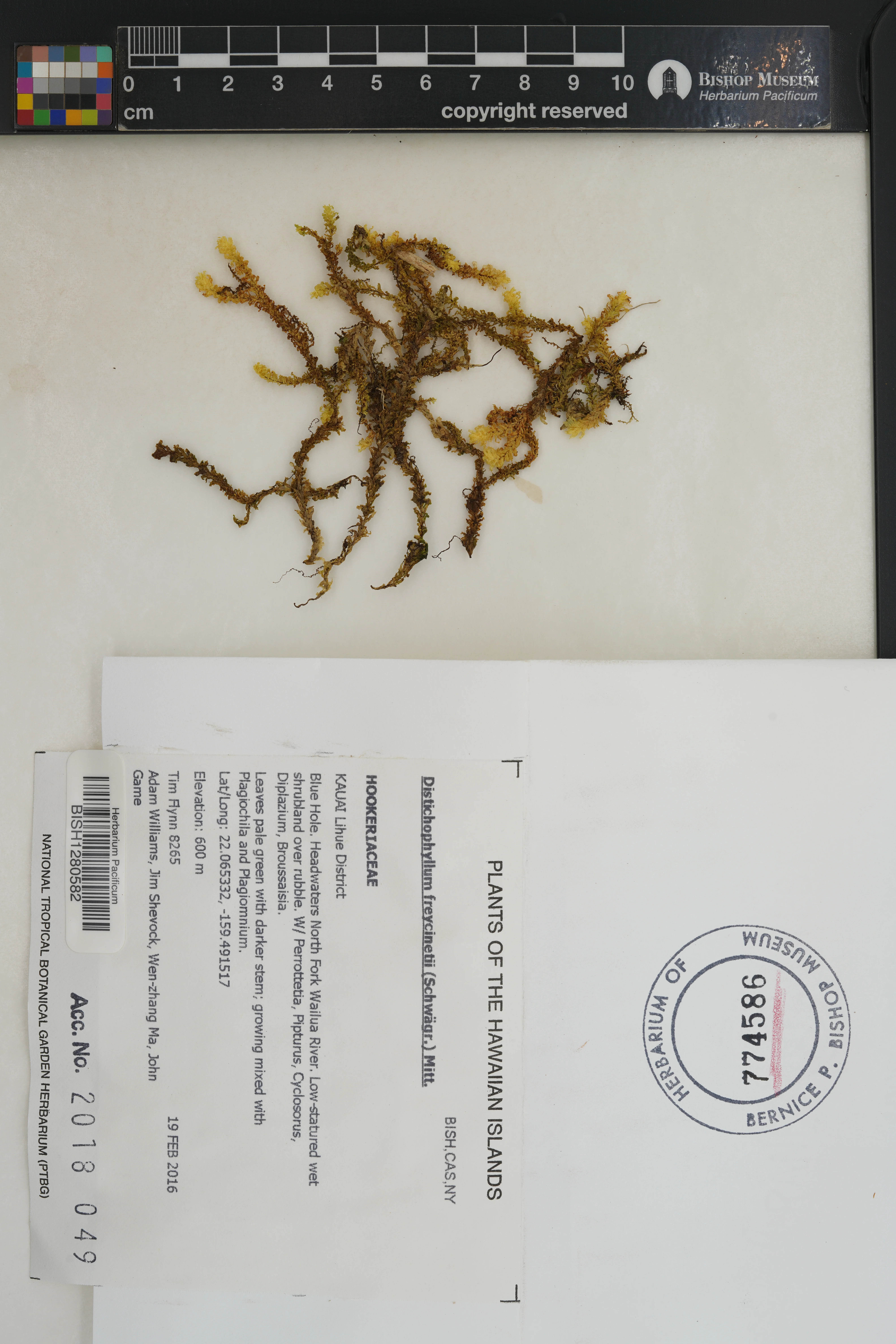 Kingdom: Viridiplantae Phylum: Bryophyta Class/Clade: Bryopsida Order: Hookeriales Family: Hookeriaceae Genus: Distichophyllum